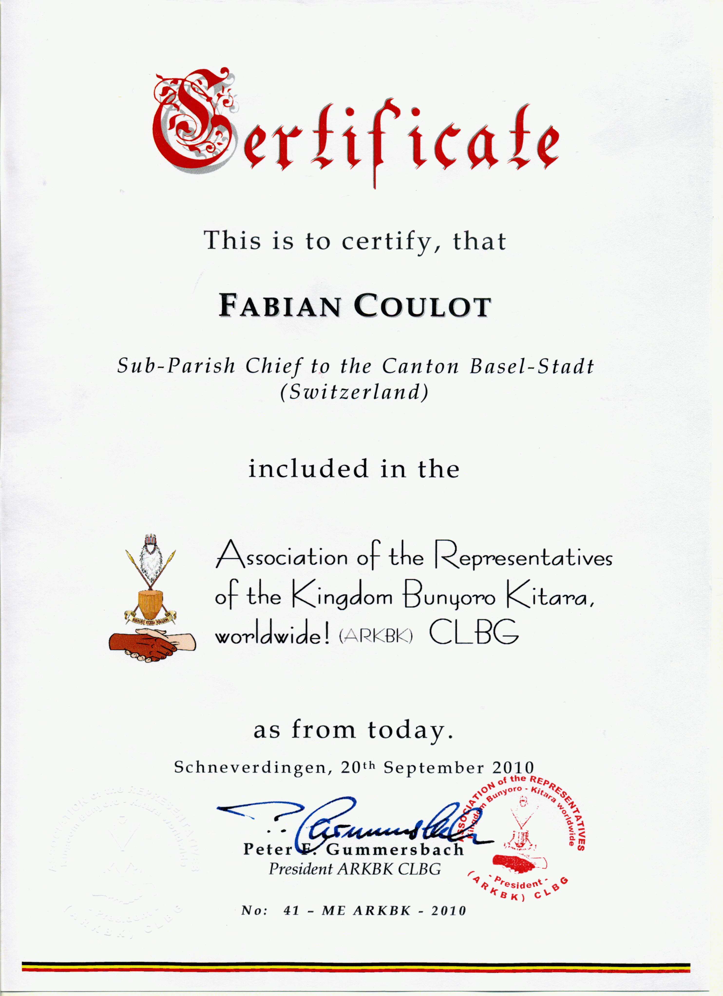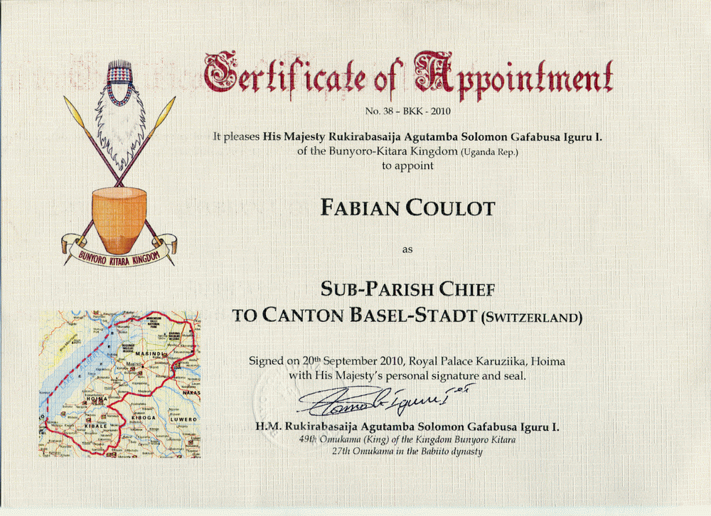 Gemäss dem Amtseid als Ehrenoffizier Seiner Majestät dem König (Omukama) Rukirabasaija Agutamba Solomon Gafabusa Iguru I vom 28. August 2010 wurde ich als Sub-Parish Chief of the Kingdom Bunyoro-Kitara für den Kanton Basel-Stadt (Schweiz) nominiert. Am 20. September 2010 durch persönliche Unterschrift und Siegel von Seiner Majestät im Amt bestätigt mit gleichzeitiger Aufnahme in die Association of the Representatives of the Kingdom Bunyoro-Kitara worldwide! (ARKBK).
