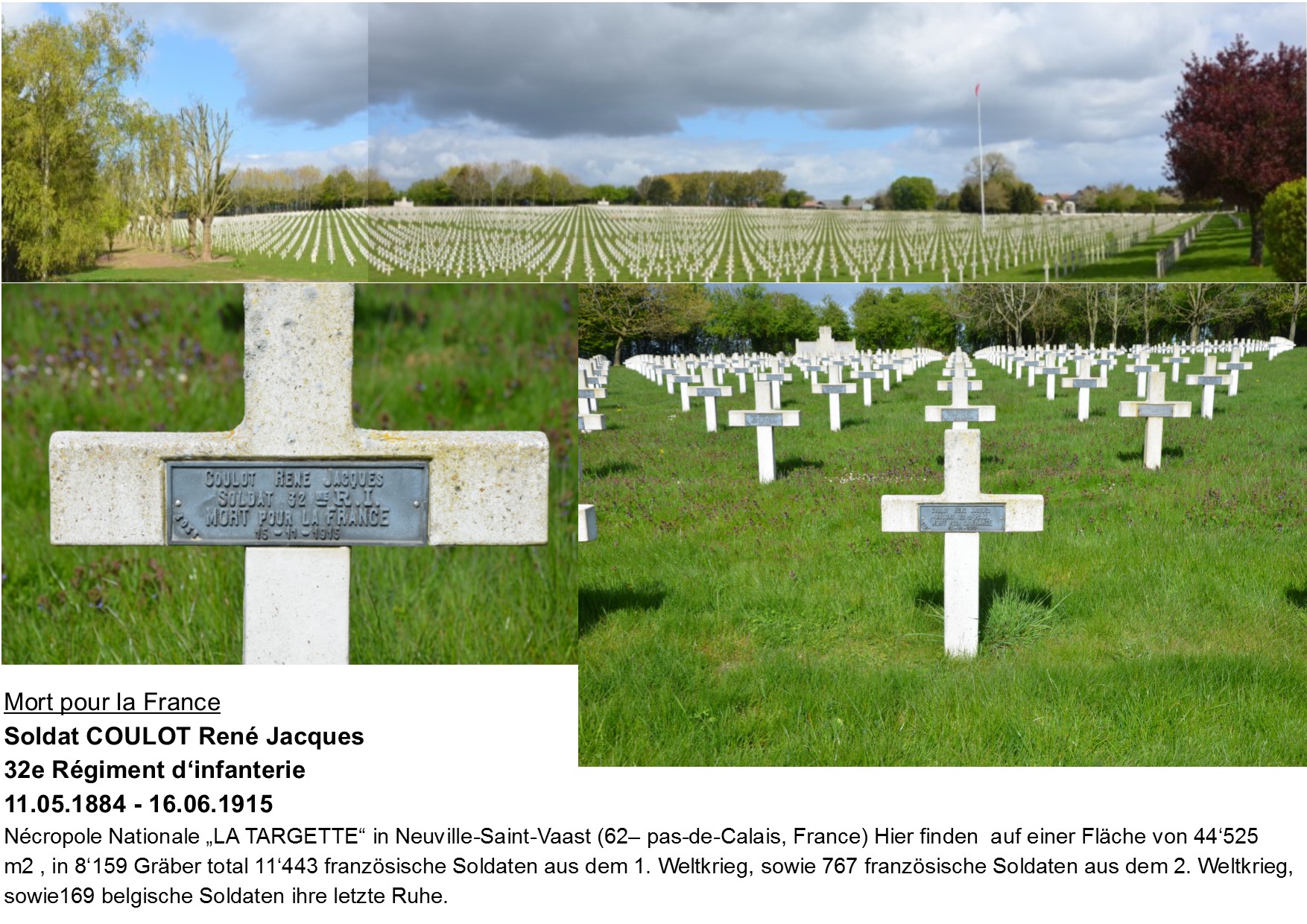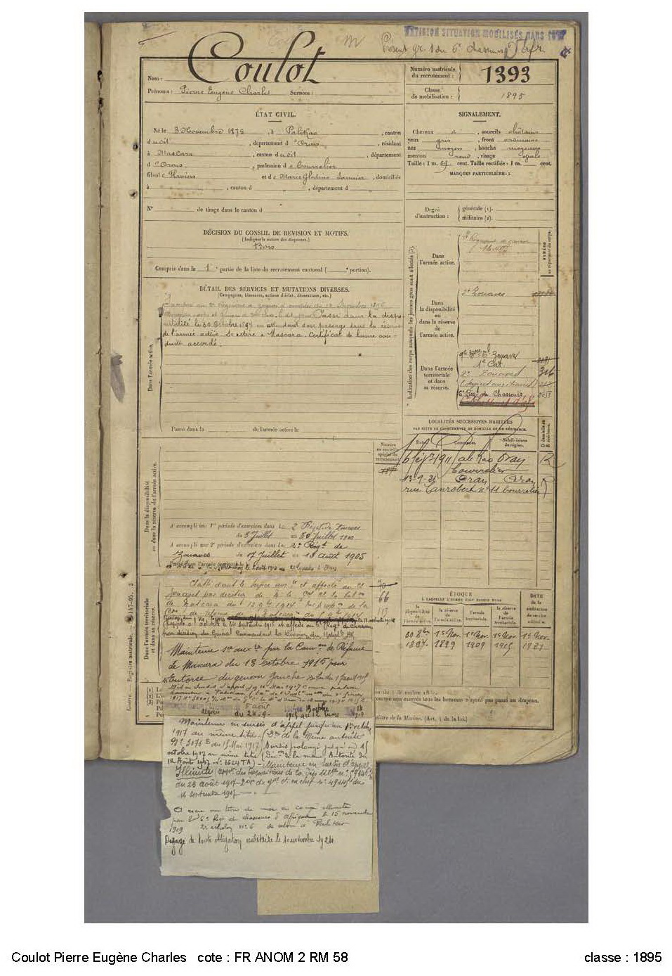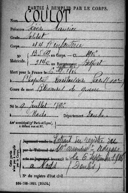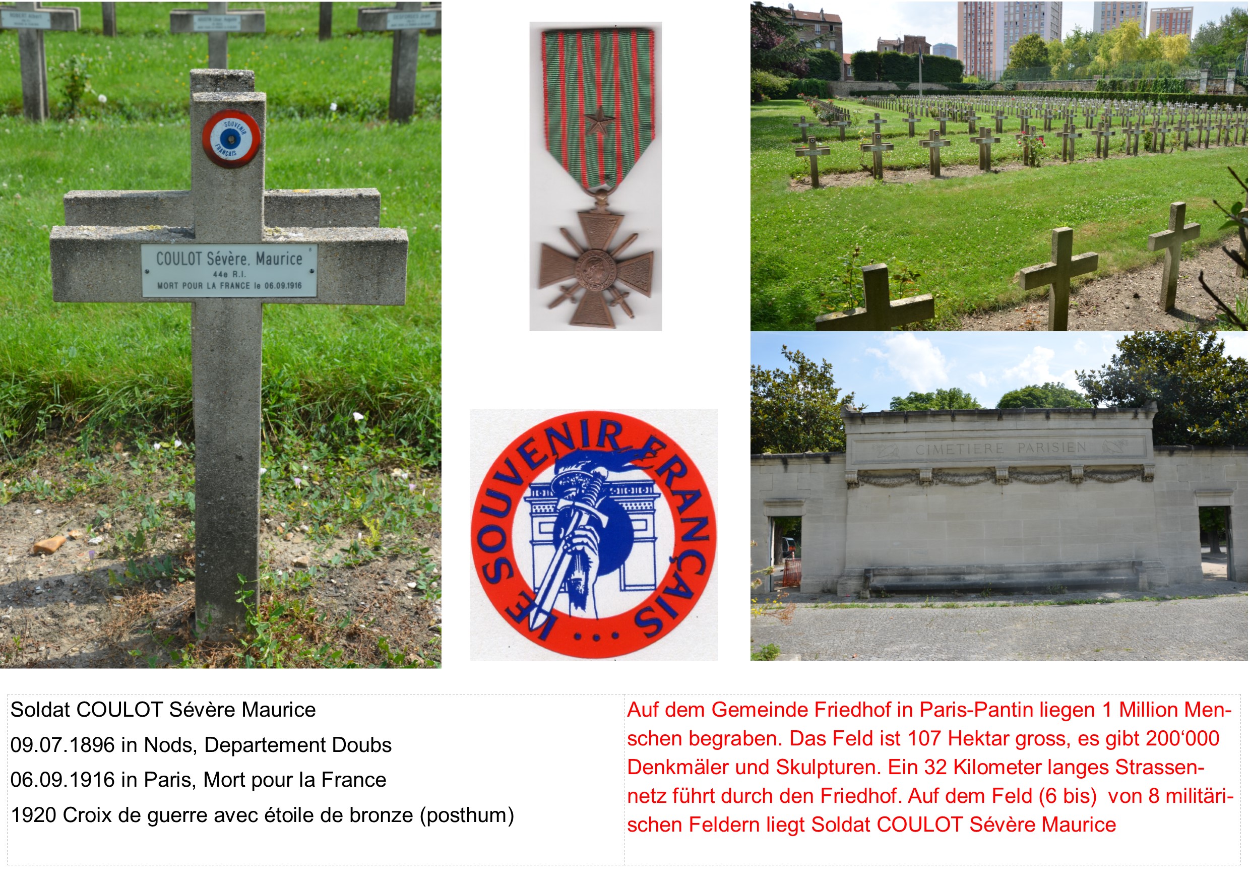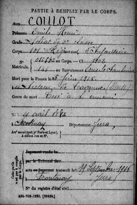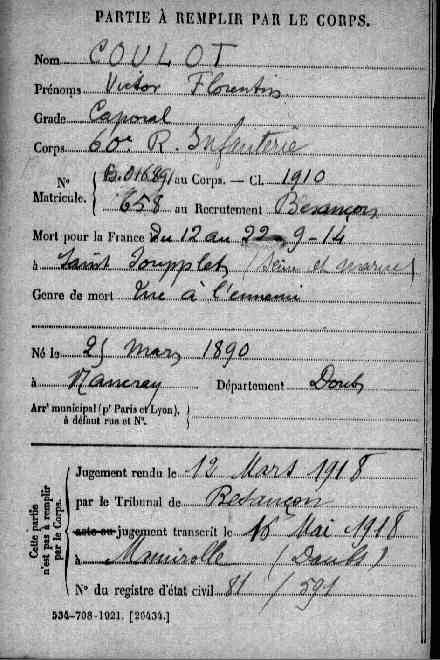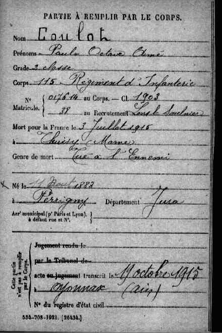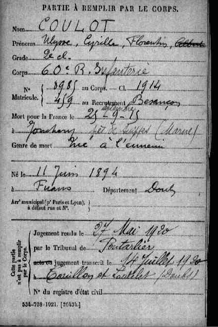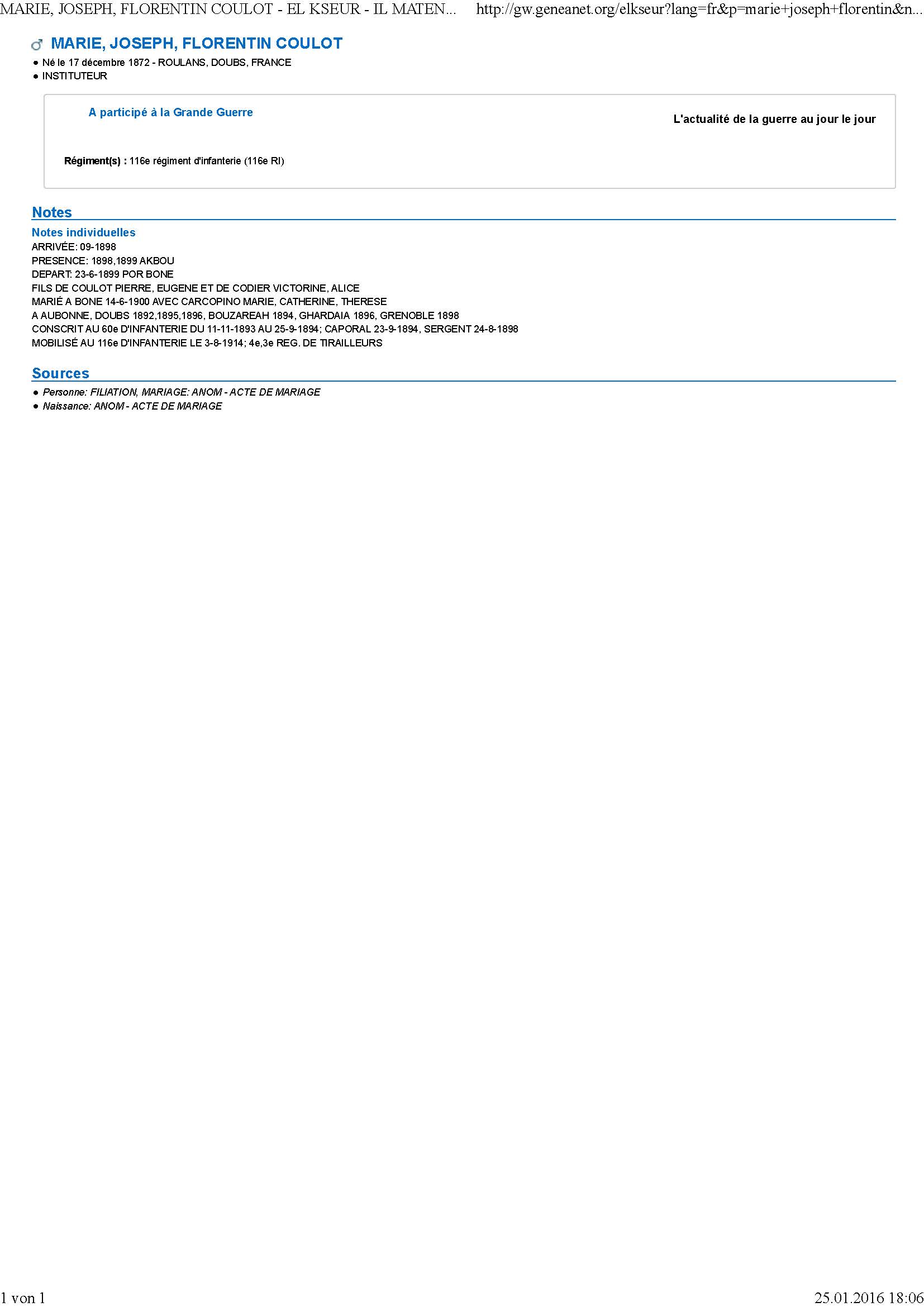 ( * ) Sergent COULOT Marie Joseph Florentin geboren am: 17.12.1872 in Roulans - Doubs 116e Régiment d'Infanterie Dienst in Akbou/Algerien vom Sept.1898 bis 23.06.1899 11.11.1893 bis 25.09.1894 Soldat 23.09.1894 Caporal 24.08.1898 Sergent 03.08.1914 Einsatzbefehl beim 115e Régiment d'Infanterie; 4e, 3e Reg. de Tirailleurs |