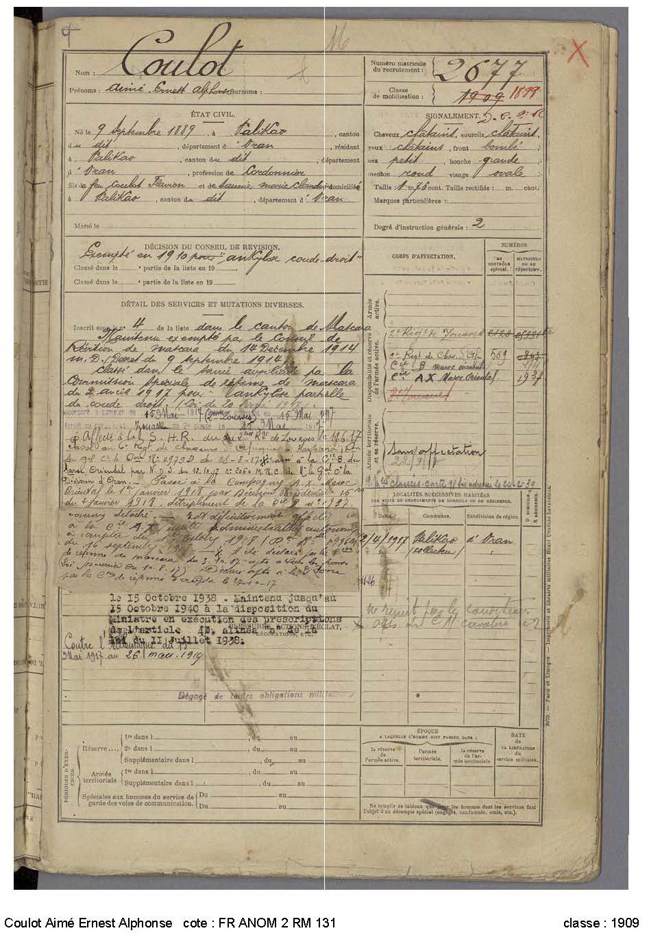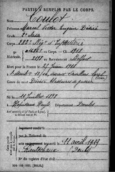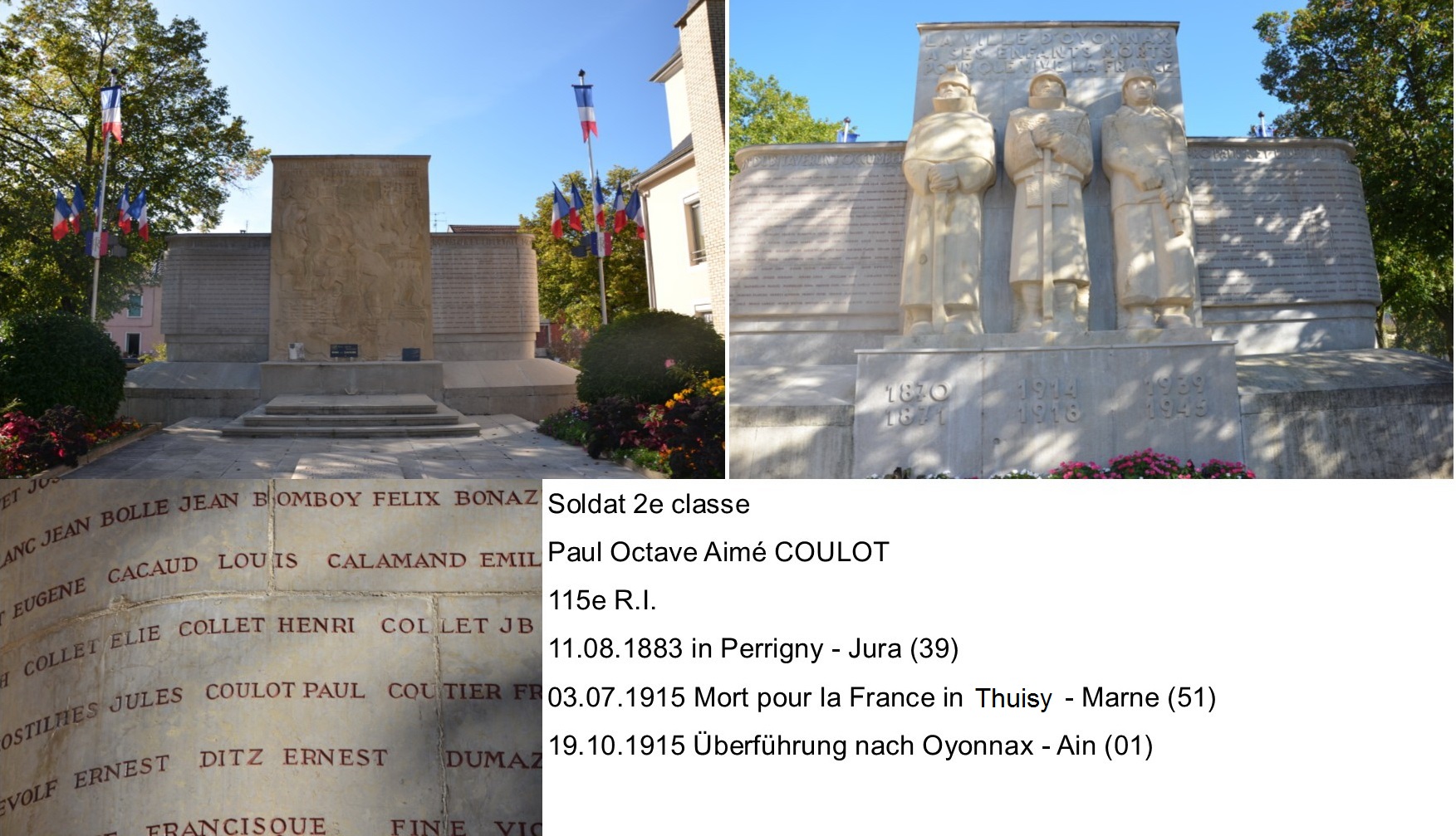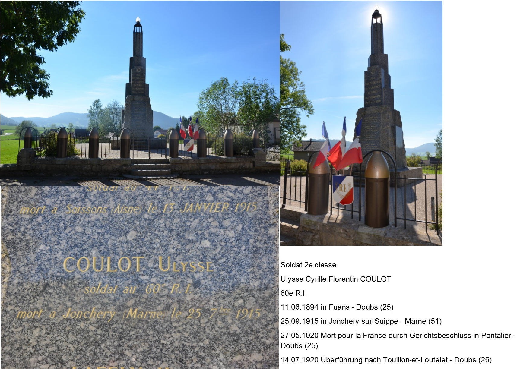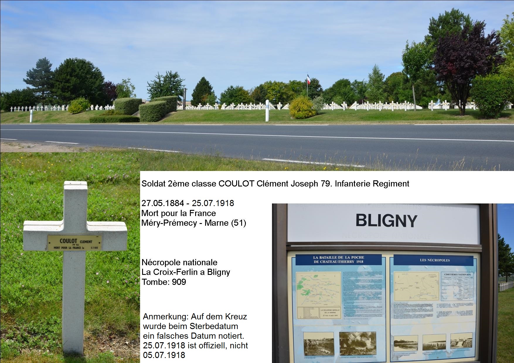 ( * ) Sergent COULOT Marie Joseph Florentin geboren am: 17.12.1872 in Roulans - Doubs 116e Régiment d'Infanterie Dienst in Akbou/Algerien vom Sept.1898 bis 23.06.1899 11.11.1893 bis 25.09.1894 Soldat 23.09.1894 Caporal 24.08.1898 Sergent 03.08.1914 Einsatzbefehl beim 115e Régiment d'Infanterie; 4e, 3e Reg. de Tirailleurs |