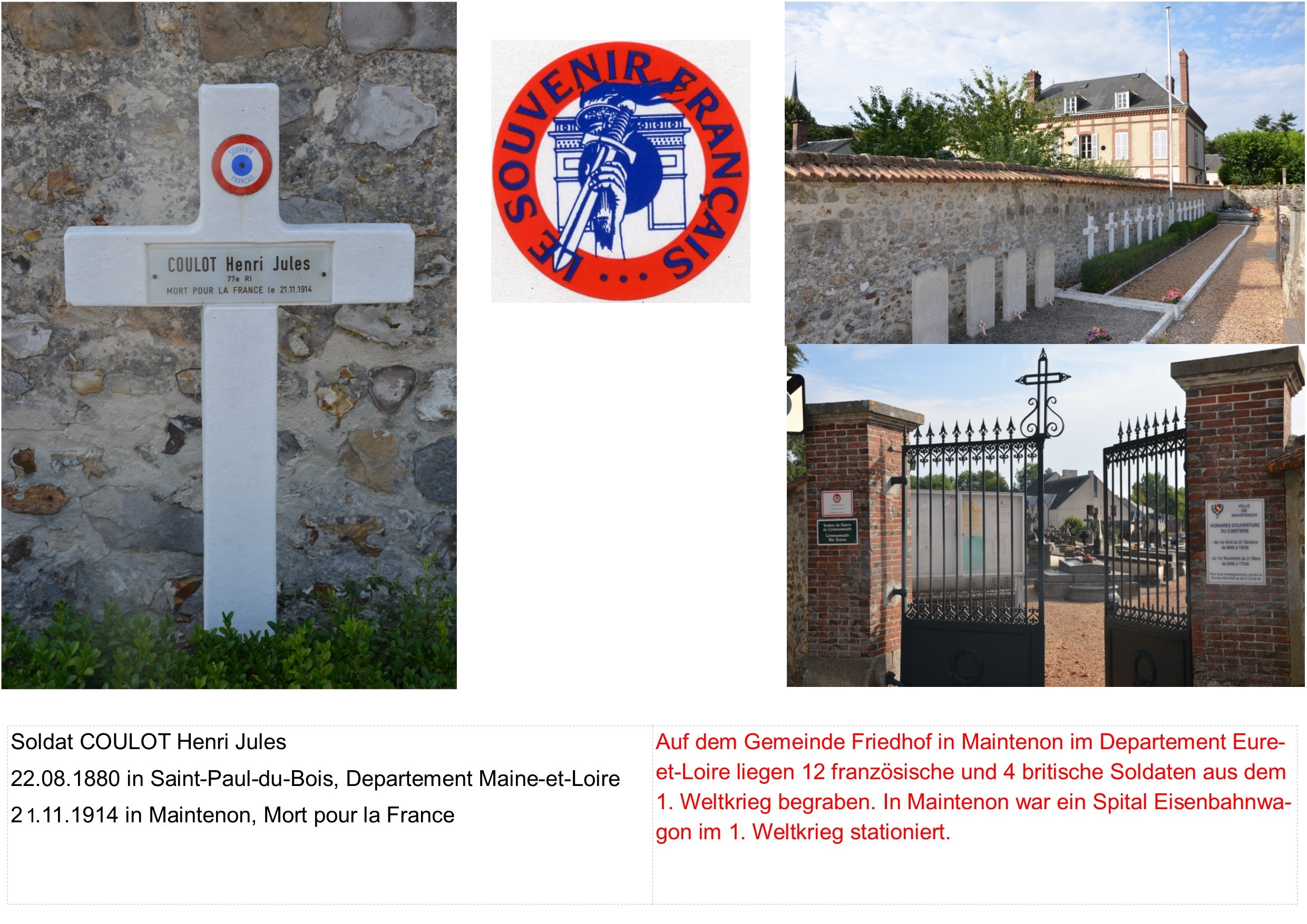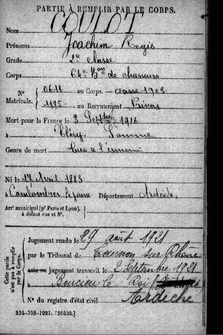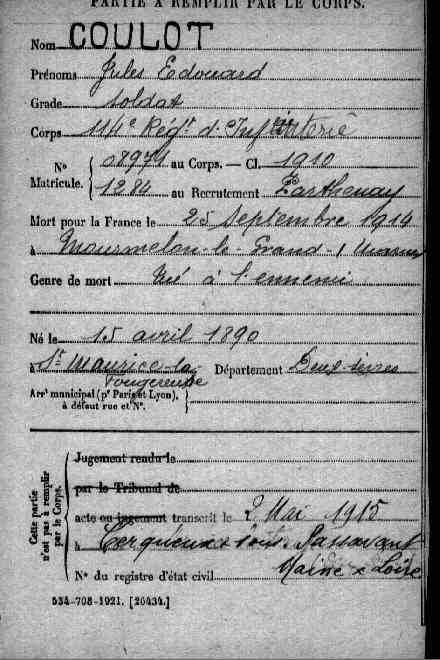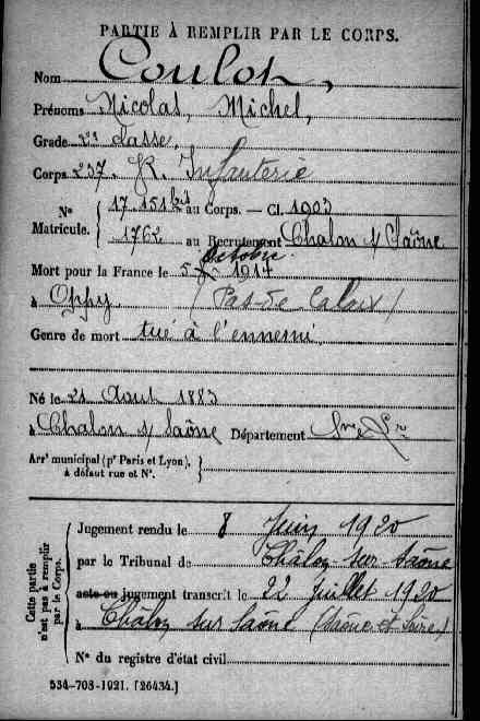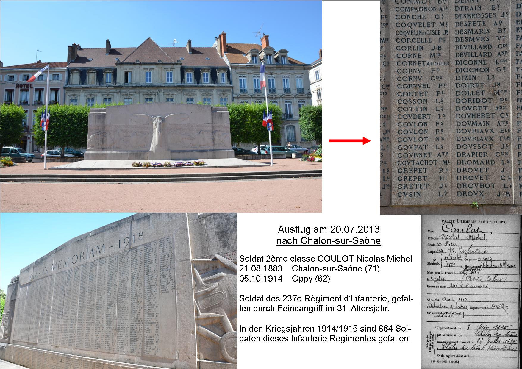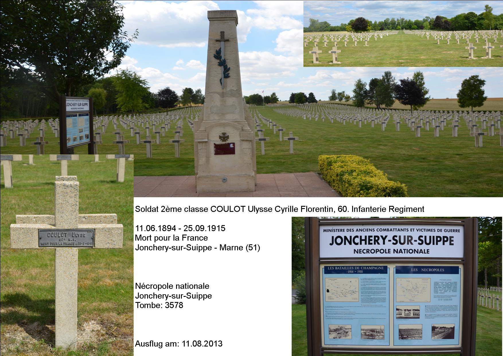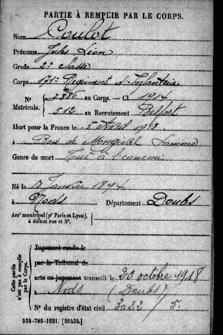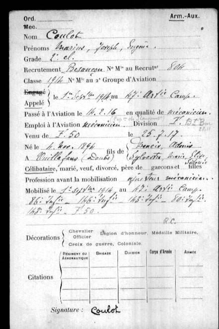 ( * ) Sergent COULOT Marie Joseph Florentin geboren am: 17.12.1872 in Roulans - Doubs 116e Régiment d'Infanterie Dienst in Akbou/Algerien vom Sept.1898 bis 23.06.1899 11.11.1893 bis 25.09.1894 Soldat 23.09.1894 Caporal 24.08.1898 Sergent 03.08.1914 Einsatzbefehl beim 115e Régiment d'Infanterie; 4e, 3e Reg. de Tirailleurs |