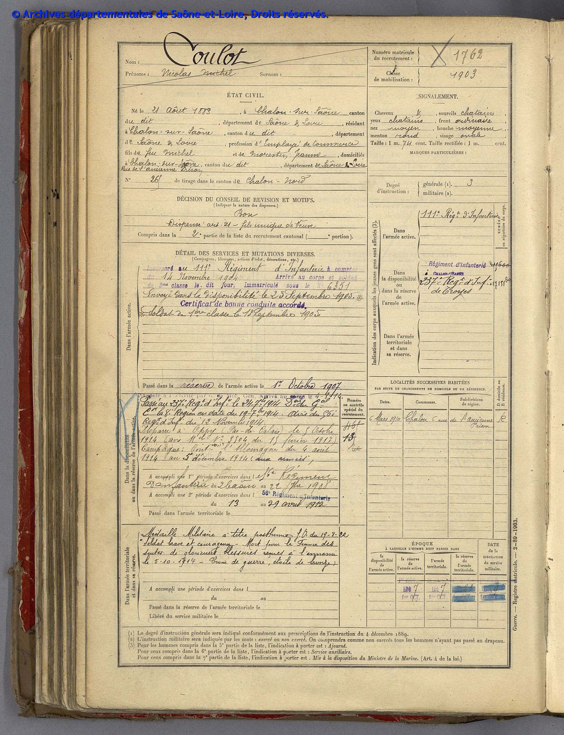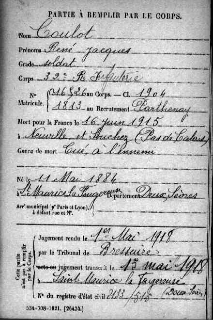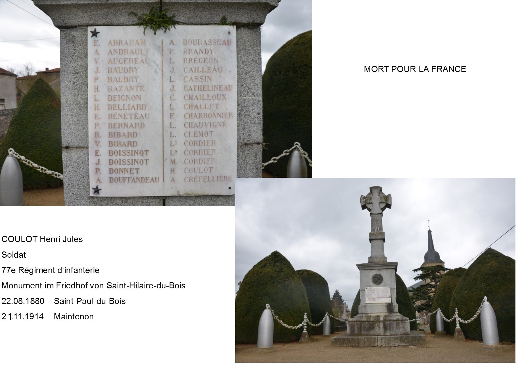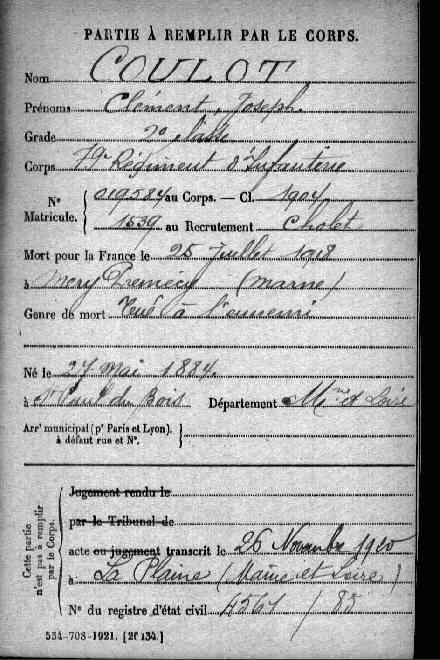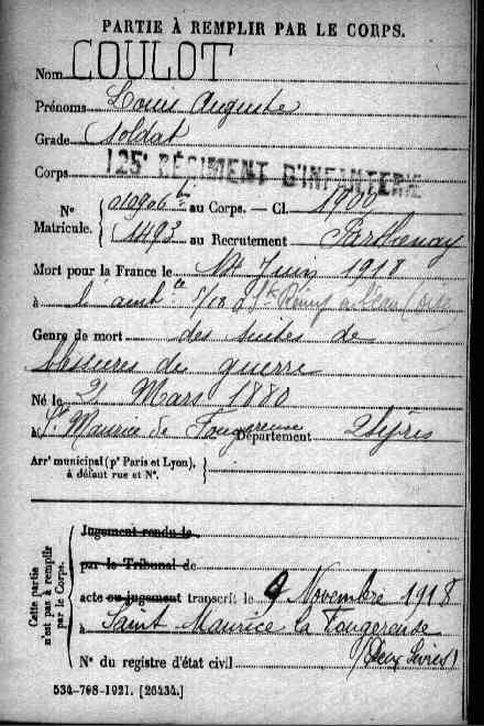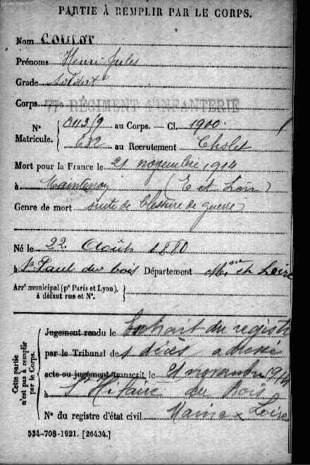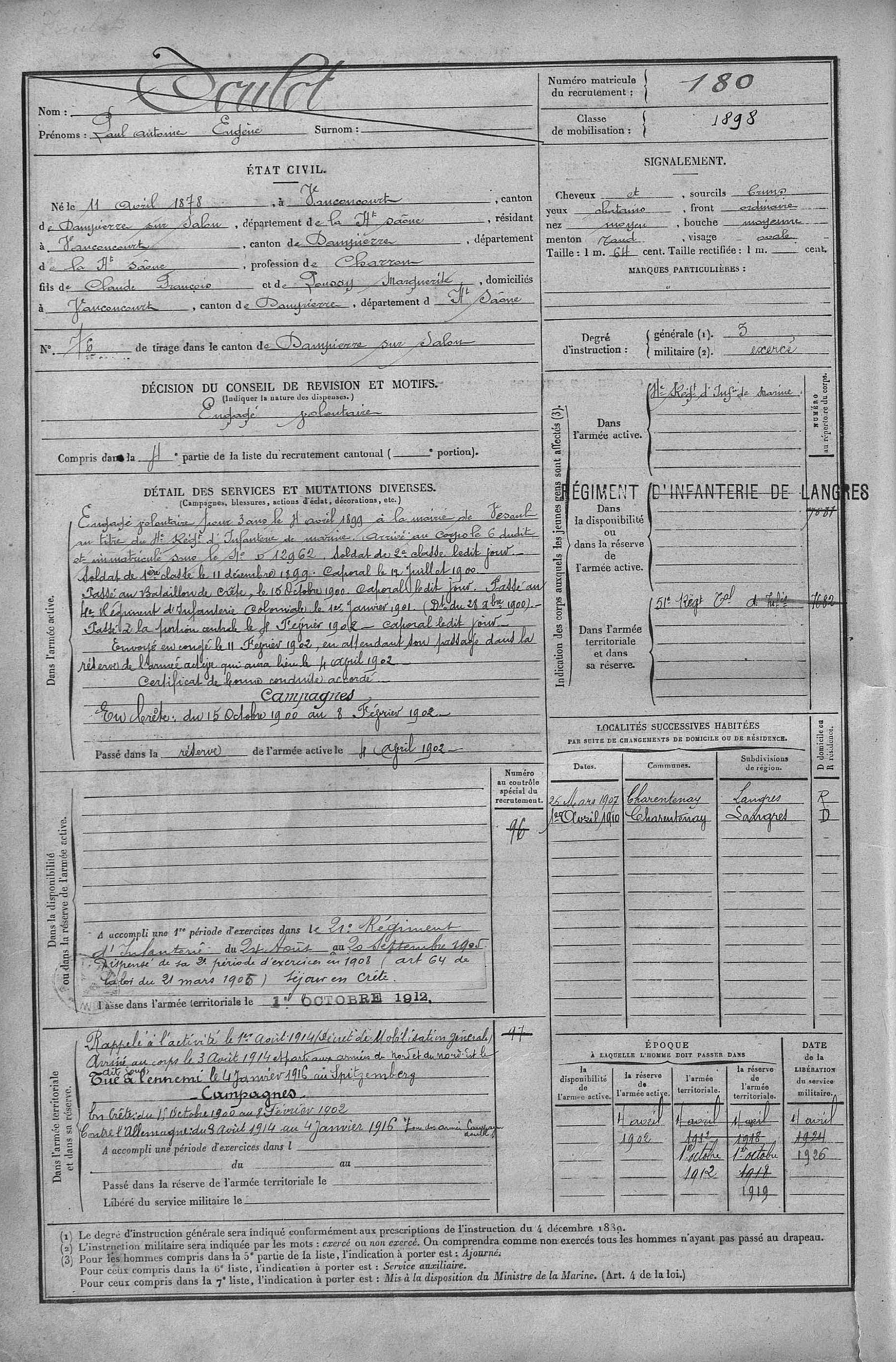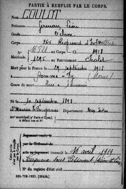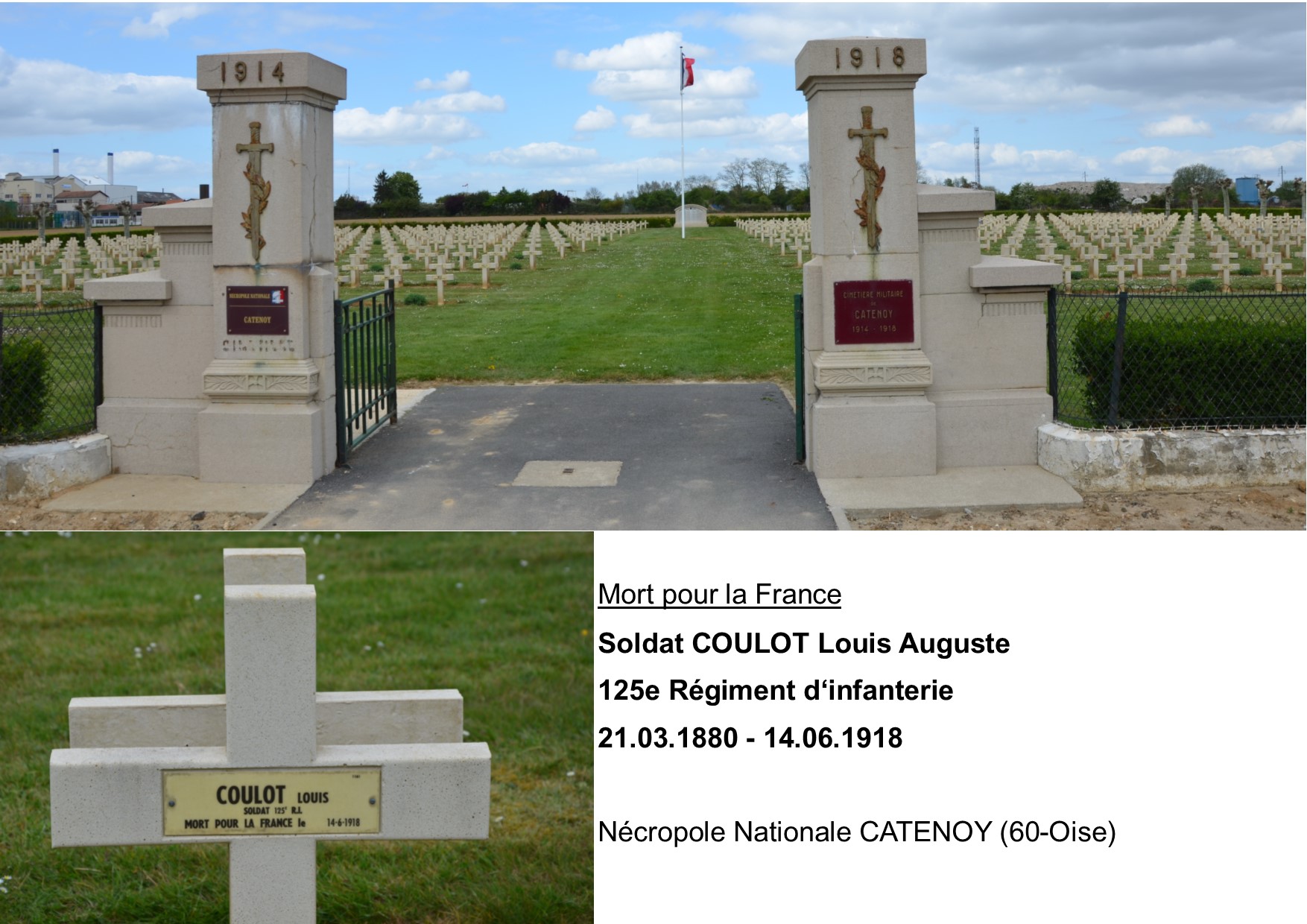 ( * ) Sergent COULOT Marie Joseph Florentin geboren am: 17.12.1872 in Roulans - Doubs 116e Régiment d'Infanterie Dienst in Akbou/Algerien vom Sept.1898 bis 23.06.1899 11.11.1893 bis 25.09.1894 Soldat 23.09.1894 Caporal 24.08.1898 Sergent 03.08.1914 Einsatzbefehl beim 115e Régiment d'Infanterie; 4e, 3e Reg. de Tirailleurs |