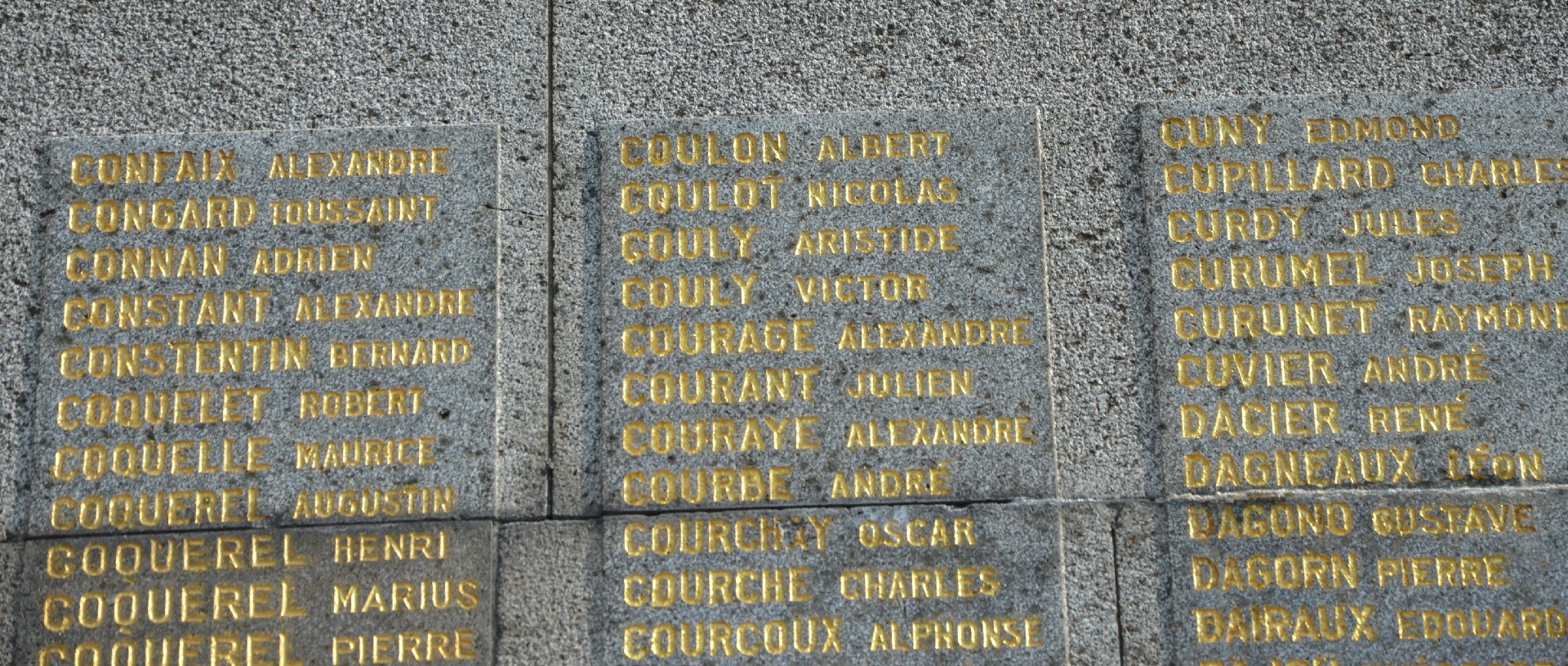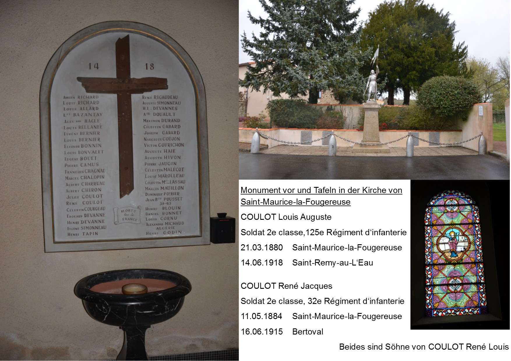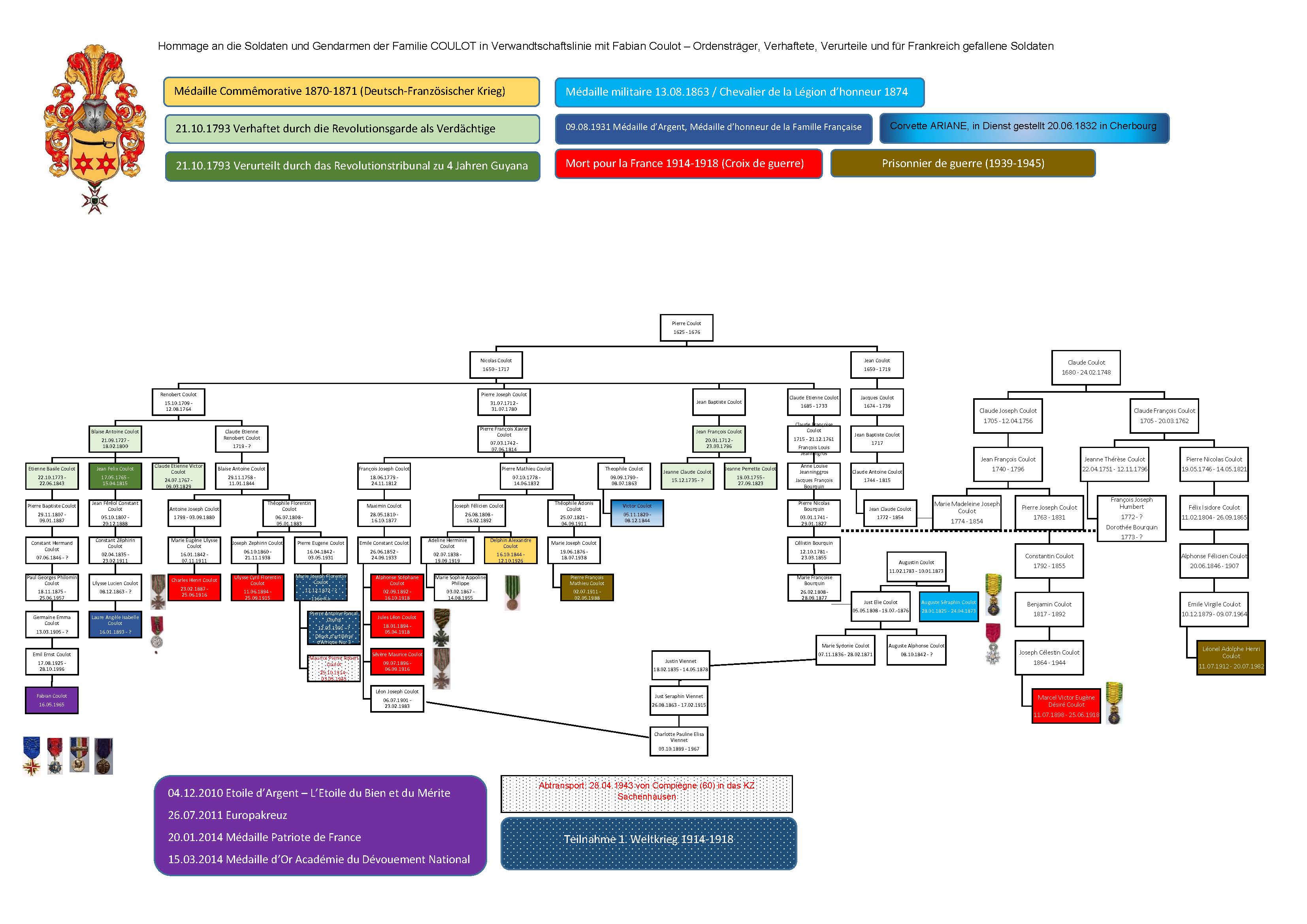 | Monsieur Gaston COULOT (geboren 1885) wanderte nach Amerika aus und erreichte am 4. August 1929 den Hafen in Niagara Falls, New York | COULOT Nicolas, Garde-chiourme (Galeeren-Wächter), Geboren am 17.05.1809 | Soldat 2e classe COULOT Marius Joseph Eugène, 47e Régiment d'Artillerie, Depot Hericourt (Teil der Luftwaffe), Geboren: 04.11.1894, Dienst: 25.07.1917 | COULOT Alain, Ernennung zum Inspecteur principal de la police national am 21.07.1992 |