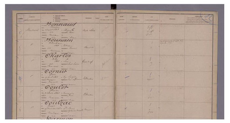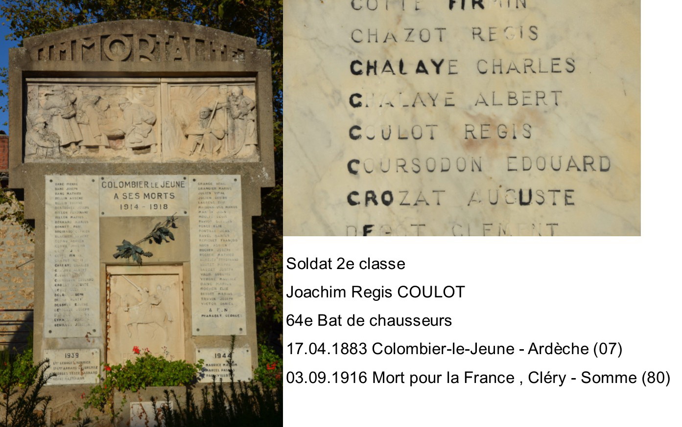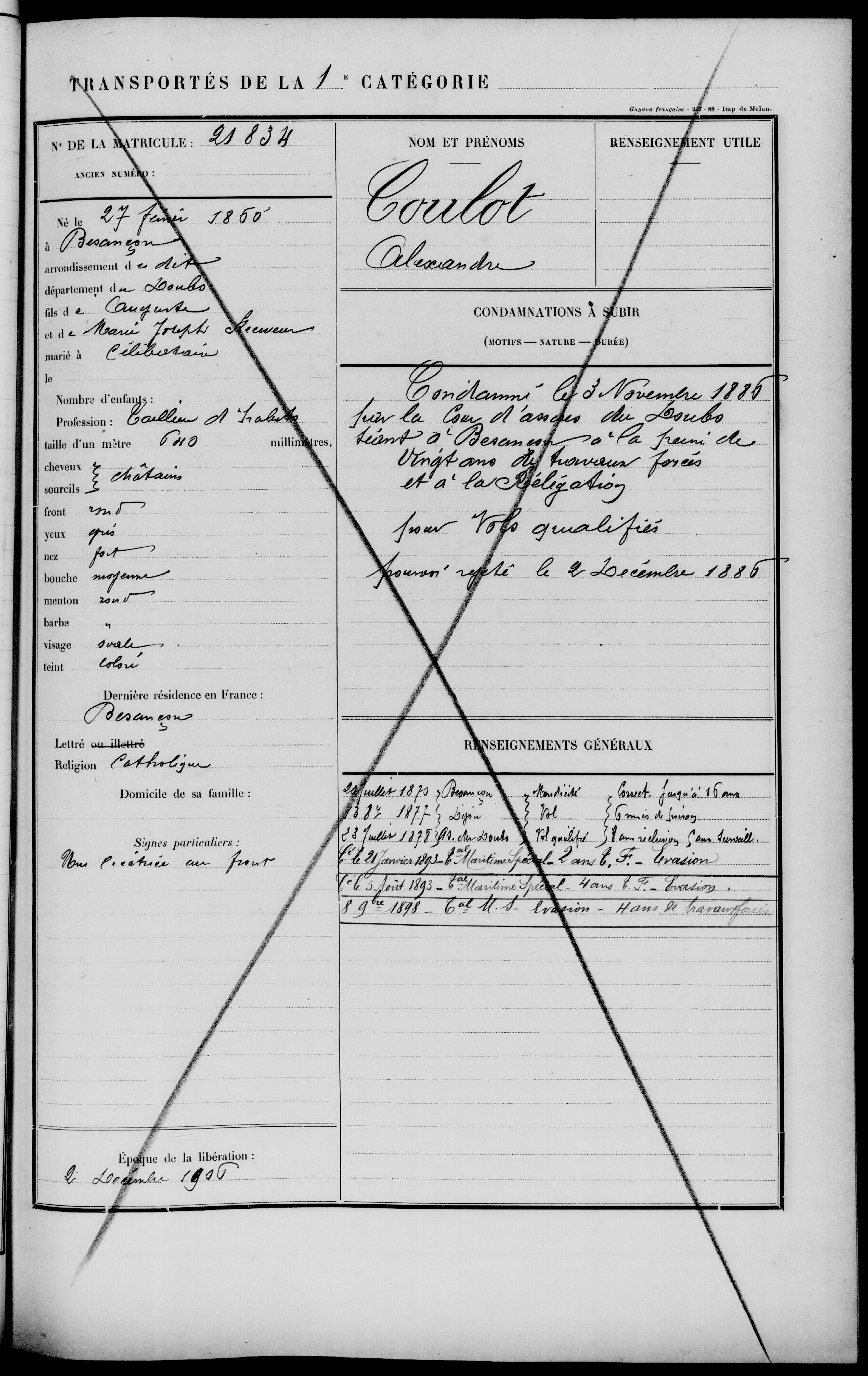 | Monsieur Gaston COULOT (geboren 1885) wanderte nach Amerika aus und erreichte am 4. August 1929 den Hafen in Niagara Falls, New York | COULOT Nicolas, Garde-chiourme (Galeeren-Wächter), Geboren am 17.05.1809 | Soldat 2e classe COULOT Marius Joseph Eugène, 47e Régiment d'Artillerie, Depot Hericourt (Teil der Luftwaffe), Geboren: 04.11.1894, Dienst: 25.07.1917 | COULOT Alain, Ernennung zum Inspecteur principal de la police national am 21.07.1992 |