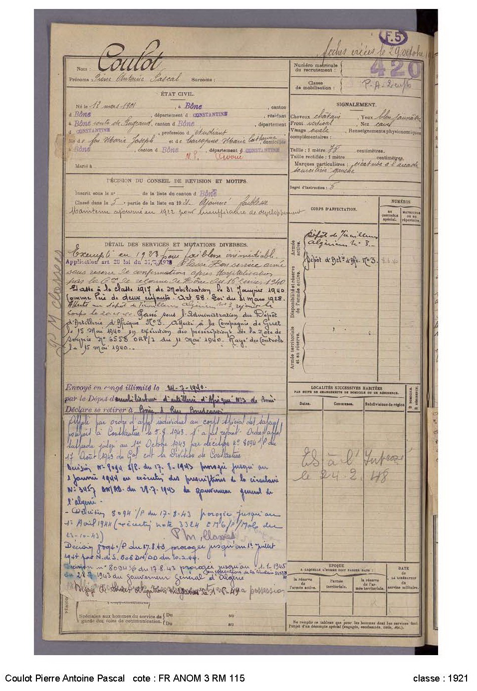 Pierre Antoine Pascal geboren am: 12.03.1901 in Bône - Constantine Dépot d'artillerie d'Afrique No. 3 |