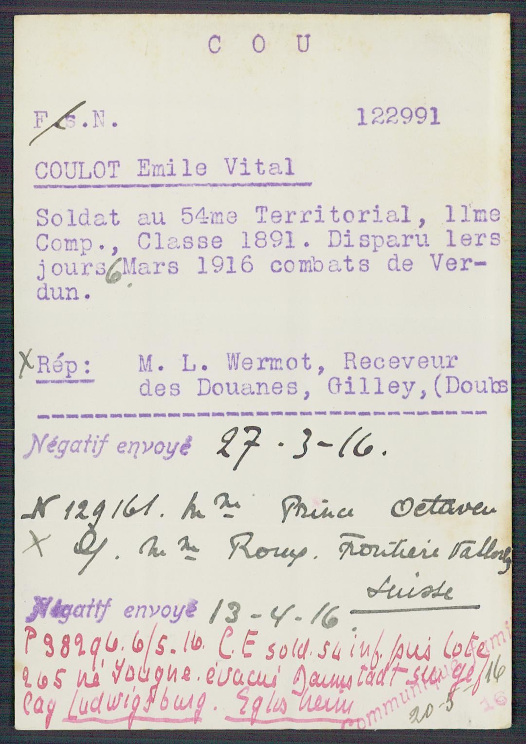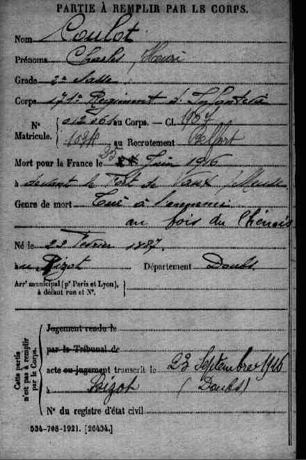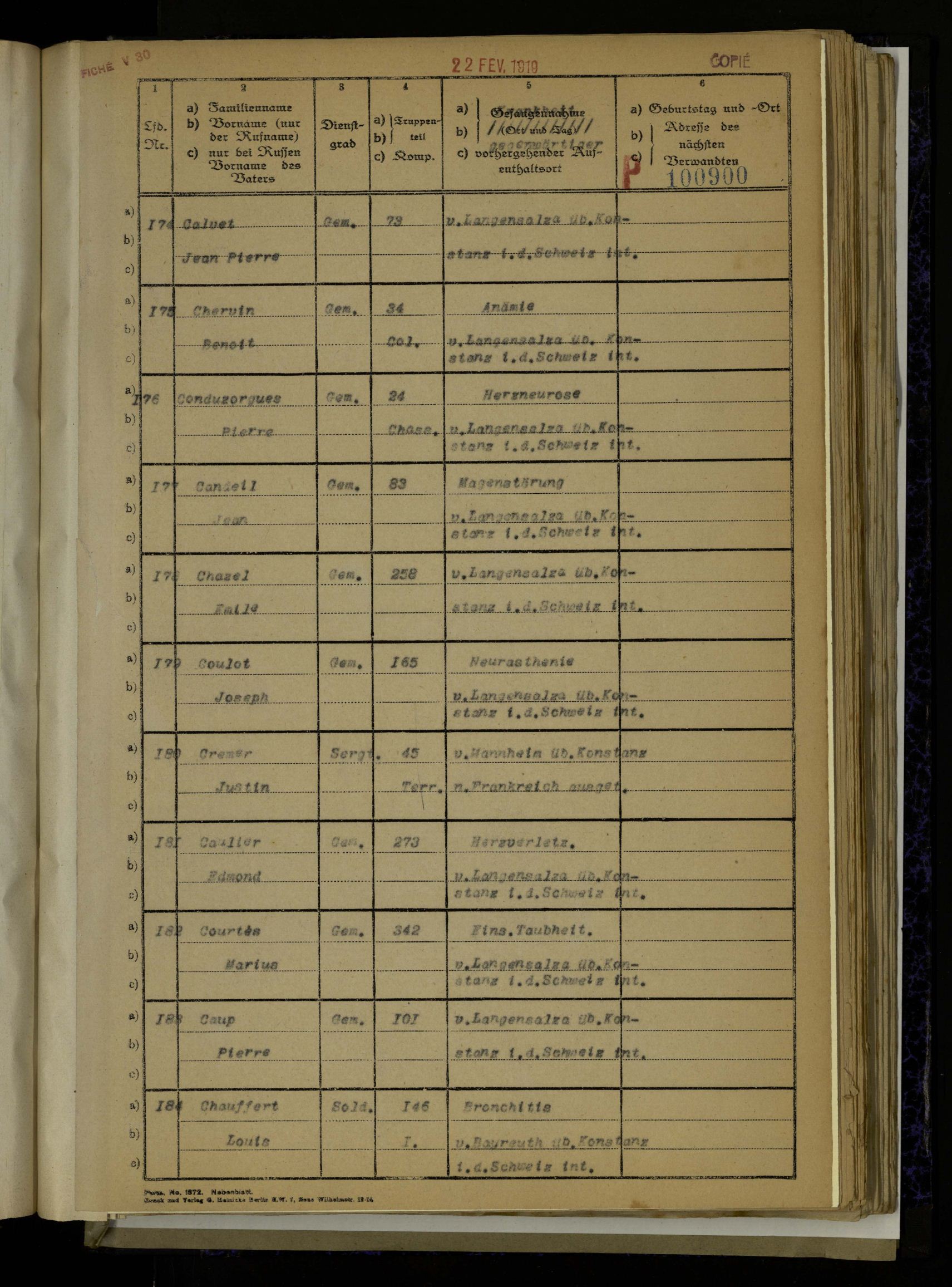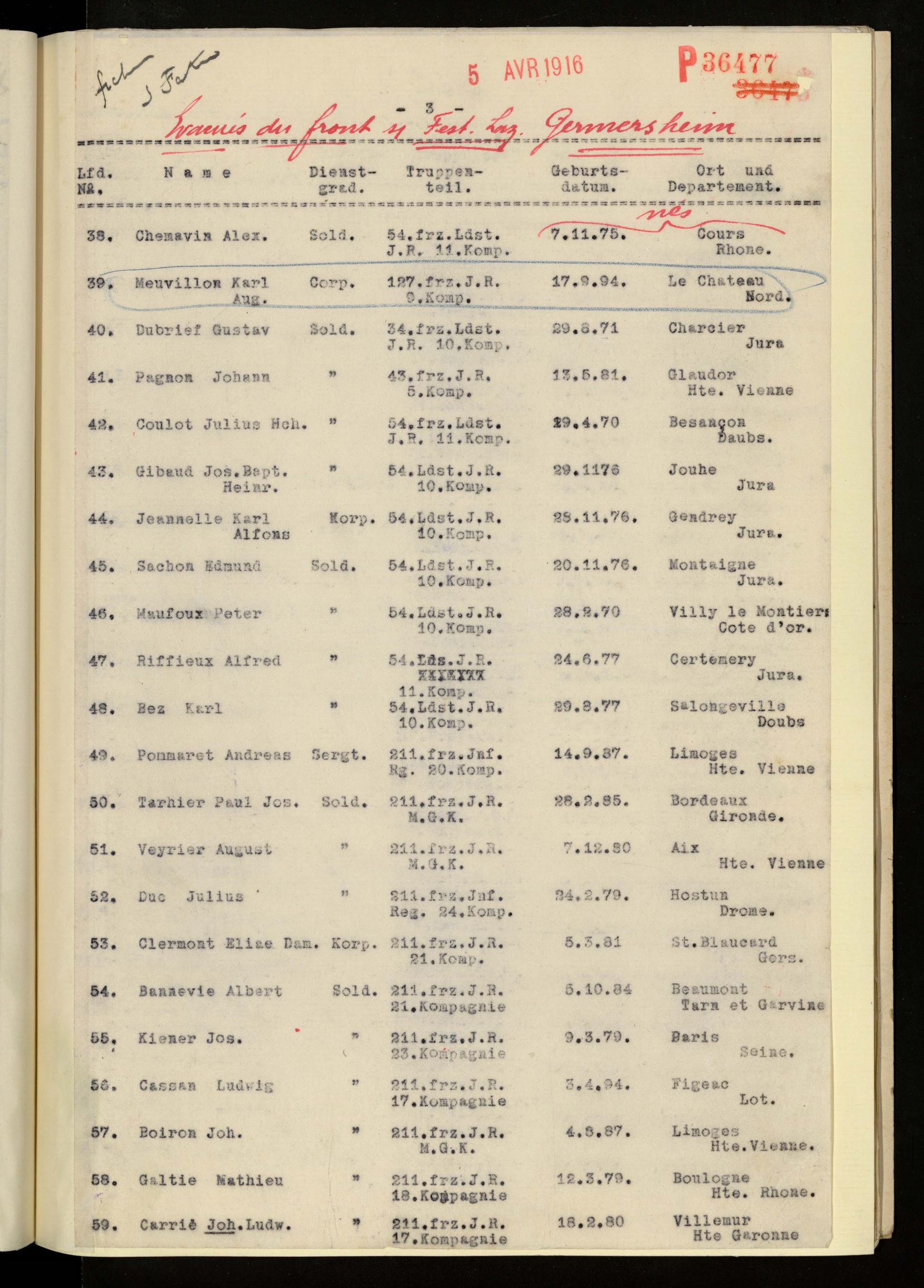 Soldat Julius Hch COULOT geb. 29.04.1870 in Besançon 54e Régiment d'Infanterie, 11e Compagnie 05.04.1916 im Front,-und Festungslazarett Germersheim |