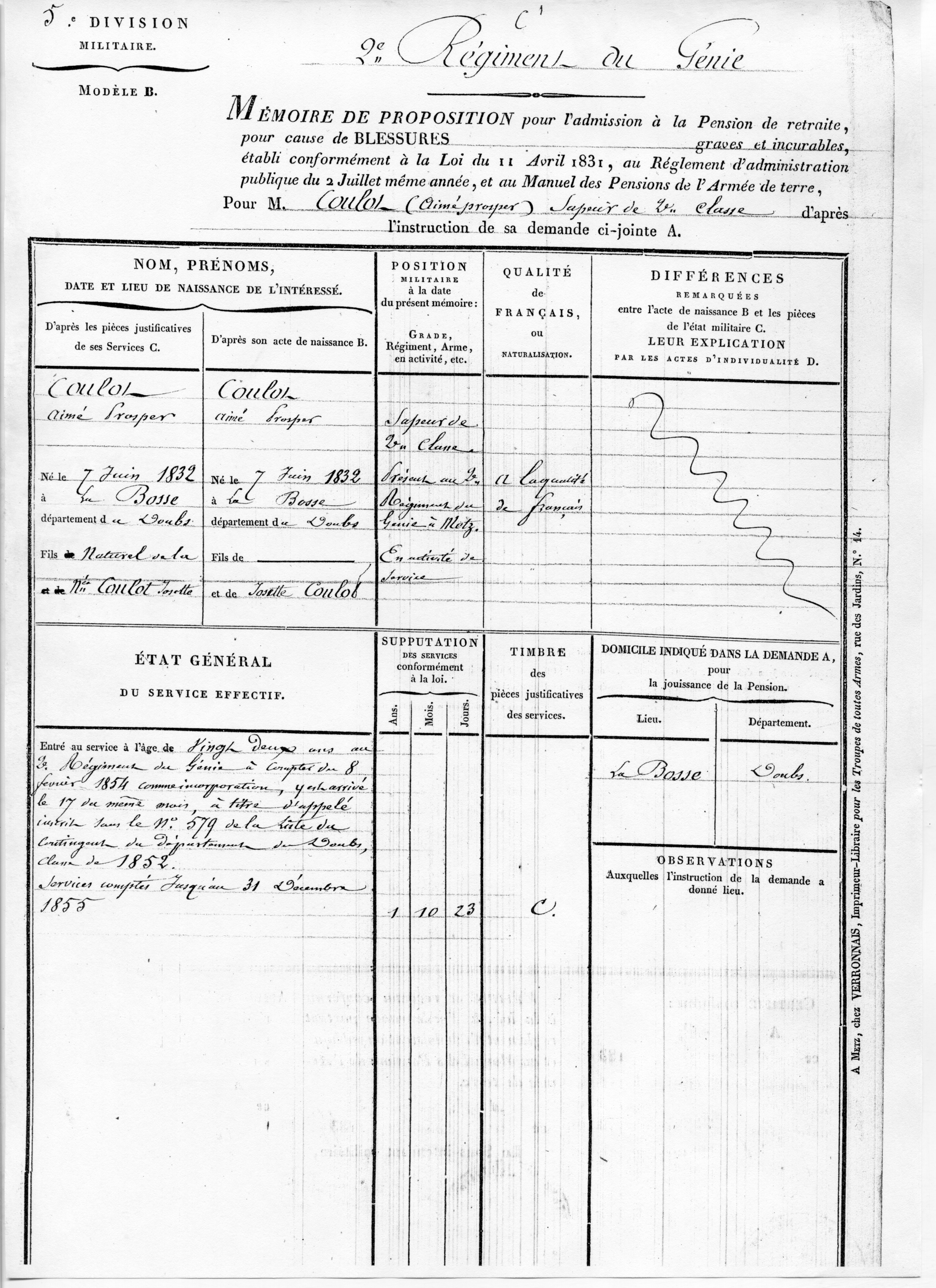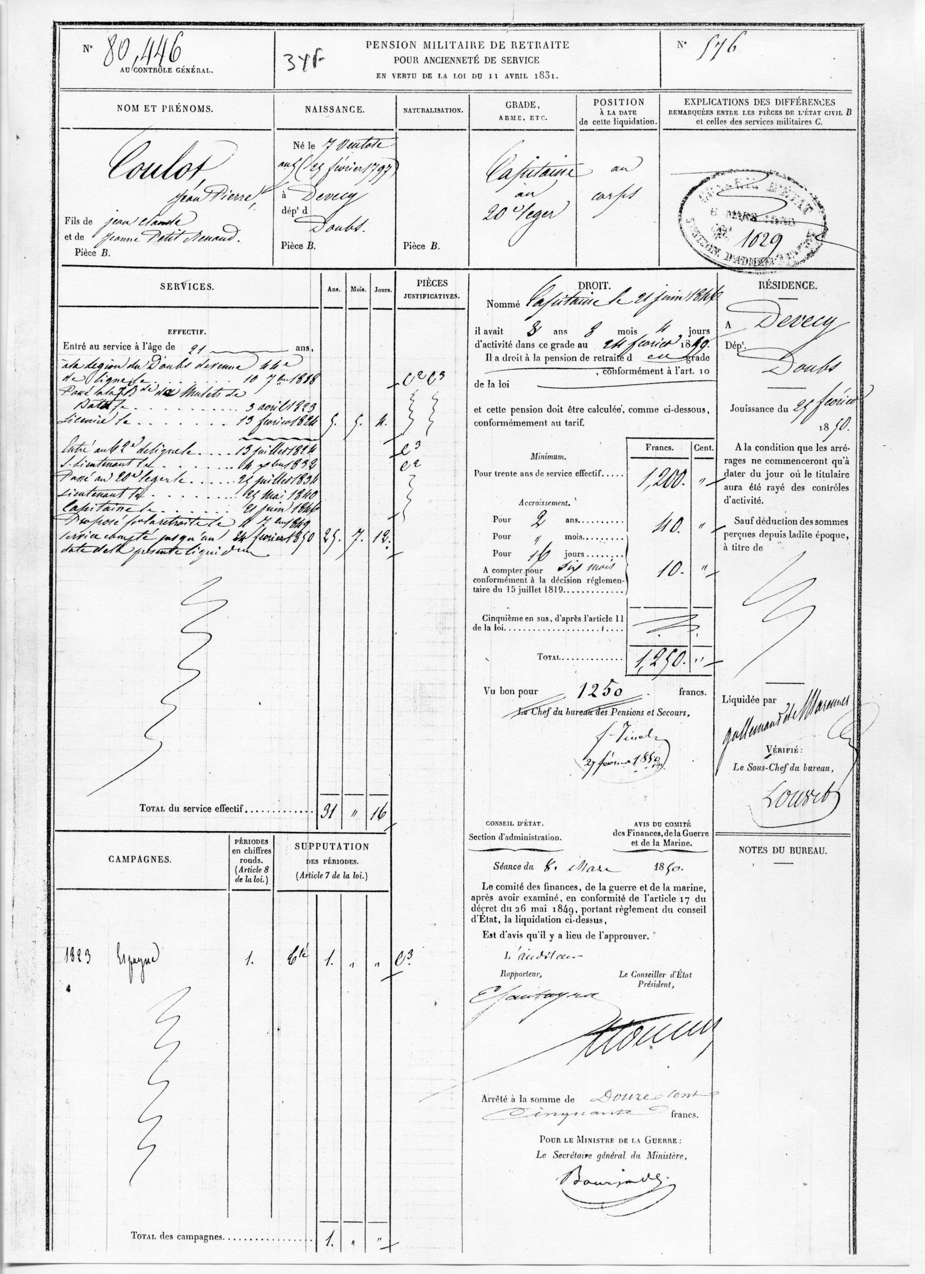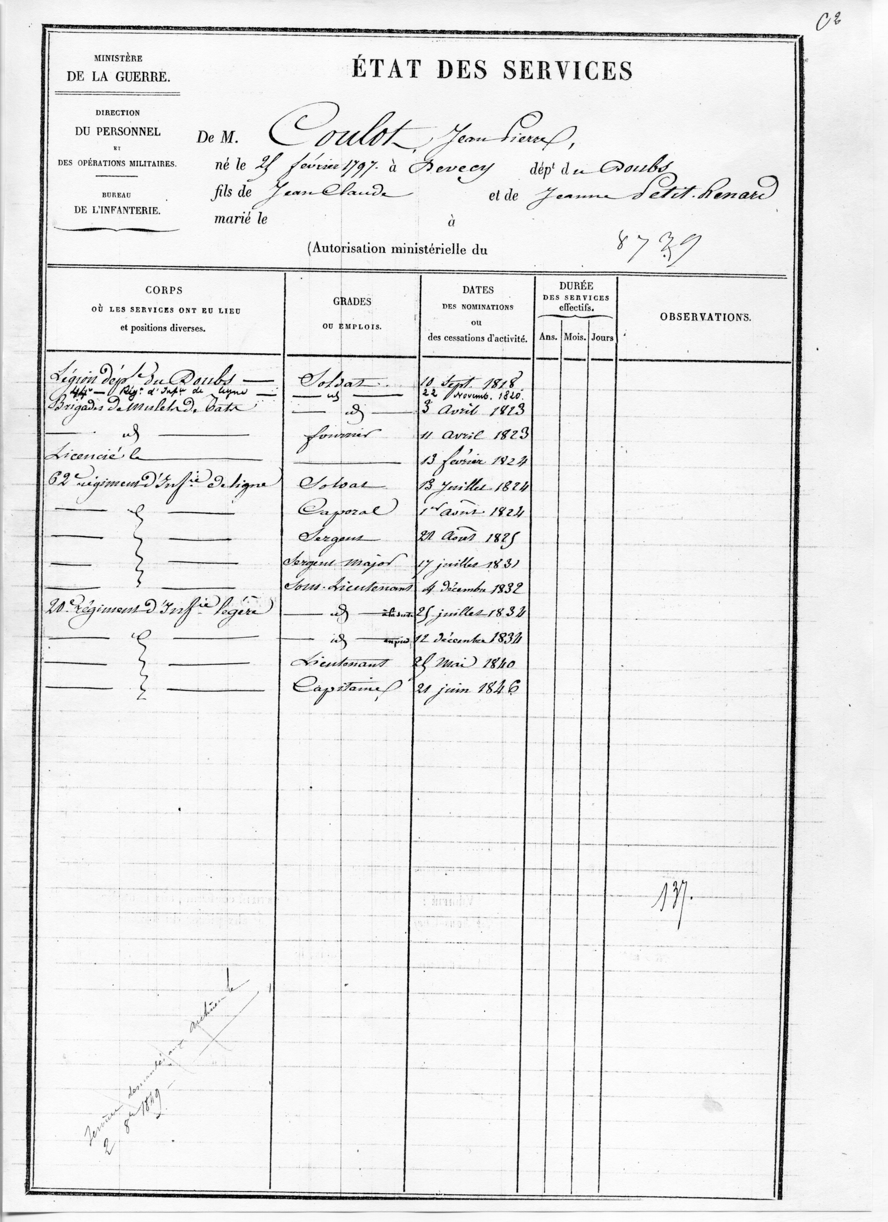 d'Infanterie légère Geboren: 23.02.1797 in Devecey / Doubs 10.09.1818 Légion Departement du Doubs 22.11.1820 44e Régiment d'Infanterie du ligne 03.04.1823 Brigadier 11.04.1823 Fourier 13.07.1824 62e Régiment d'Infanterie du ligne 01.08.1824 Caporal 21.08.1825 Sergent 17.07.1831 Sergent Major 04.12.1832 Sous-lieutenant 25.07.1834 20e Régiment d'Infanterie légère 29.05.1840 Lieutenant 21.06.1846 Capitaine 1823 1 Jahr Kriegseinsatz in Espagna |