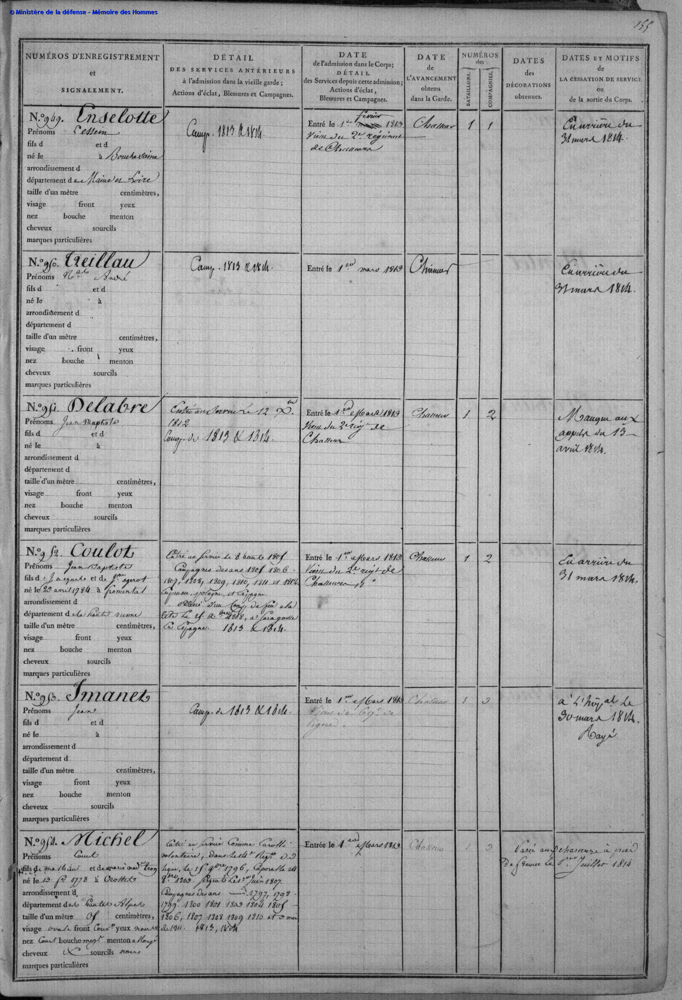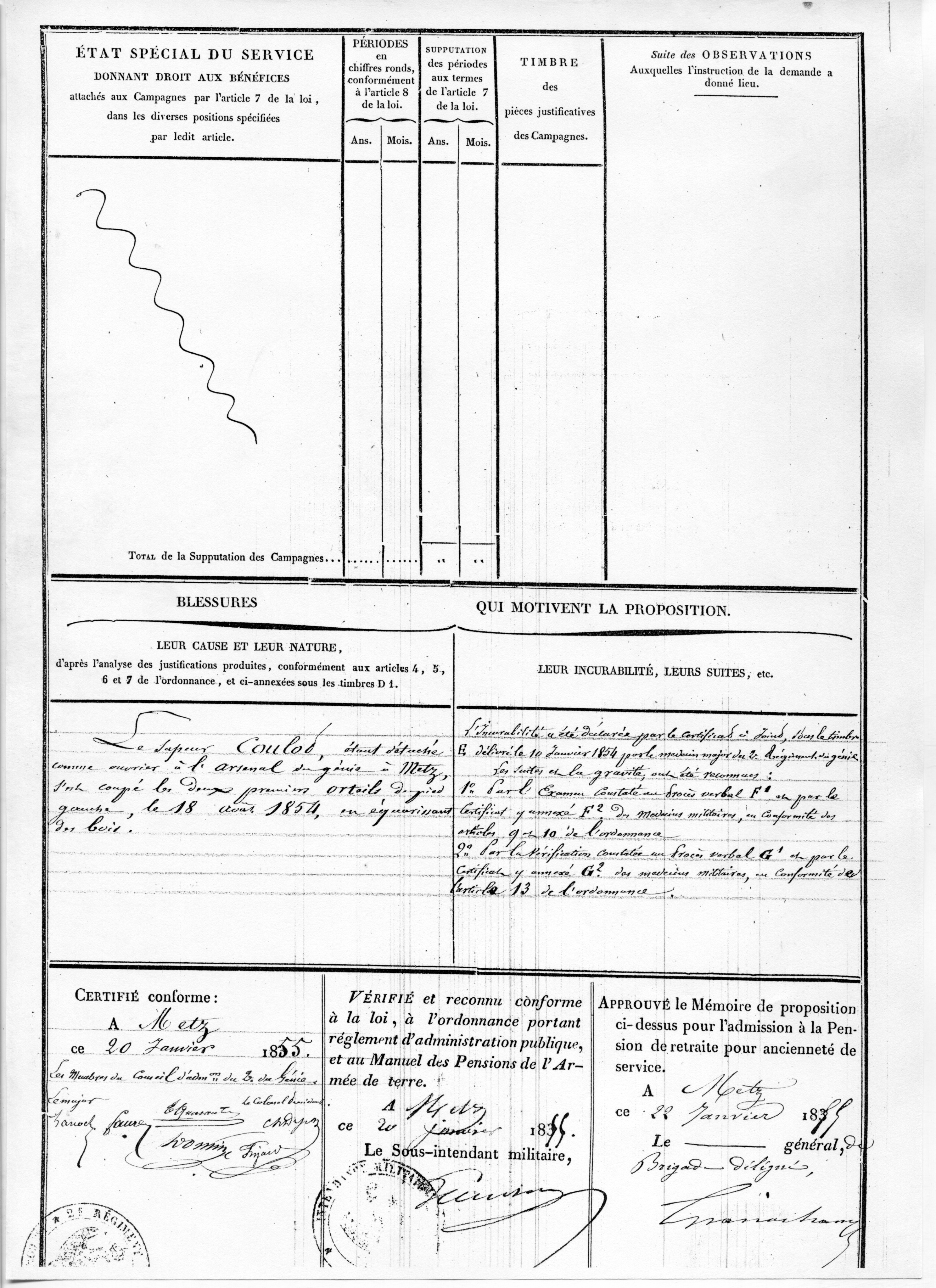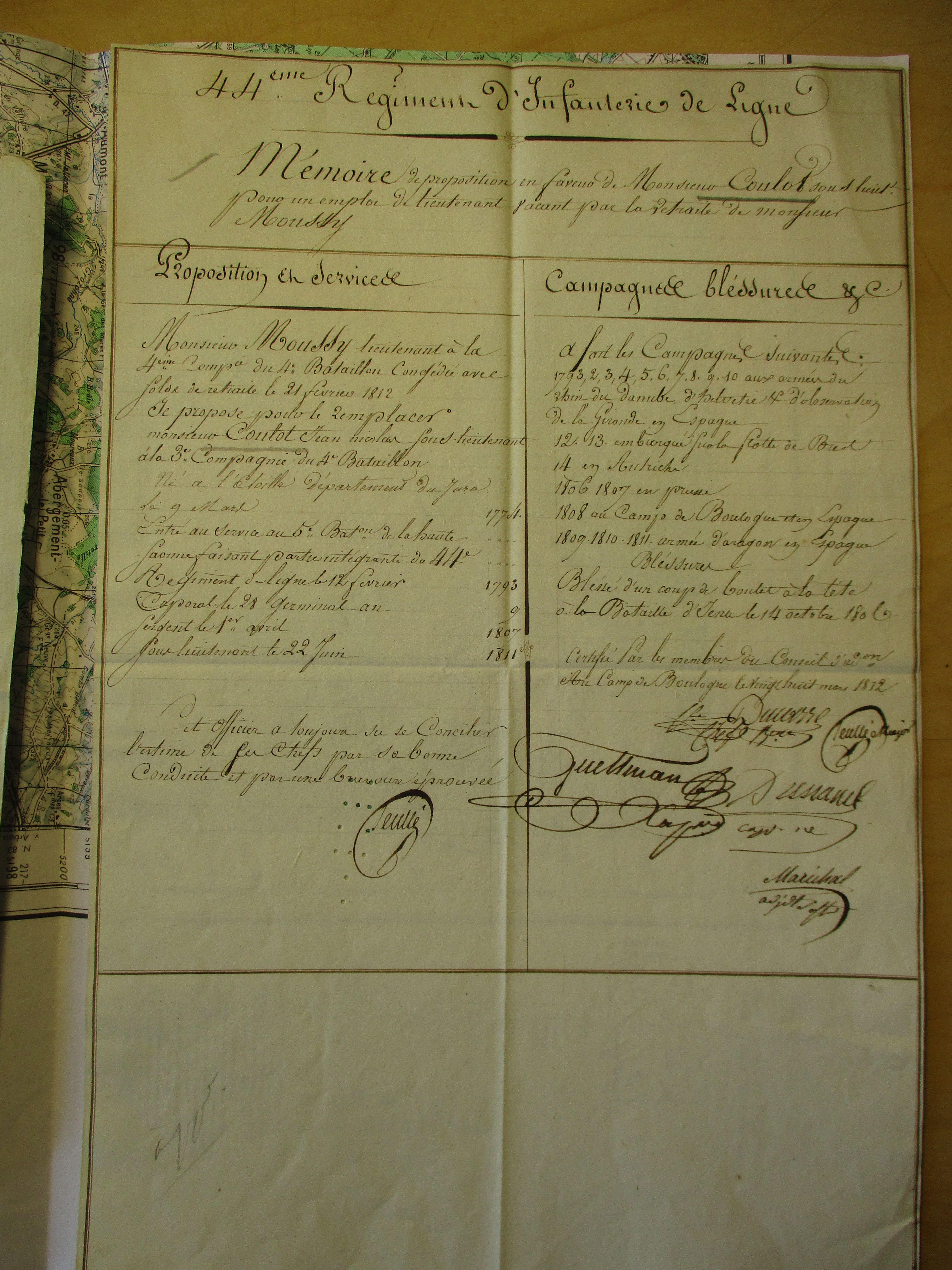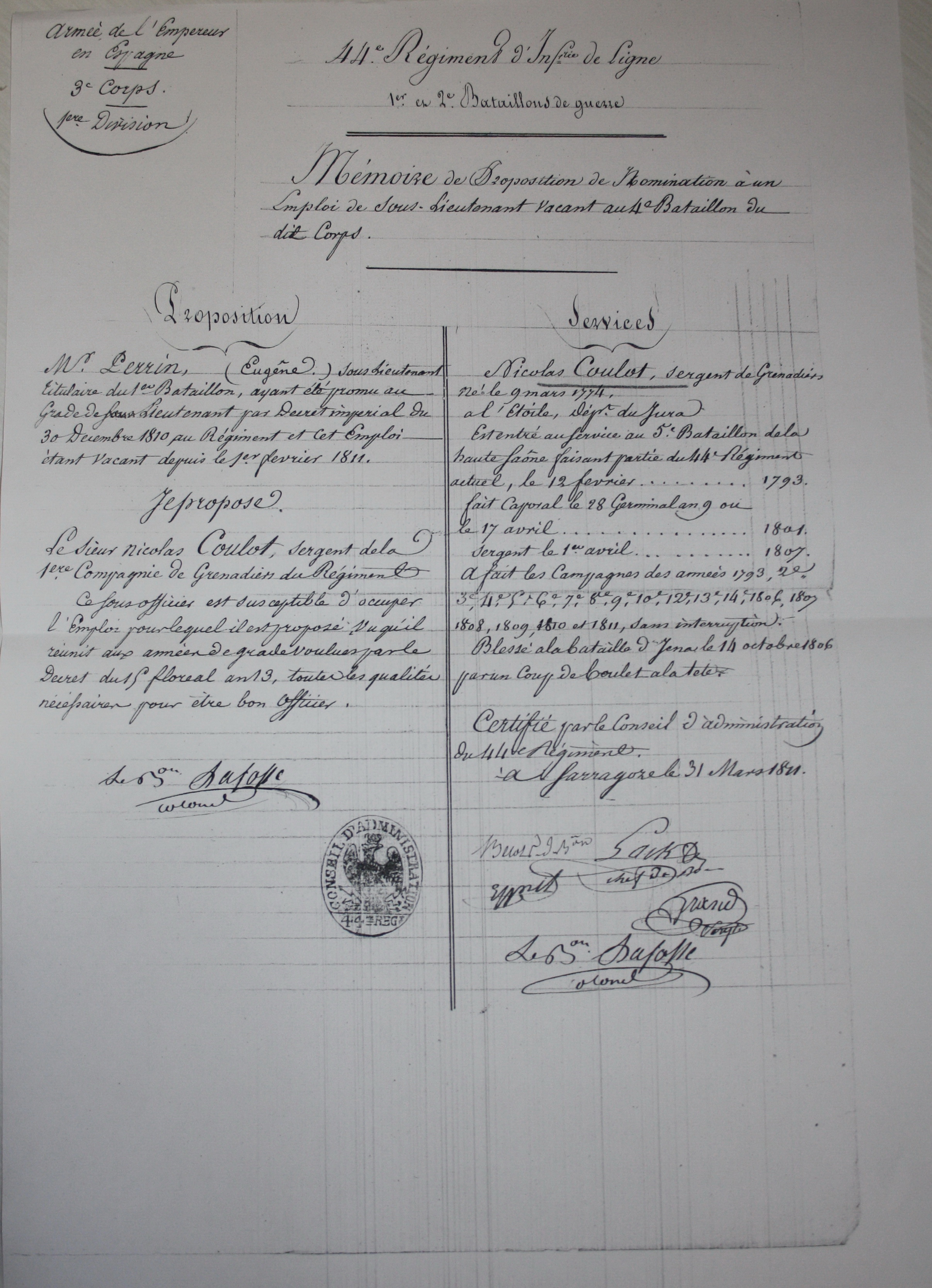 COULOT Nicolas 44e Régiment d'Infanterie ligne Geboren: 09.03.1774 in L'Etoile / Doubs 1793 Eintritt in die 3. Compagnie, 4. Bataillon 18.04.1801 Caporal 01.04.1807 Sergent 22.06.1811 Sous-lieutenant Verwundet: 14.10.1806 Schlacht bei Jena Verwundet: 27.11.1812 Schlacht in Borisow (Beresina) 1812 Certifé par la membre du conseil d'Aministration |