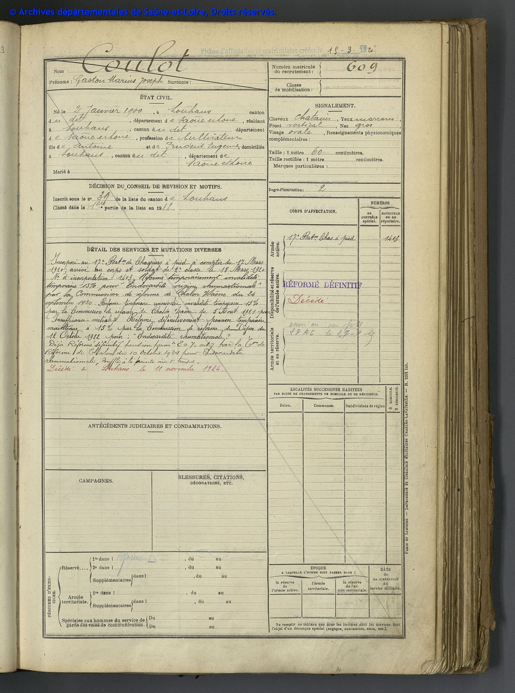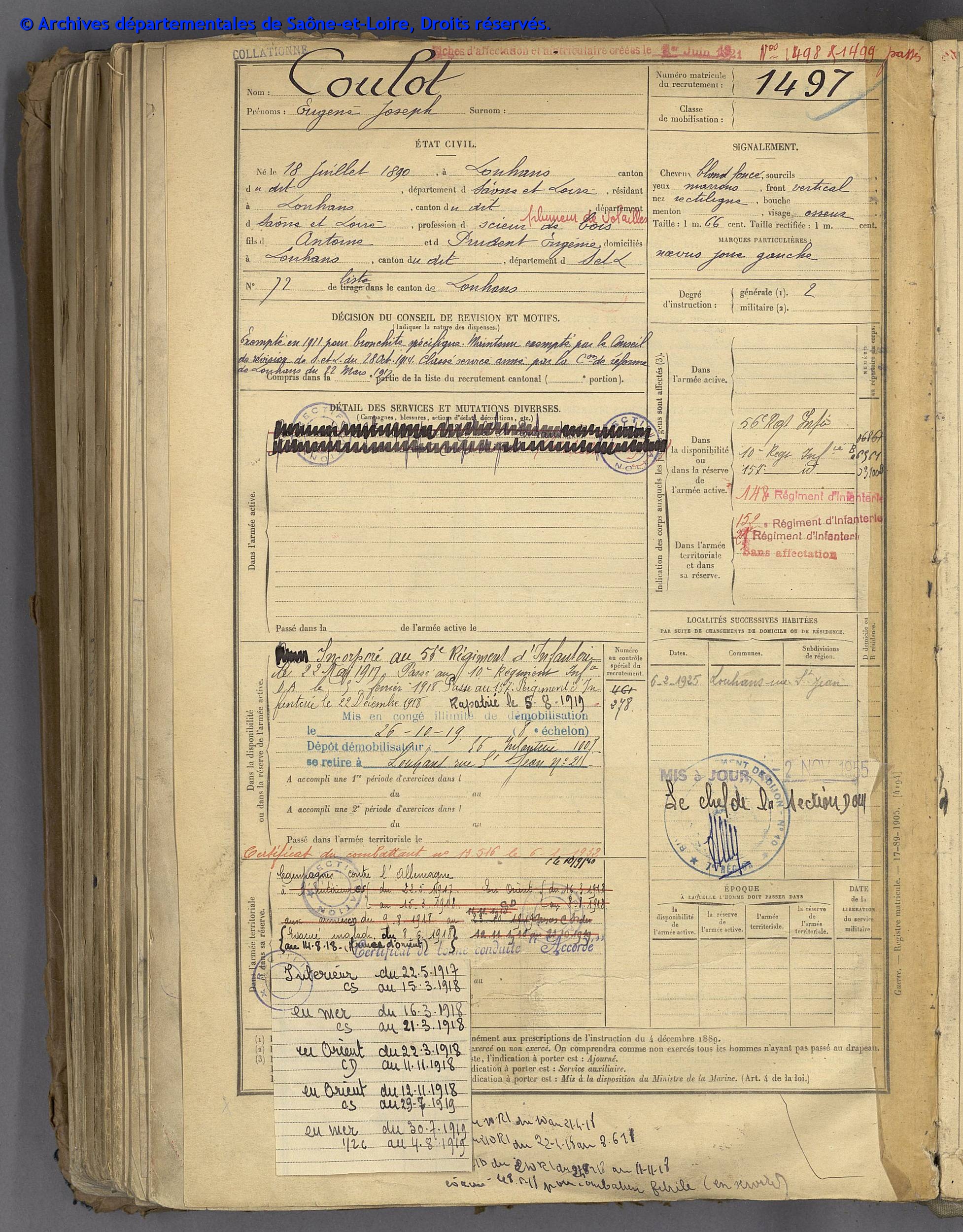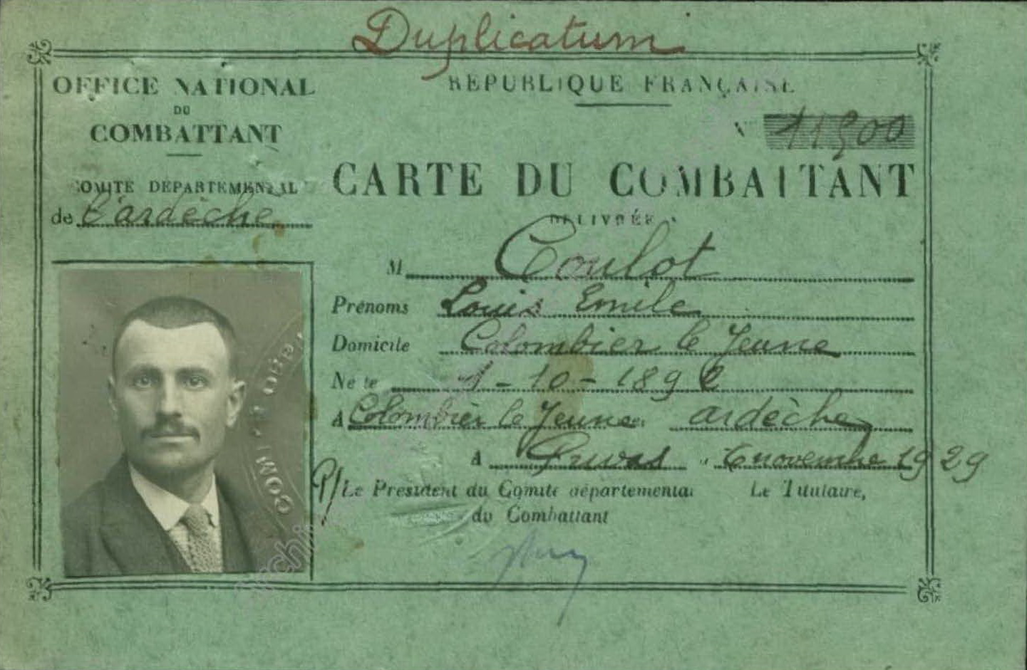 Soldat 2e classe COULOT Edouard 21.05.1888 - 27.09.1925 geboren in Tracy-le-Mont, Canton Attichy 161e Régiment d'Infanterie Certificate de bonne conduite: accordé *Bruder von Sergent COULOT Arséne Maurice |