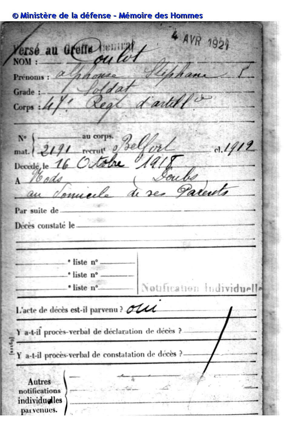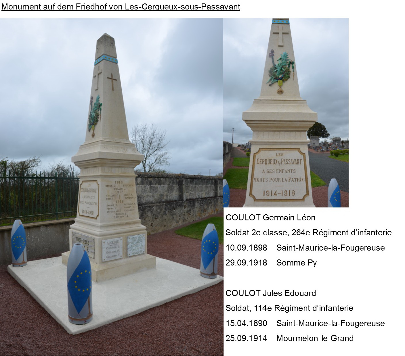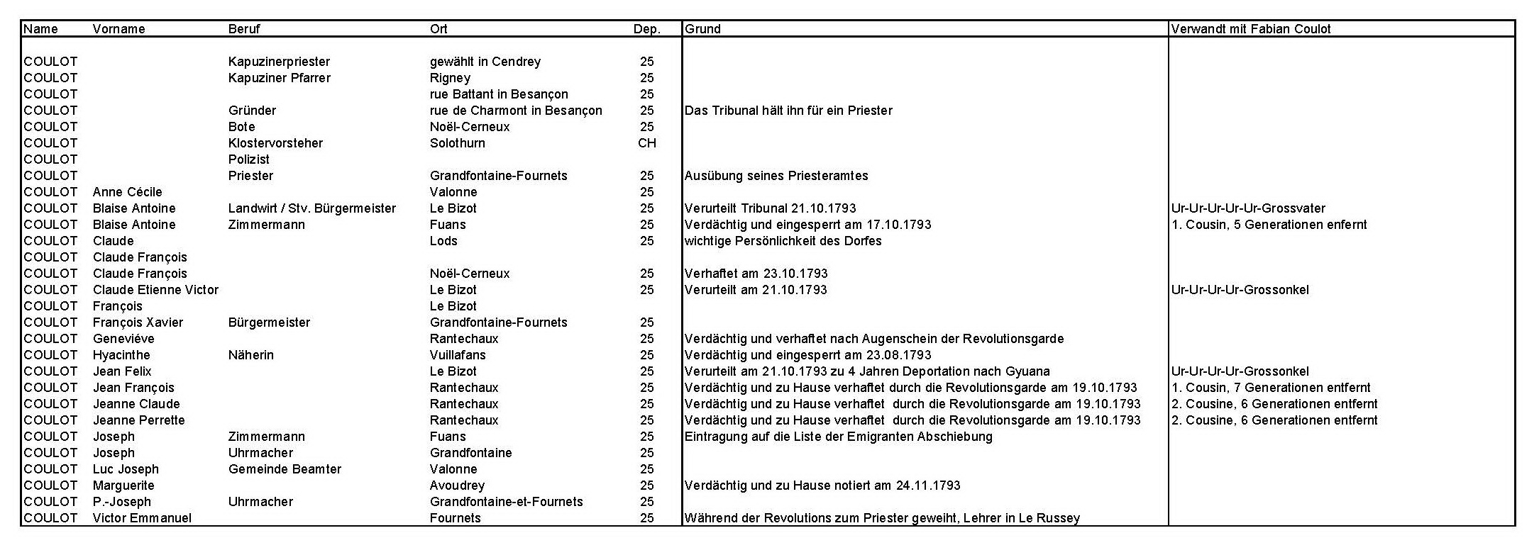 | Canonier 2e classe | COULOT | Pierre François Mathieu | 02.07.1911 | 02.05.1988 | Nods (Doubs) | 228e R.A.L.D. | keine Angaben | keine Angaben | 5. Cousin, 3 Generationen |