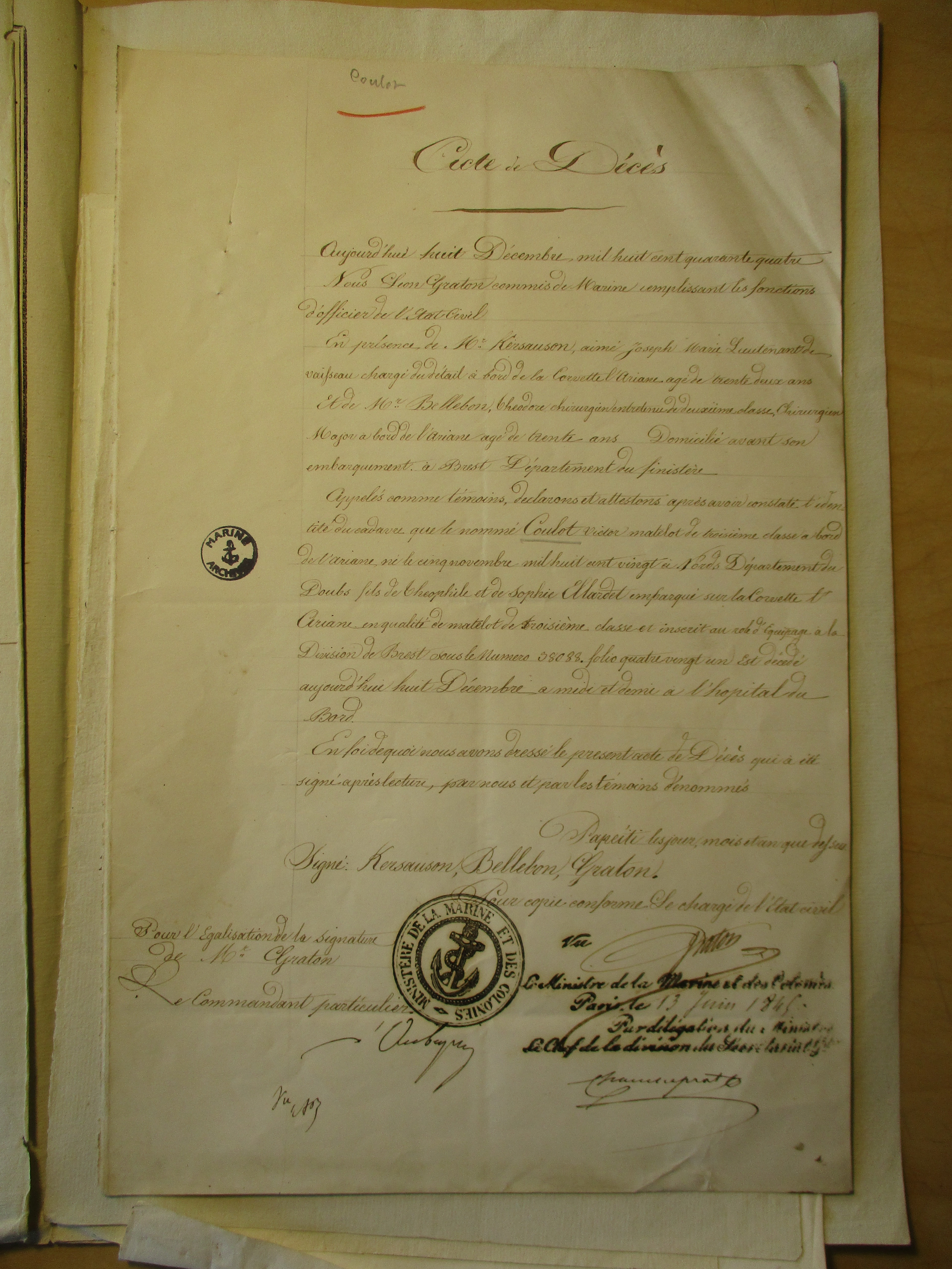 matelot 3e classe COULOT Victor Corvette ARIANE 05.11.1820 in Nods 08.12.1844 im Bordspital der Corvette ARIANE in Papeete Tahiti,Französisch-Polynesien ![]() ![]() *Verwandt mit Fabian Coulot. 3.Cousin, 5. Generation |
