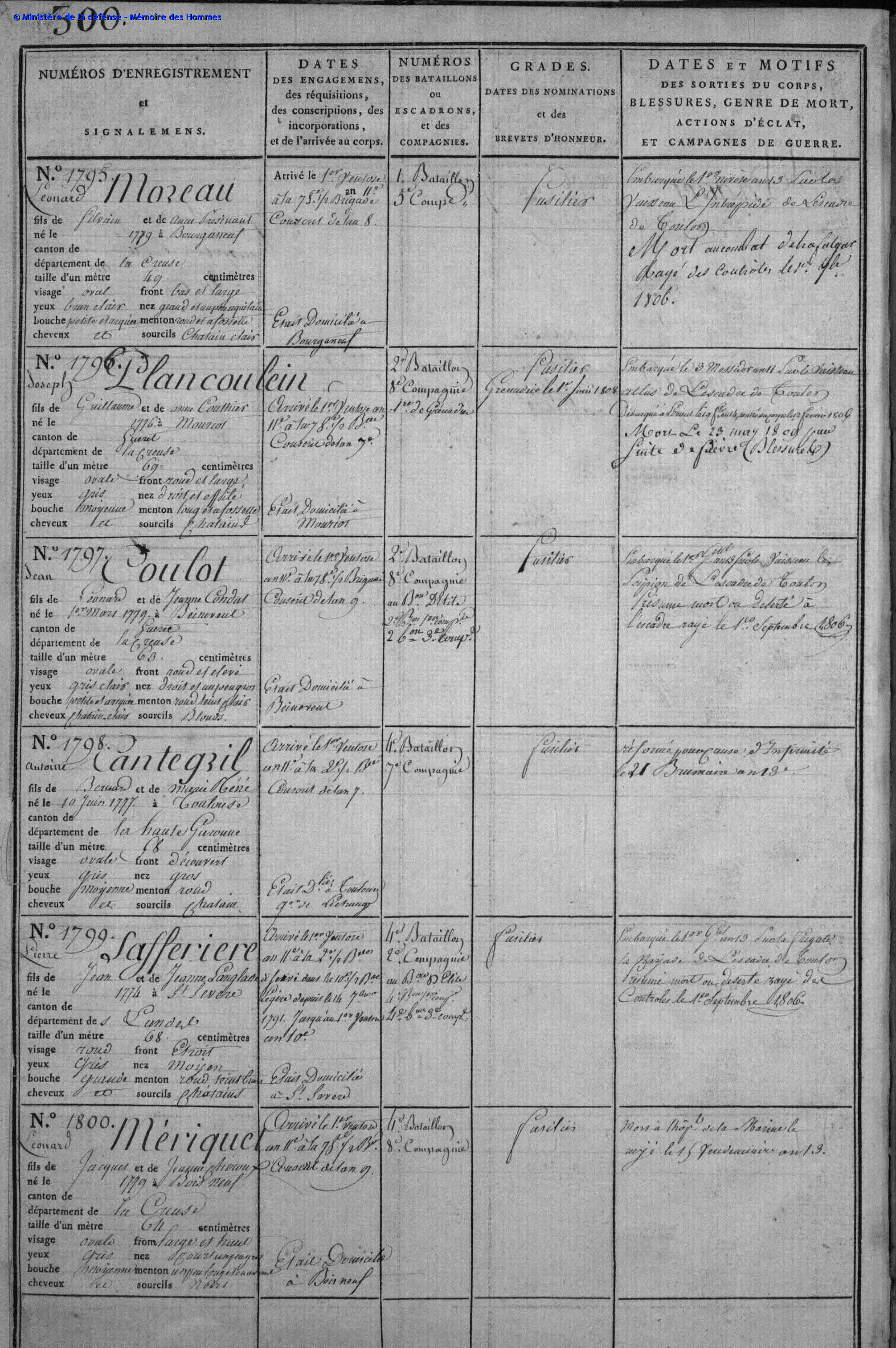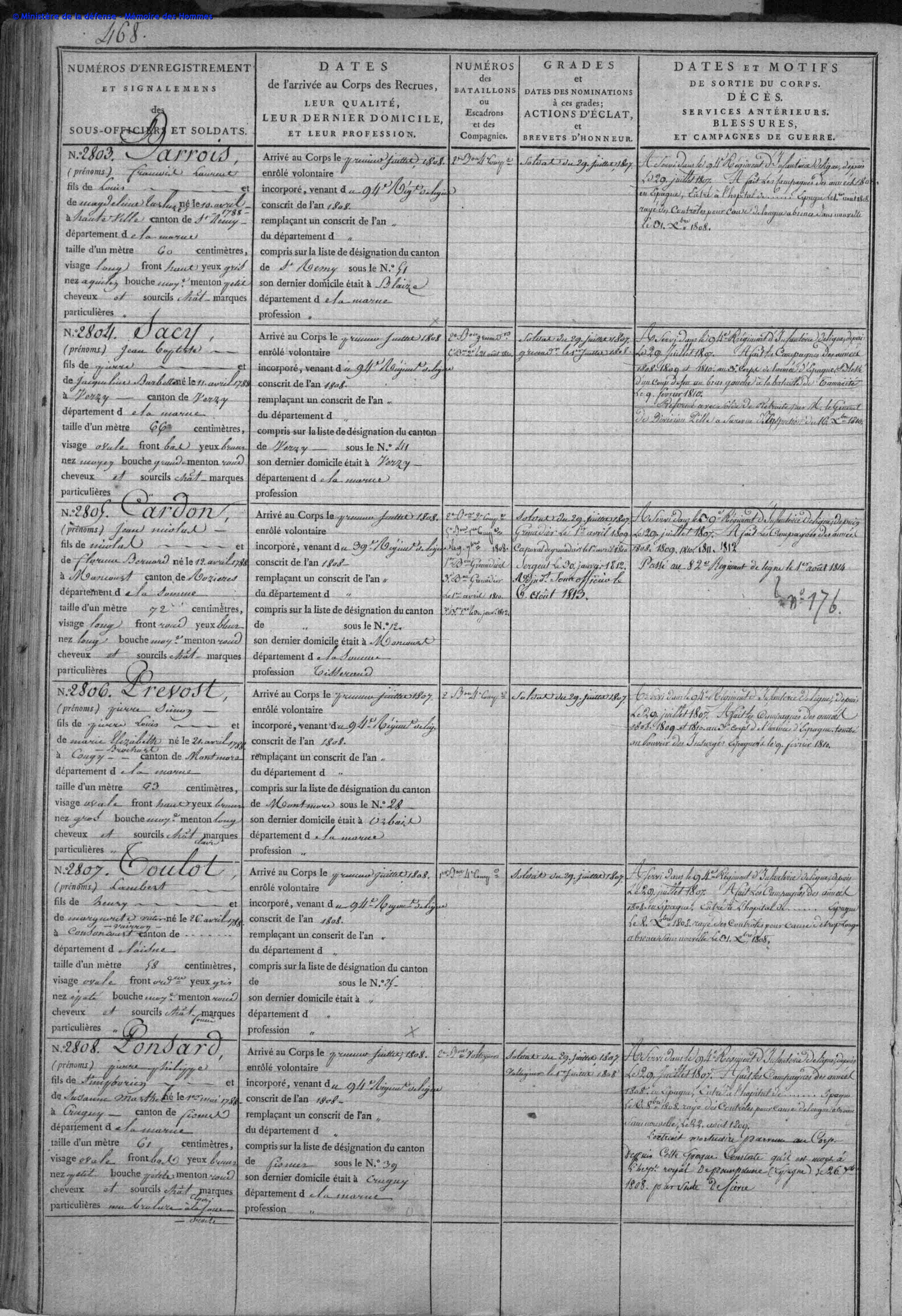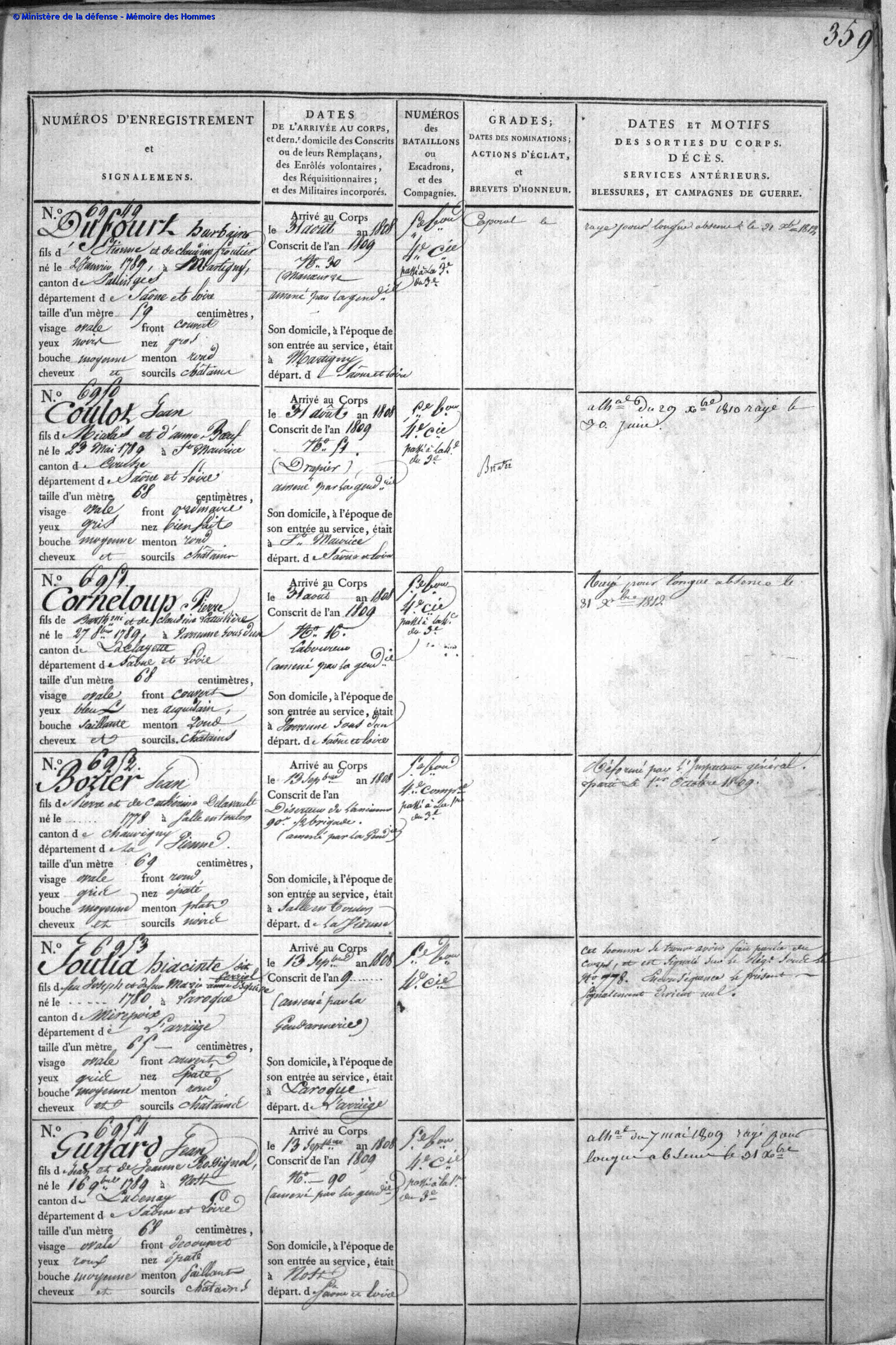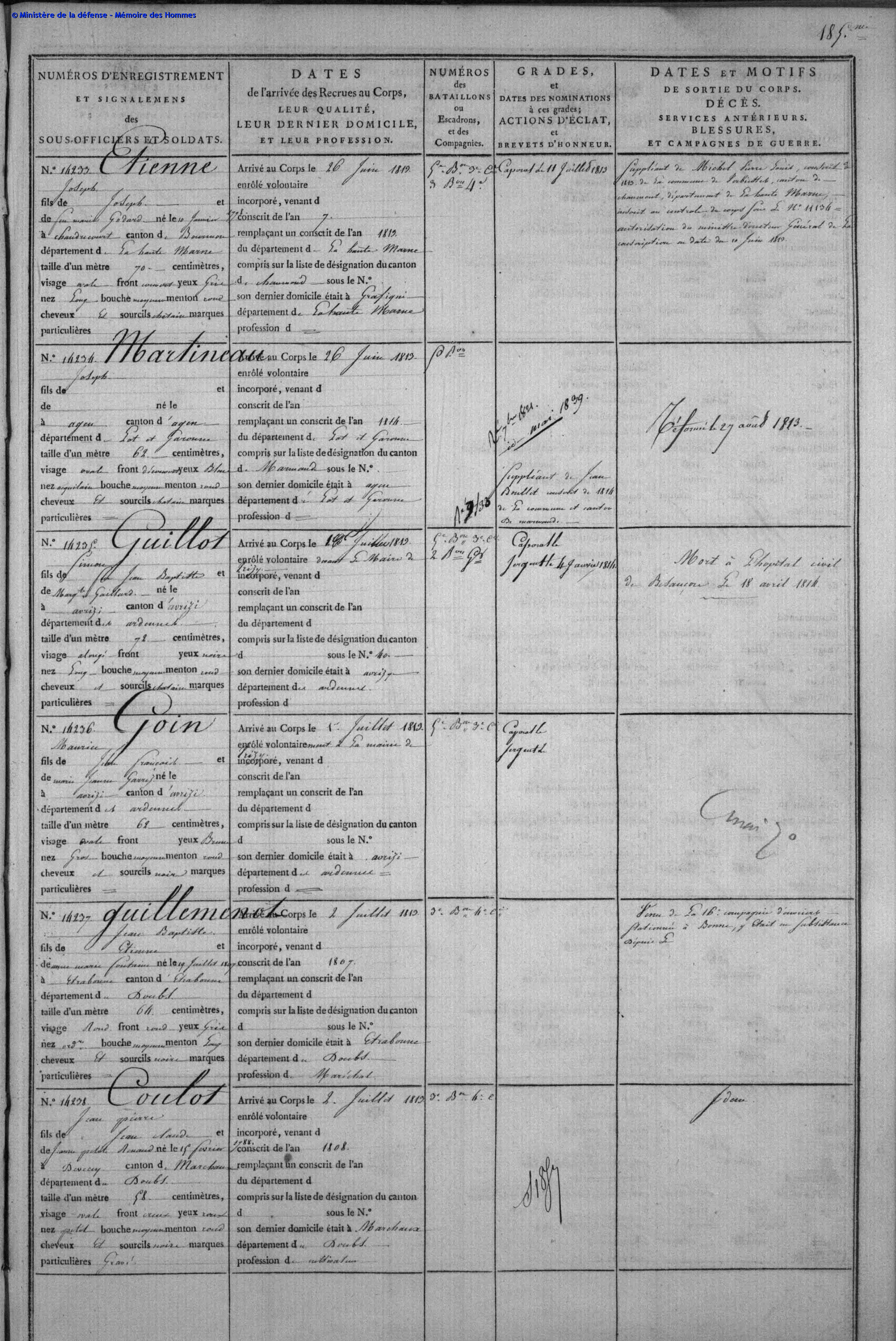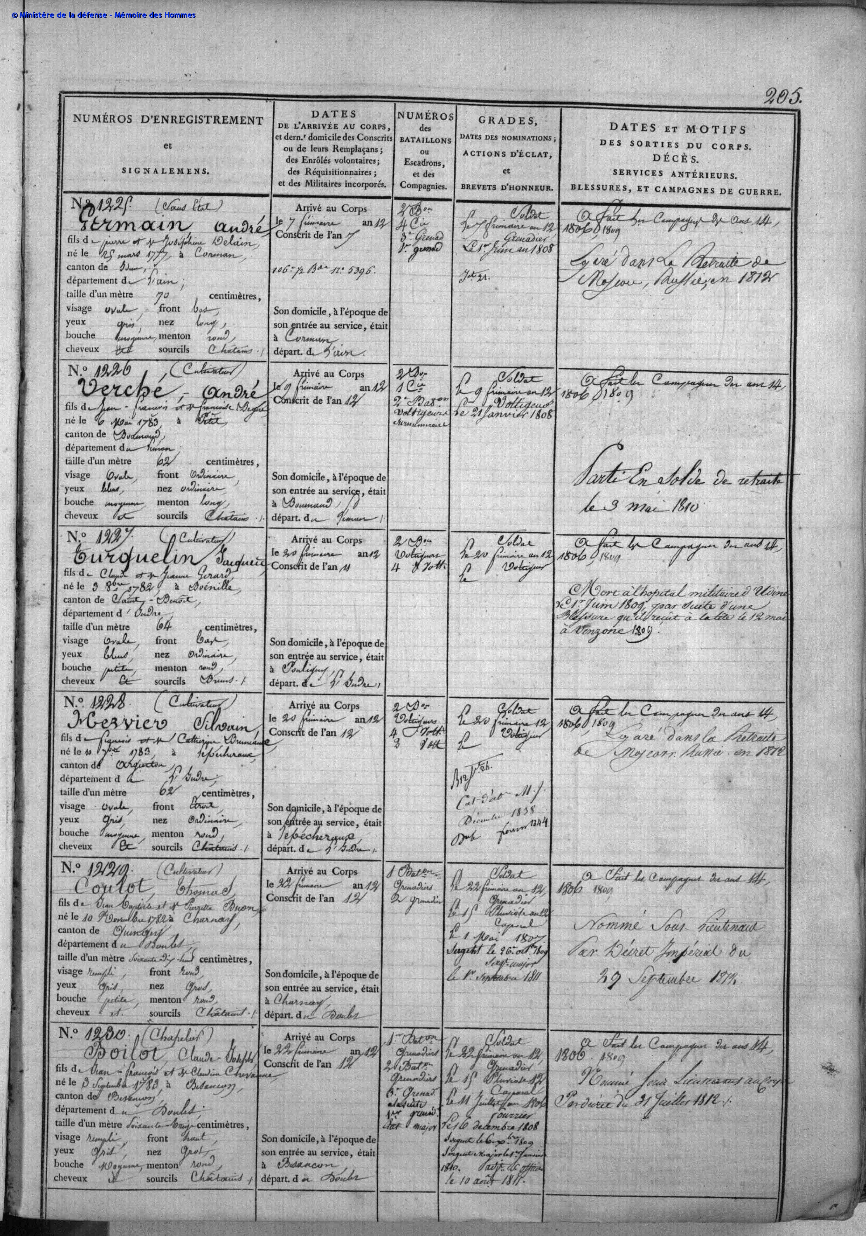 Soldat: 22. Frimaire 12 (14.12.1803) Grenadier: 19.Pluviôse 12 (09.02.1804) Caporal: 01.05.1807 Sergent: 26.10.1809 Sergent-major: 01.09.1811 Sous-Lieutenant: 29.09.1812 Weiter zu Familienmitglieder welche bei Wagram teilnahmen oder gefallen sind. |
