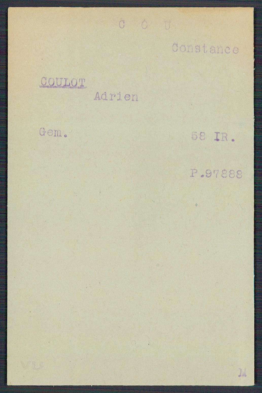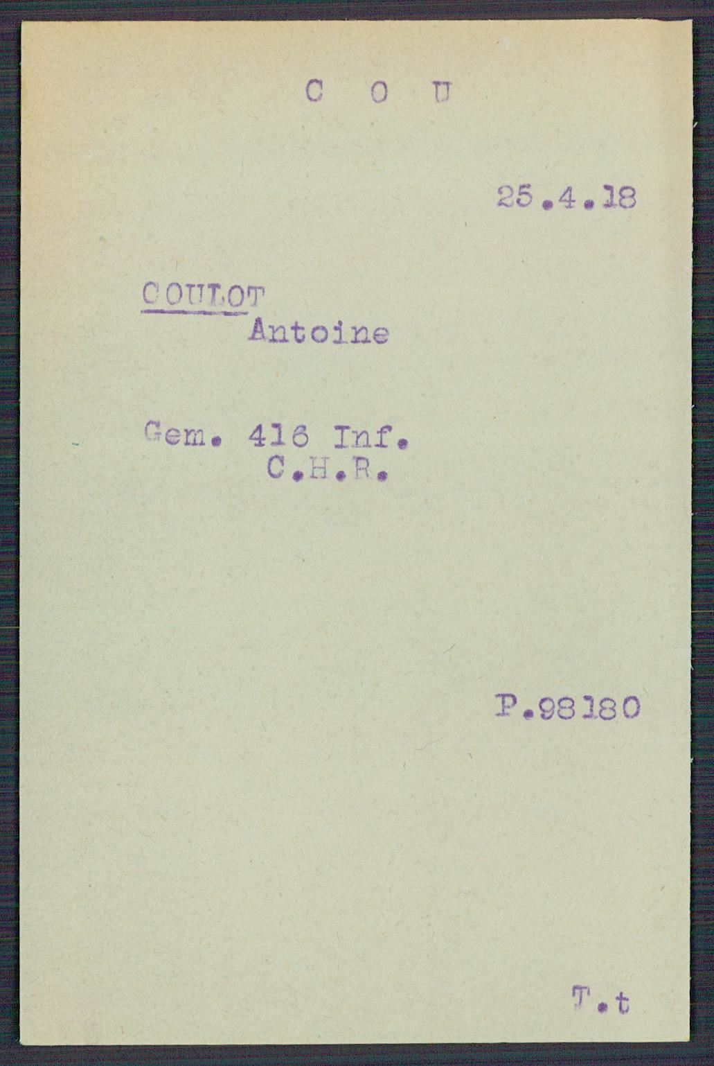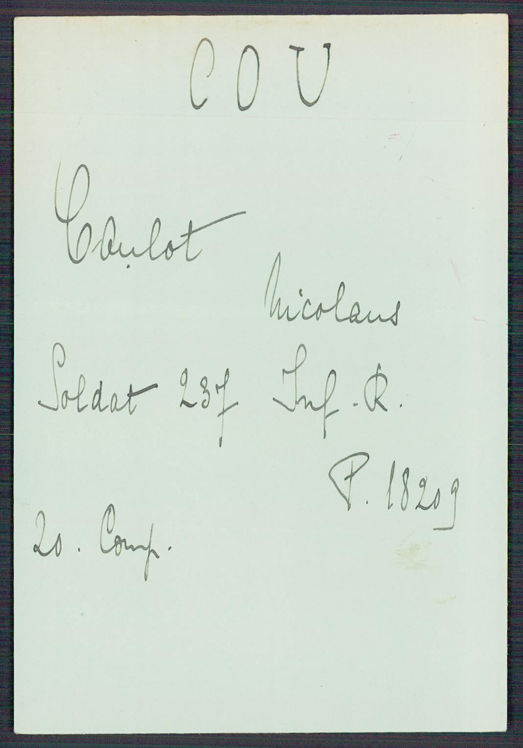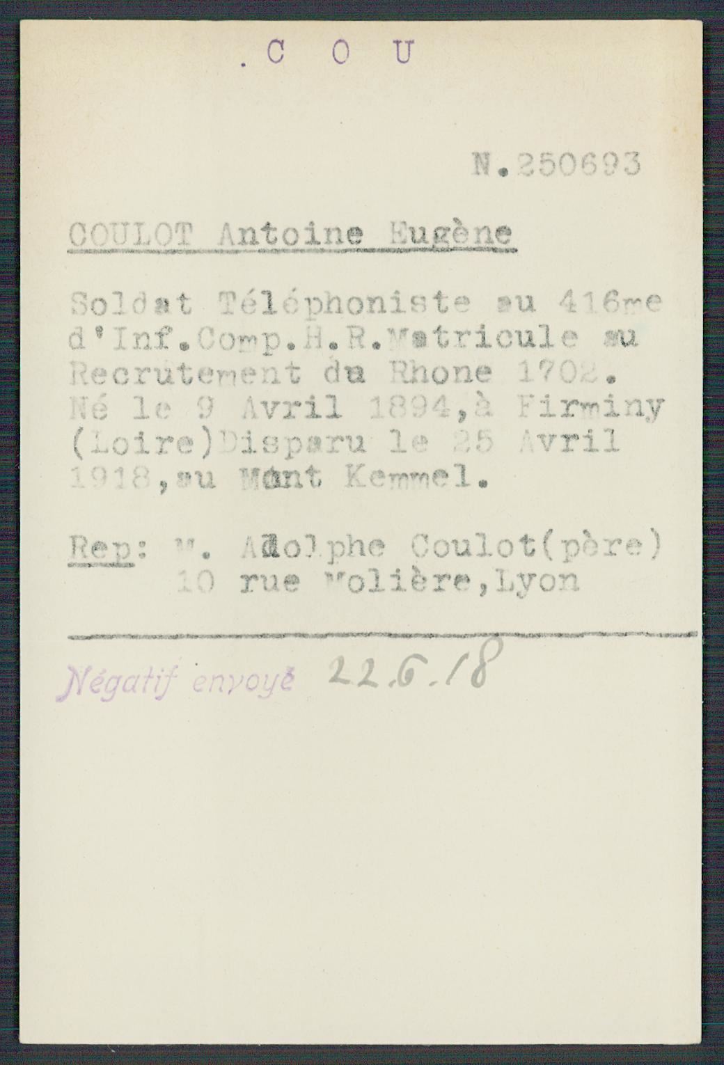 Soldat Antoine Eugène Coulot geb. 09.04.1894 in Firminy 416e Régiment d'Infanterie C.H.R. (Compagnie Hors Rang) Gefangennahme 25.04.1918 beim Gefecht am Mont Kemmel (Flandern) |