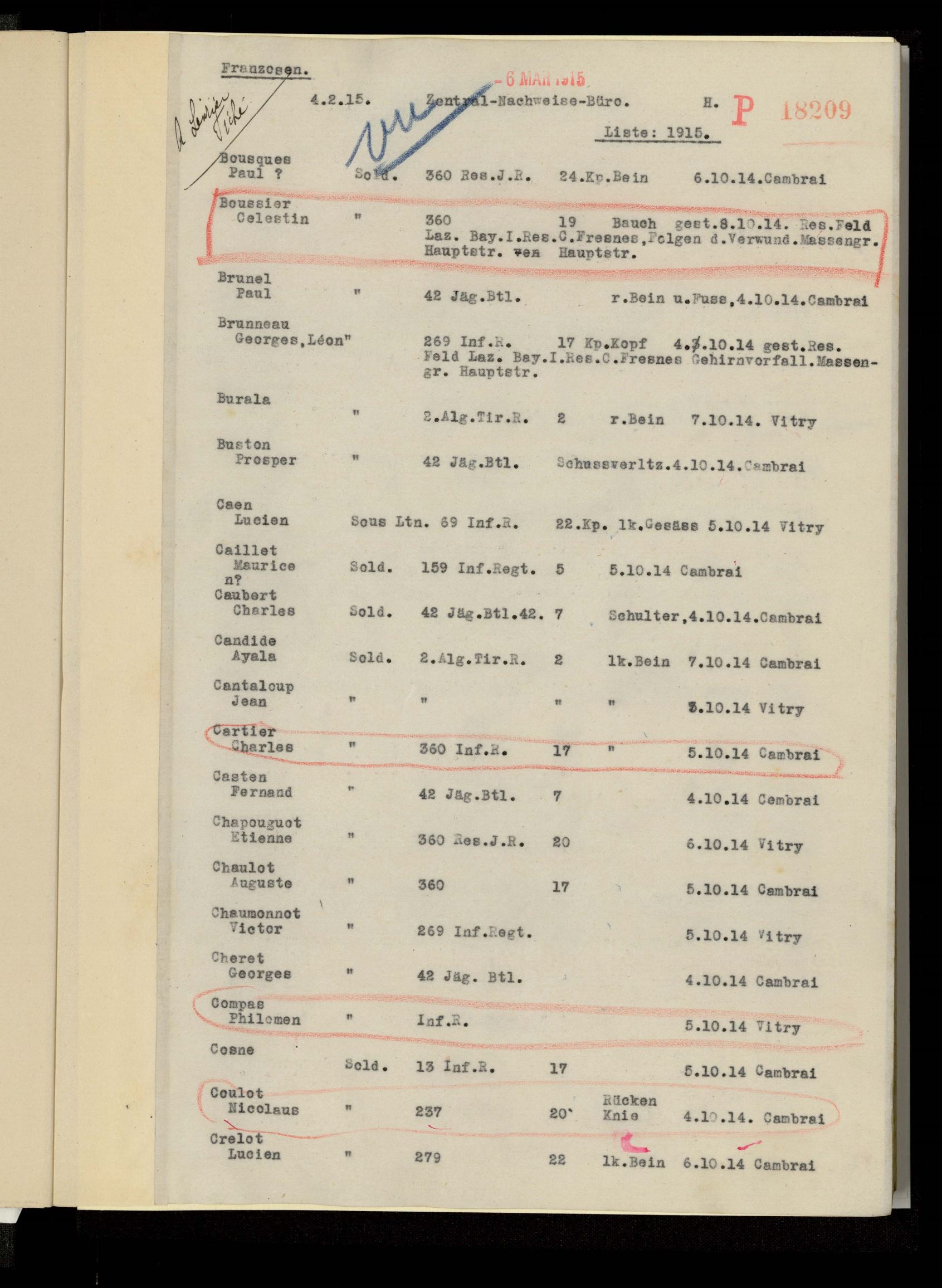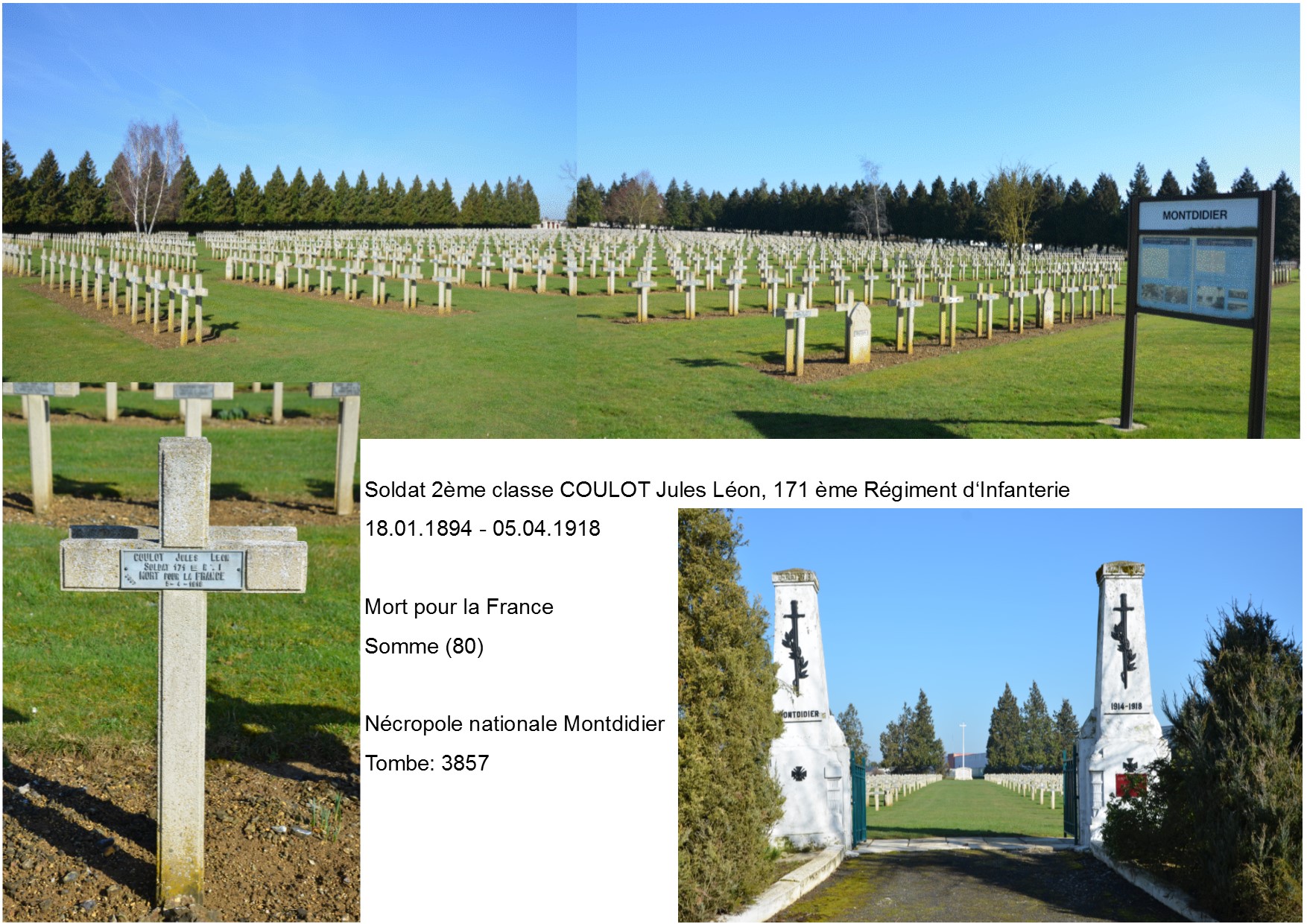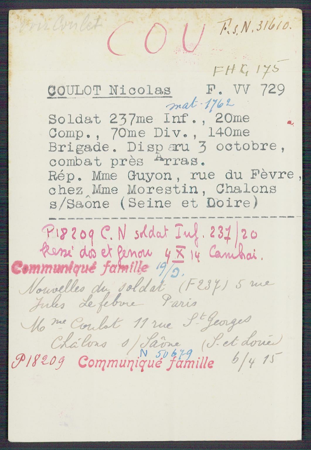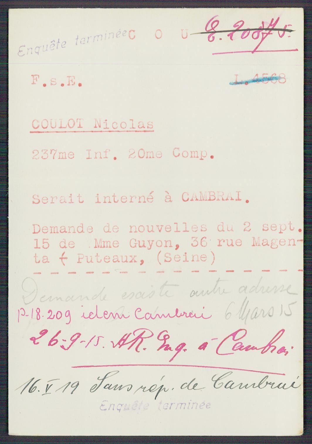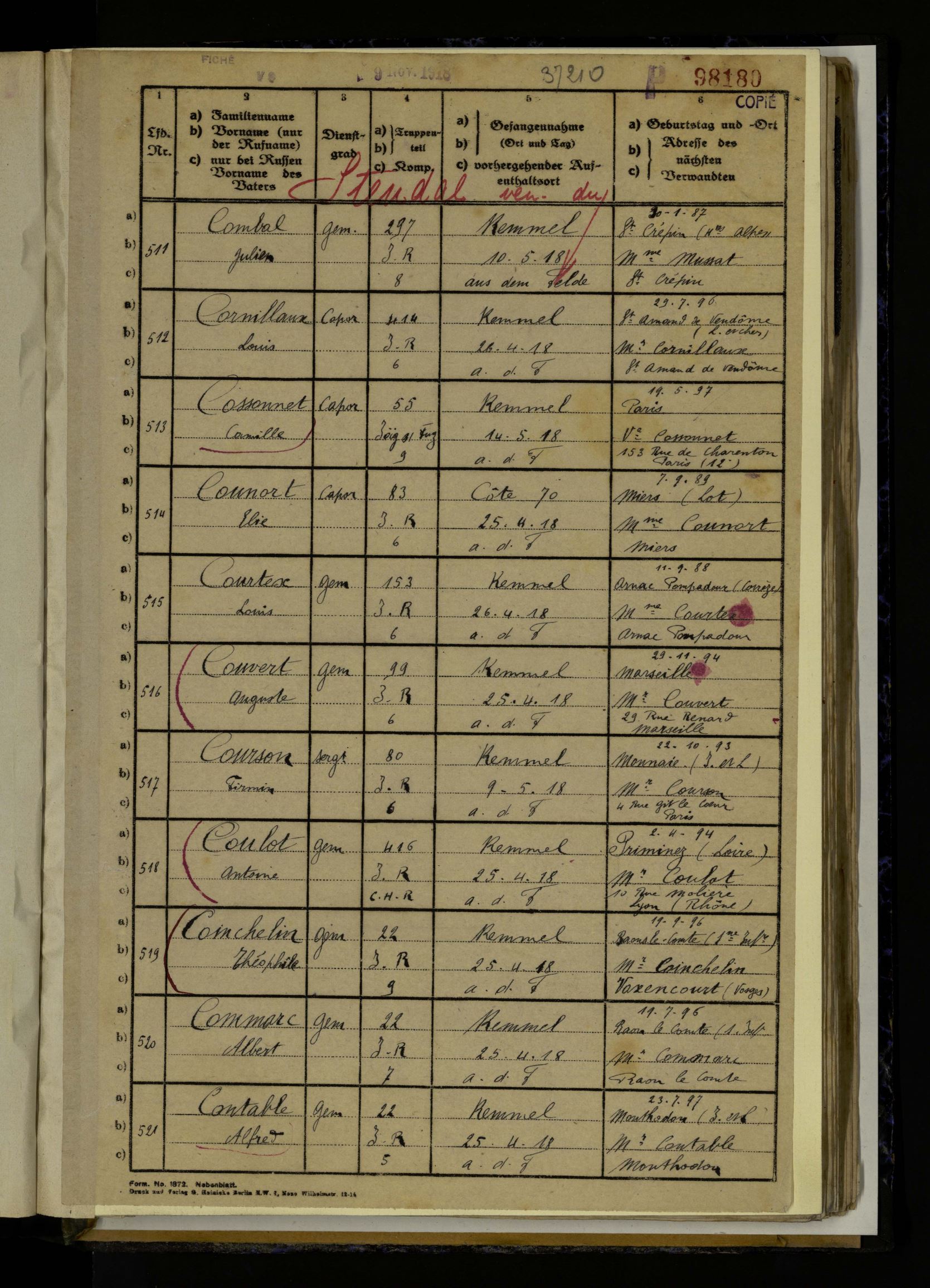 Soldat Antoine Eugène Coulot geb. 09.04.1894 in Firminy 416e Régiment d'Infanterie C.H.R. (Compagnie Hors Rang) Gefangennahme 25.04.1918 beim Gefecht am Mont Kemmel (Flandern) |