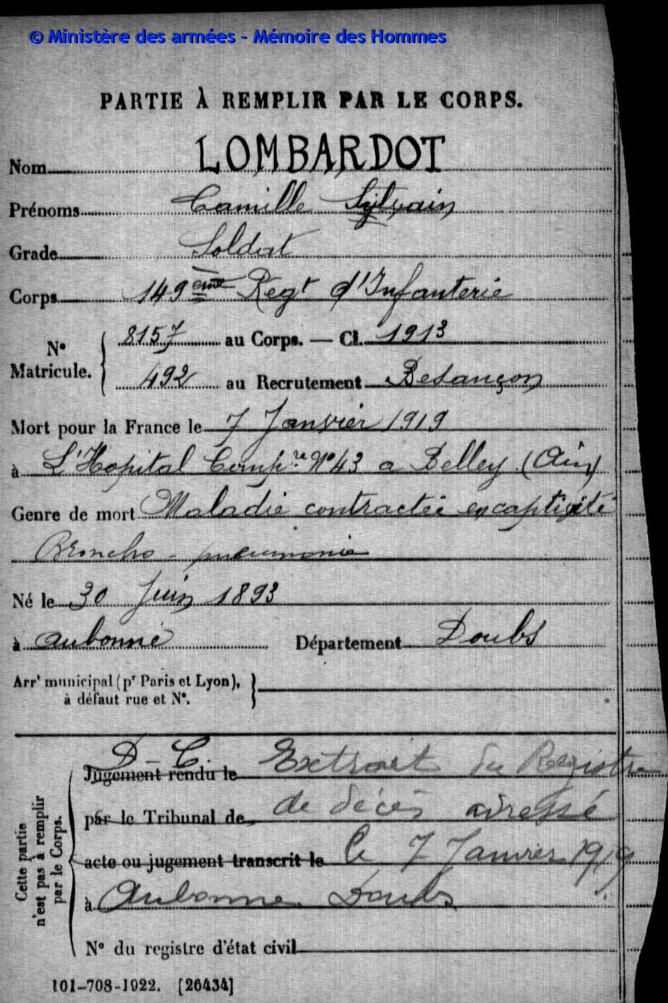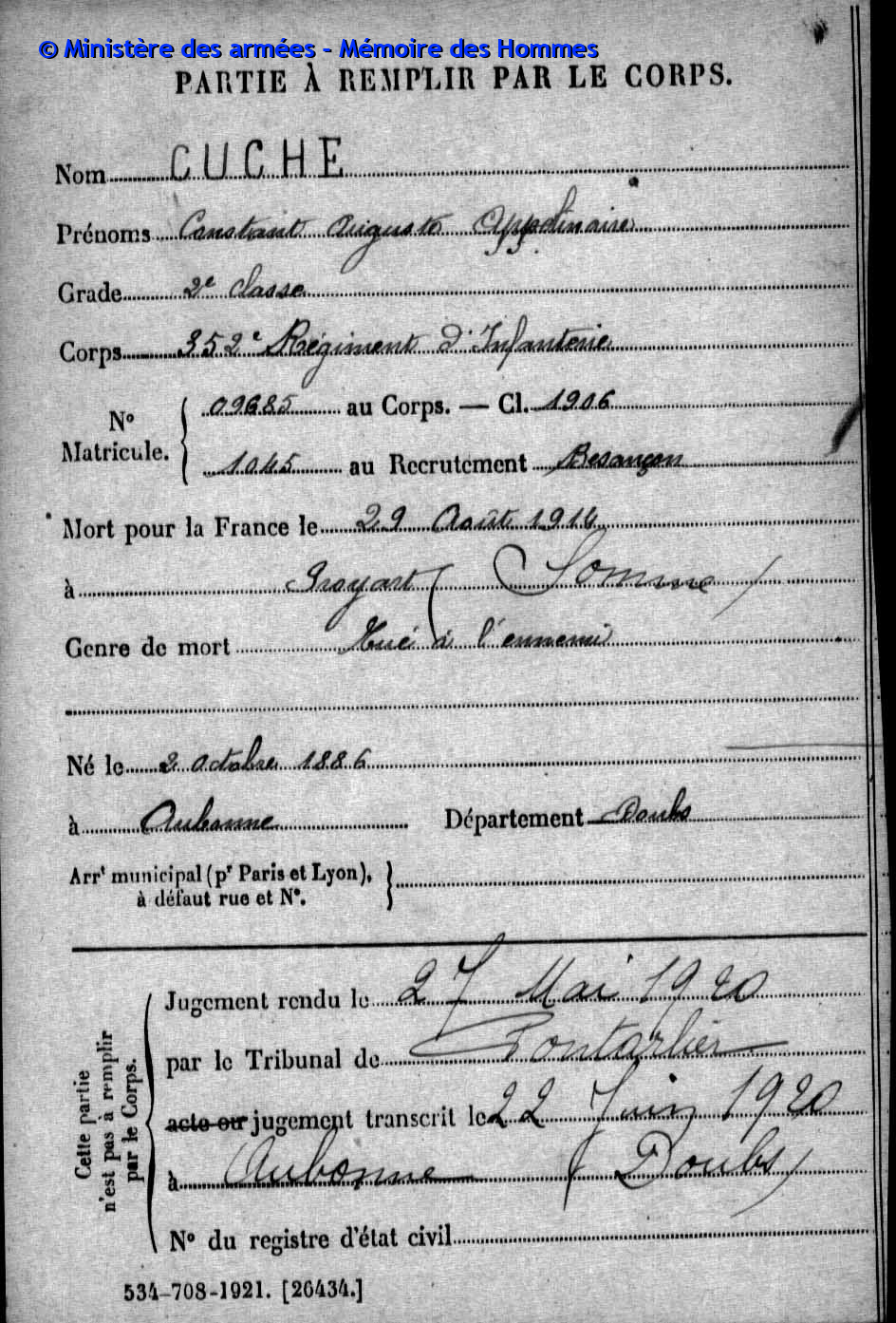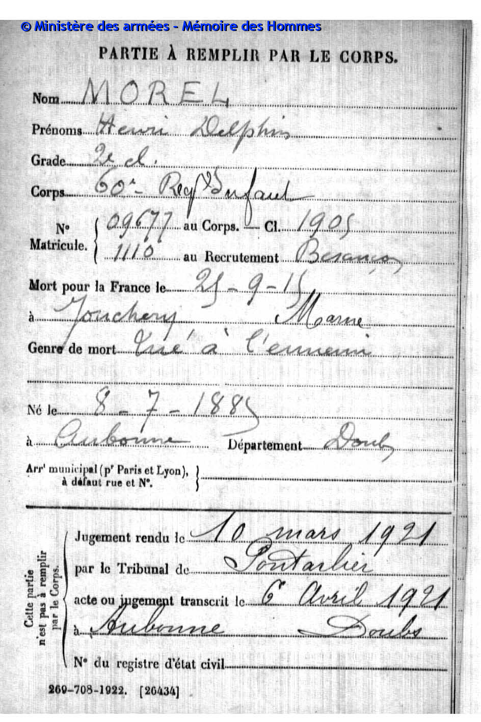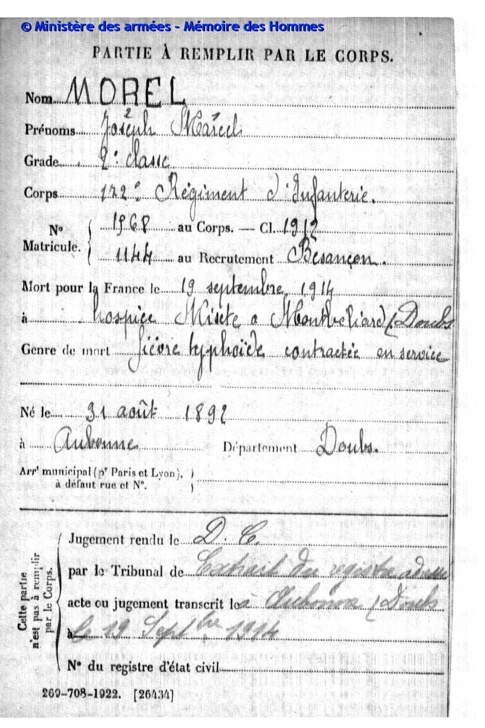 2ème classe MOREL Joseph Marcel 31.08.1892 - 19.09.1914 172ème Régiment d'Infanterie Verstarb durch Krankheit im Hôpital mixte in Montbéliard (F) |