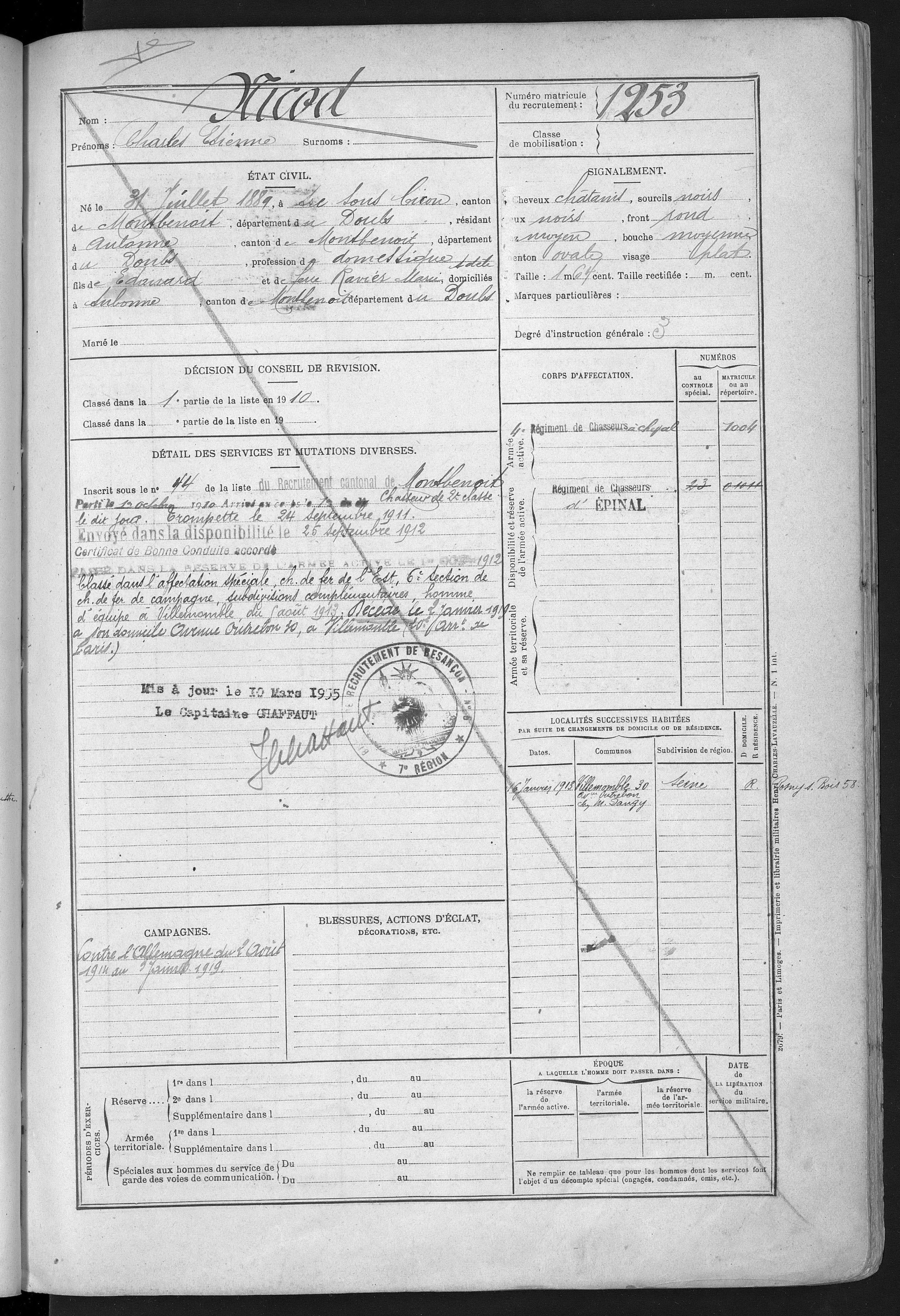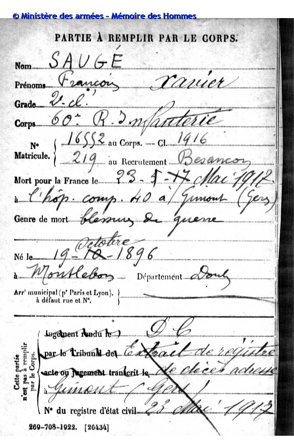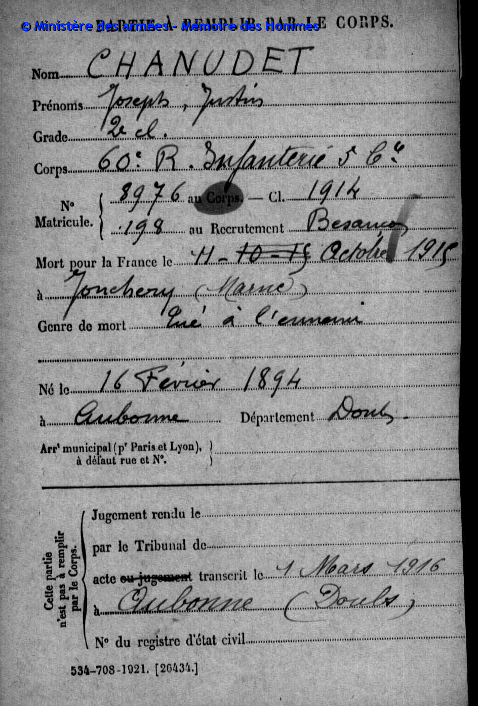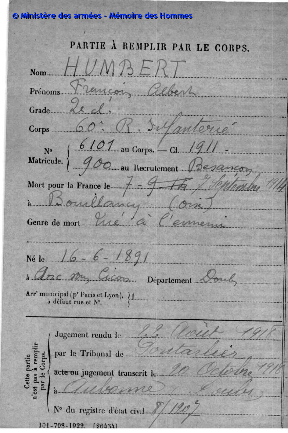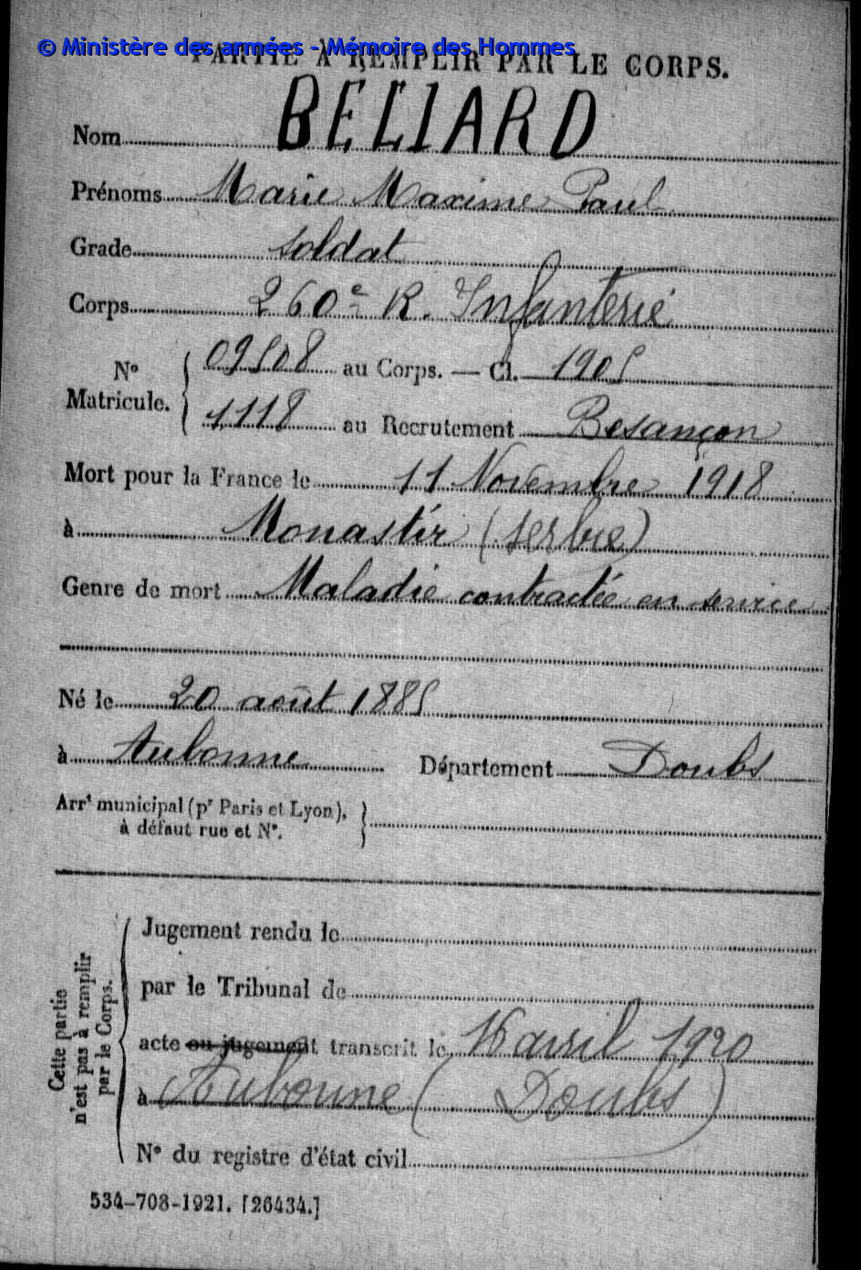 2ème classe MOREL Joseph Marcel 31.08.1892 - 19.09.1914 172ème Régiment d'Infanterie Verstarb durch Krankheit im Hôpital mixte in Montbéliard (F) |