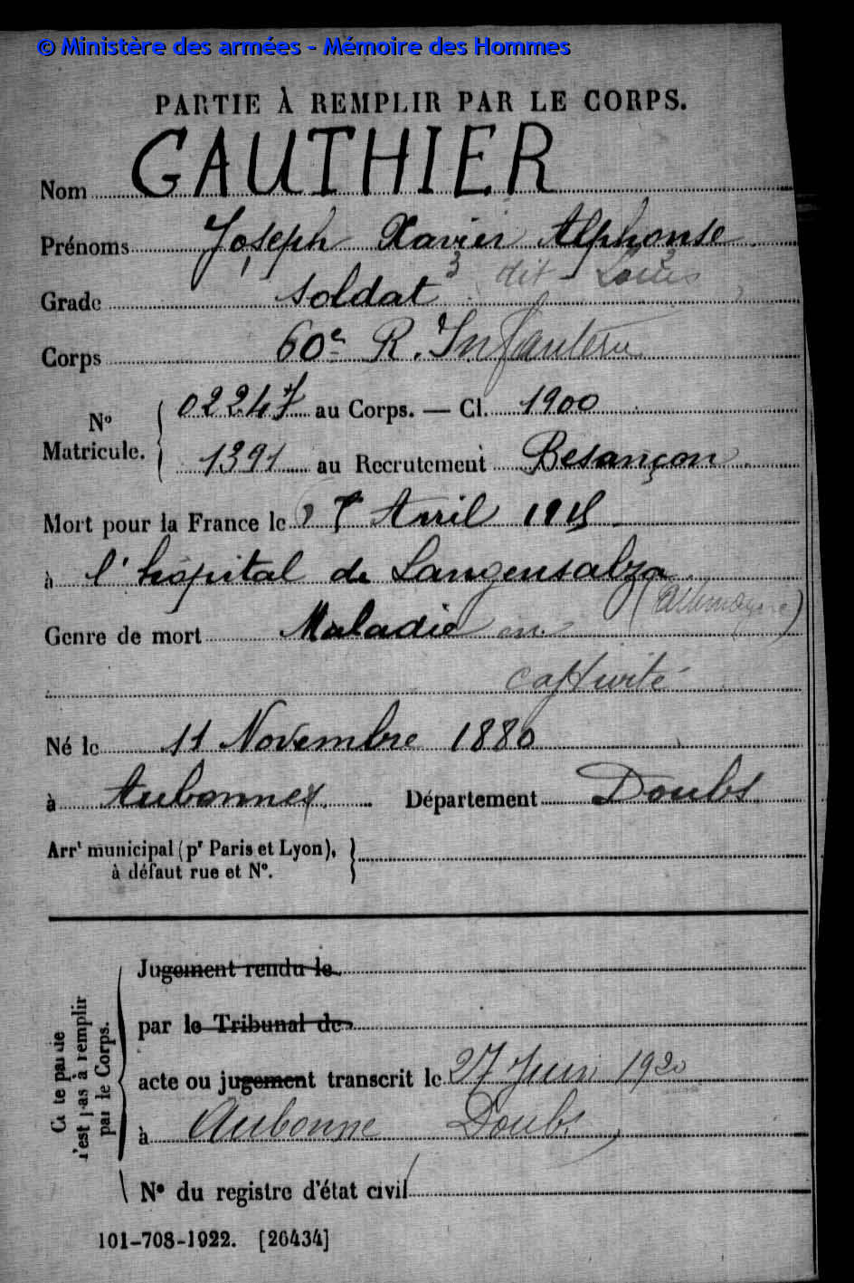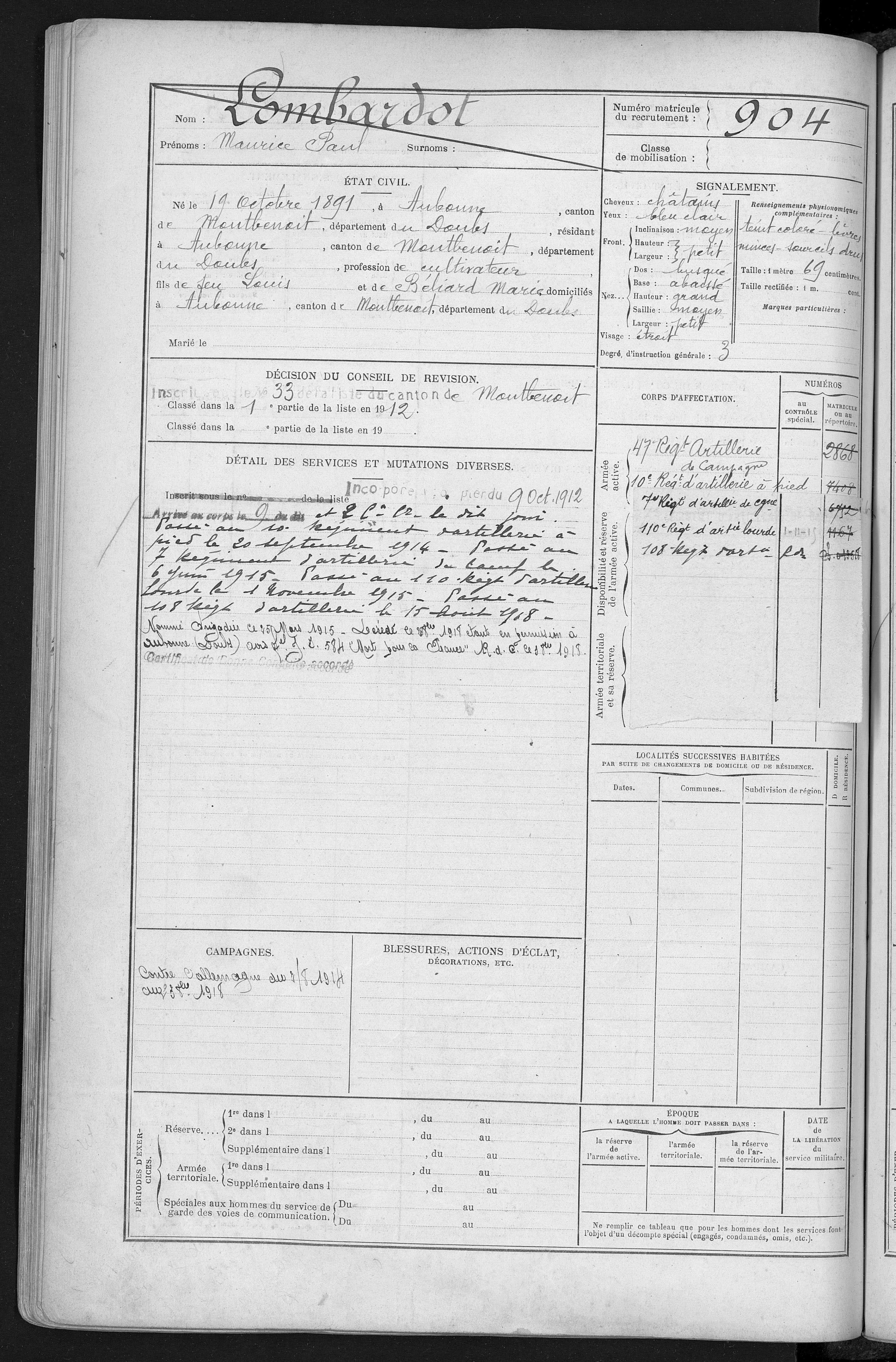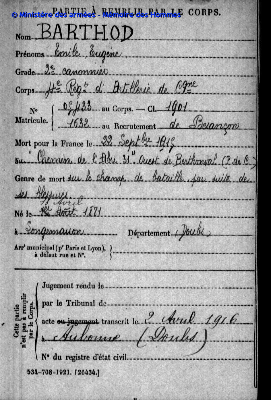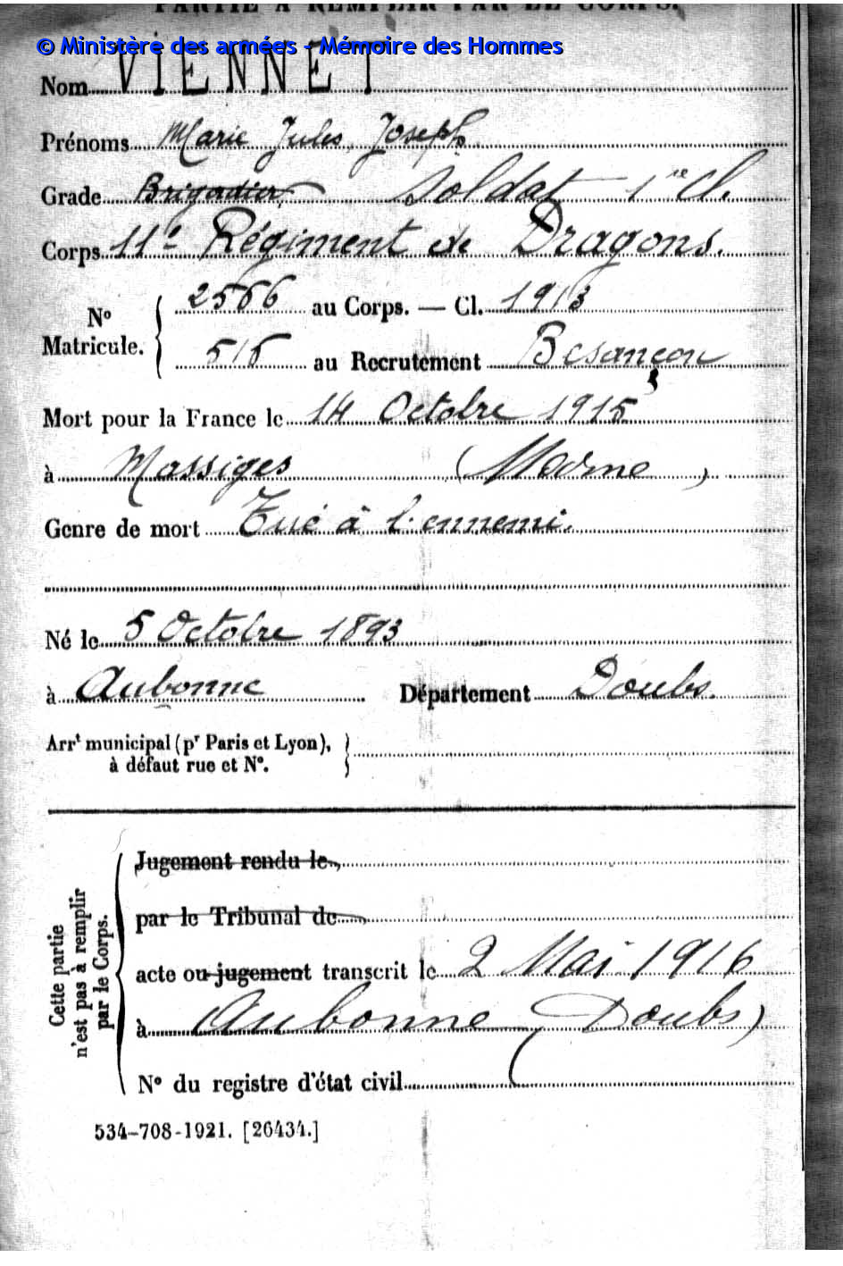 2ème classe MOREL Joseph Marcel 31.08.1892 - 19.09.1914 172ème Régiment d'Infanterie Verstarb durch Krankheit im Hôpital mixte in Montbéliard (F) |
