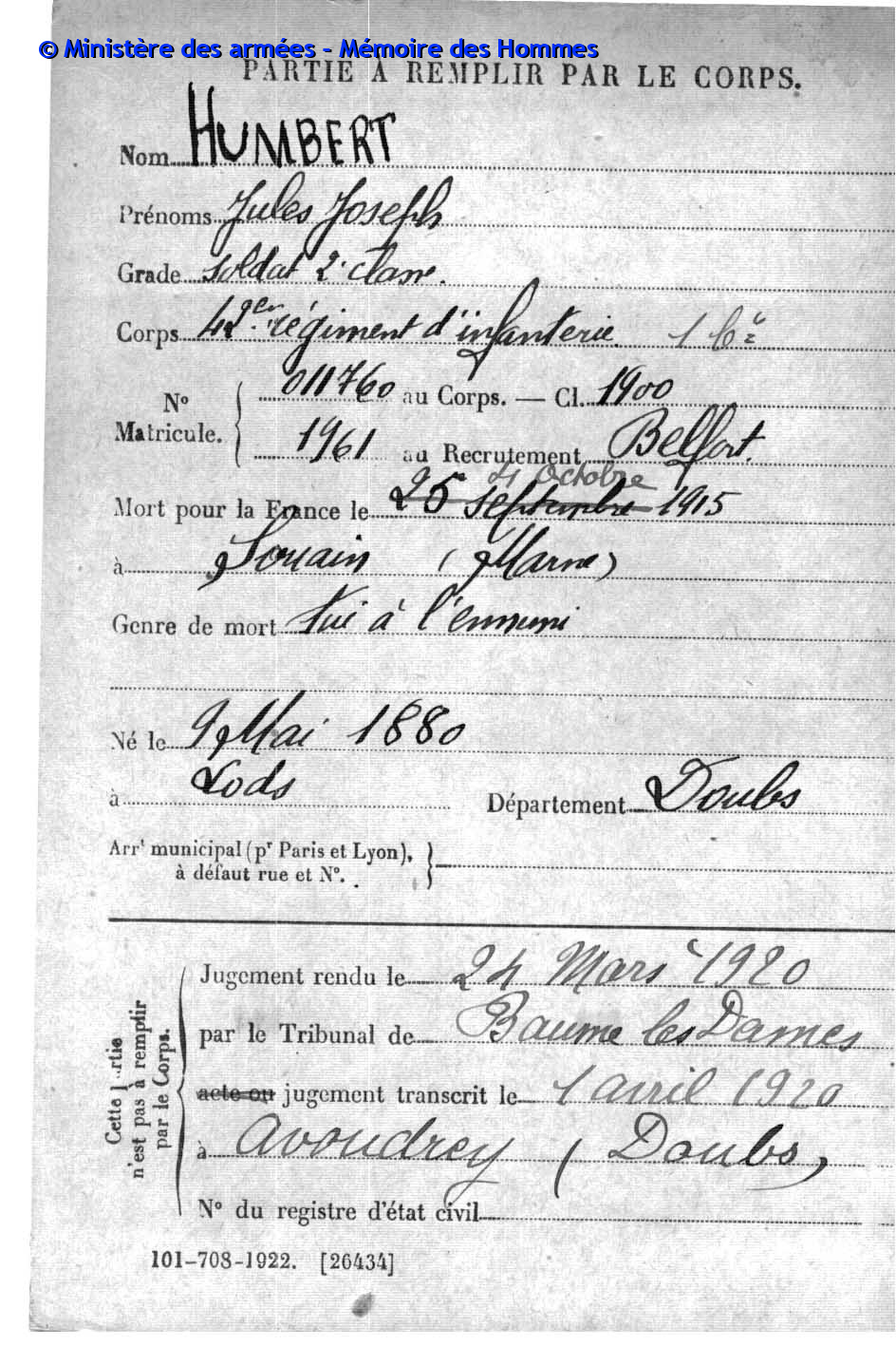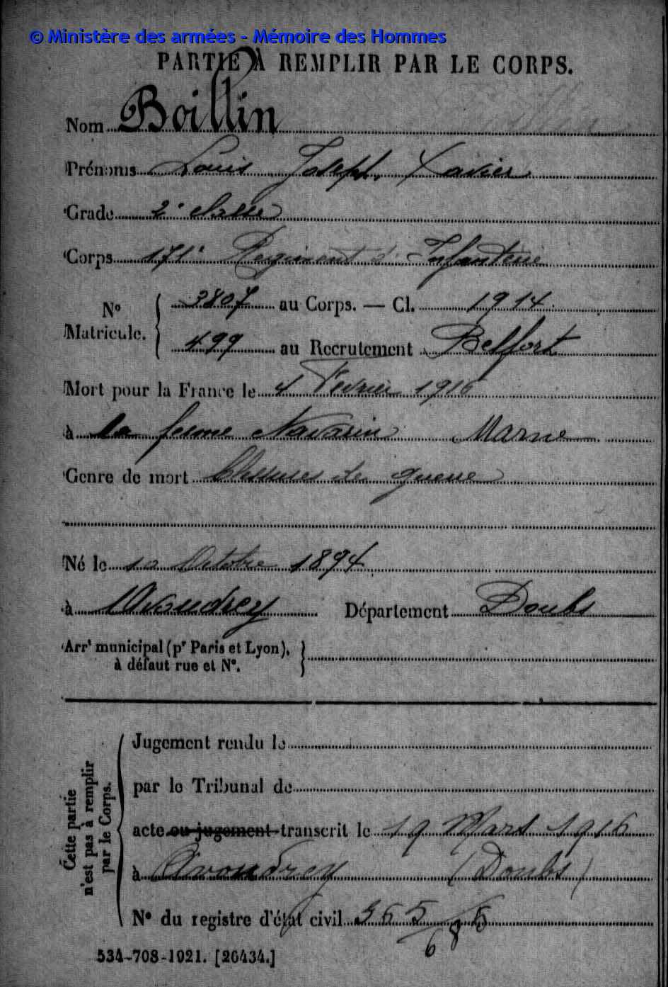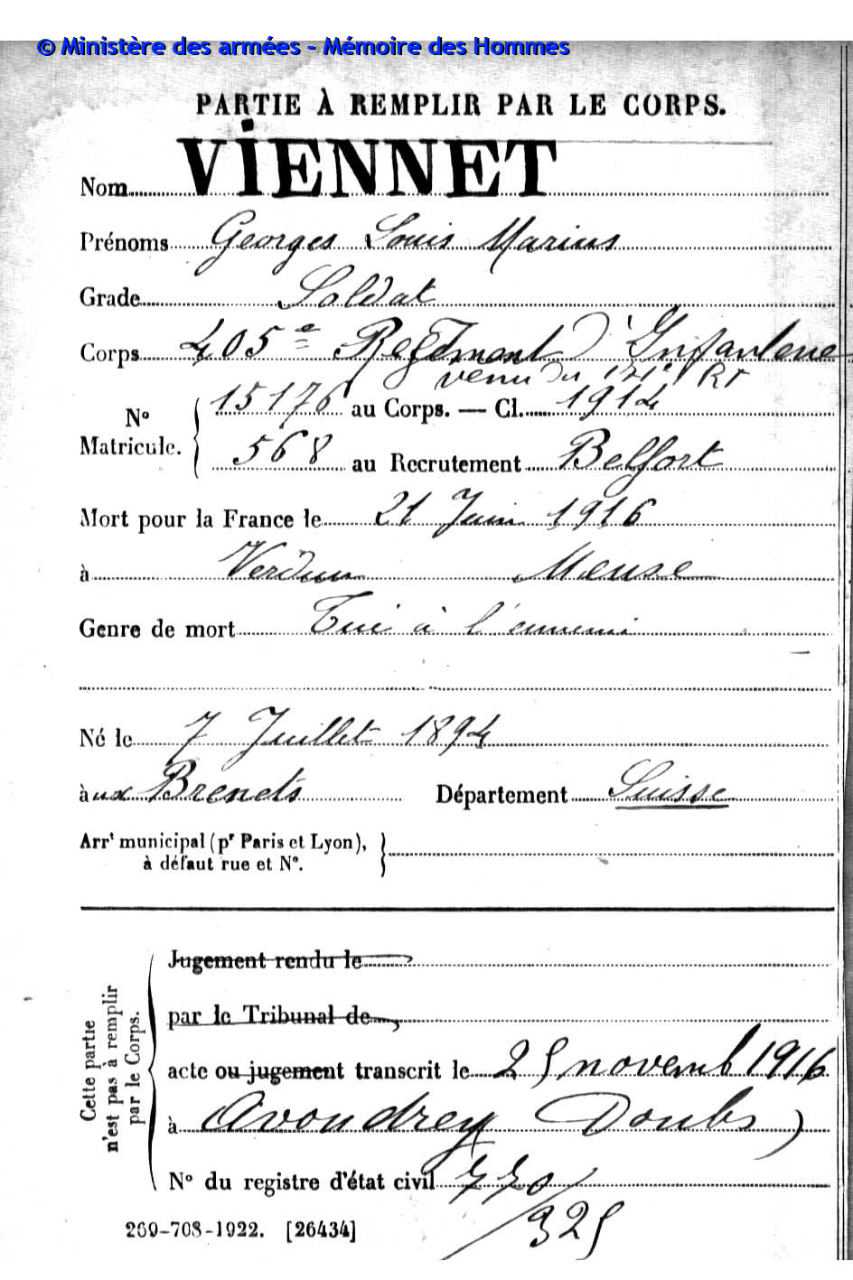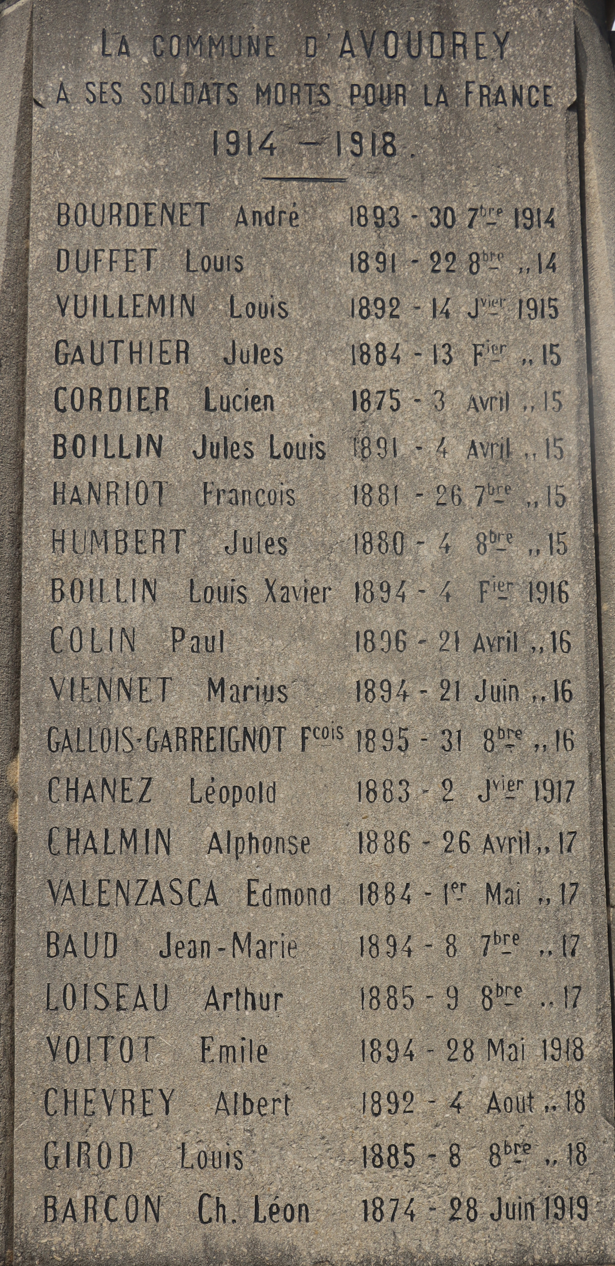 13Km2 grosse Gemeinde im Departement Doubs (F) mit 915 Einwohner. Auf dem Kriegerdenkmal befindet sich 25 Namen von gefallenen Soldaten, 17 davon sind mit Fabian Coulot verwandt.
