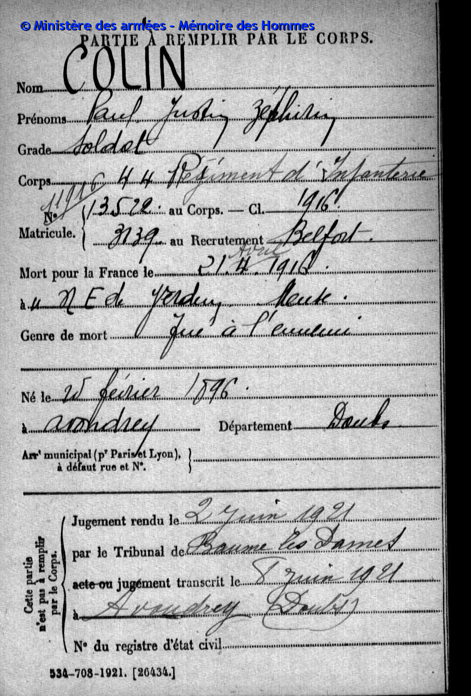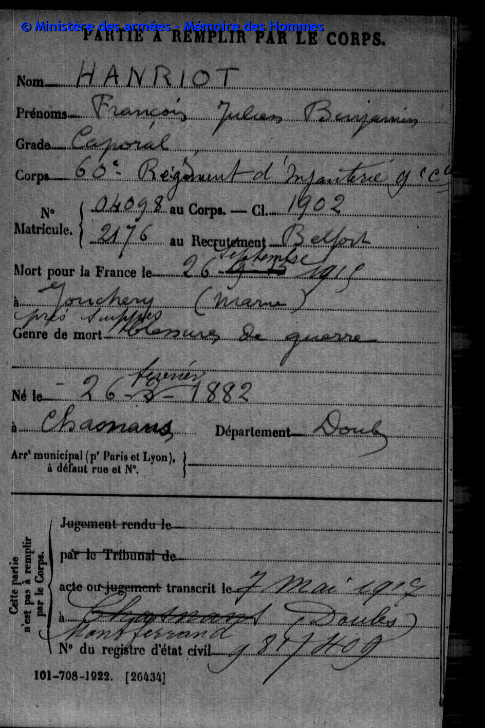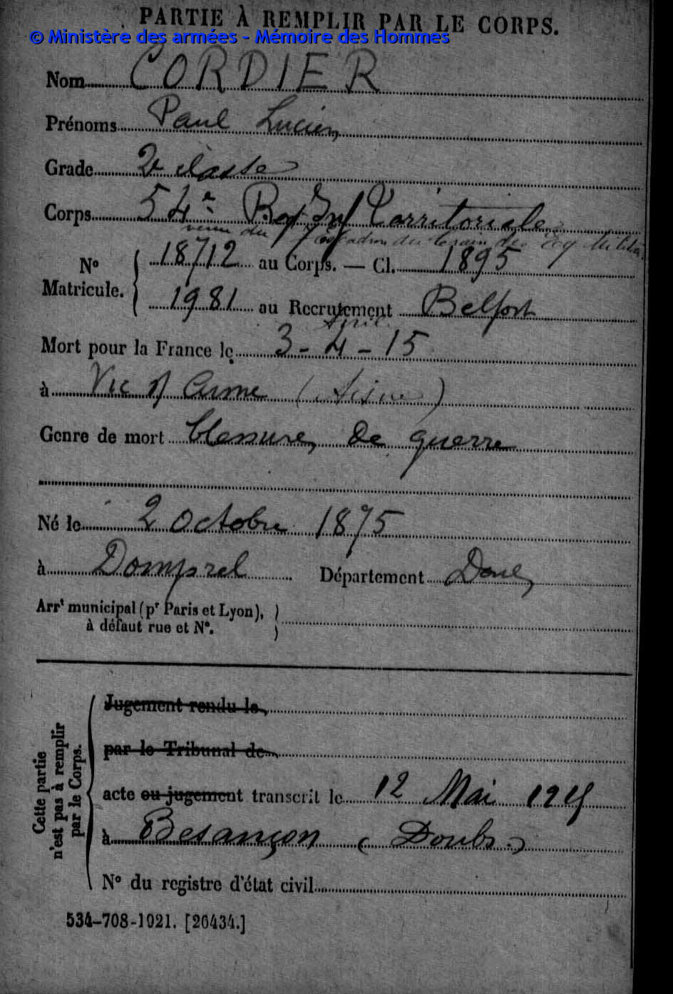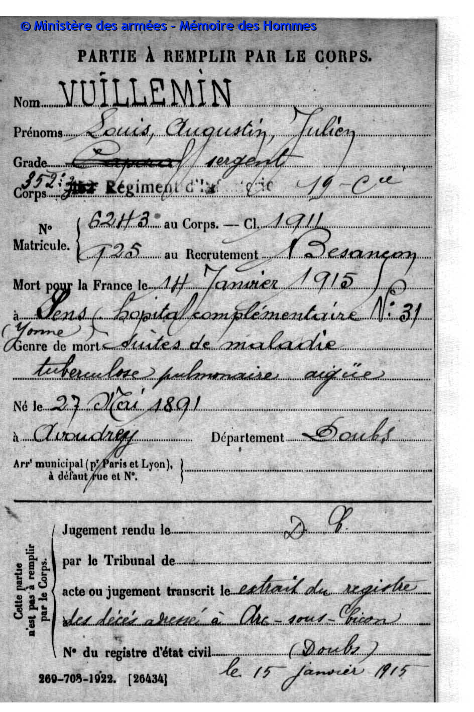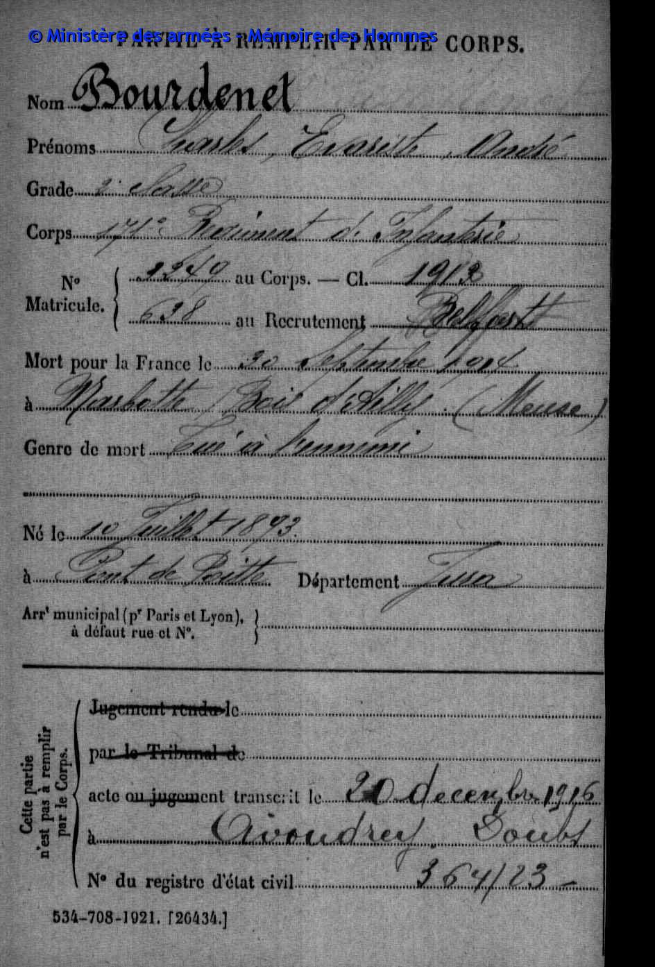 13Km2 grosse Gemeinde im Departement Doubs (F) mit 915 Einwohner. Auf dem Kriegerdenkmal befindet sich 25 Namen von gefallenen Soldaten, 17 davon sind mit Fabian Coulot verwandt.