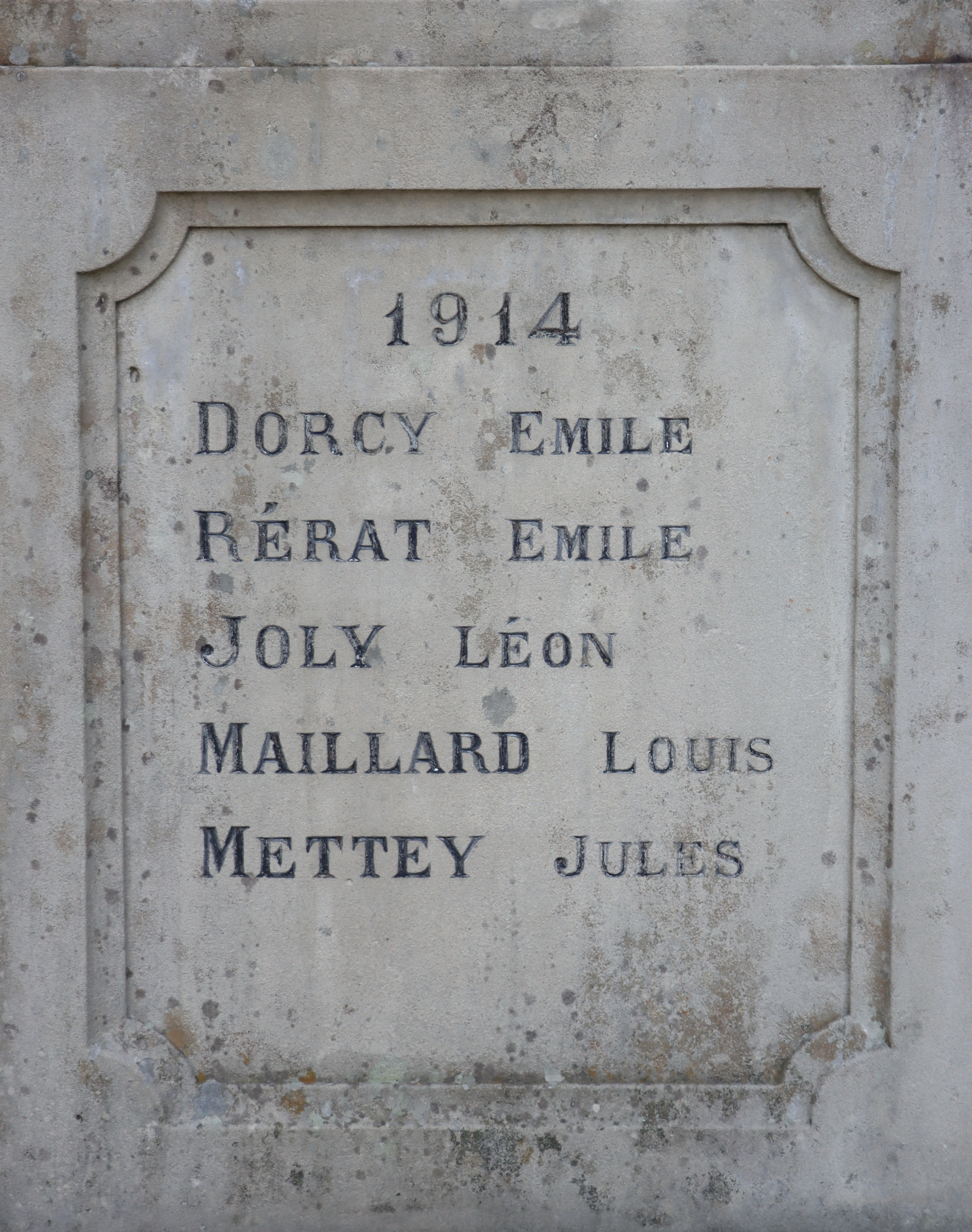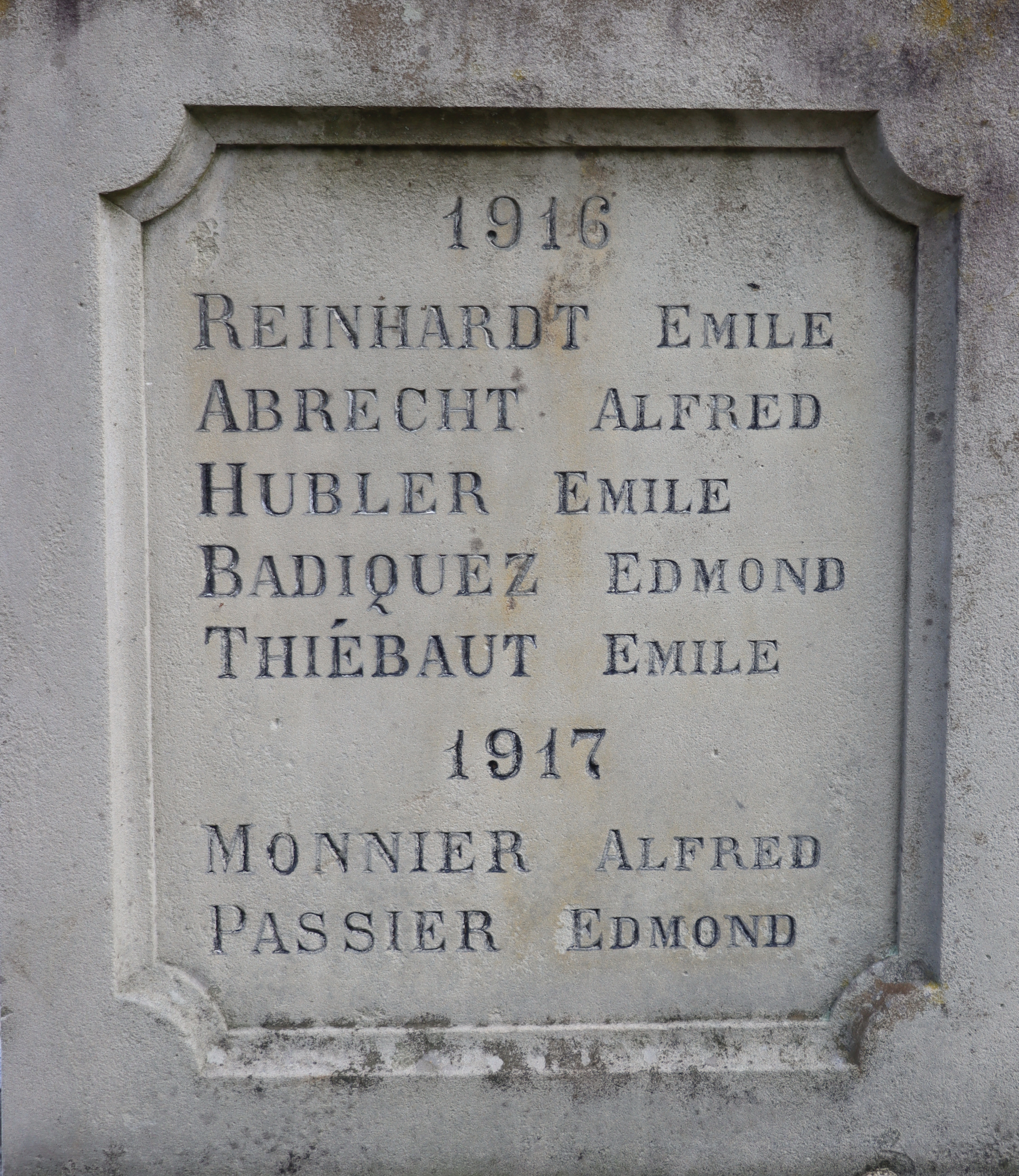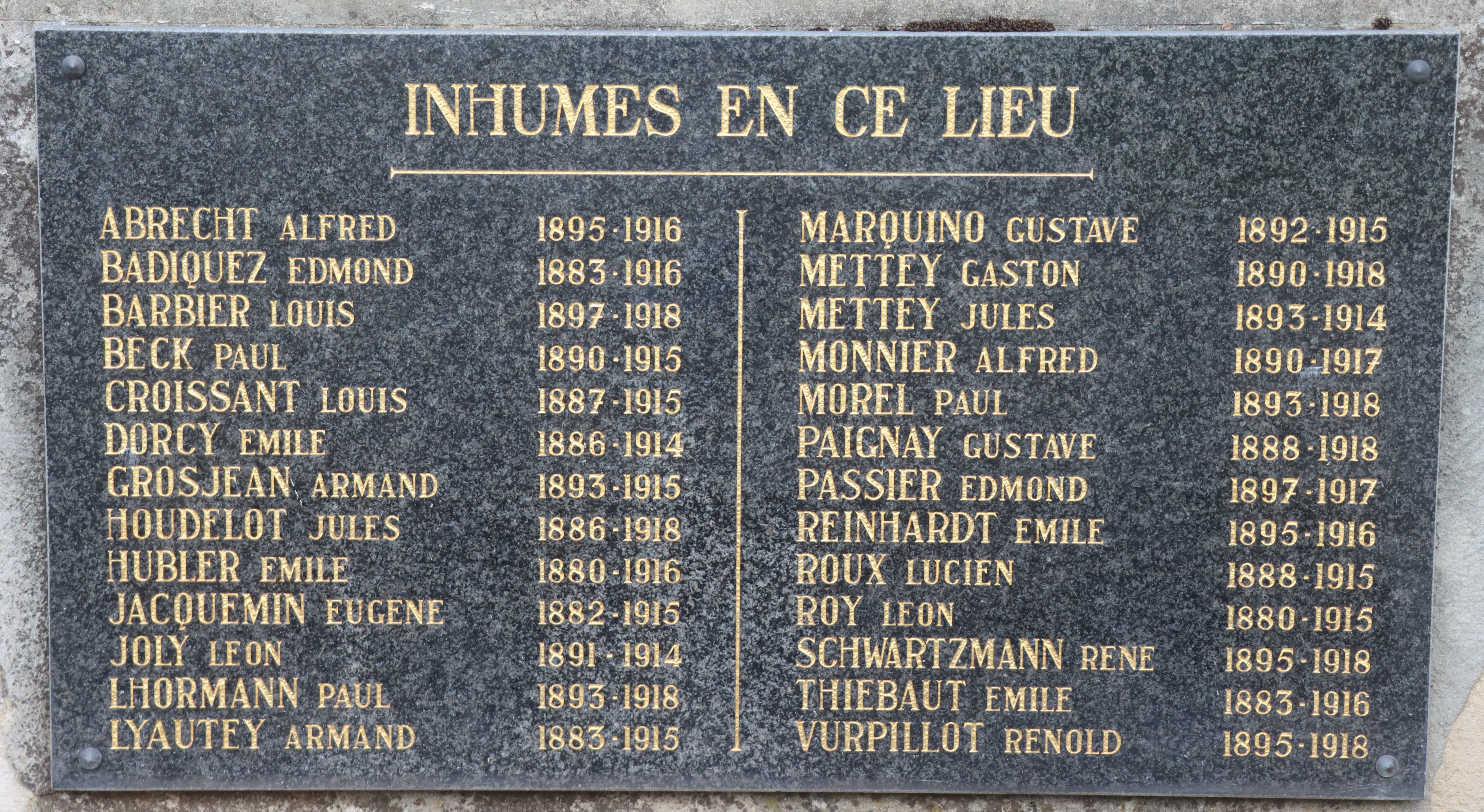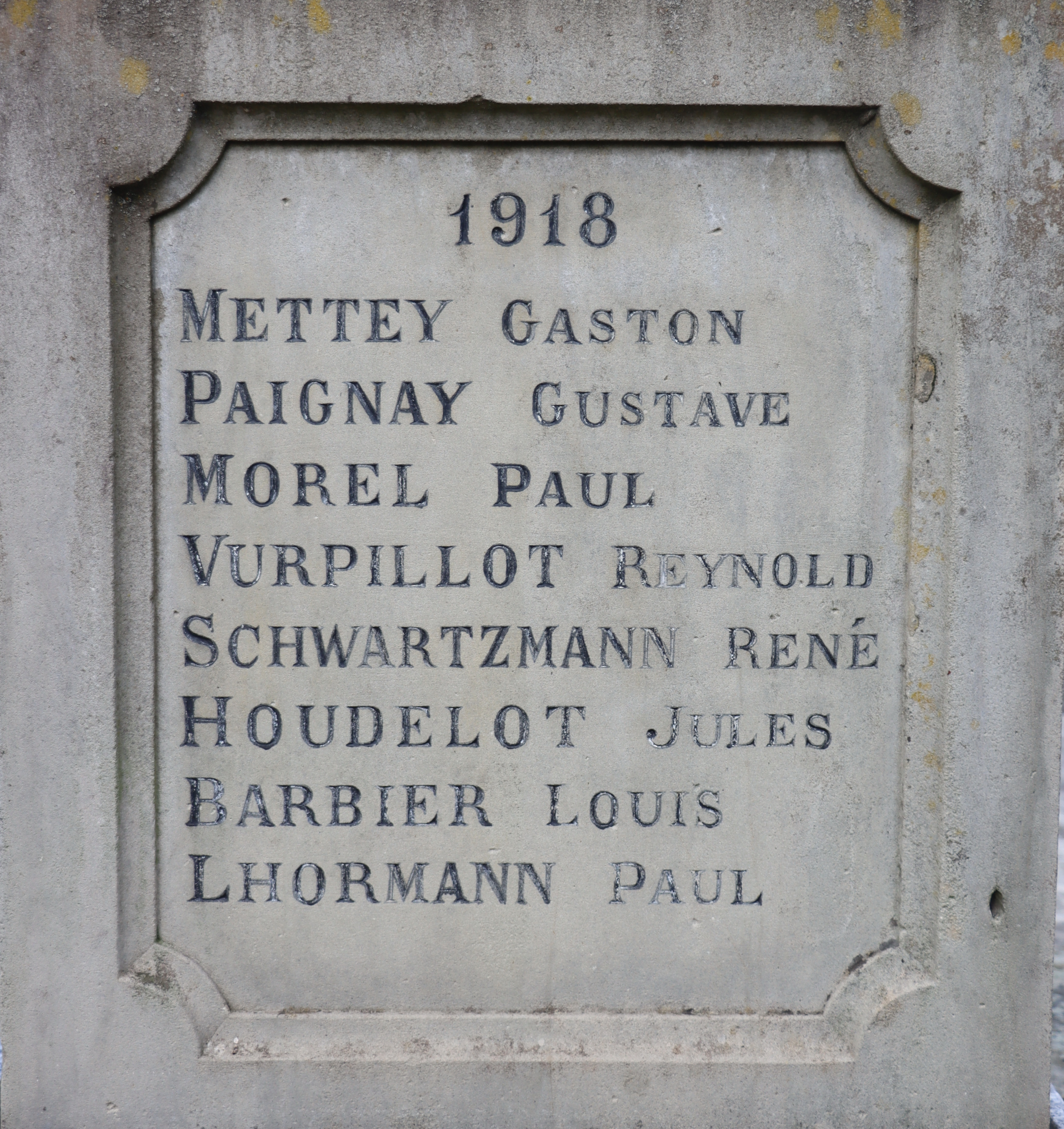 Auf dem Kriegerdenkmal der 3,73 Km2 kleinen Gemeinde mit 807 Einwohner im Departement Doubs (F), sind 28 Kriegsopfer aus dem 1. Weltkrieg verzeichnet, davon 26 im Militärehrenfeld auf dem Friedhof der Gemeinde. Davon sind 11 mit Fabian Coulot verwandt.