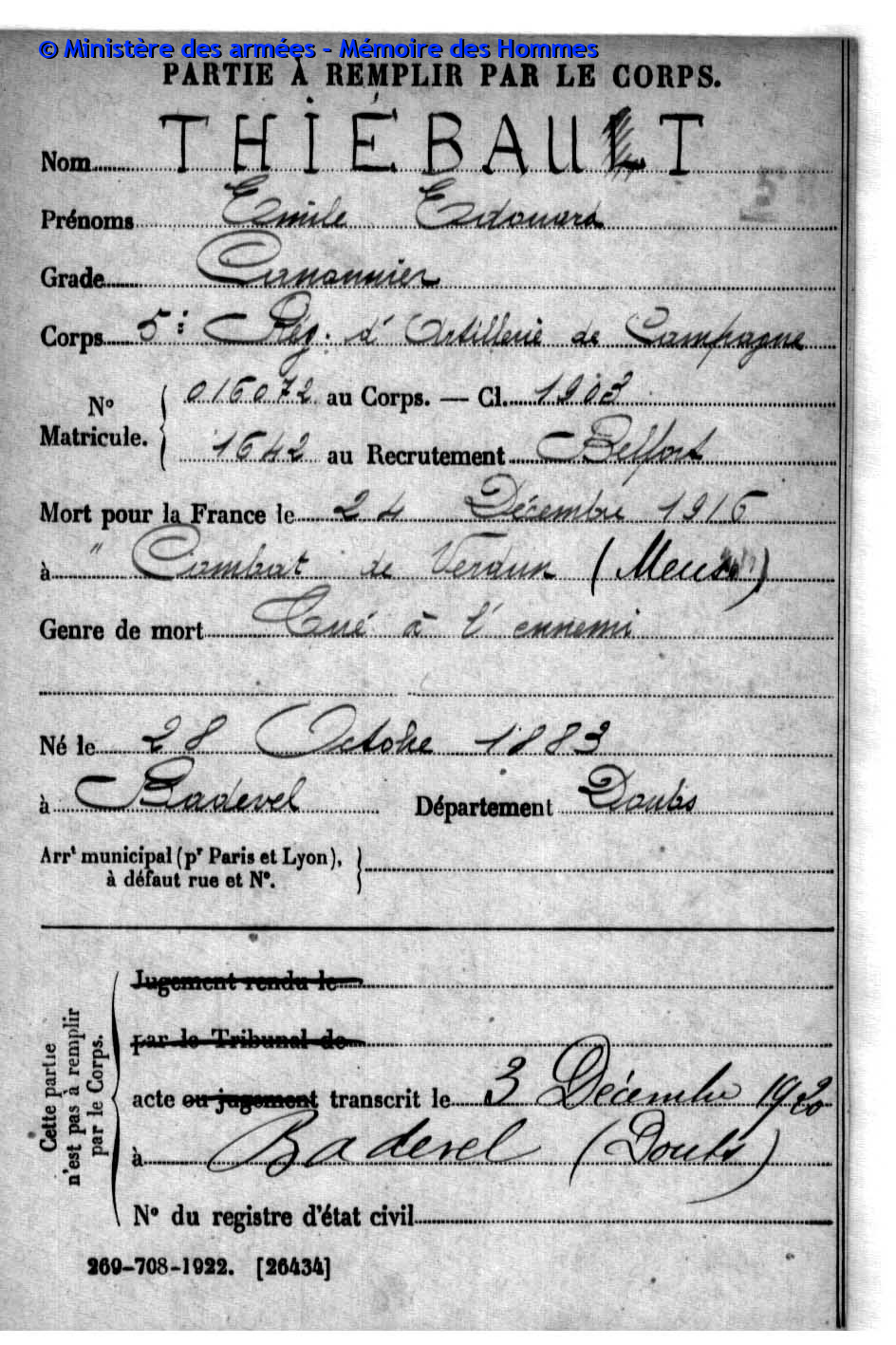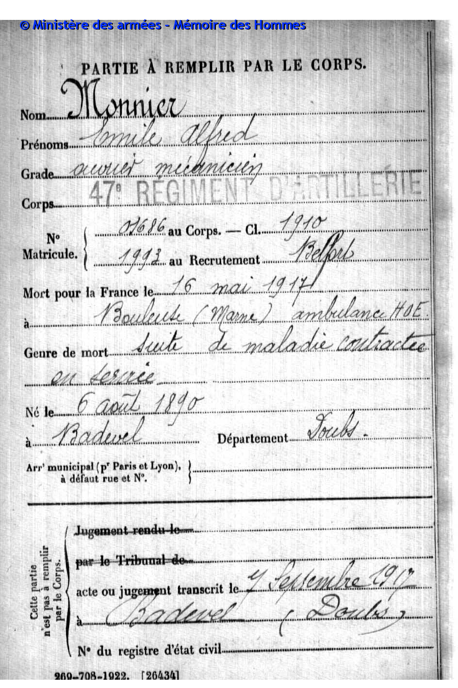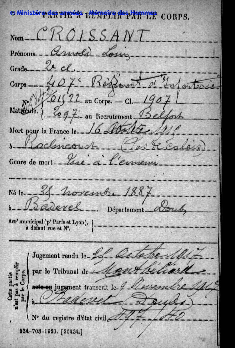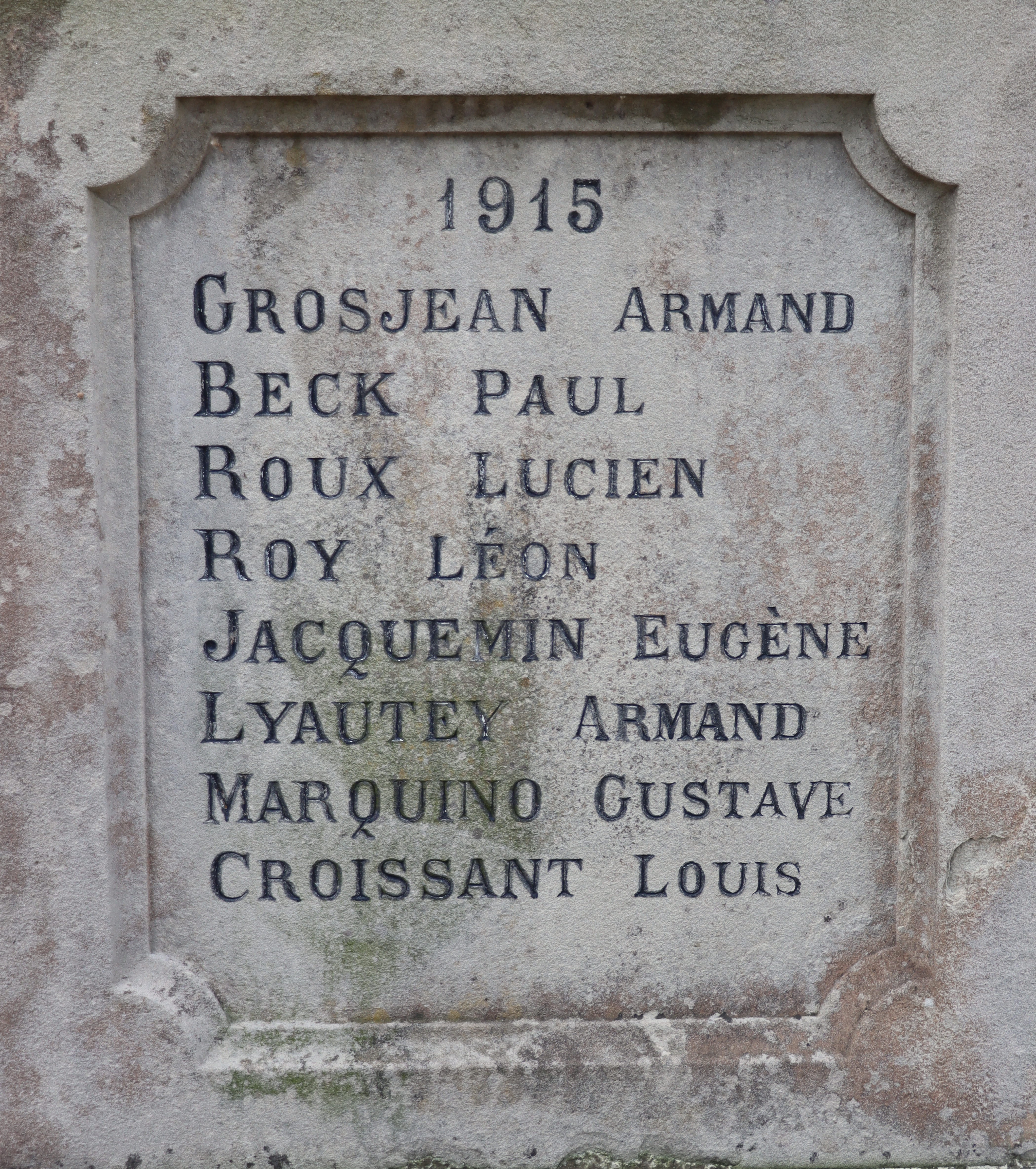 Auf dem Kriegerdenkmal der 3,73 Km2 kleinen Gemeinde mit 807 Einwohner im Departement Doubs (F), sind 28 Kriegsopfer aus dem 1. Weltkrieg verzeichnet, davon 26 im Militärehrenfeld auf dem Friedhof der Gemeinde. Davon sind 11 mit Fabian Coulot verwandt.