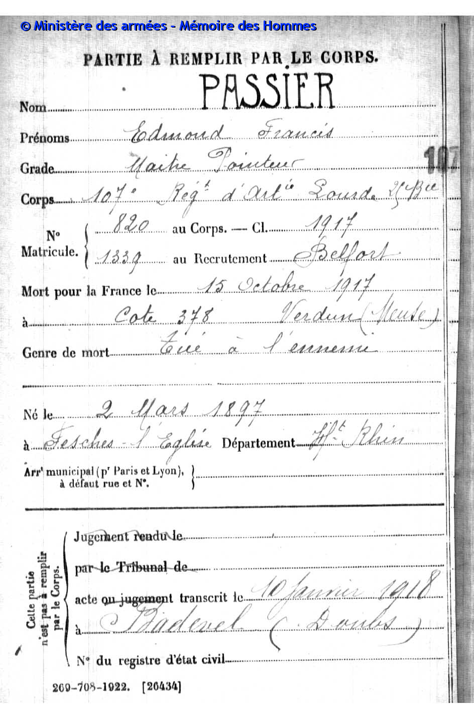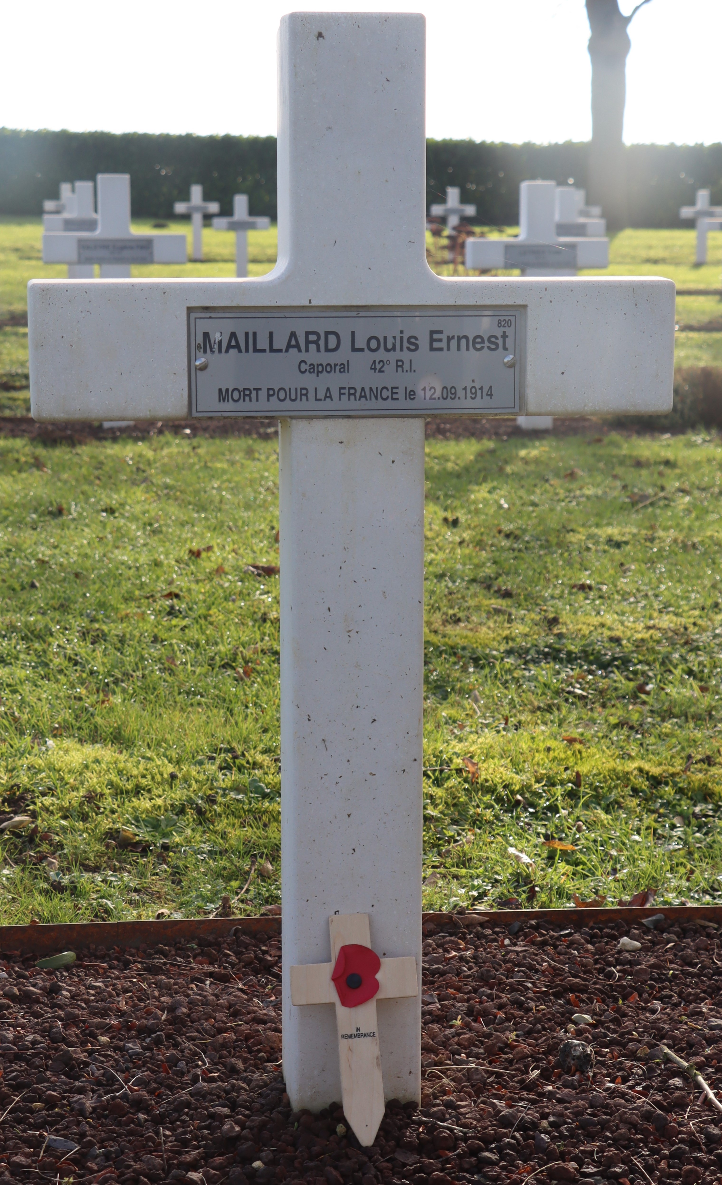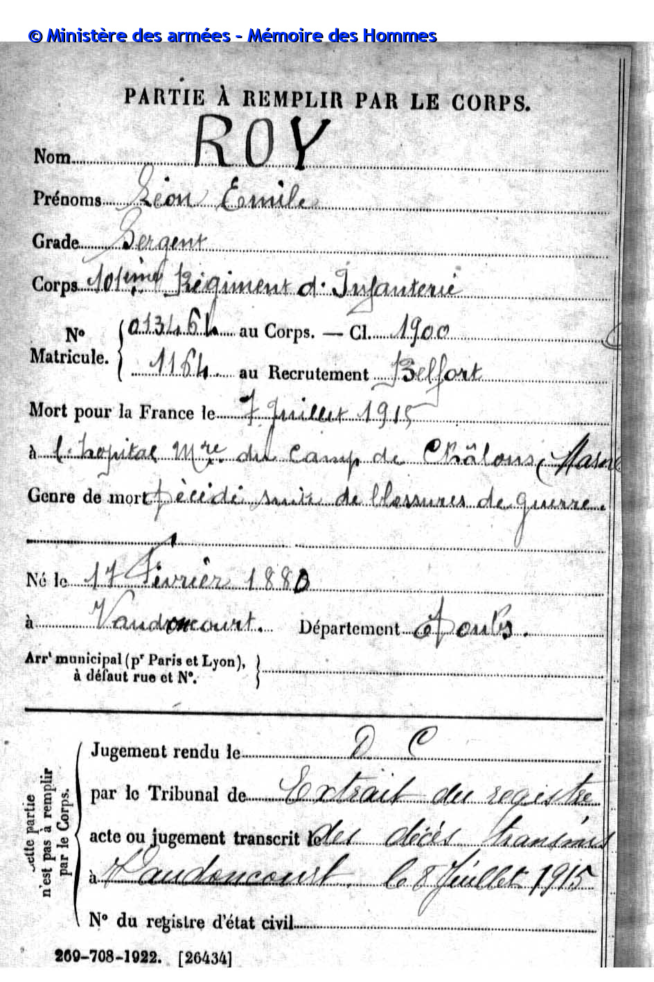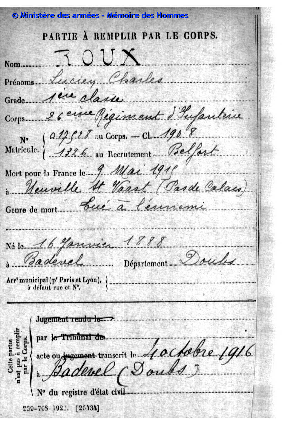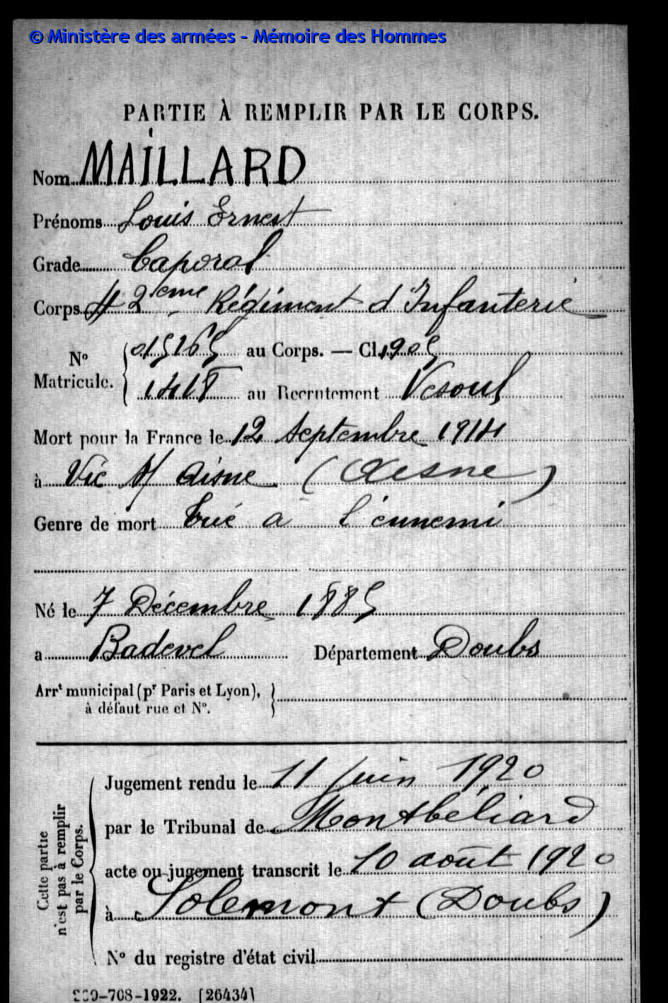 Auf dem Kriegerdenkmal der 3,73 Km2 kleinen Gemeinde mit 807 Einwohner im Departement Doubs (F), sind 28 Kriegsopfer aus dem 1. Weltkrieg verzeichnet, davon 26 im Militärehrenfeld auf dem Friedhof der Gemeinde. Davon sind 11 mit Fabian Coulot verwandt.