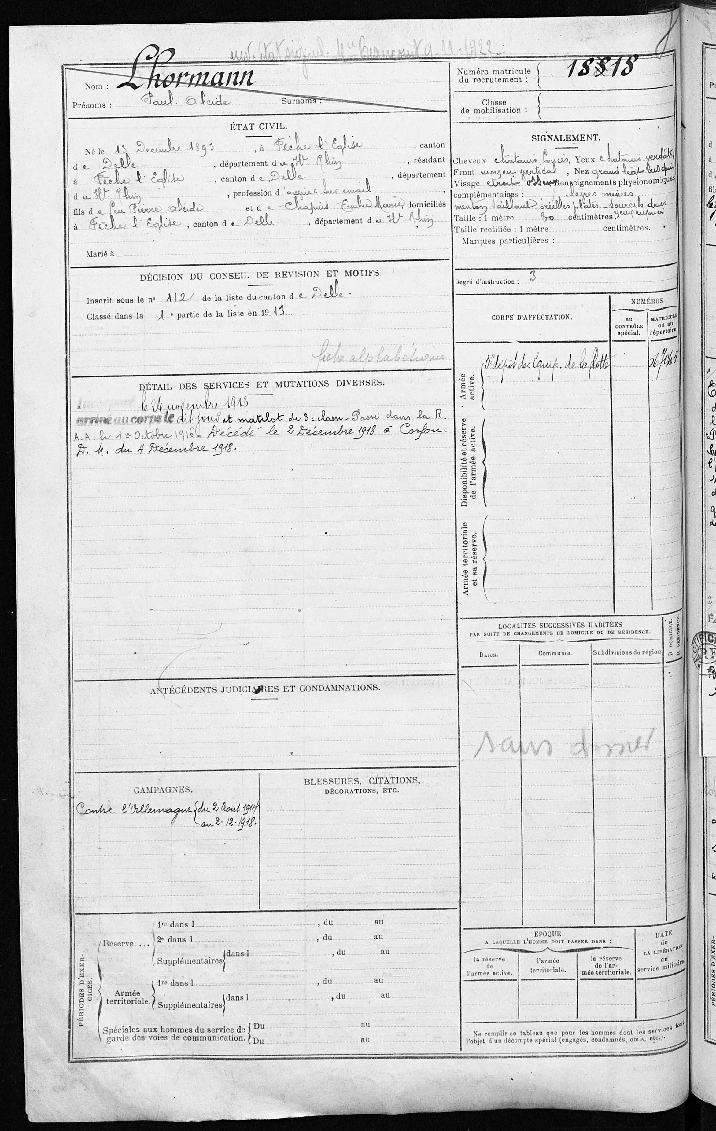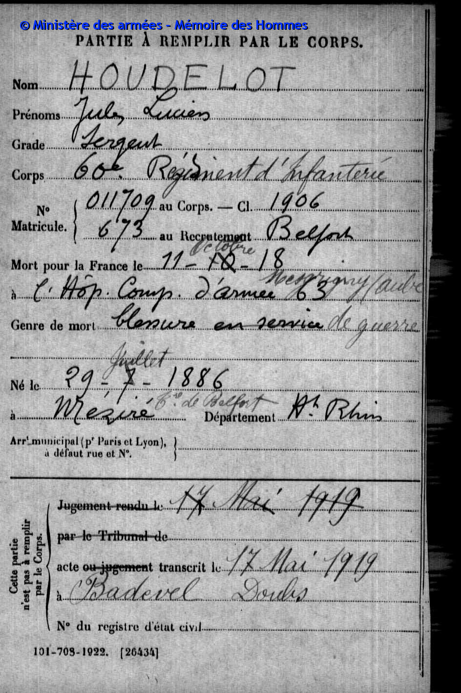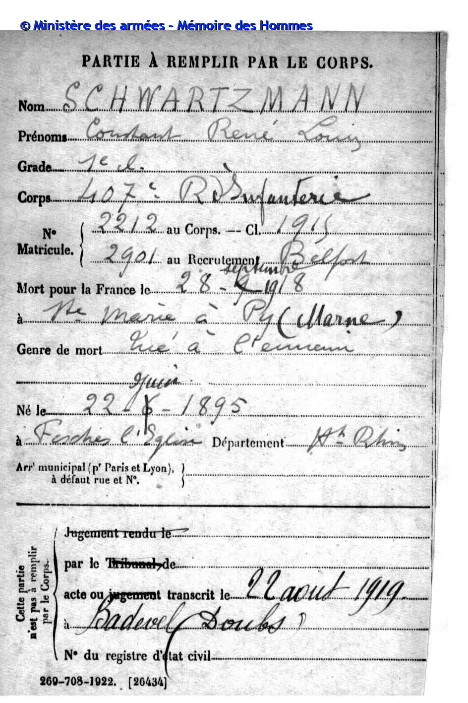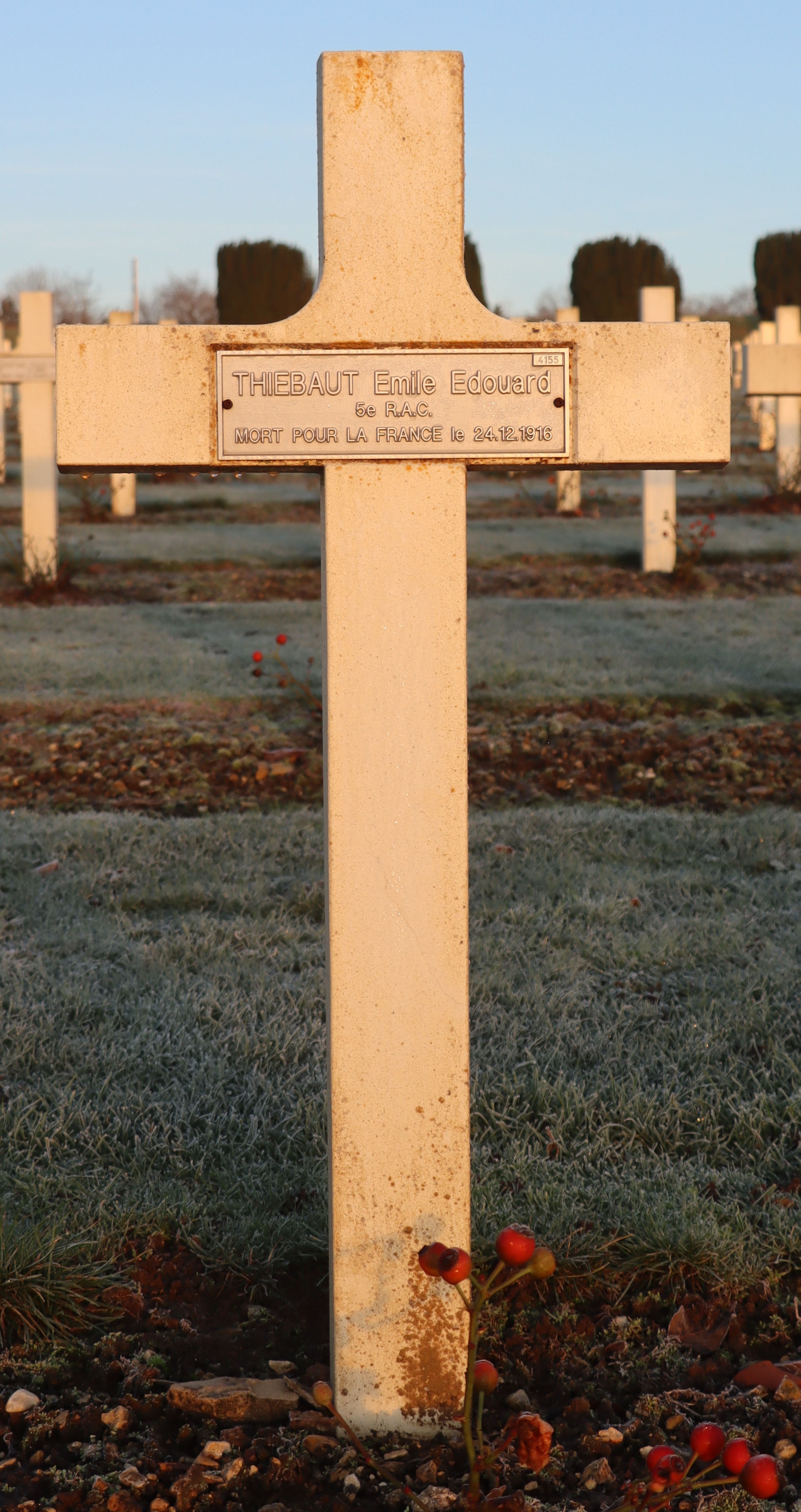 Auf dem Kriegerdenkmal der 3,73 Km2 kleinen Gemeinde mit 807 Einwohner im Departement Doubs (F), sind 28 Kriegsopfer aus dem 1. Weltkrieg verzeichnet, davon 26 im Militärehrenfeld auf dem Friedhof der Gemeinde. Davon sind 11 mit Fabian Coulot verwandt.
