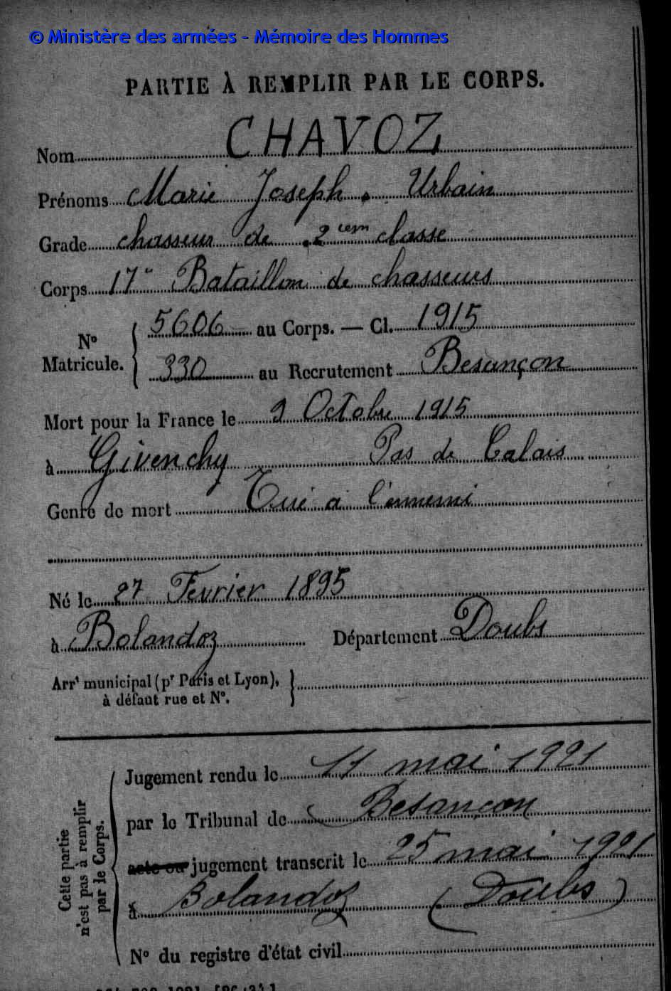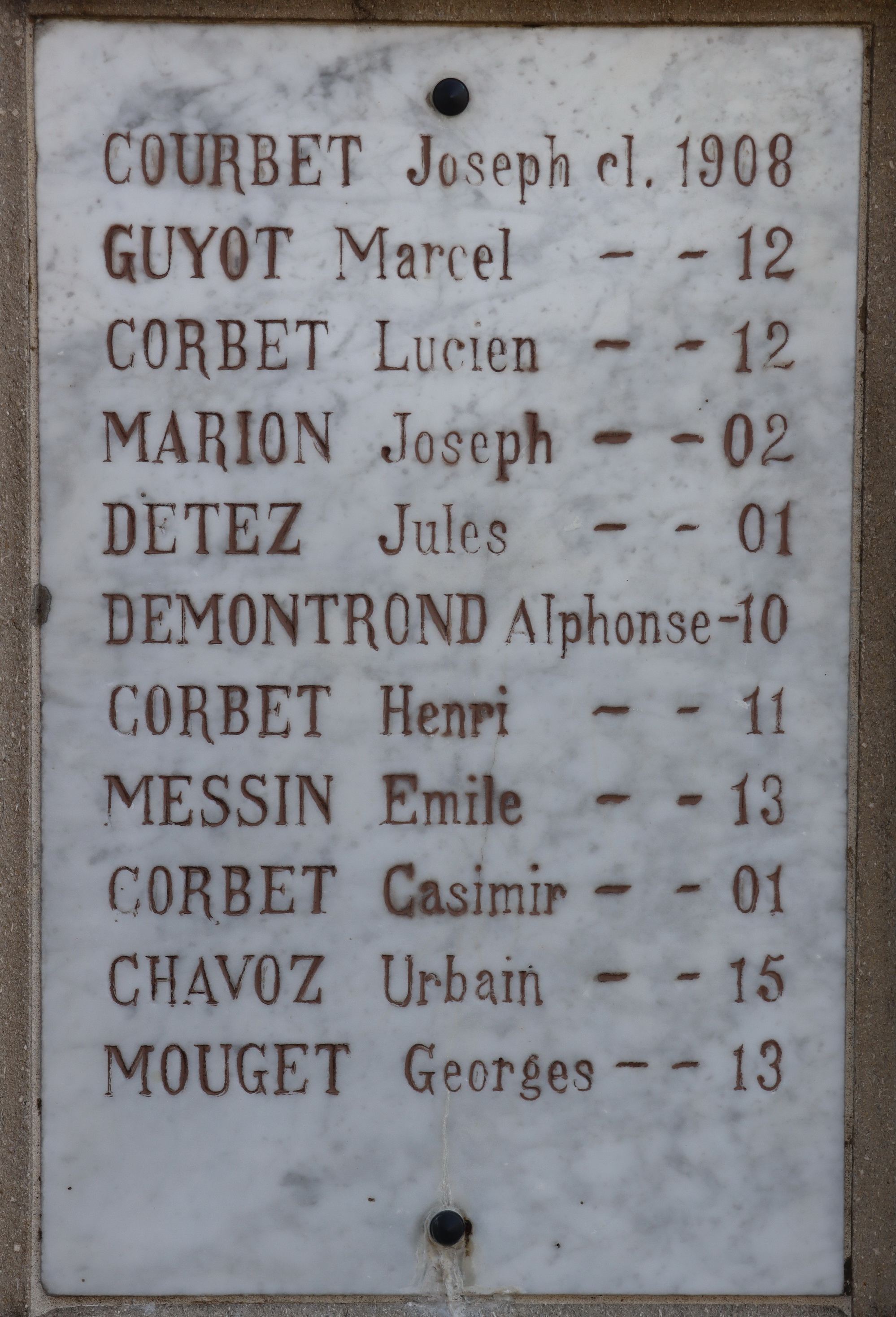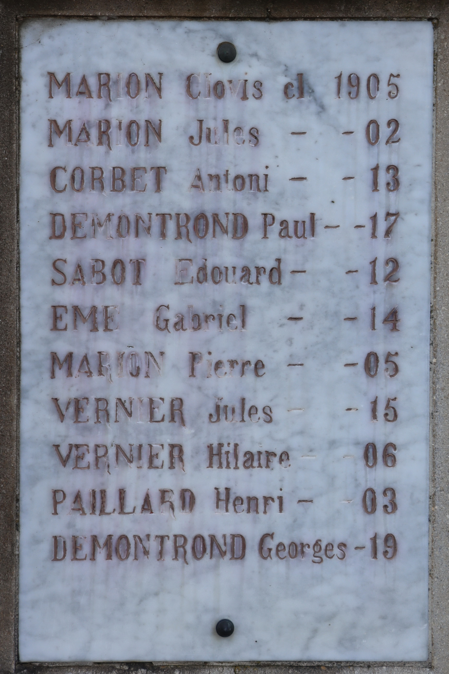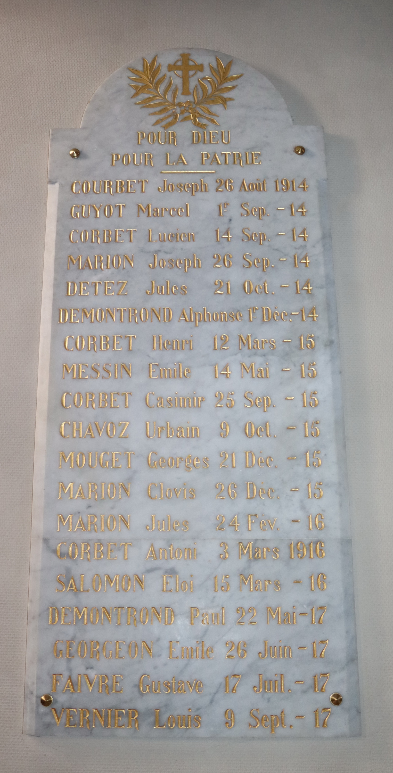 Auf dem Kriegerdenkmal bei der Kirche der 12,23 Km2 kleinen Gemeinde im Departement Doubs (F) mit 373 Einwohner verzeichnet 30 Namen von Kriegsopfer, davon sind 21 mit Fabian Coulot verwandt.