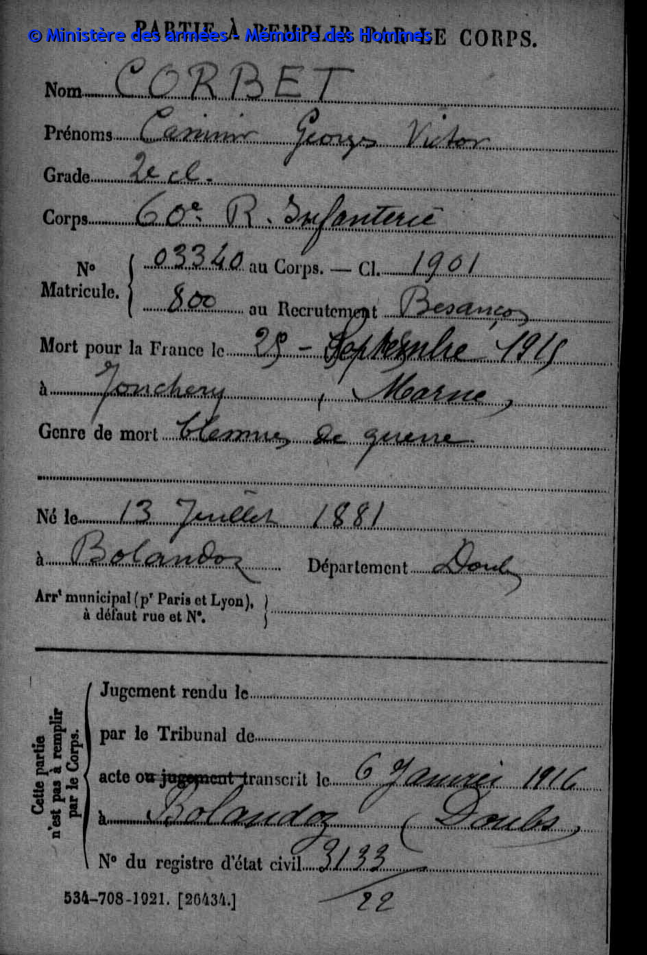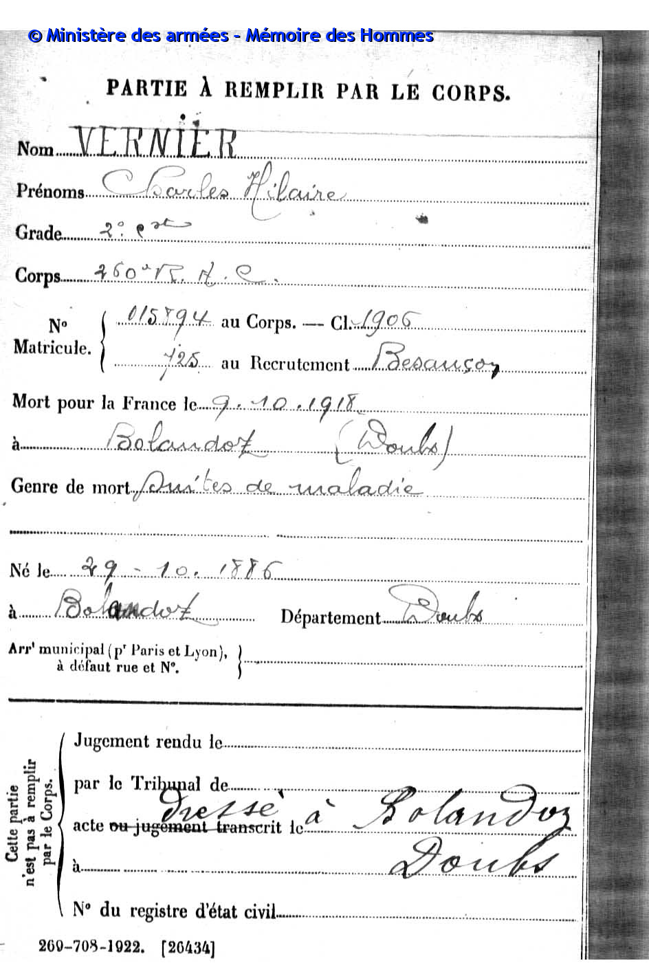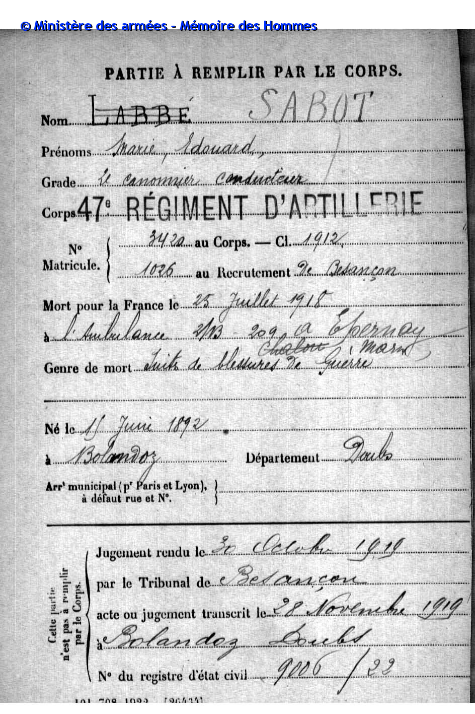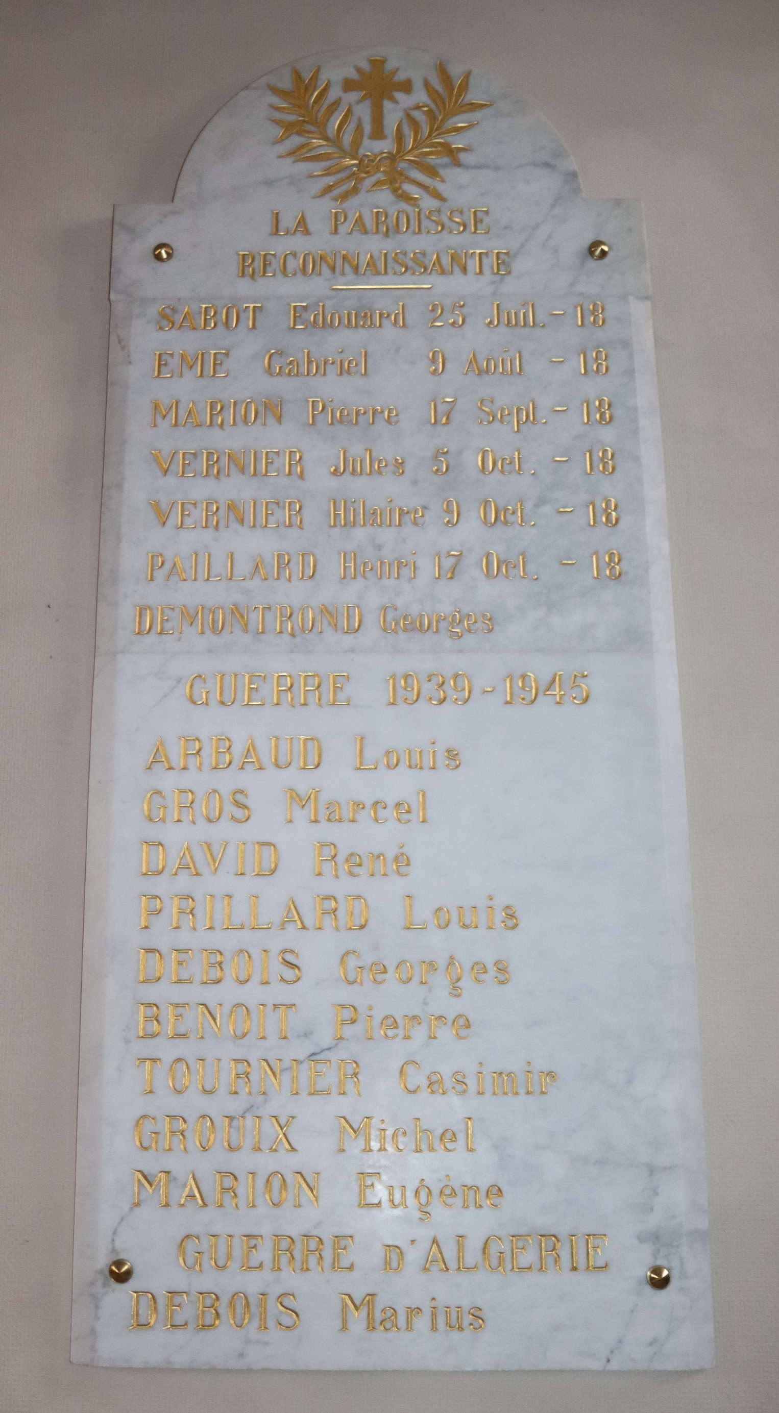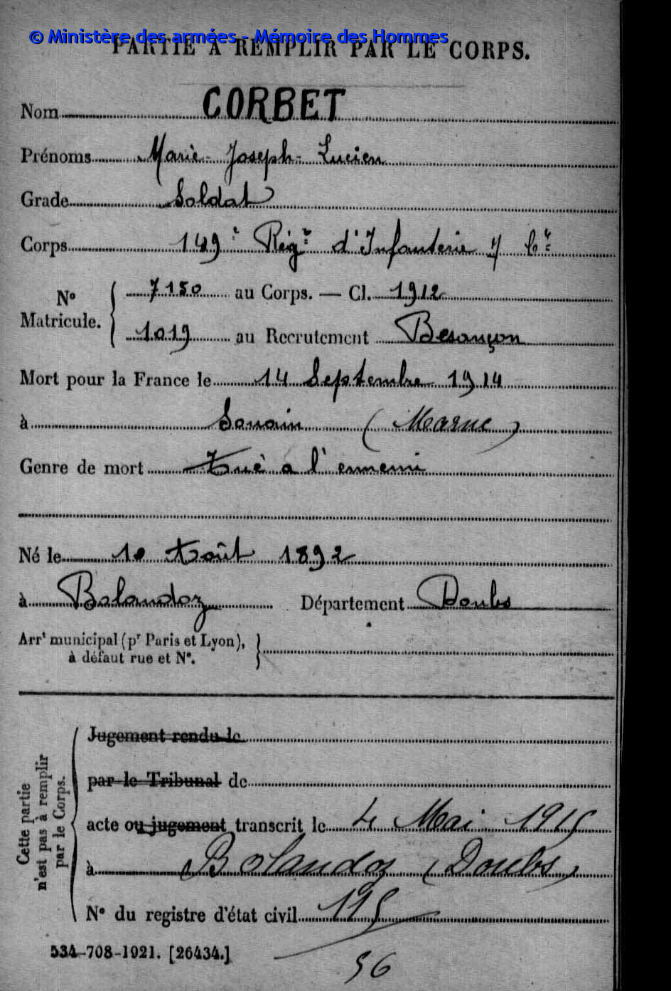 Auf dem Kriegerdenkmal bei der Kirche der 12,23 Km2 kleinen Gemeinde im Departement Doubs (F) mit 373 Einwohner verzeichnet 30 Namen von Kriegsopfer, davon sind 21 mit Fabian Coulot verwandt.