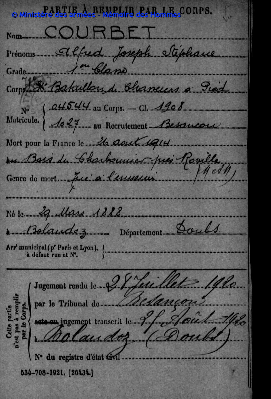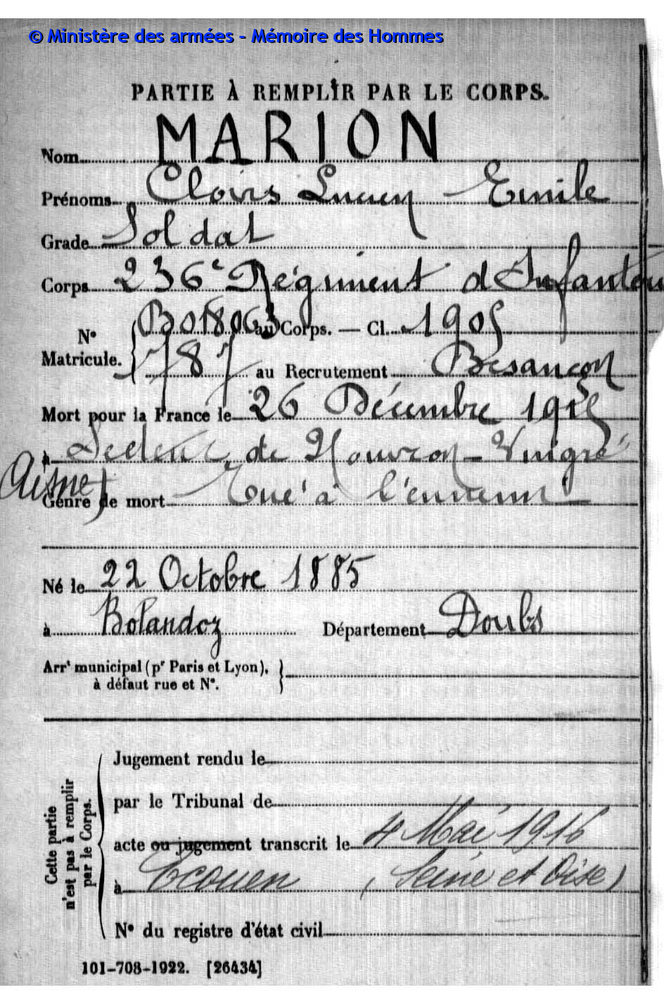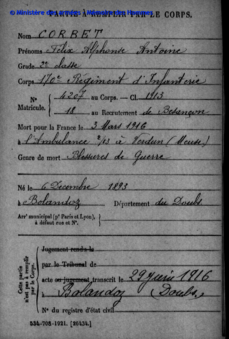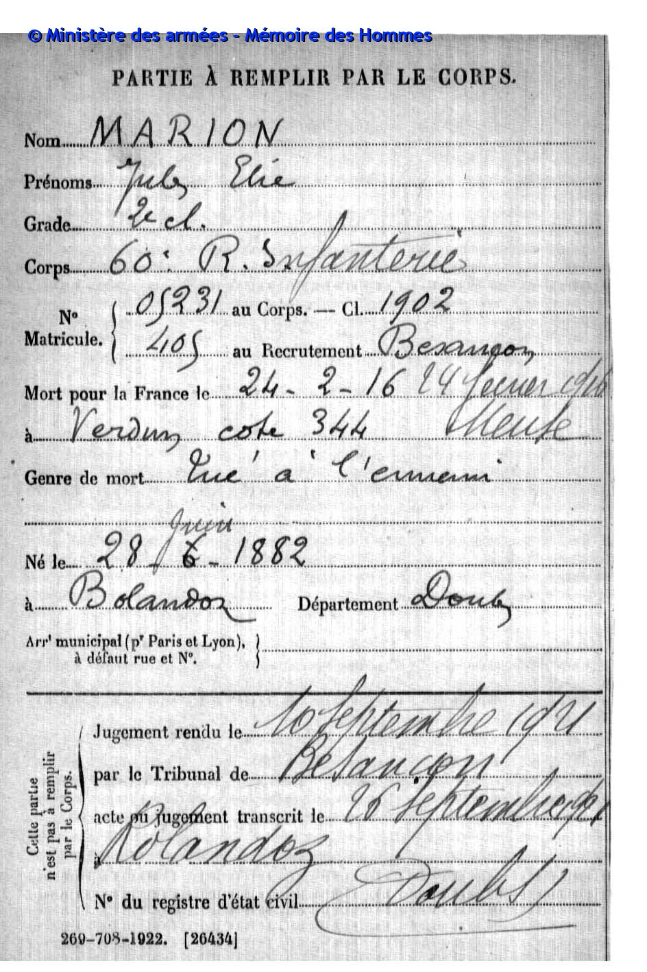 Auf dem Kriegerdenkmal bei der Kirche der 12,23 Km2 kleinen Gemeinde im Departement Doubs (F) mit 373 Einwohner verzeichnet 30 Namen von Kriegsopfer, davon sind 21 mit Fabian Coulot verwandt.