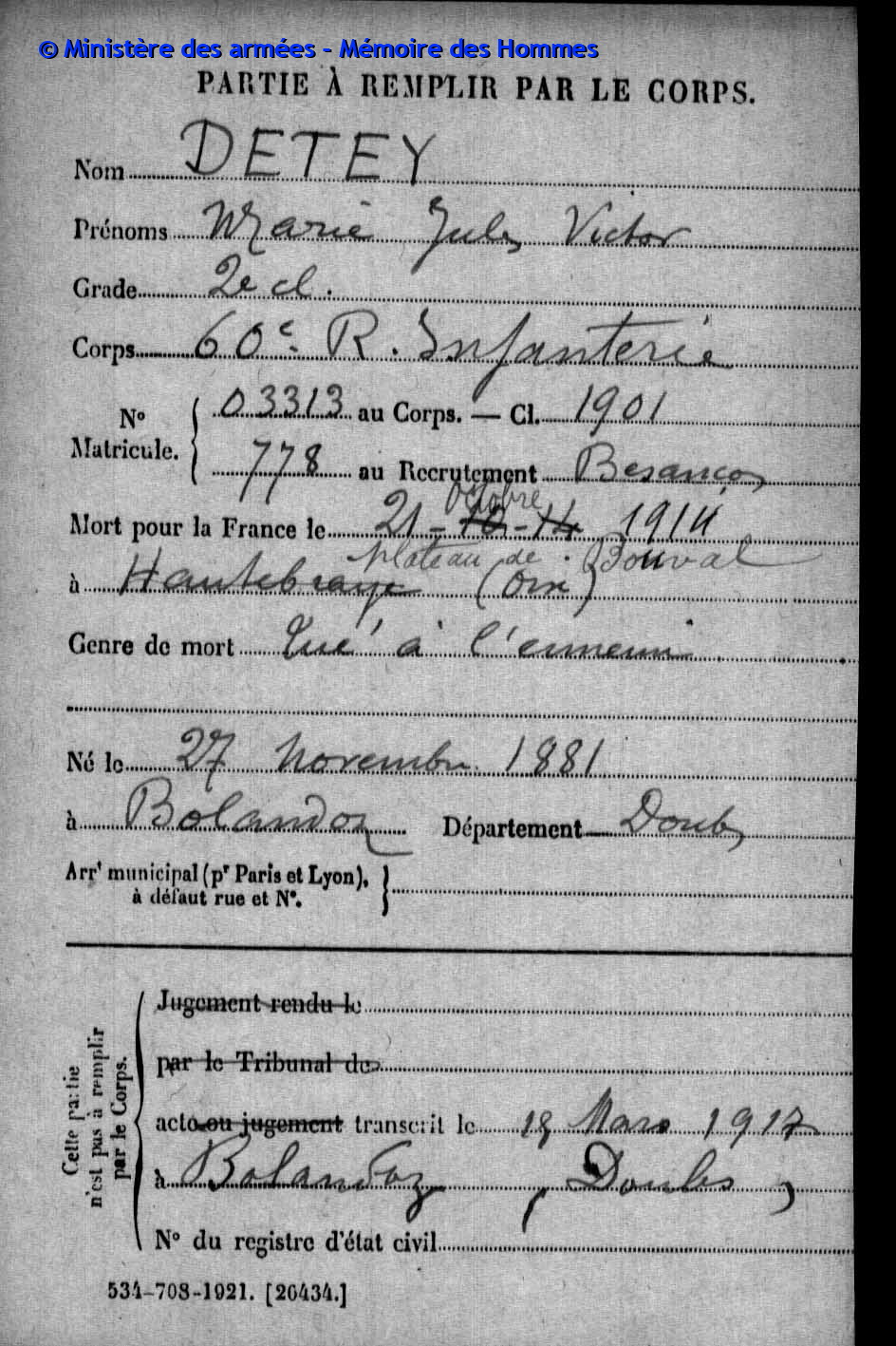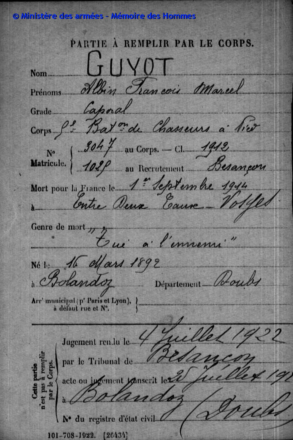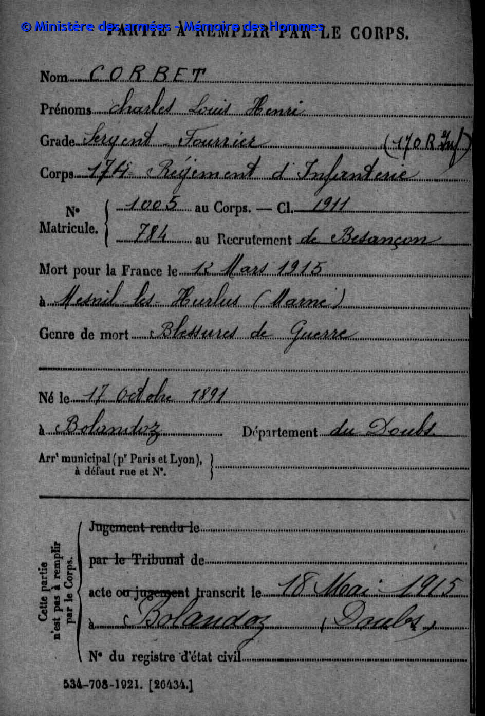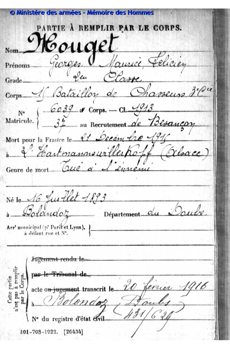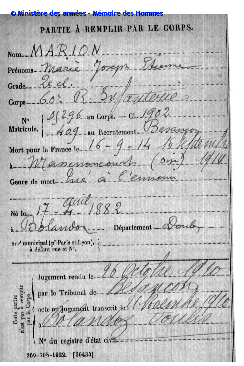 Auf dem Kriegerdenkmal bei der Kirche der 12,23 Km2 kleinen Gemeinde im Departement Doubs (F) mit 373 Einwohner verzeichnet 30 Namen von Kriegsopfer, davon sind 21 mit Fabian Coulot verwandt.