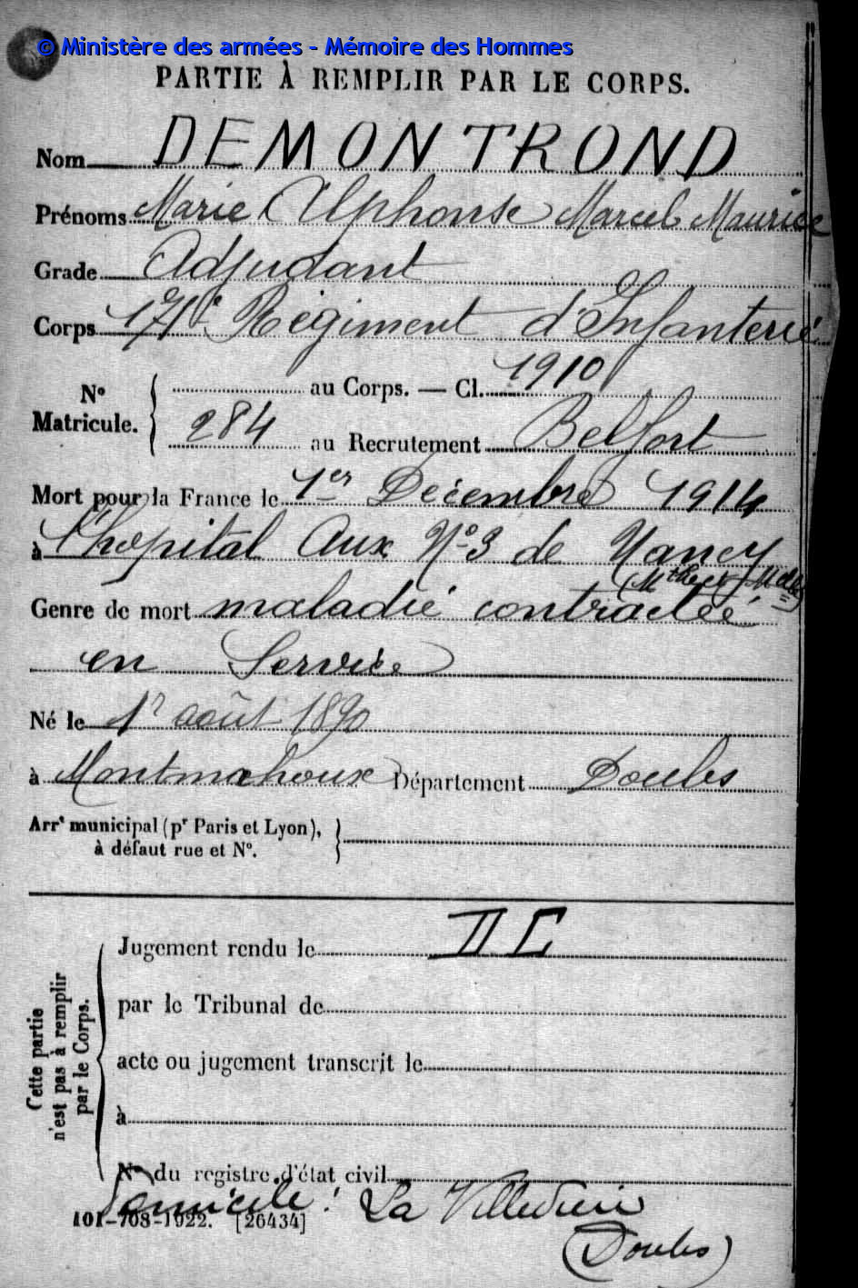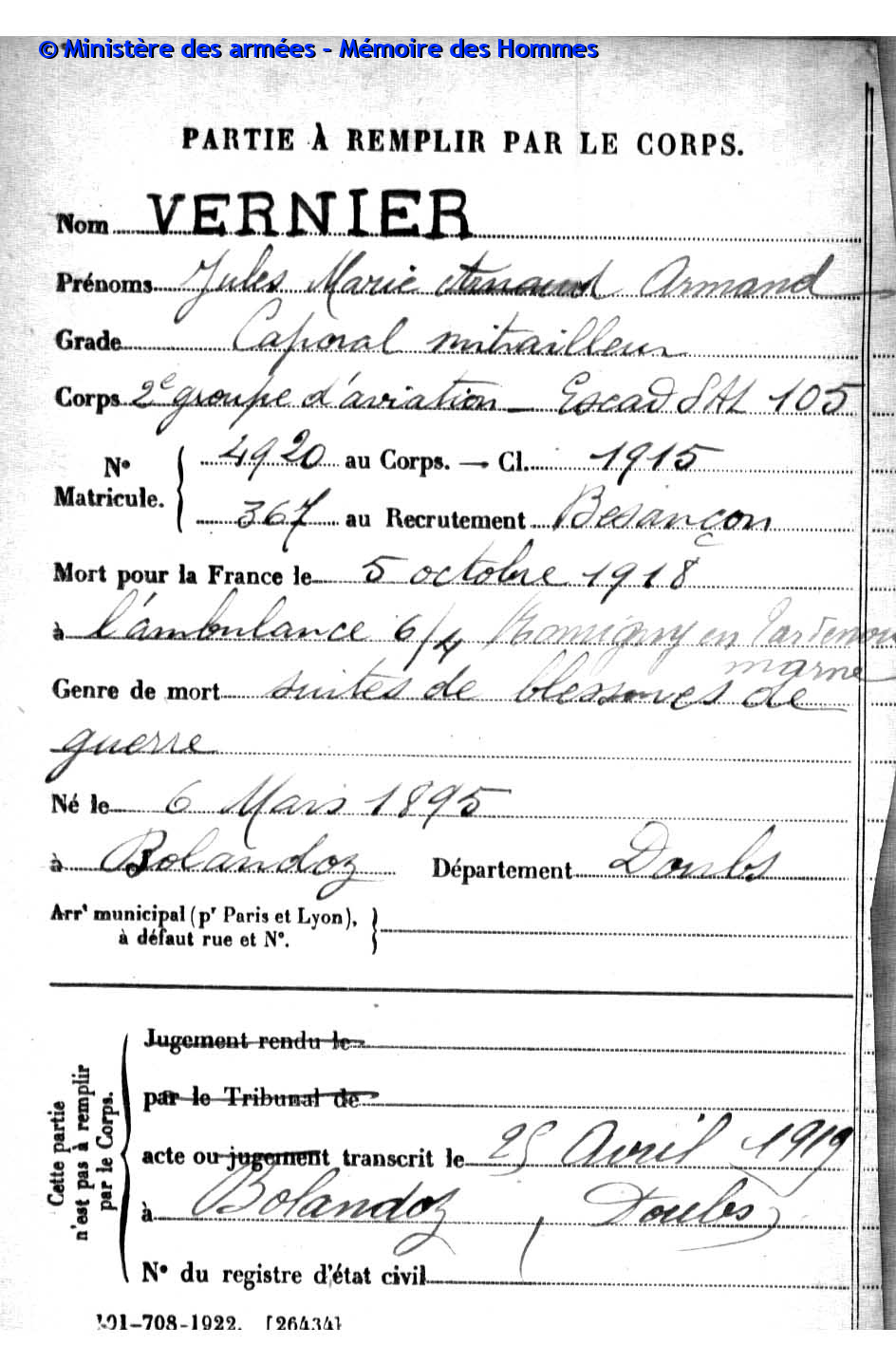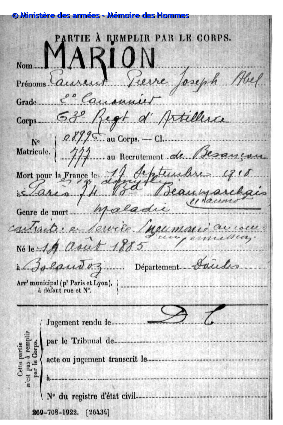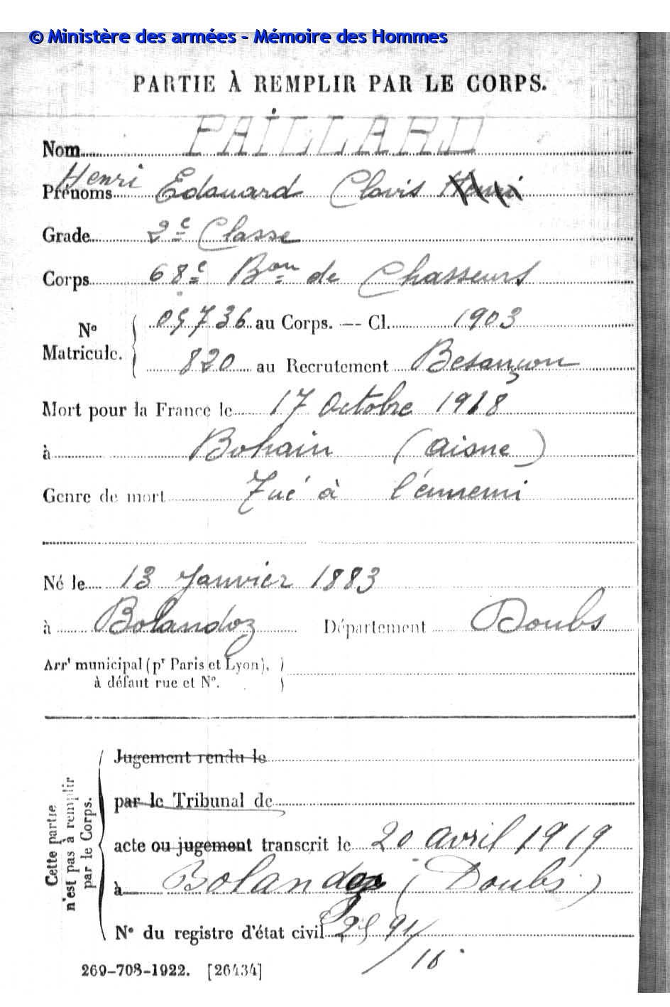 Auf dem Kriegerdenkmal bei der Kirche der 12,23 Km2 kleinen Gemeinde im Departement Doubs (F) mit 373 Einwohner verzeichnet 30 Namen von Kriegsopfer, davon sind 21 mit Fabian Coulot verwandt.