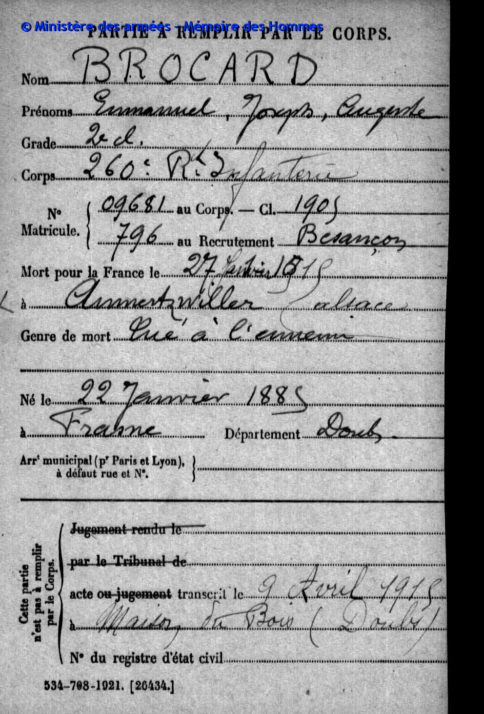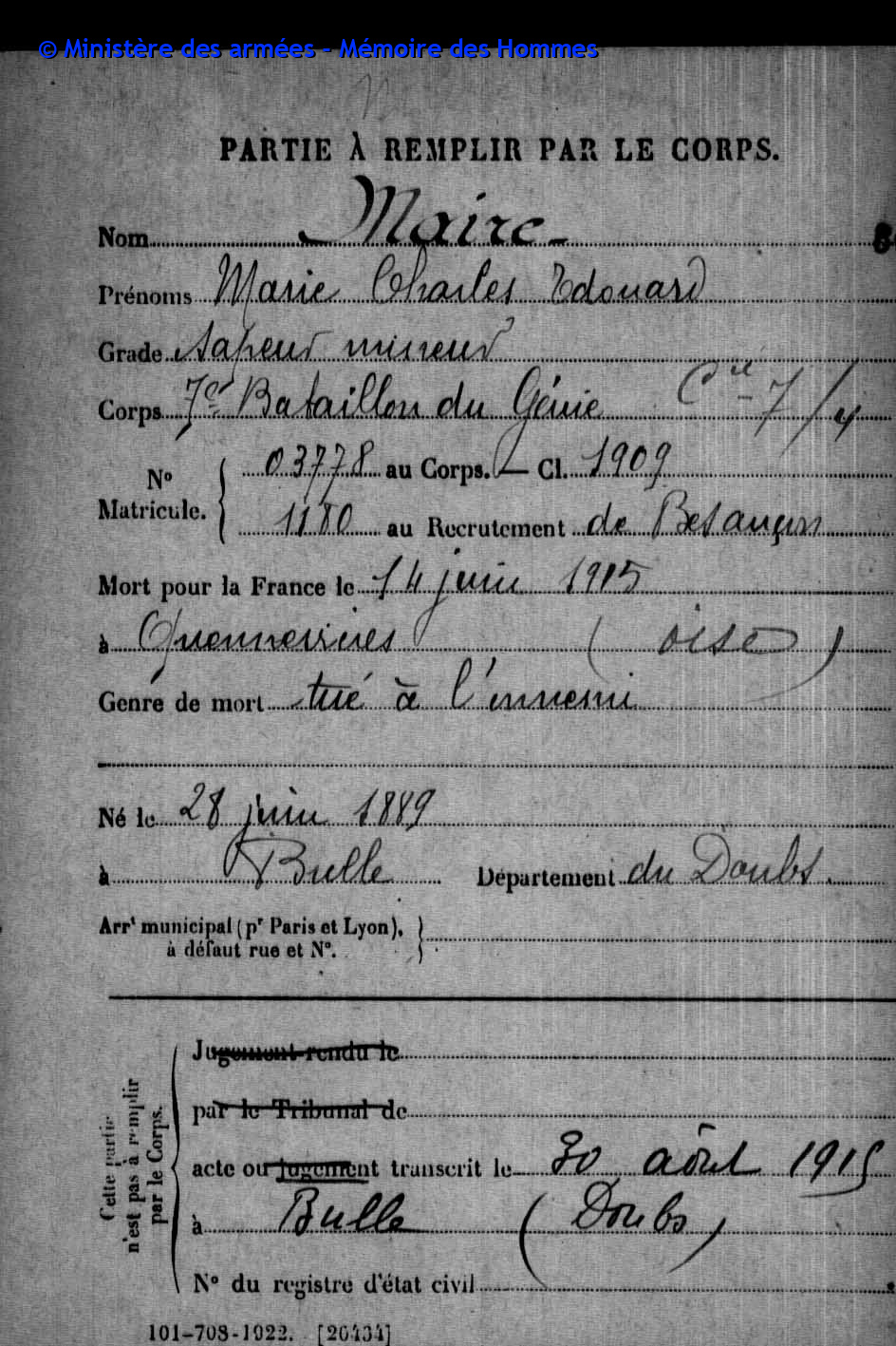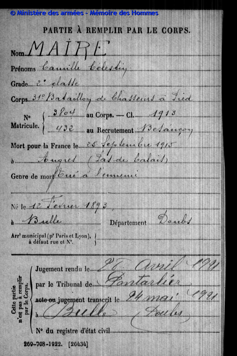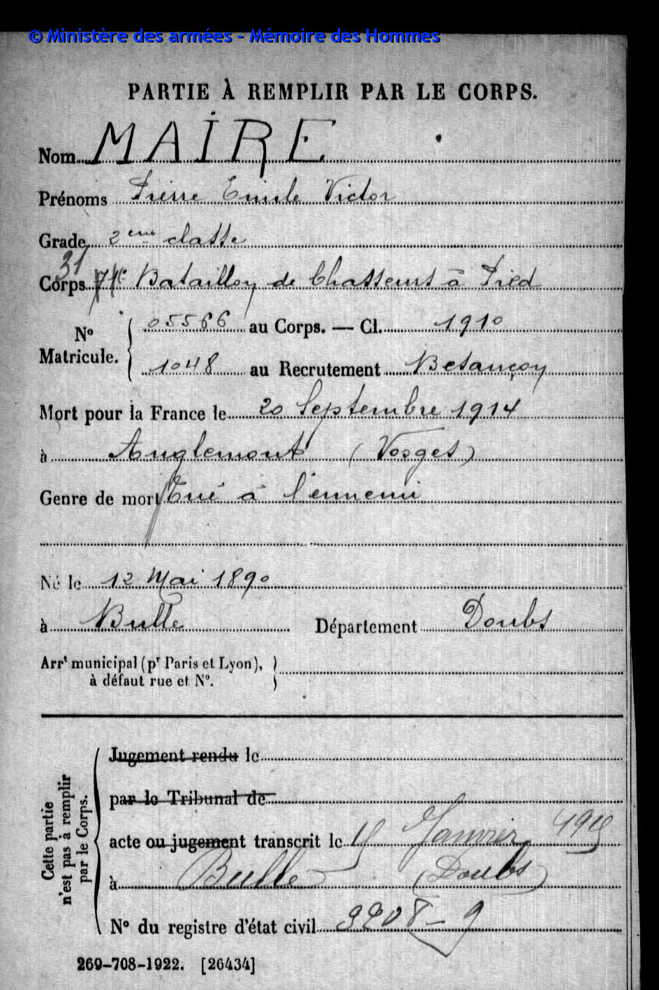 2ème classe MAIRE Pierre Emile Victor 12.05.1890 - 20.09.1914 31ème Bataillon de Chasseurs à Pied Gefallen in Anglemont in den Vogesen (F) |