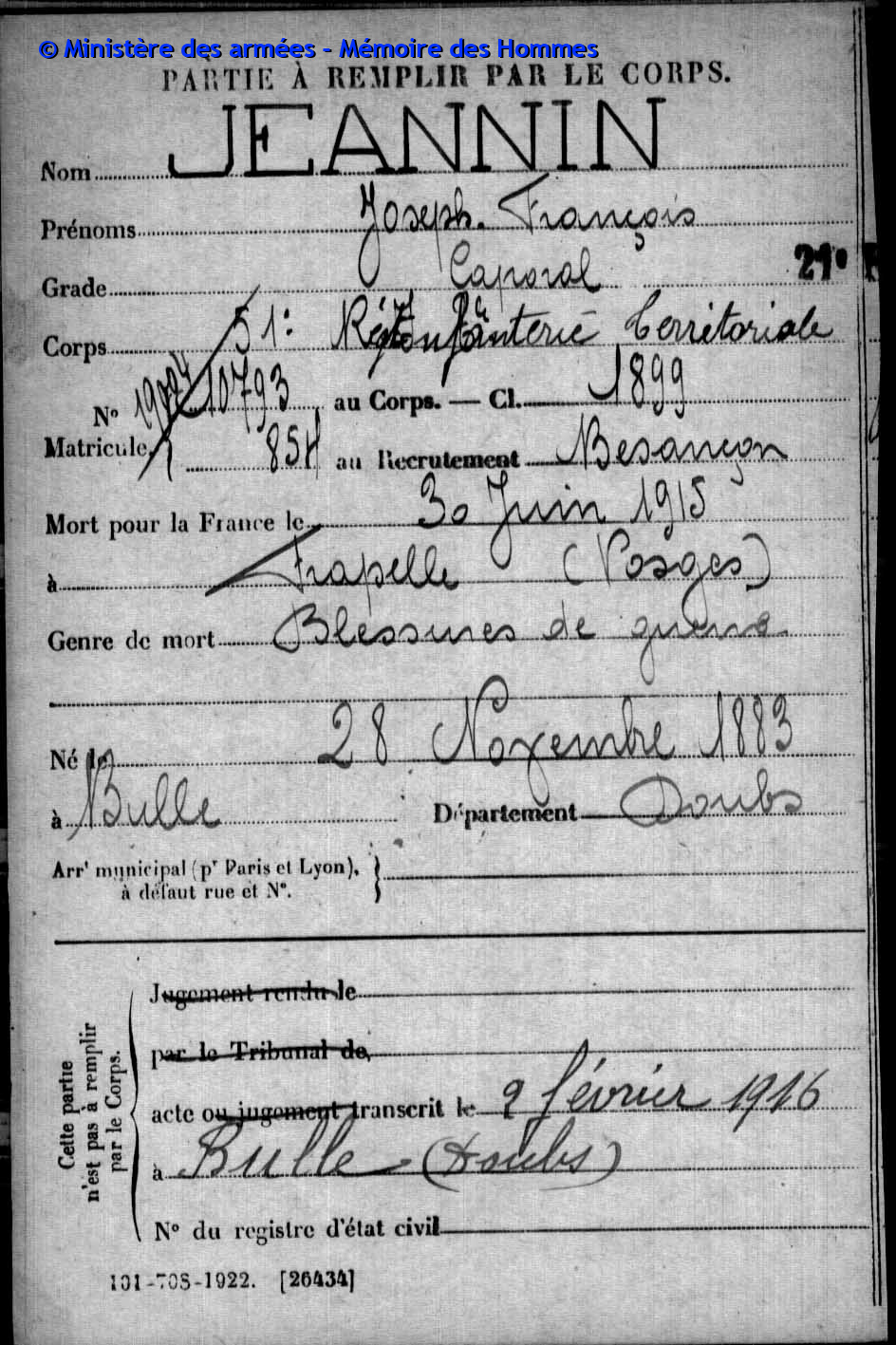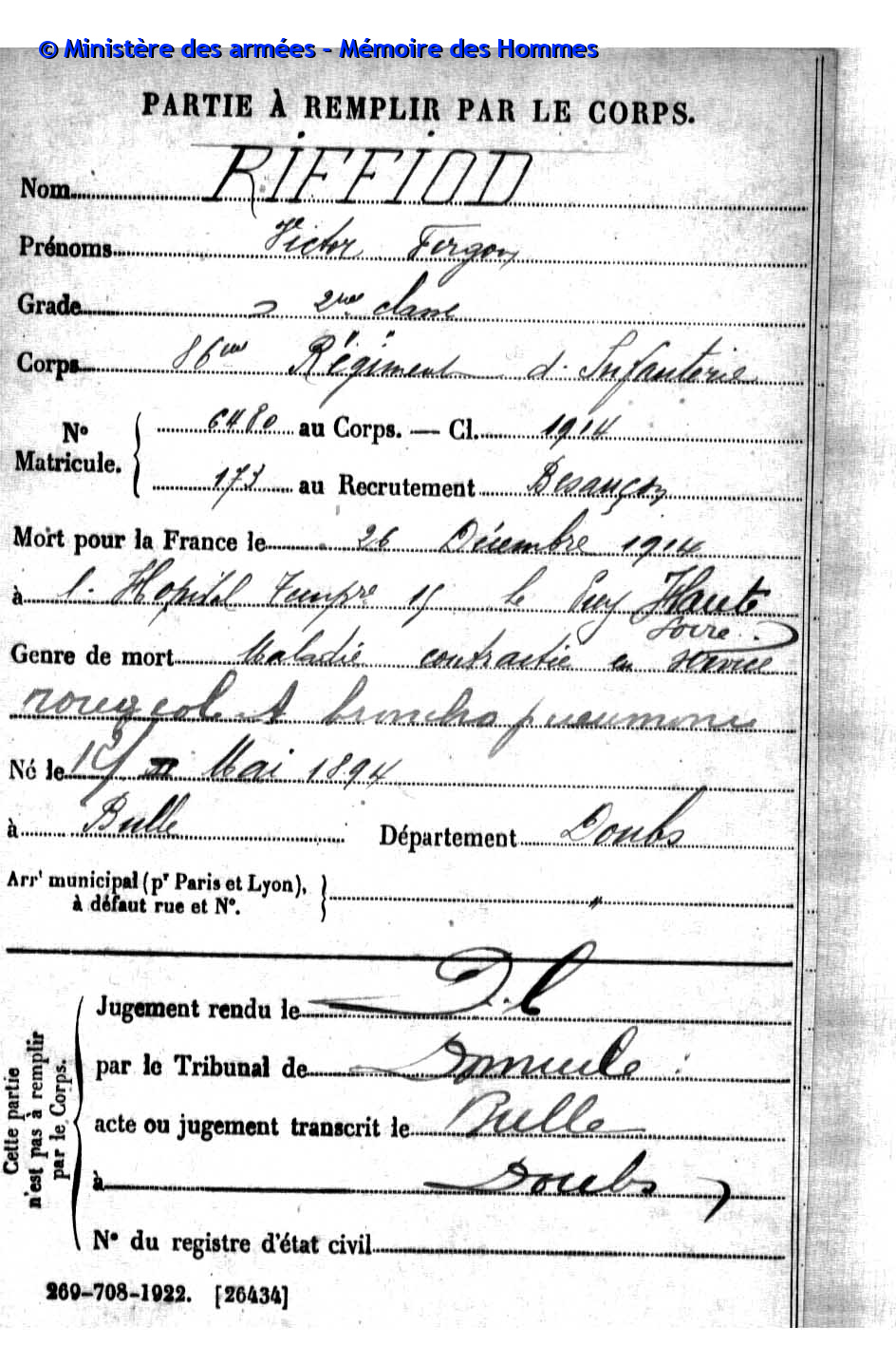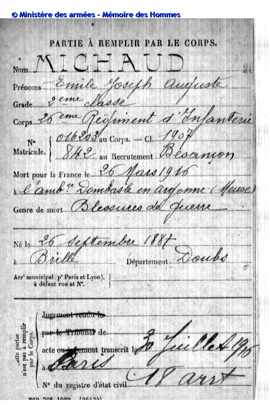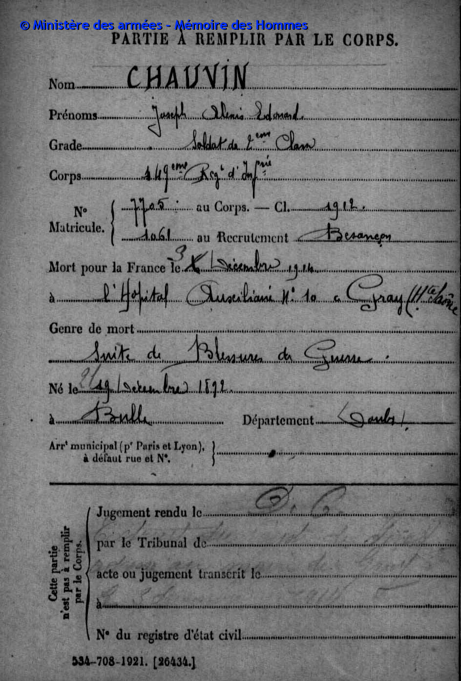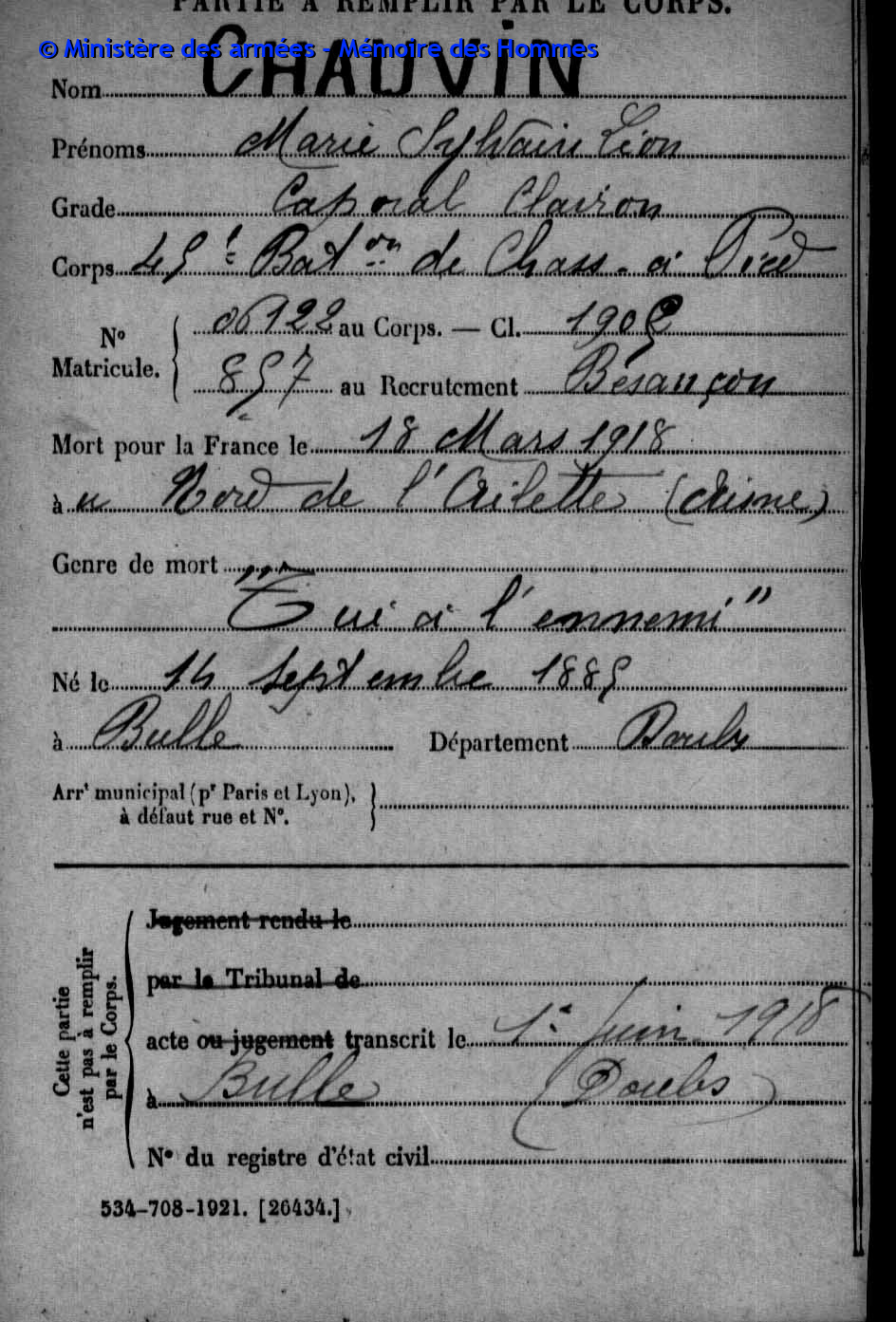 2ème classe MAIRE Pierre Emile Victor 12.05.1890 - 20.09.1914 31ème Bataillon de Chasseurs à Pied Gefallen in Anglemont in den Vogesen (F) |