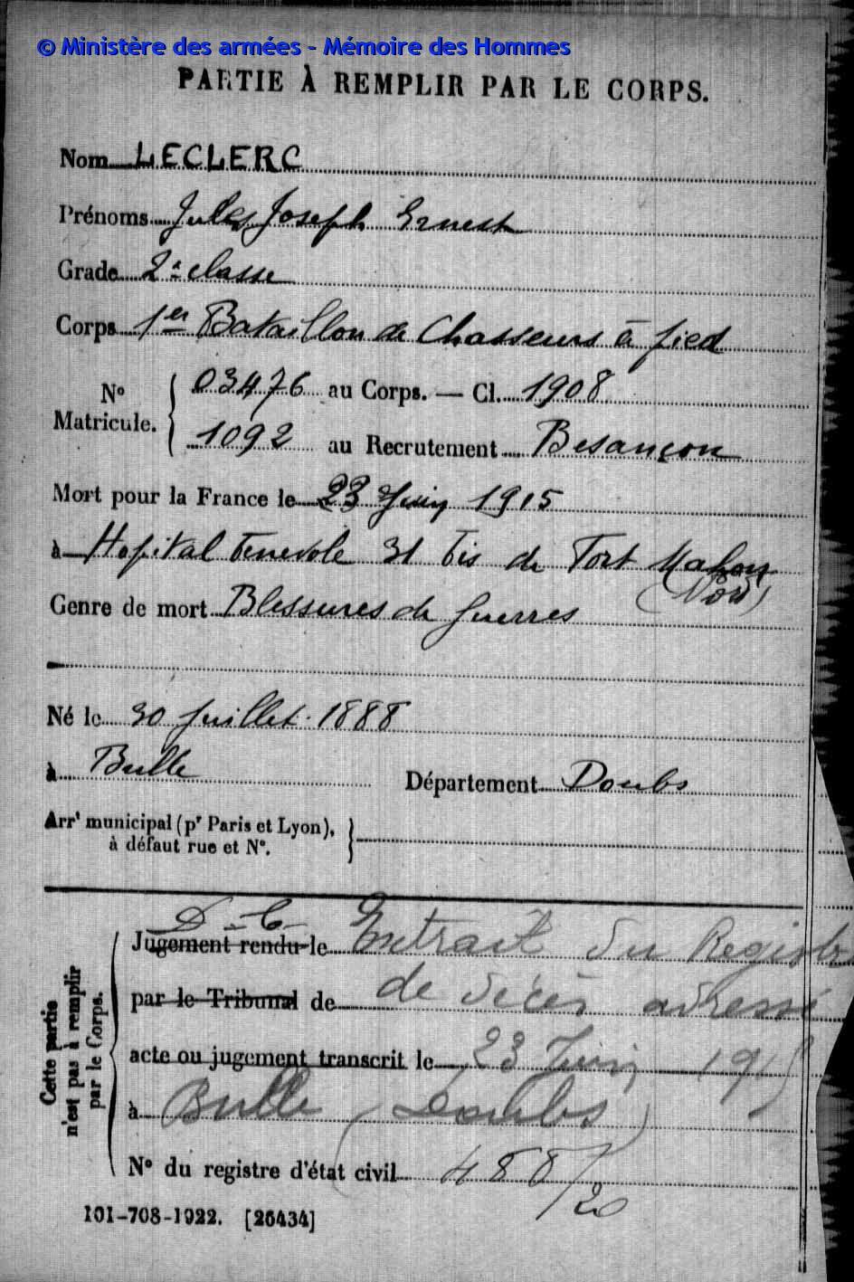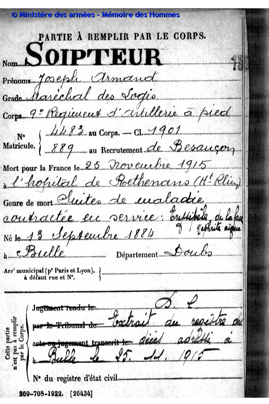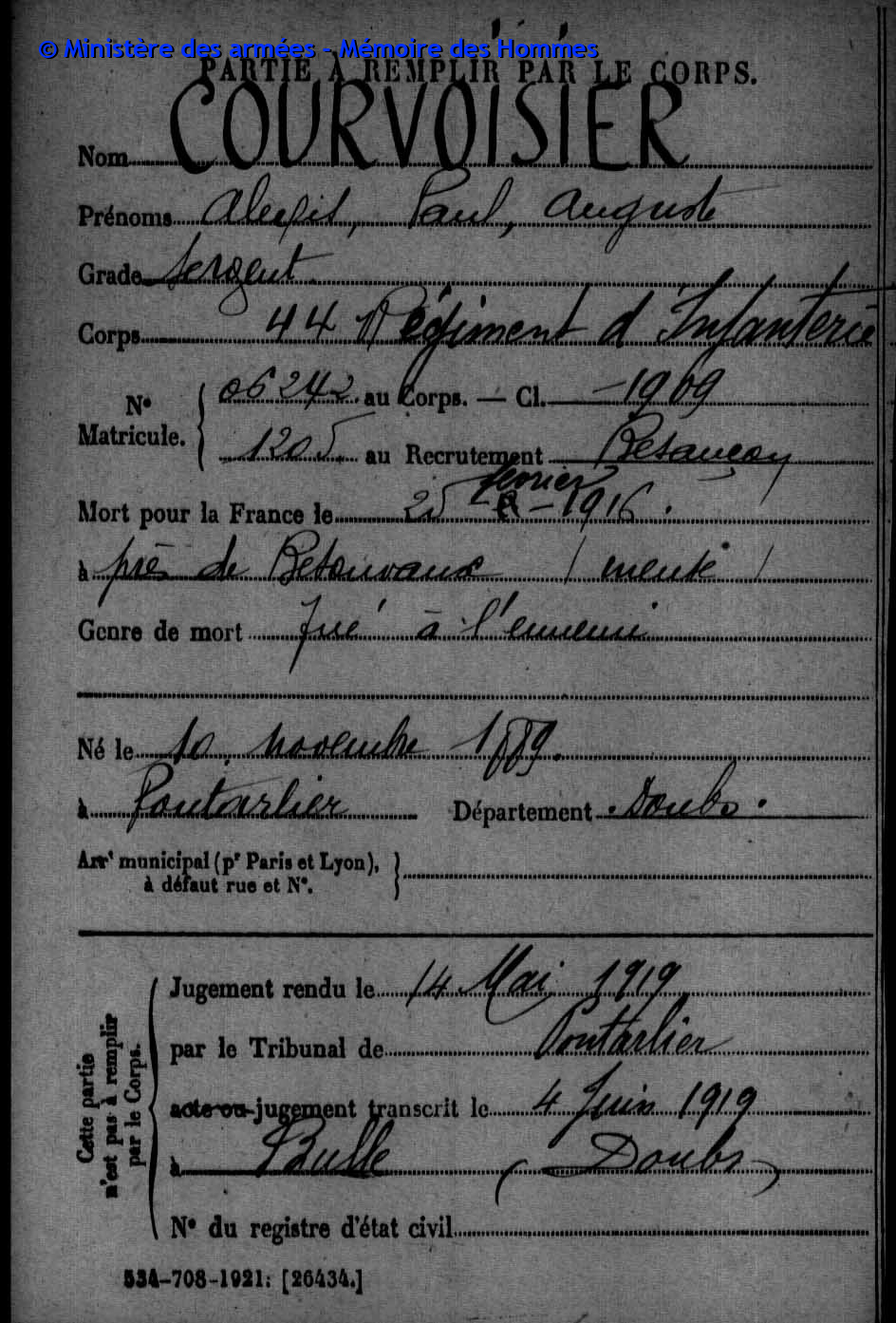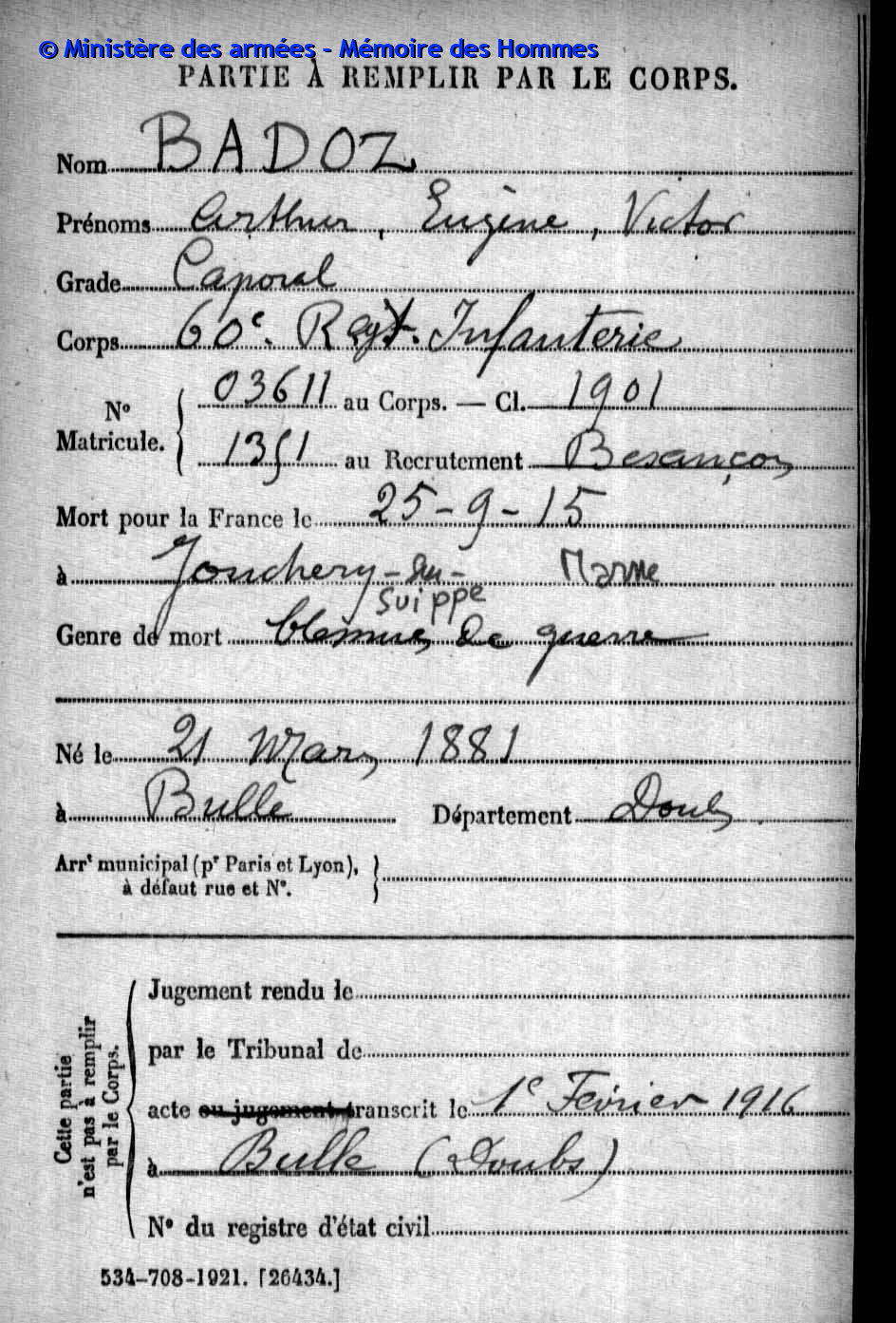 2ème classe MAIRE Pierre Emile Victor 12.05.1890 - 20.09.1914 31ème Bataillon de Chasseurs à Pied Gefallen in Anglemont in den Vogesen (F) |