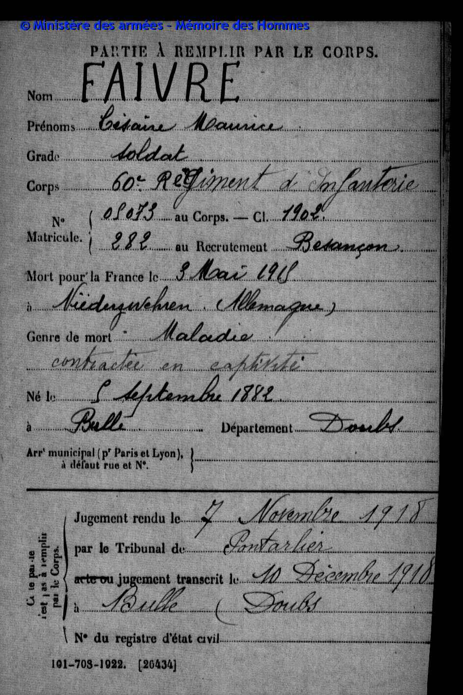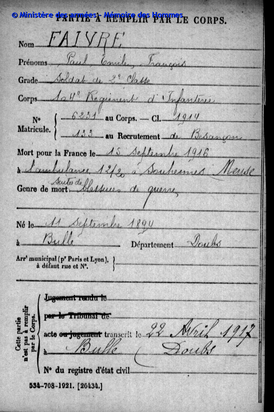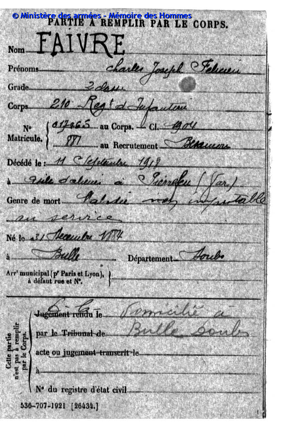 2ème classe FAIVRE Charles Joseph Félicien 31.12.1884 - 11.09.1918 210ème Régiment d'Infanterie Verstarb durch Krankheit in Pierrefeu - Var (F) |