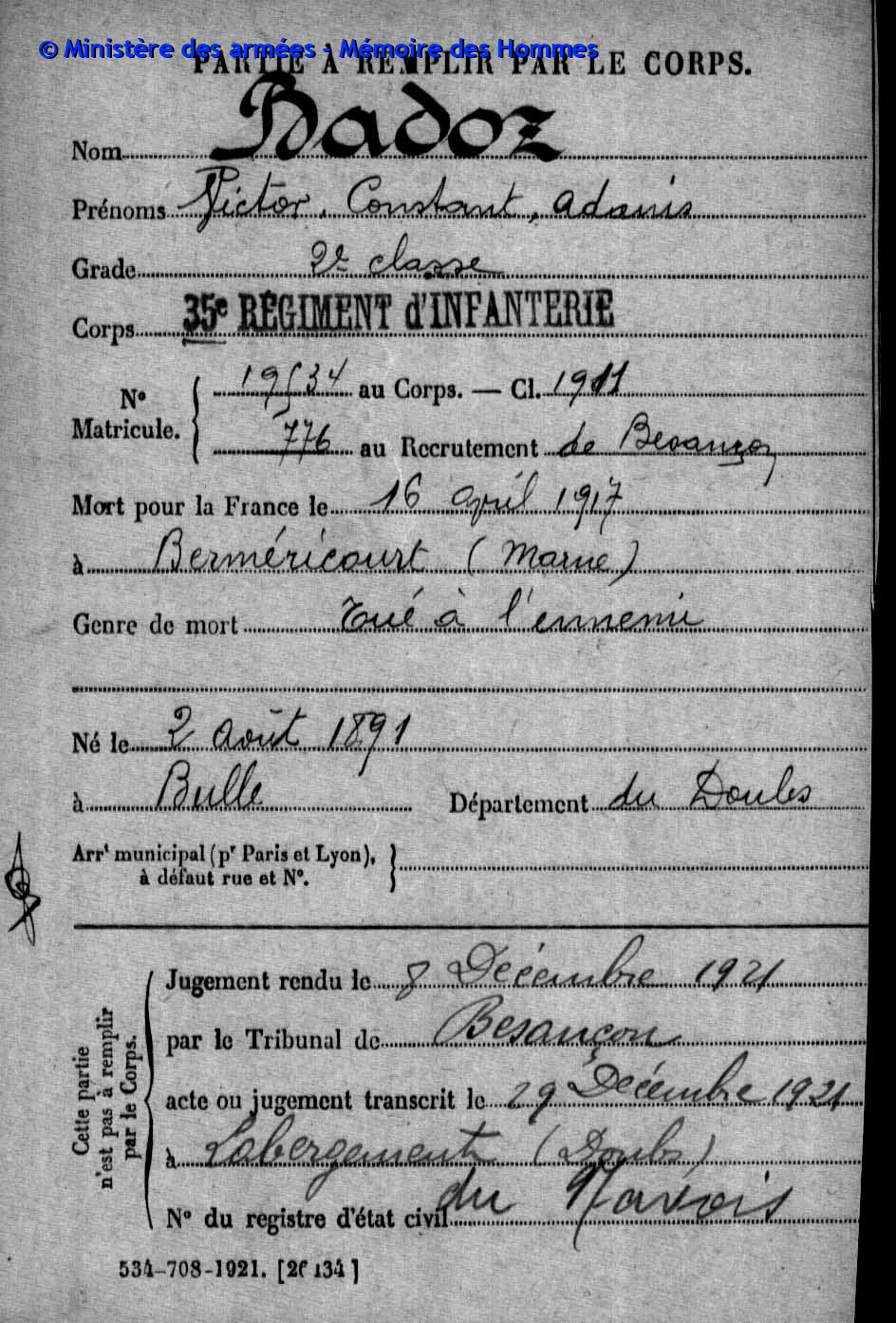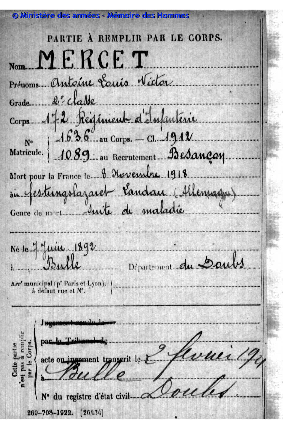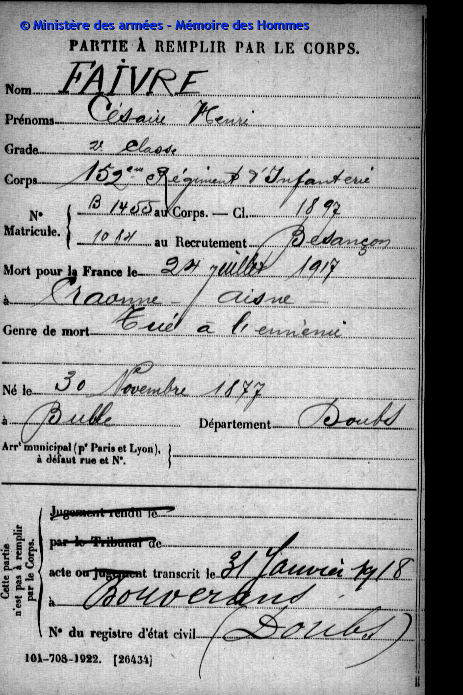 2ème classe FAIVRE Charles Joseph Félicien 31.12.1884 - 11.09.1918 210ème Régiment d'Infanterie Verstarb durch Krankheit in Pierrefeu - Var (F) |