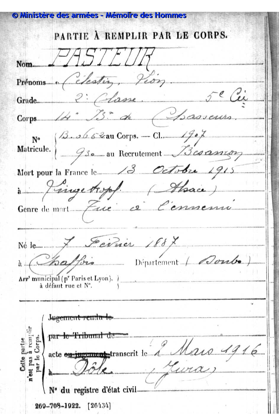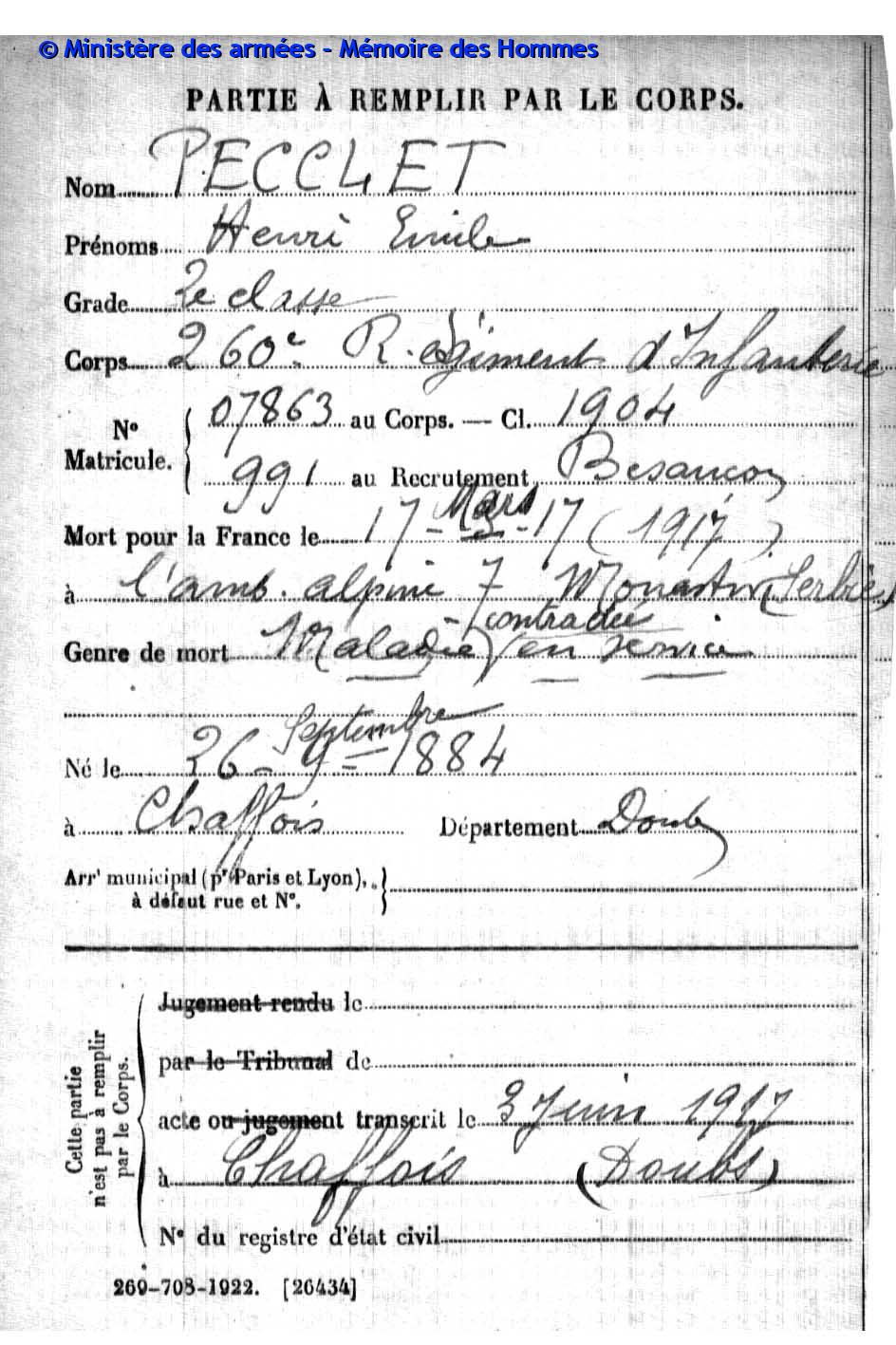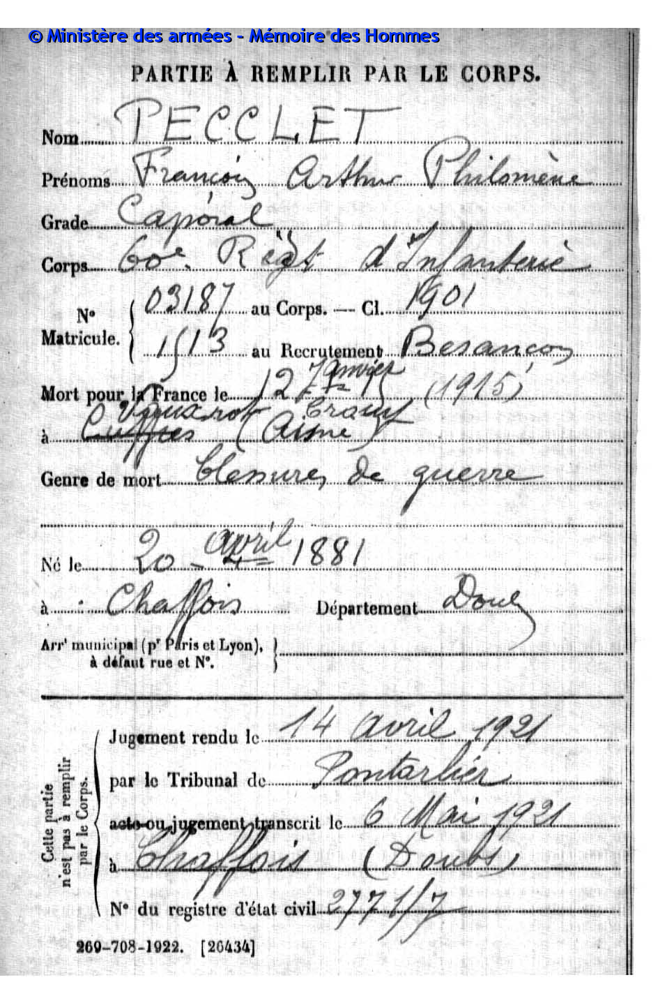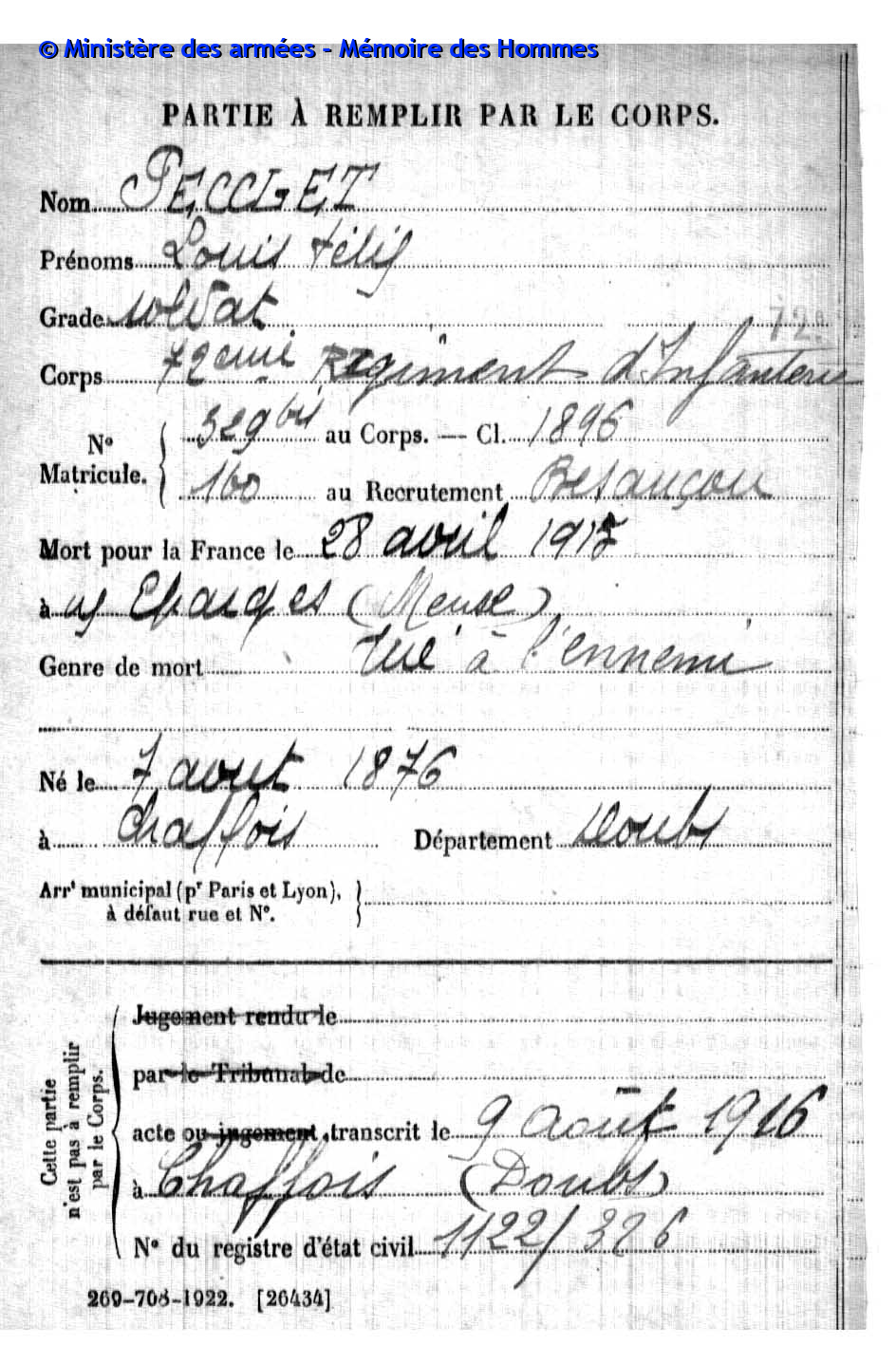 | Soldat PECCLET Louis Félix 07.08.1876 - 28.04.1915 72ème Régiment d'Infanterie Gefallen in Les Eparges - Meuse (F) |