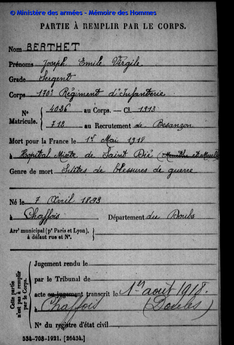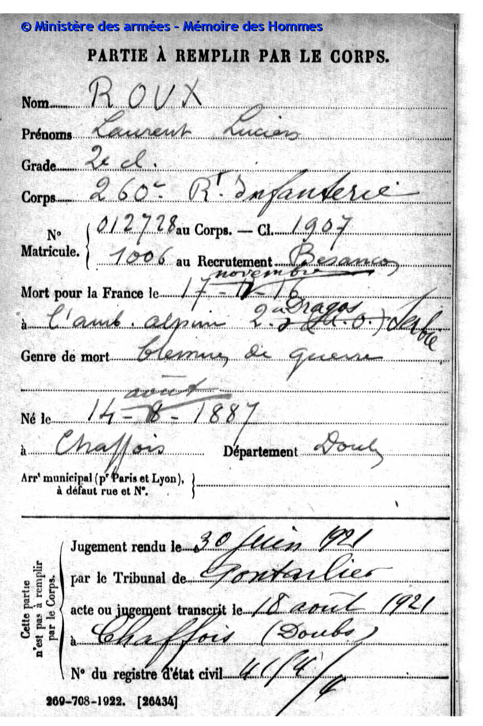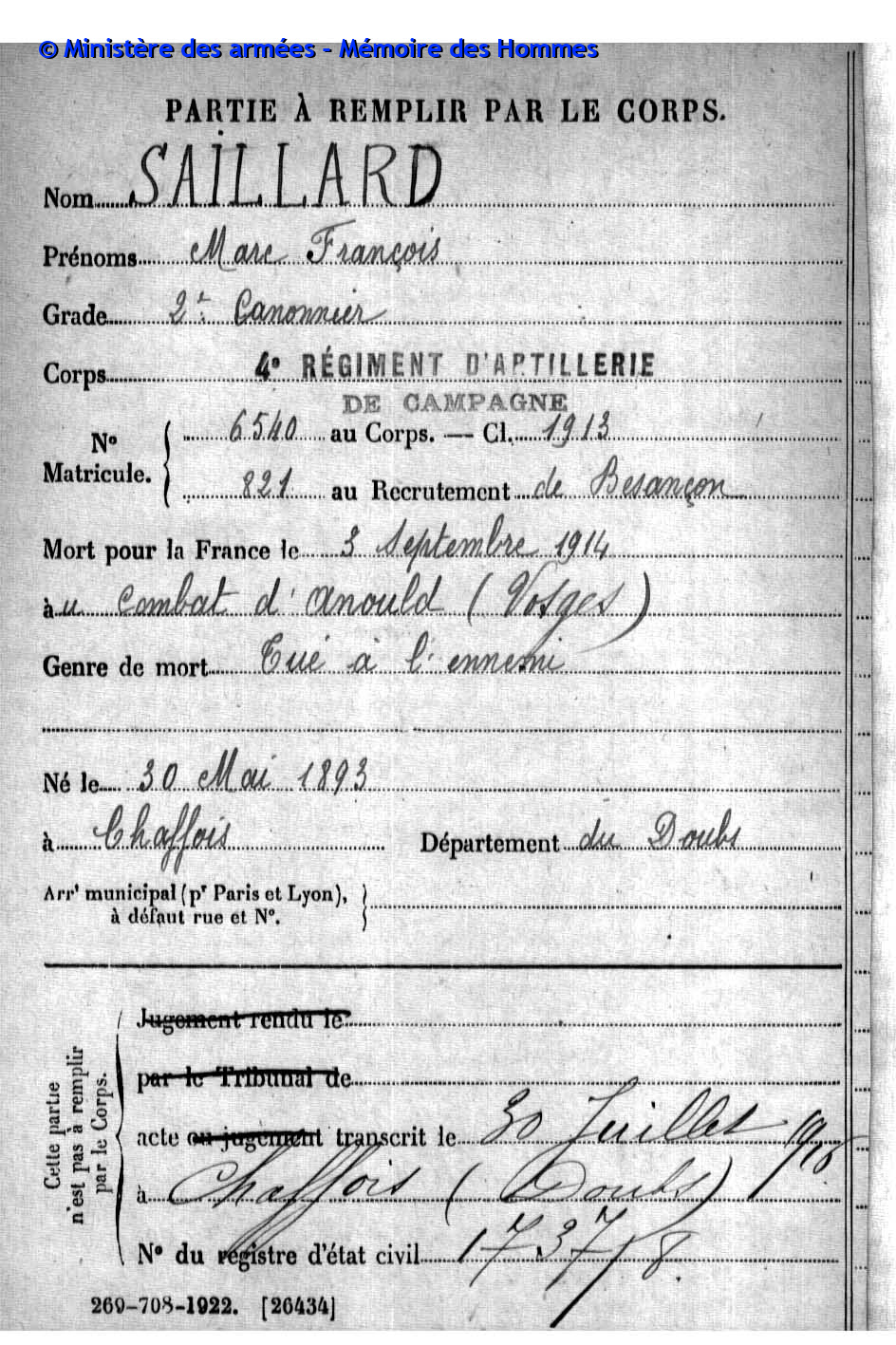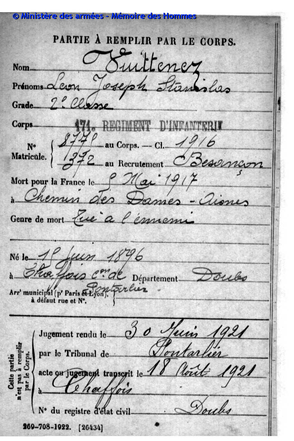 | Soldat PECCLET Louis Félix 07.08.1876 - 28.04.1915 72ème Régiment d'Infanterie Gefallen in Les Eparges - Meuse (F) |
