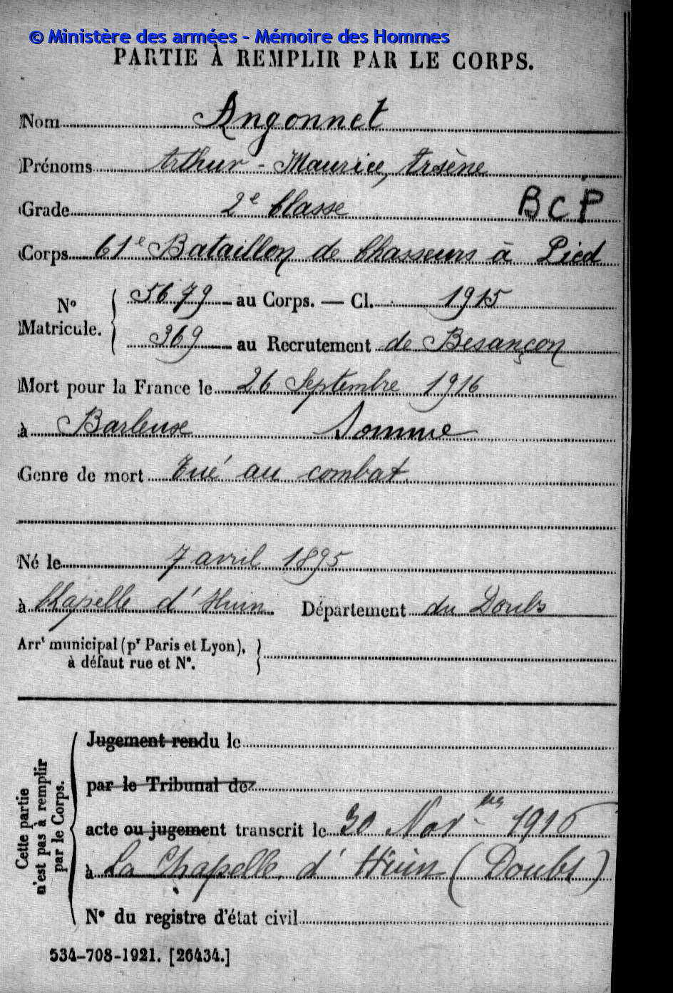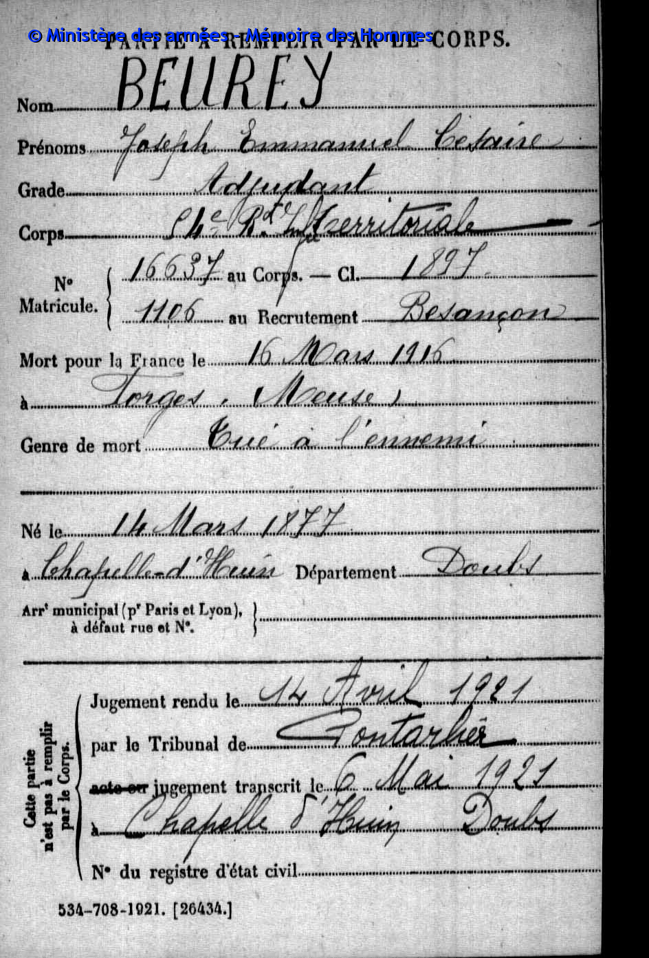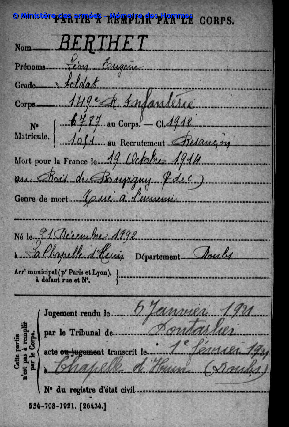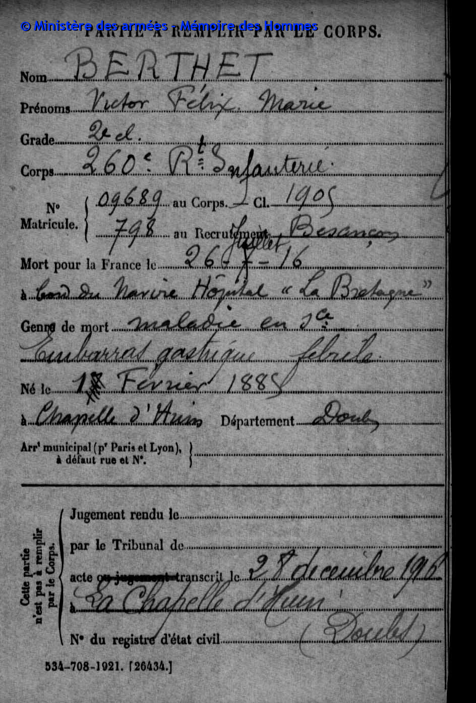 2ème classe BERTHET Victor Félix Marie 01.02.1885 - 26.07.1916 260ème Régiment d'Infanterie Verstarb durch Krankheit auf dem Lazarett Schiff "Bretagne II" |