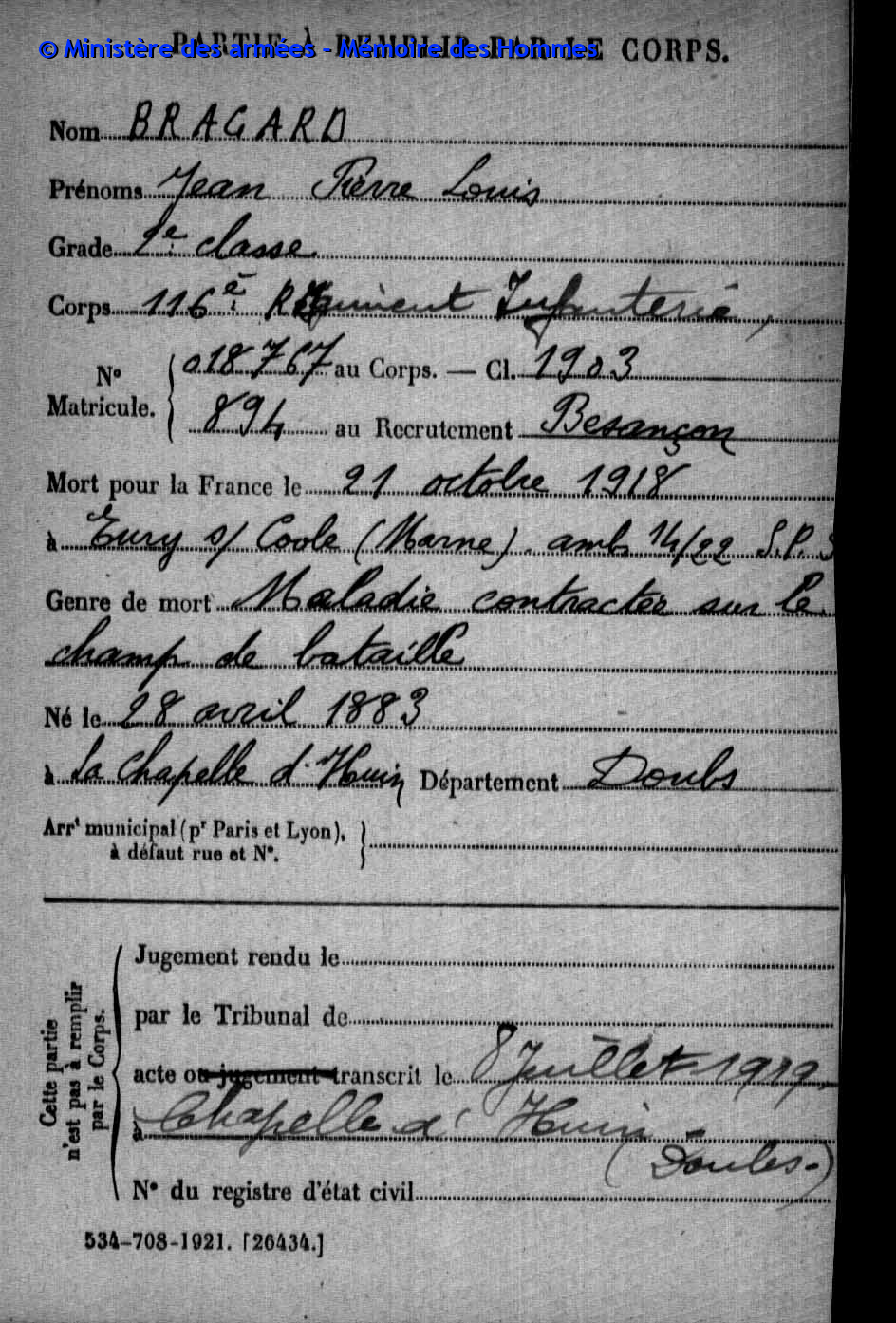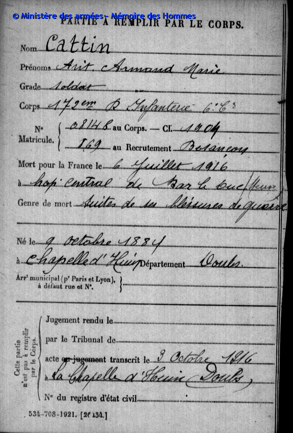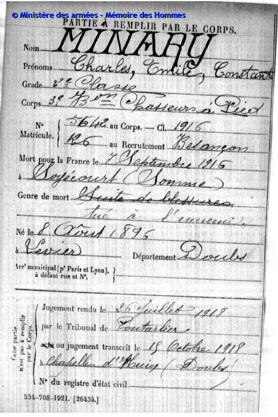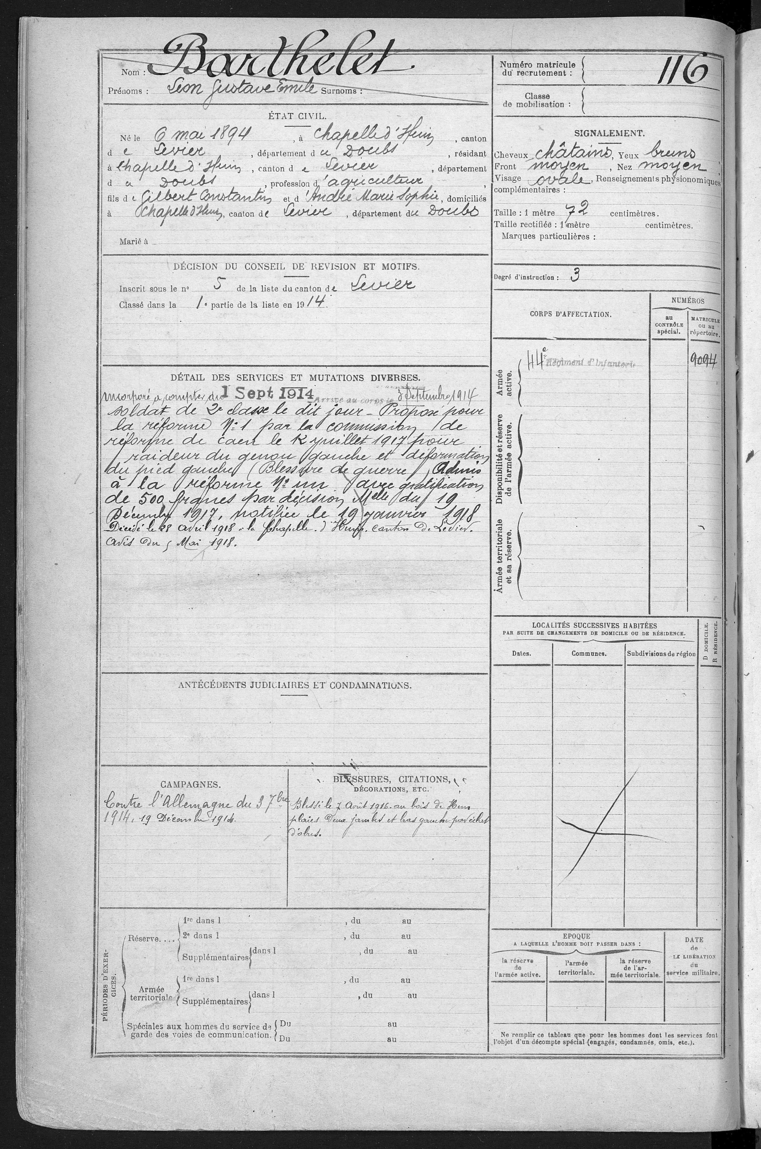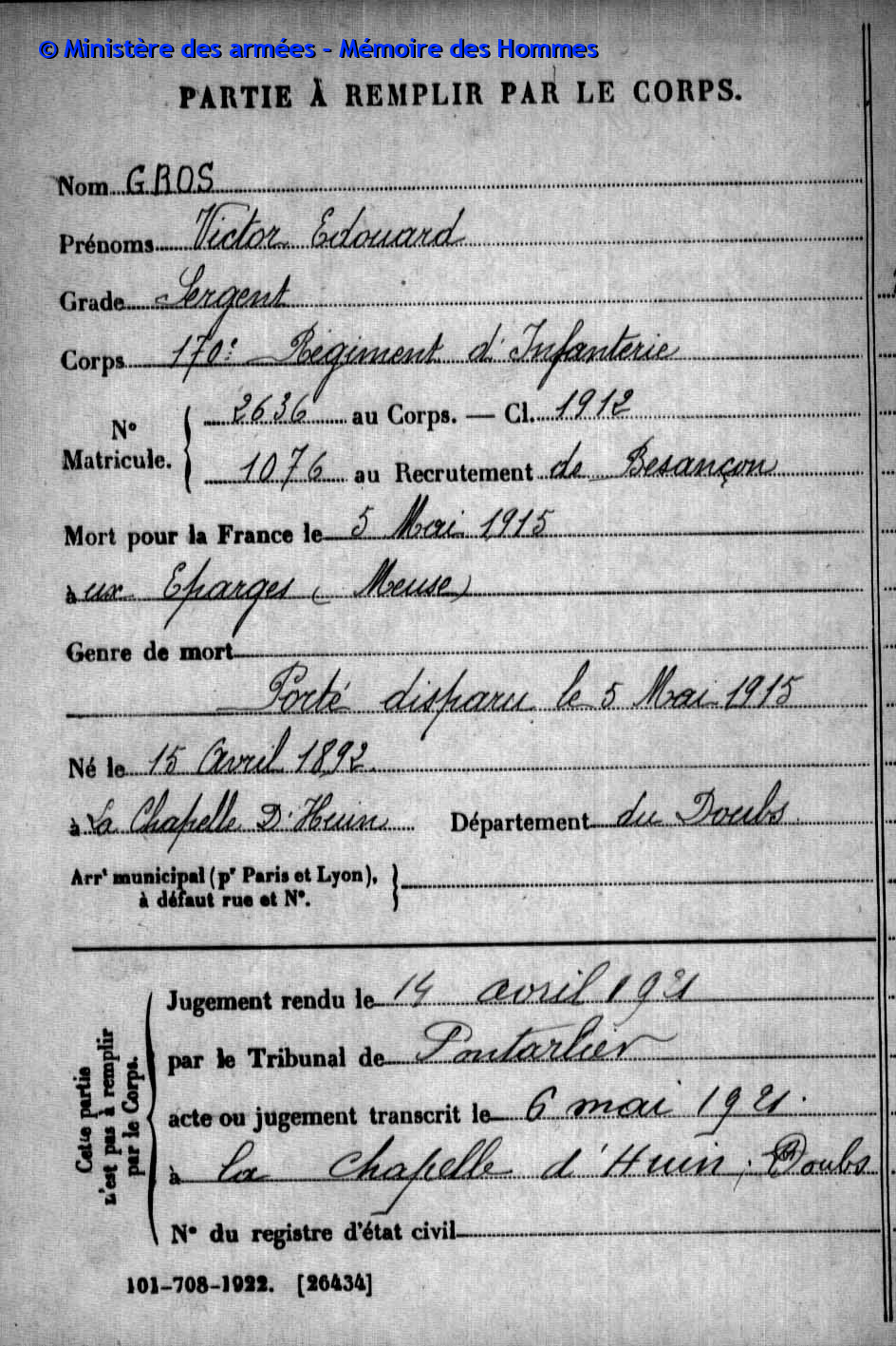2ème classe BERTHET Victor Félix Marie 01.02.1885 - 26.07.1916 260ème Régiment d'Infanterie Verstarb durch Krankheit auf dem Lazarett Schiff "Bretagne II" |