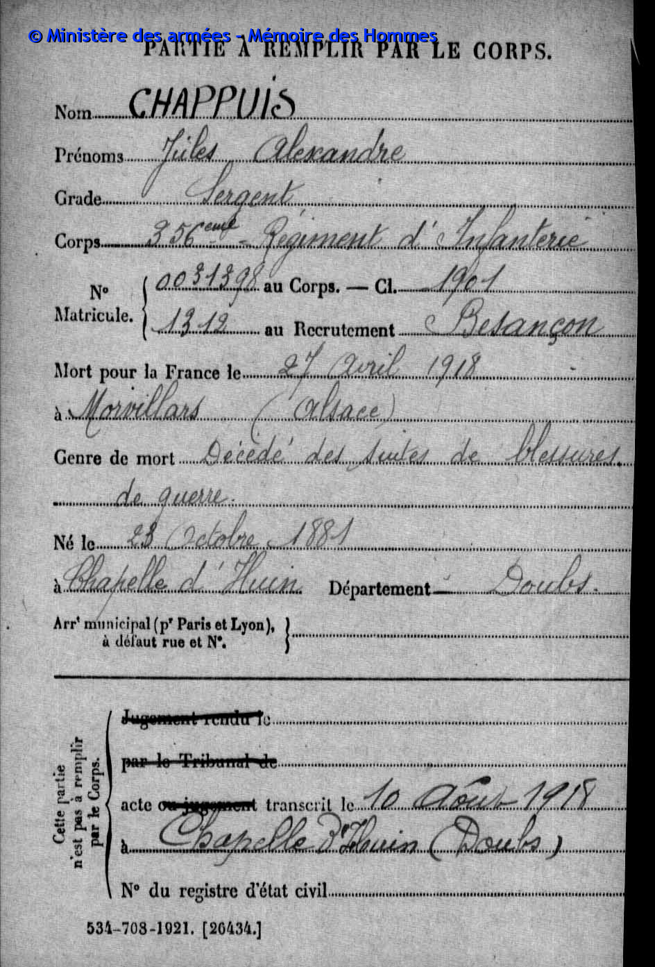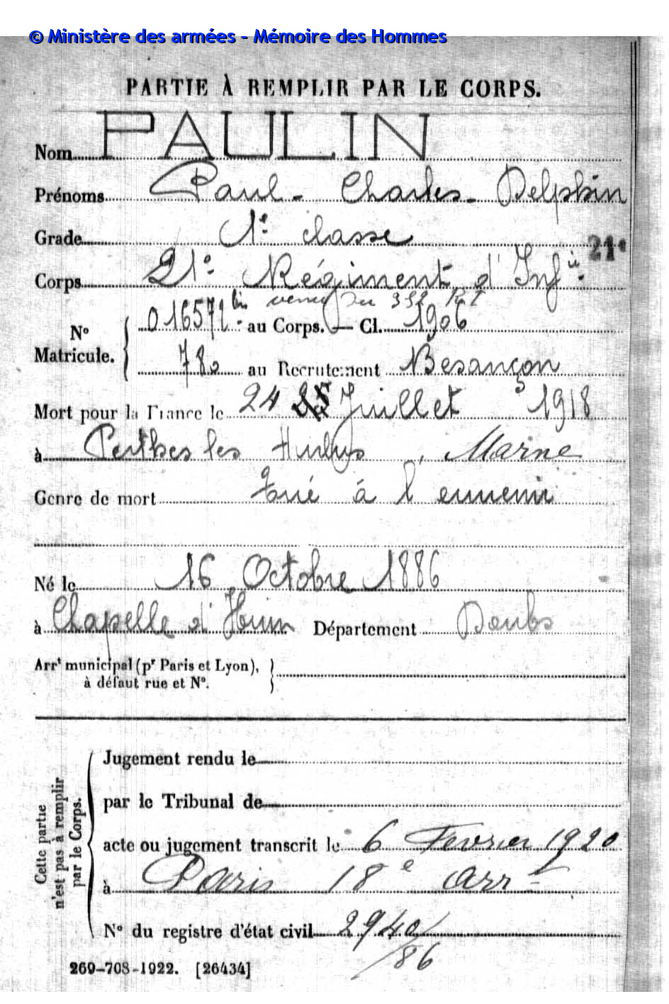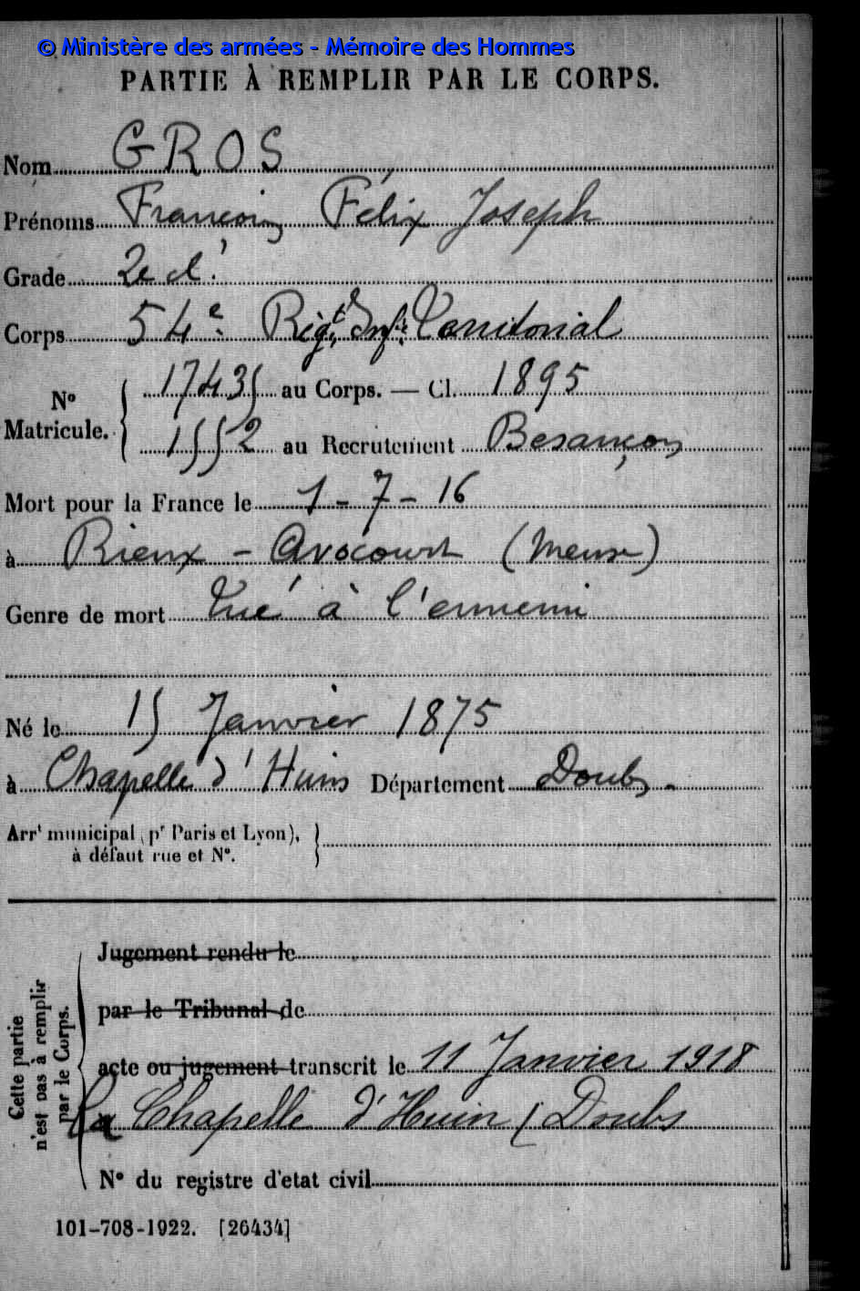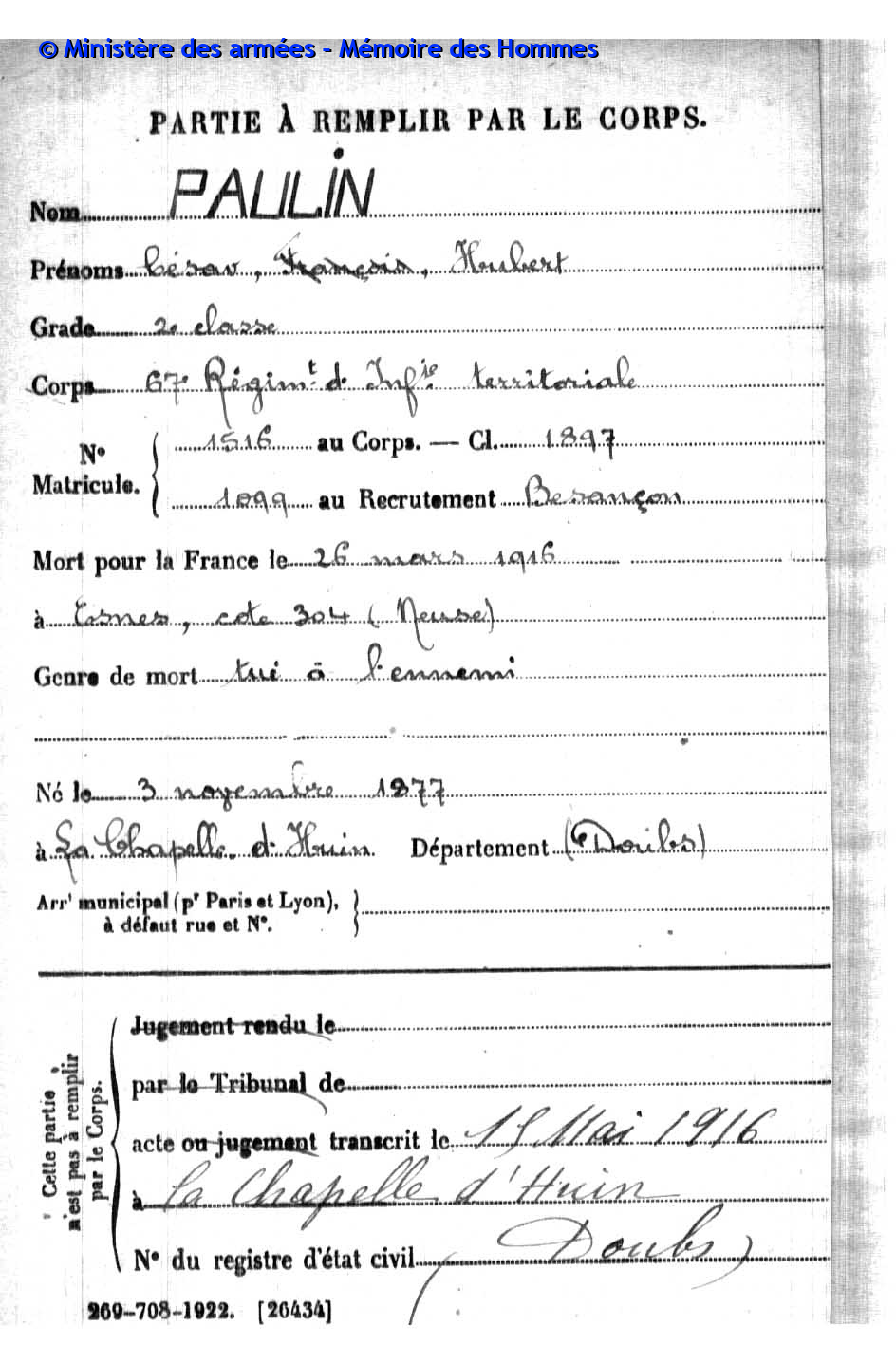 2ème classe BERTHET Victor Félix Marie 01.02.1885 - 26.07.1916 260ème Régiment d'Infanterie Verstarb durch Krankheit auf dem Lazarett Schiff "Bretagne II" |