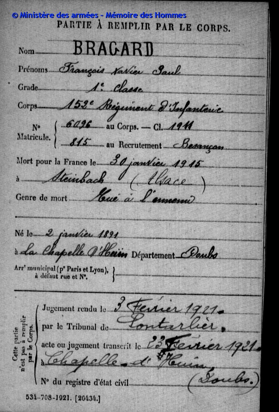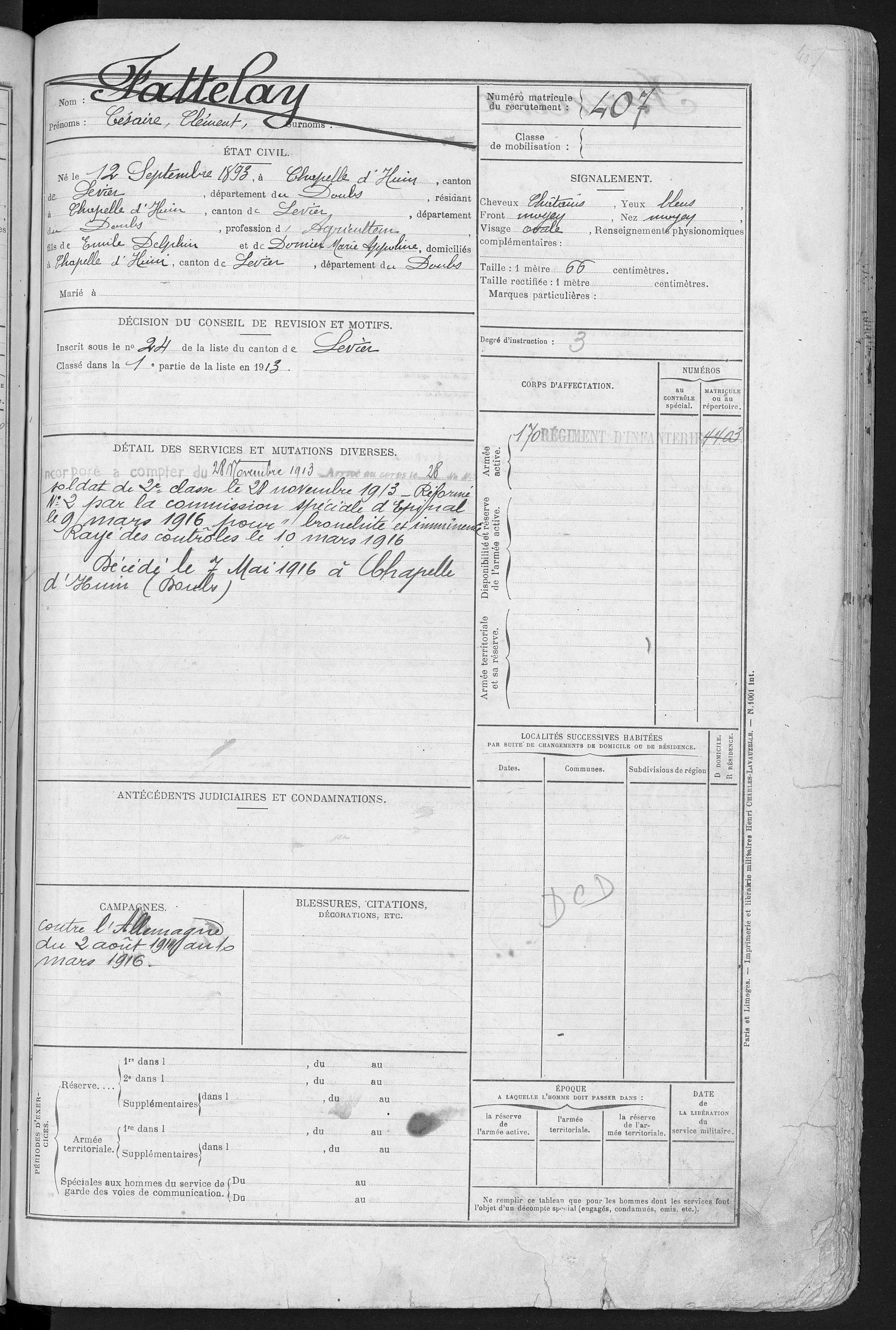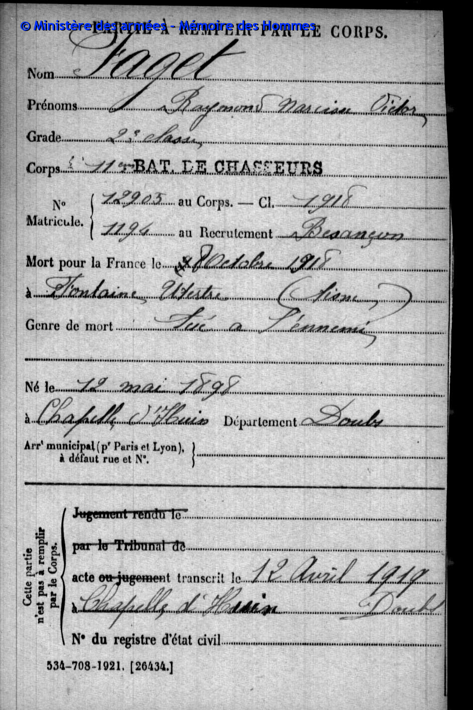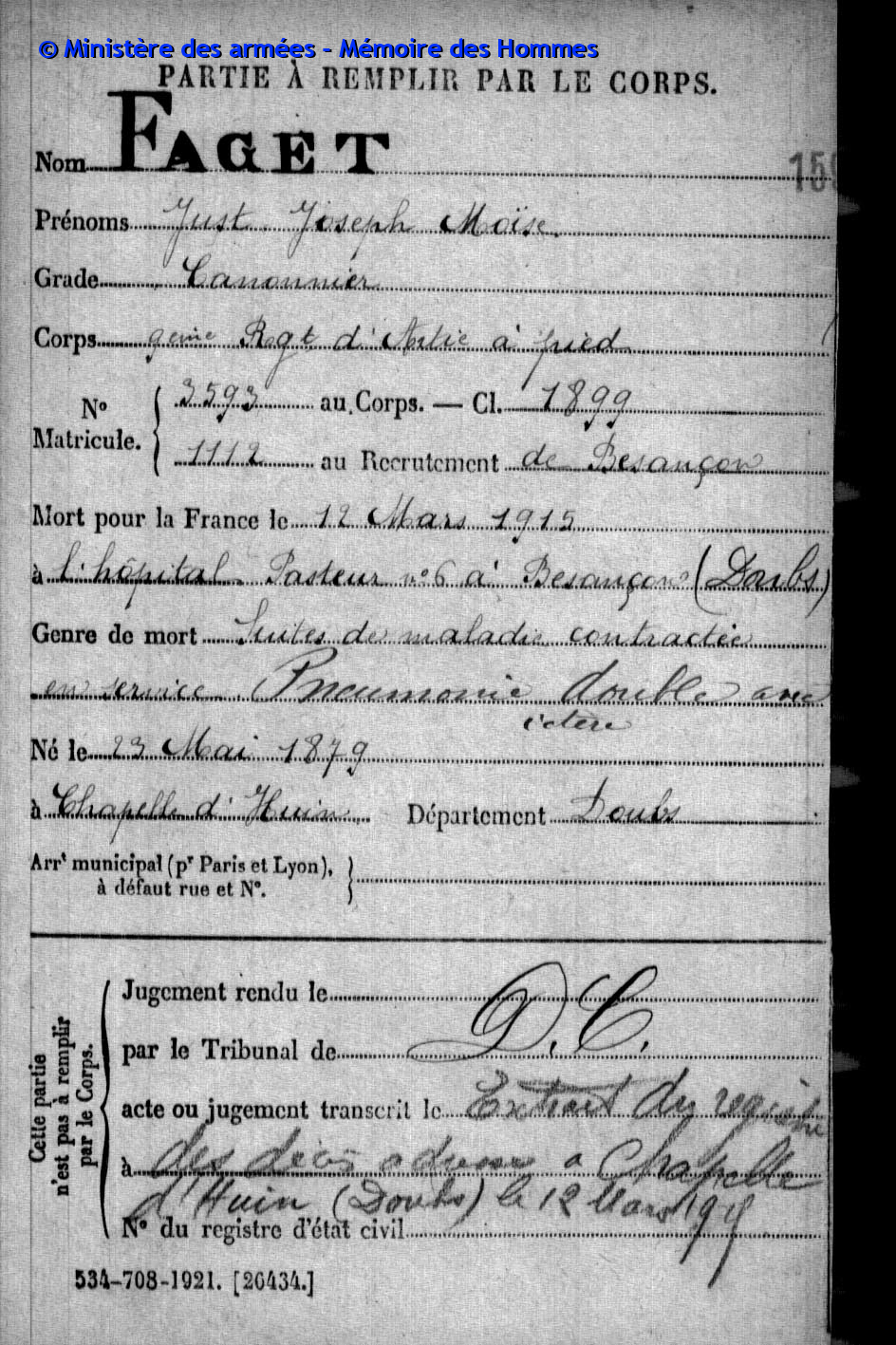 Canonnier FAGET Just Joseph Moise 23.05.1879 - 12.03.1915 9ème Régiment d'Artillerie à Pied Verstarb durch Krankheit im Hôpital Pasteur in Besançon (F) |