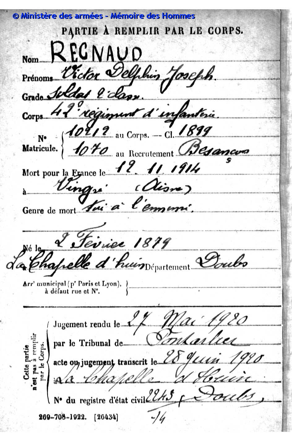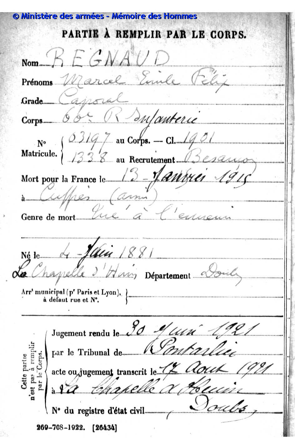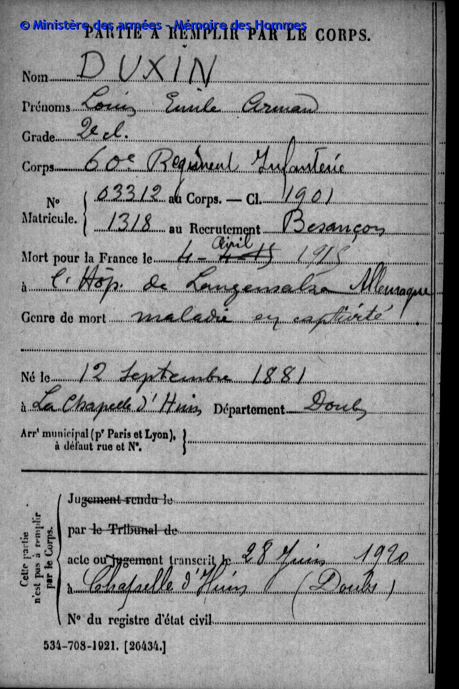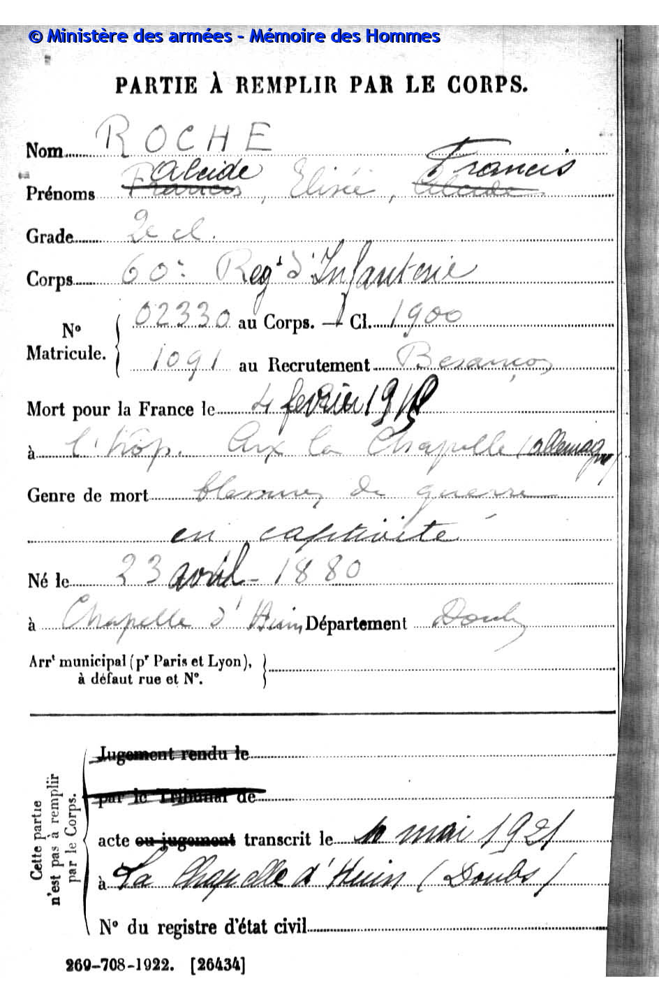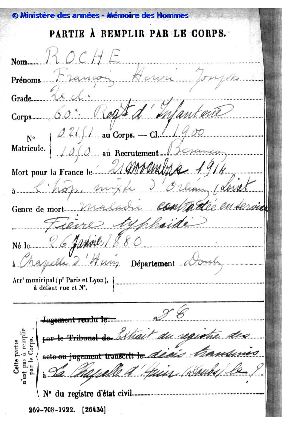 2ème classe ROCHE François Henri Joseph 26.01.1880 - 21.11.1914 60ème Régiment d'Infanterie Verstarb durch Krankheit im Hôpital mixte in Orléans (F) |