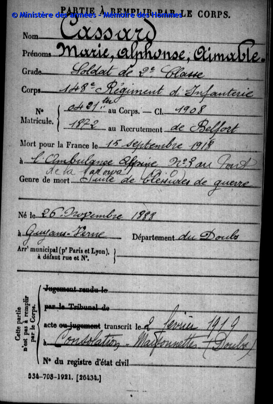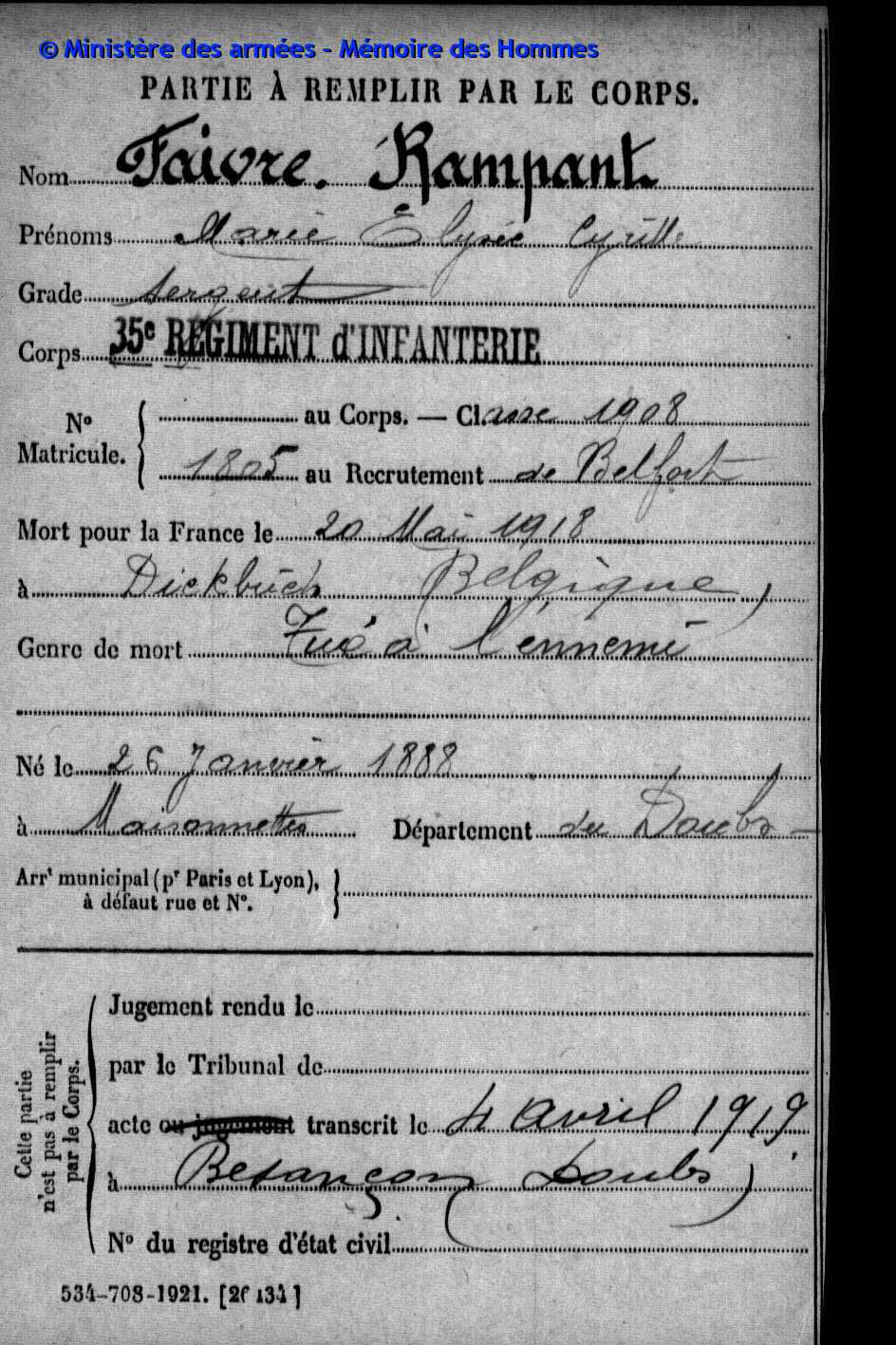 | Soldat FAIVRE-RAMPANT Henri François 22.03.1894 - 20.05.1915 172ème Régiment d'Infanterie Gefallen in Ailly - Meuse (F) |