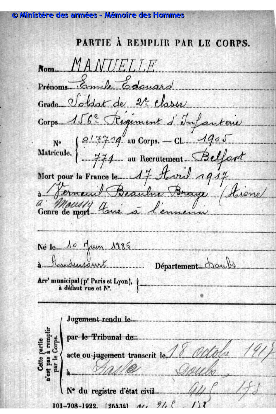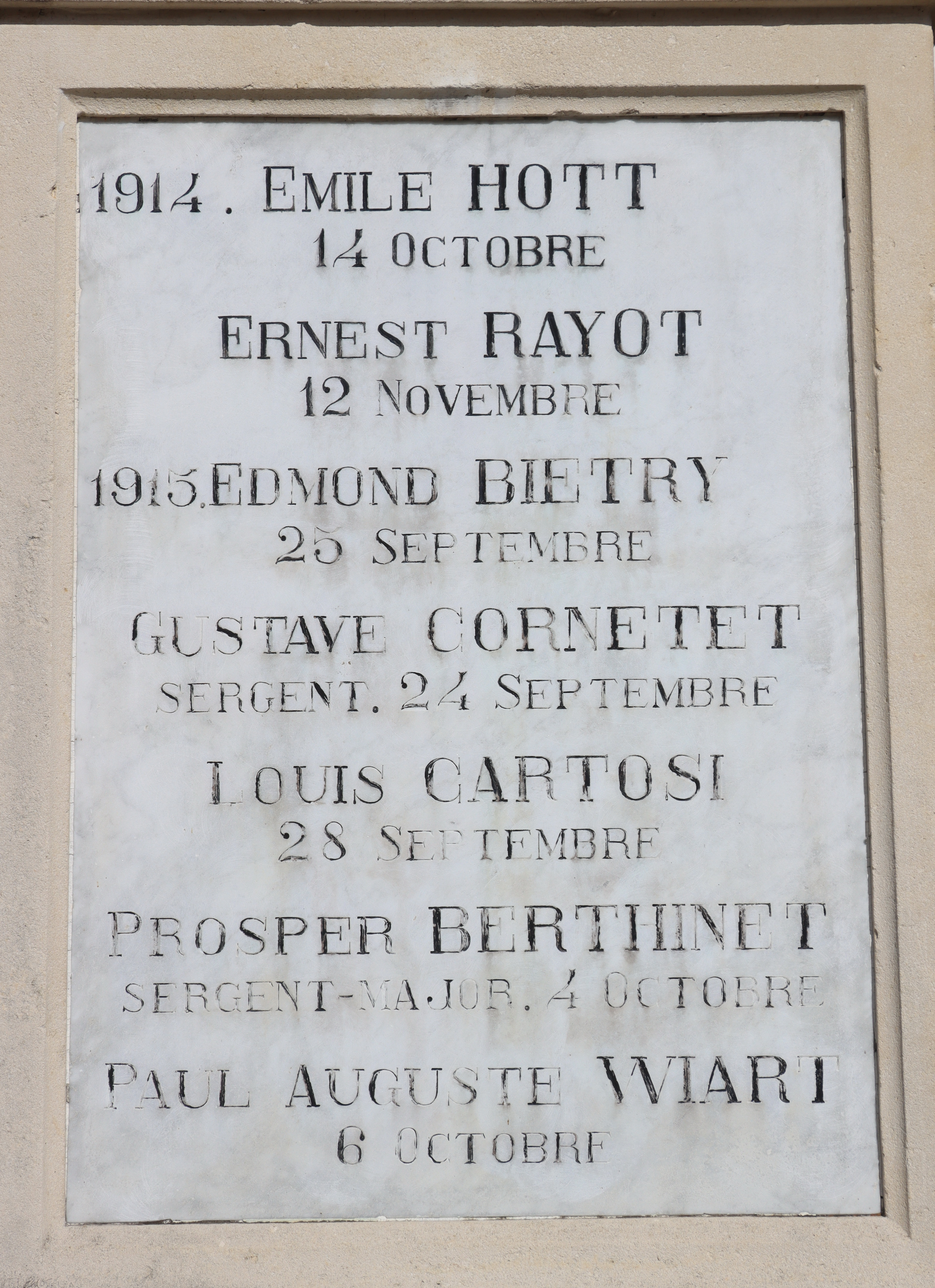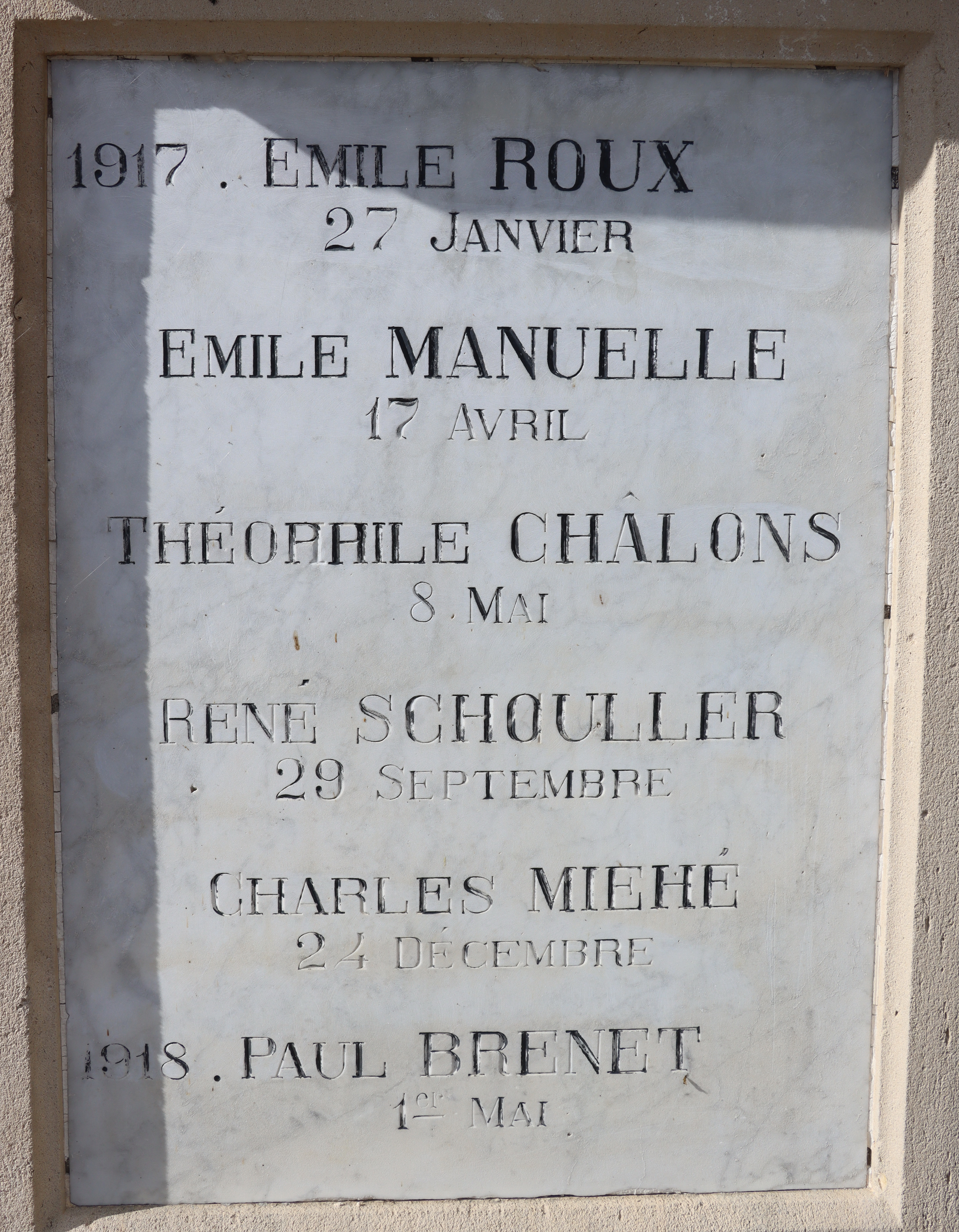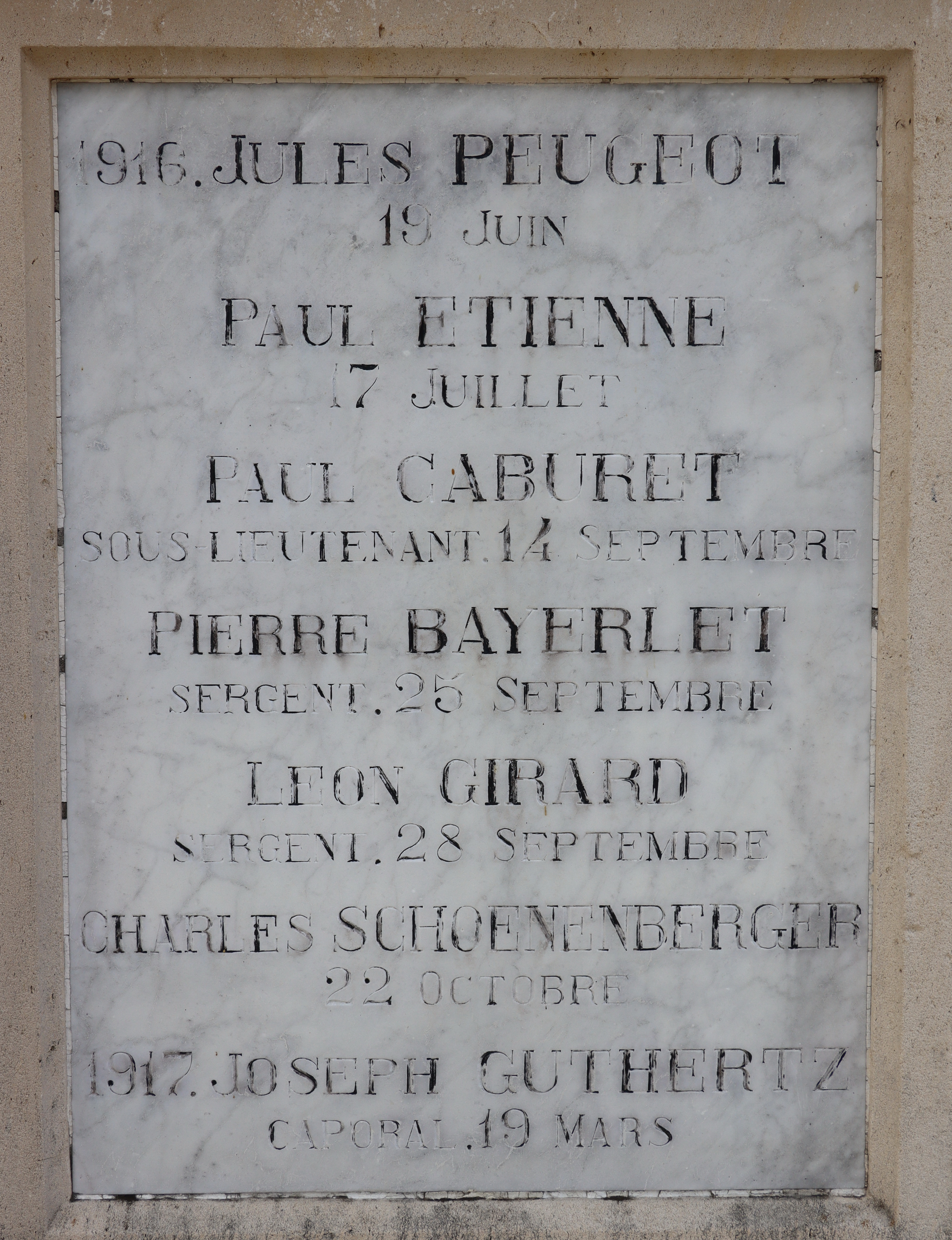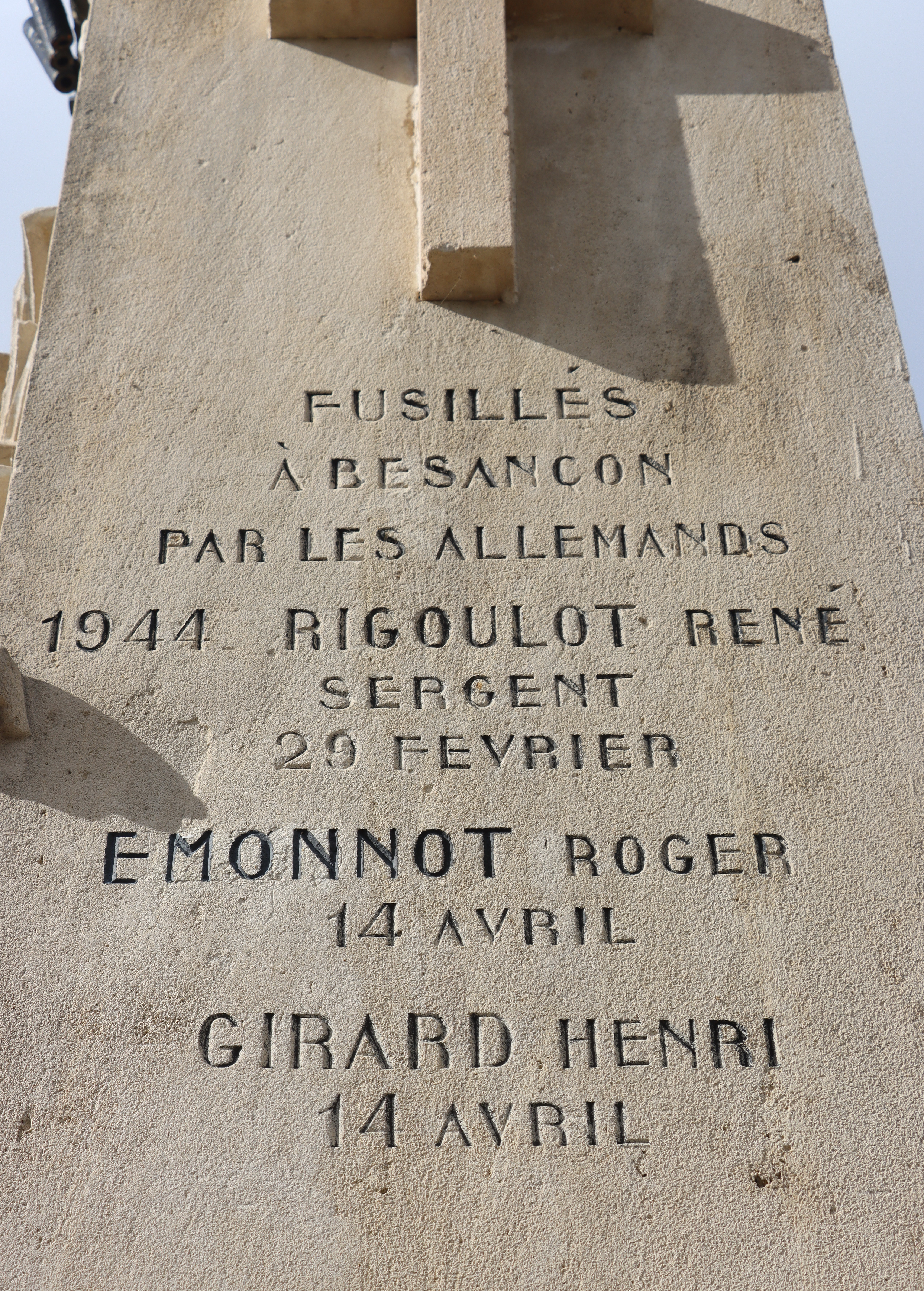 | Widerstandskämpfer EMONNOT Roger 02.12.1923 - 14.04.1944 Francs-Tireurs et Partisans Français Groupe BARA Er nahm im November 1943 an einem Angriff auf das Gefängnis von Montbéliard teil, bei dem etwas 20 Gefangene entkamen. Sabotage von Maschinen in den Betrieben der Gebrüder Japy in Beaucourt, sowie Diebstählen von Lebensmittelkasten in den Rathäusern von Basel und Aincourt Standrechtlich in der Zitadelle Besançon erschossen |