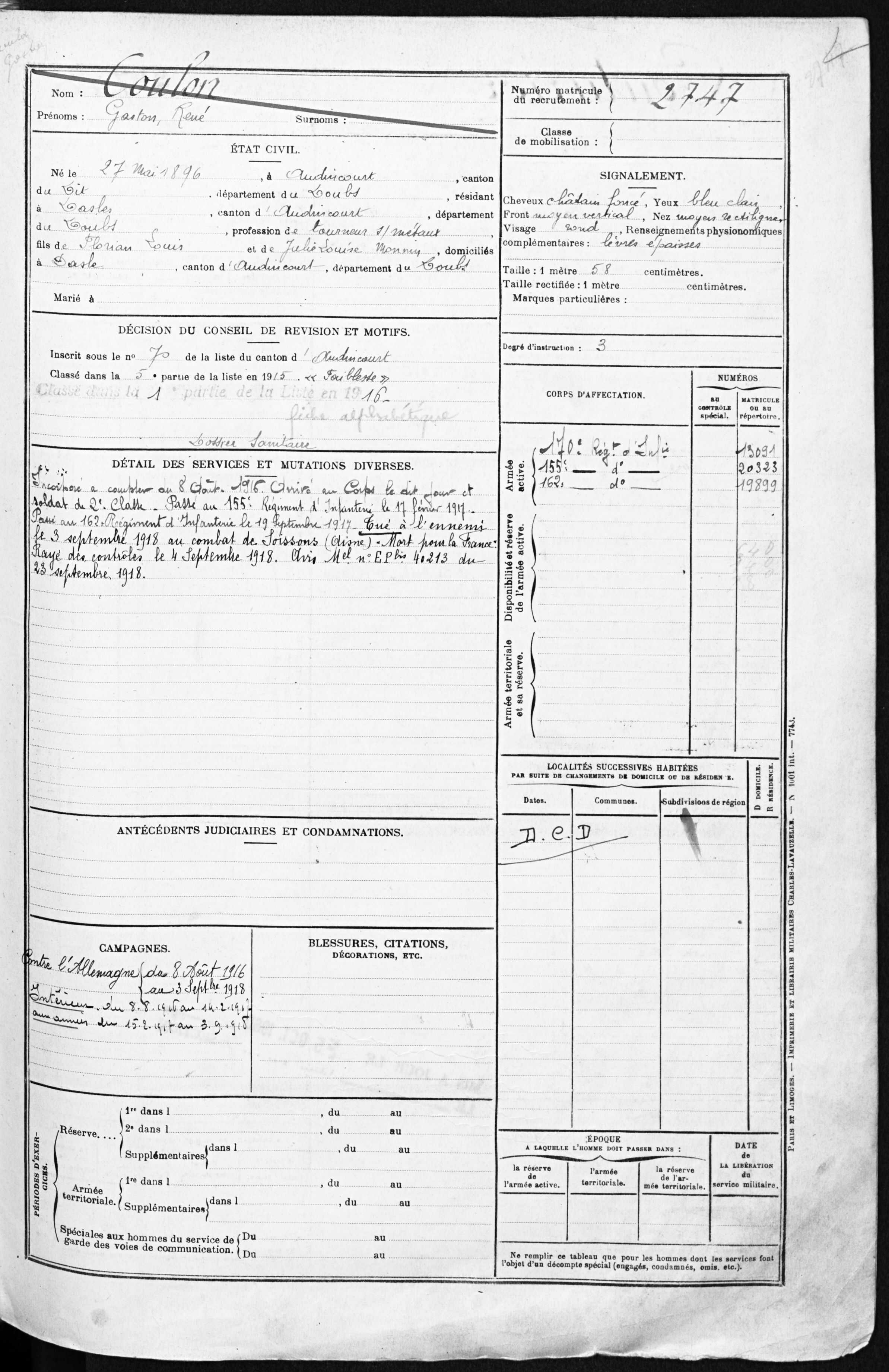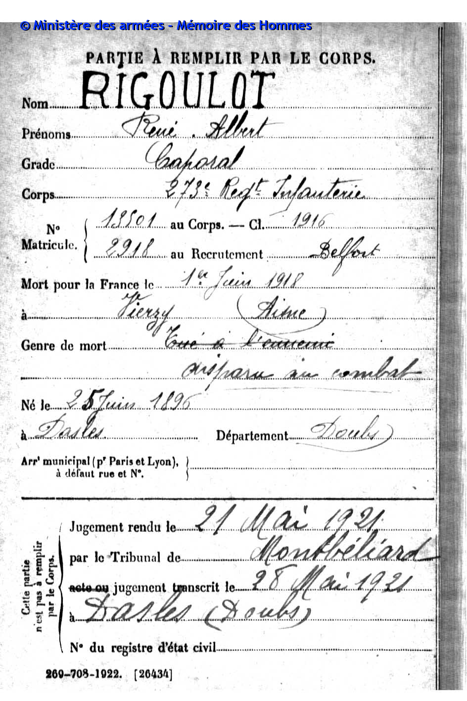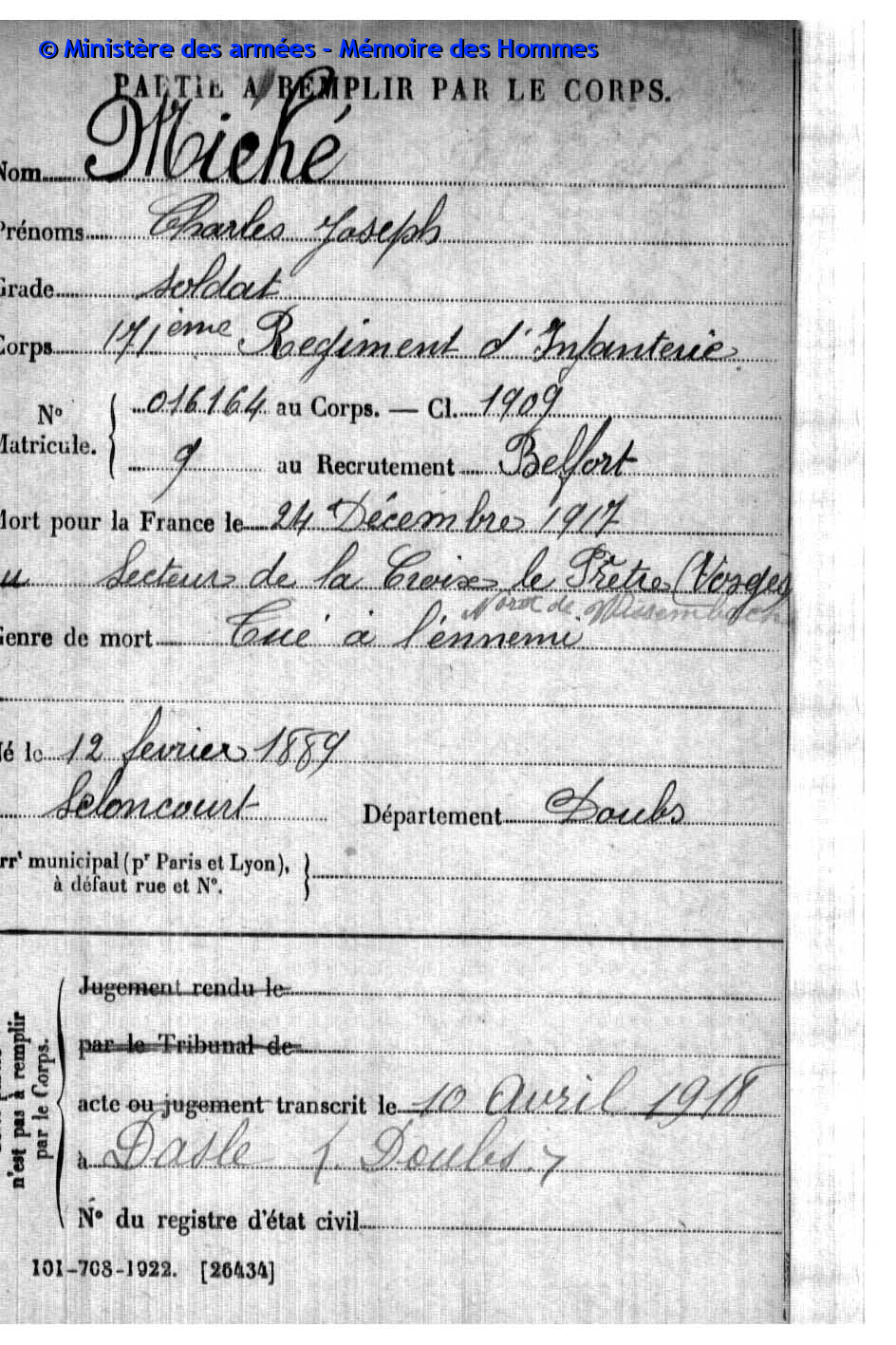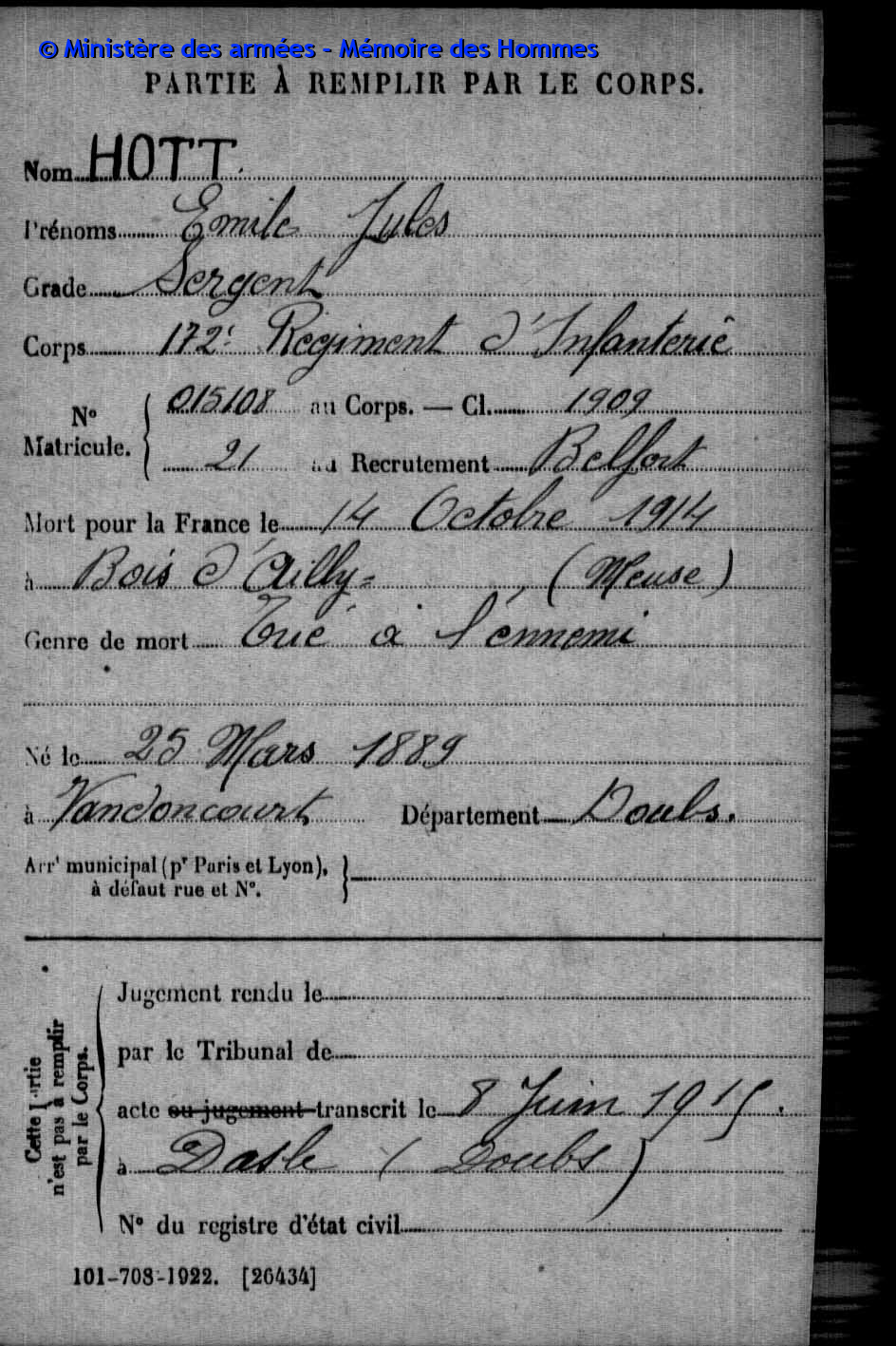 | Widerstandskämpfer EMONNOT Roger 02.12.1923 - 14.04.1944 Francs-Tireurs et Partisans Français Groupe BARA Er nahm im November 1943 an einem Angriff auf das Gefängnis von Montbéliard teil, bei dem etwas 20 Gefangene entkamen. Sabotage von Maschinen in den Betrieben der Gebrüder Japy in Beaucourt, sowie Diebstählen von Lebensmittelkasten in den Rathäusern von Basel und Aincourt Standrechtlich in der Zitadelle Besançon erschossen |