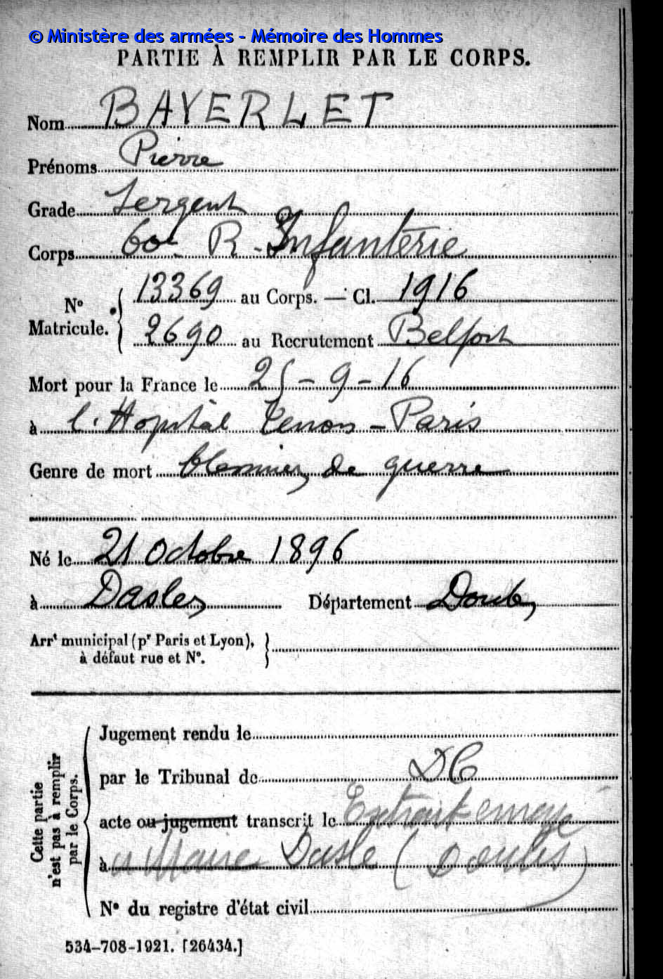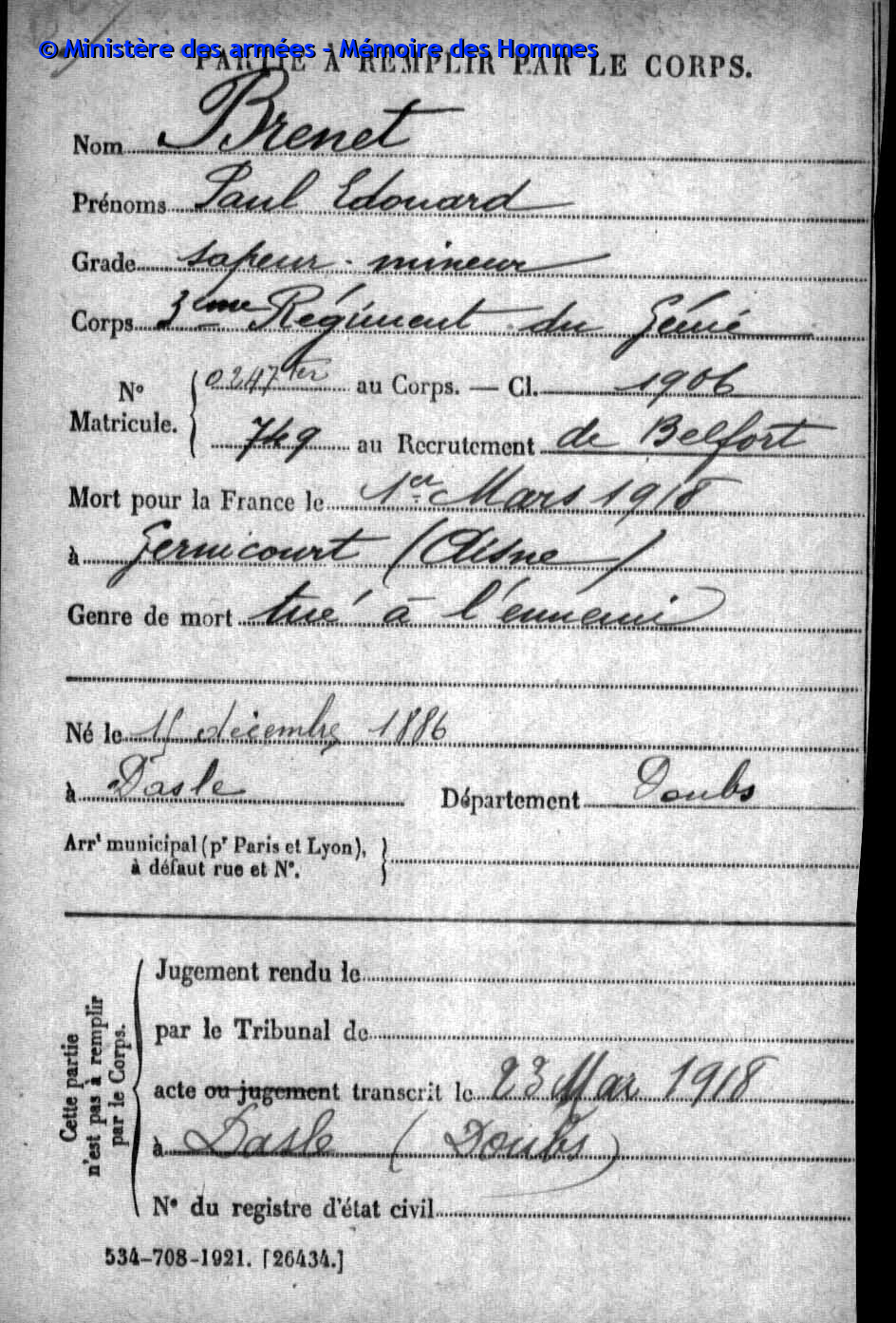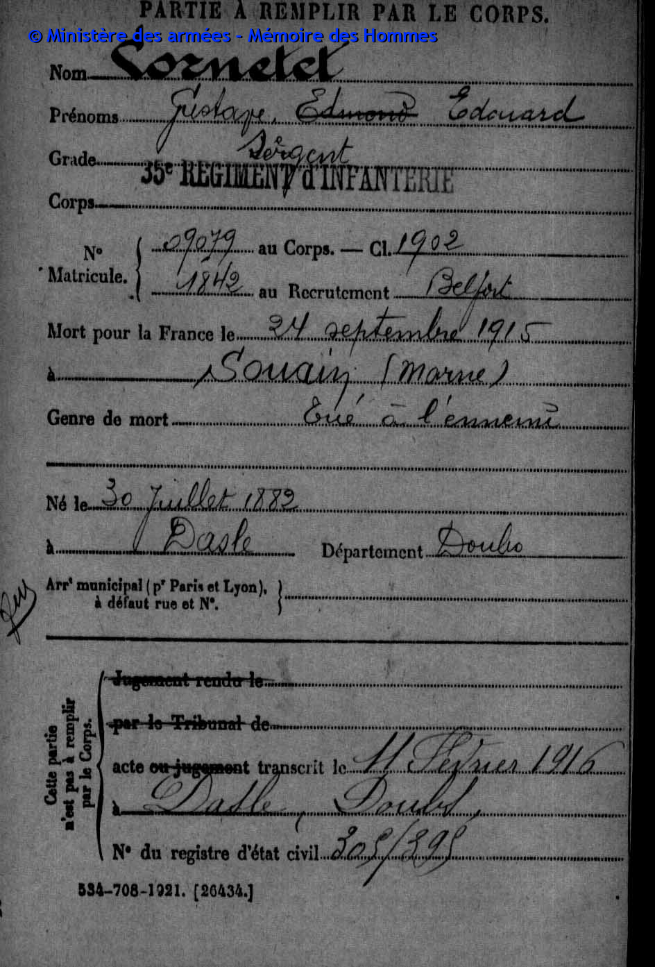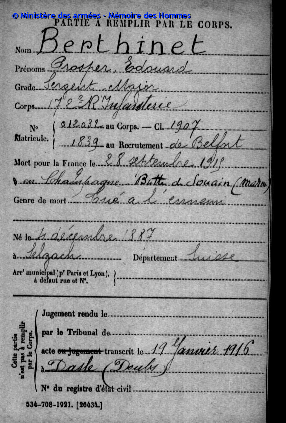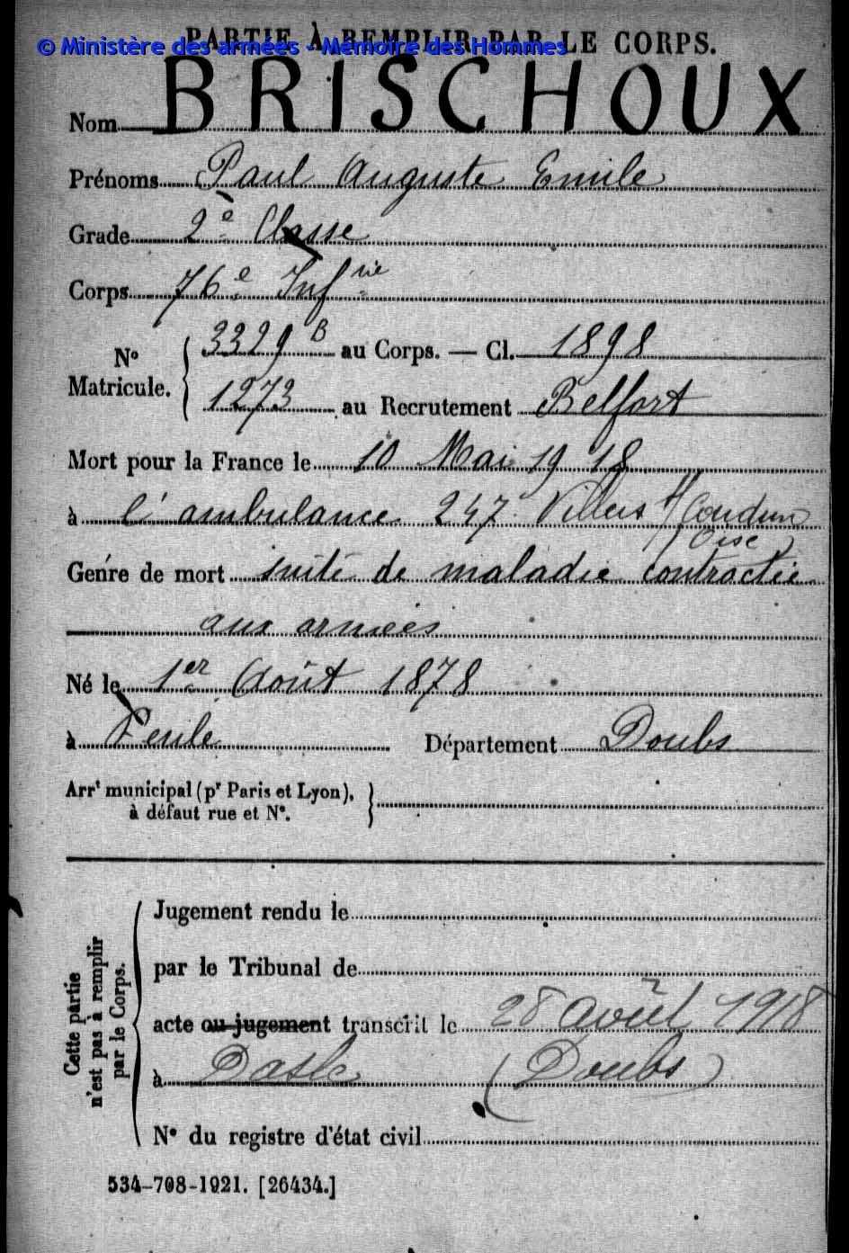 | Widerstandskämpfer EMONNOT Roger 02.12.1923 - 14.04.1944 Francs-Tireurs et Partisans Français Groupe BARA Er nahm im November 1943 an einem Angriff auf das Gefängnis von Montbéliard teil, bei dem etwas 20 Gefangene entkamen. Sabotage von Maschinen in den Betrieben der Gebrüder Japy in Beaucourt, sowie Diebstählen von Lebensmittelkasten in den Rathäusern von Basel und Aincourt Standrechtlich in der Zitadelle Besançon erschossen |
