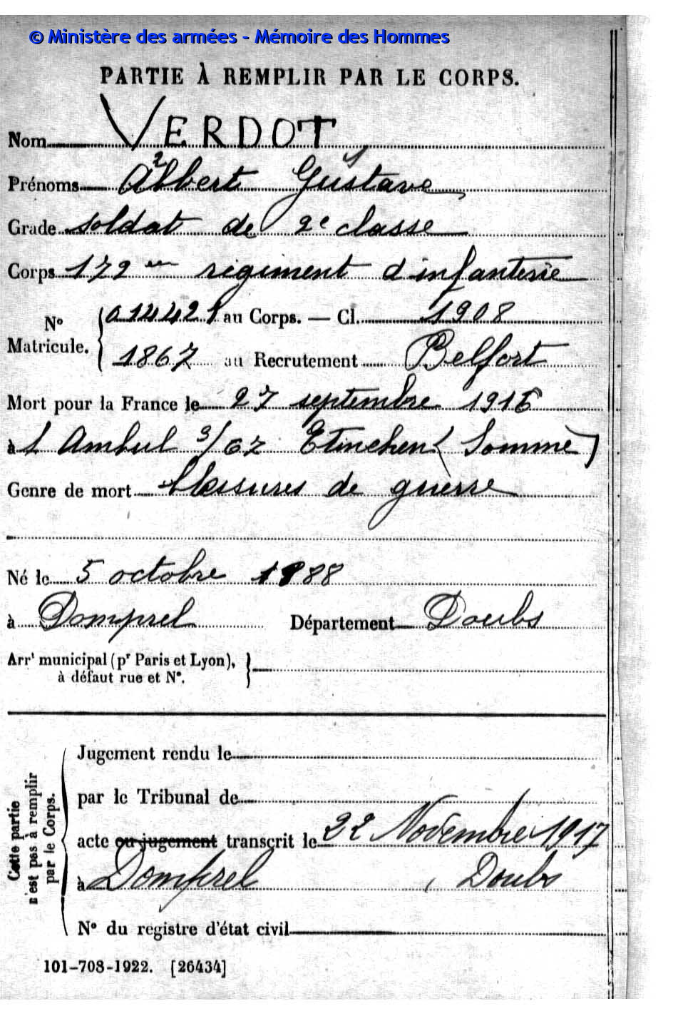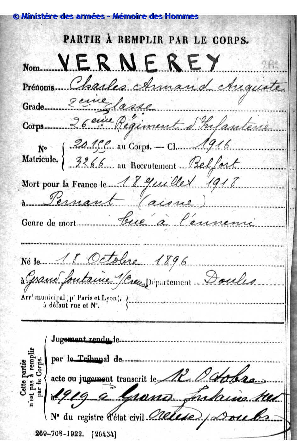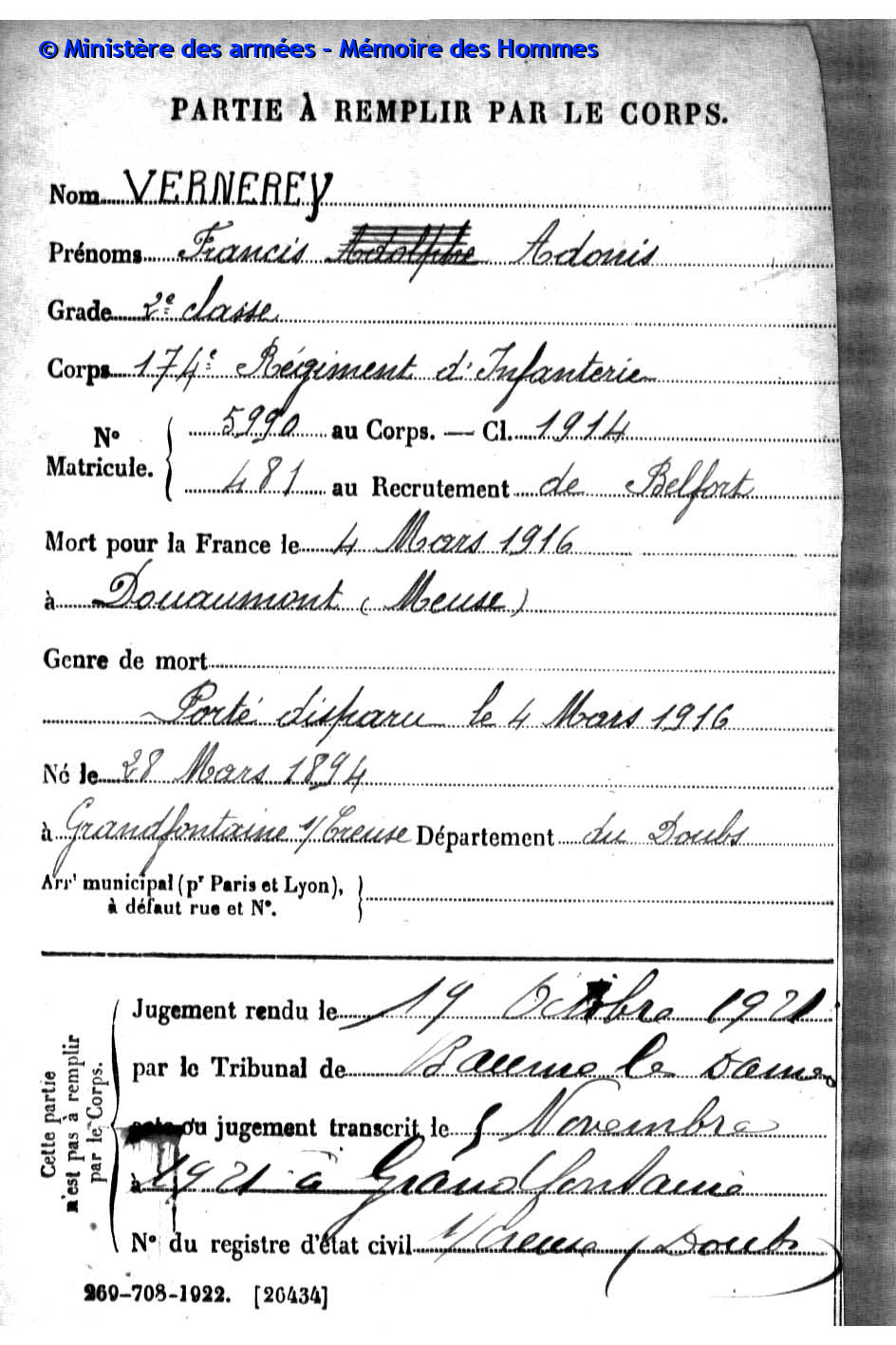 | Soldat VERNEREY Francis Adonis 28.03.1894 - 04.03.1916 174ème Régiment d'Infanterie Gilt als vermisst in Douaumont - Meuse (F) |