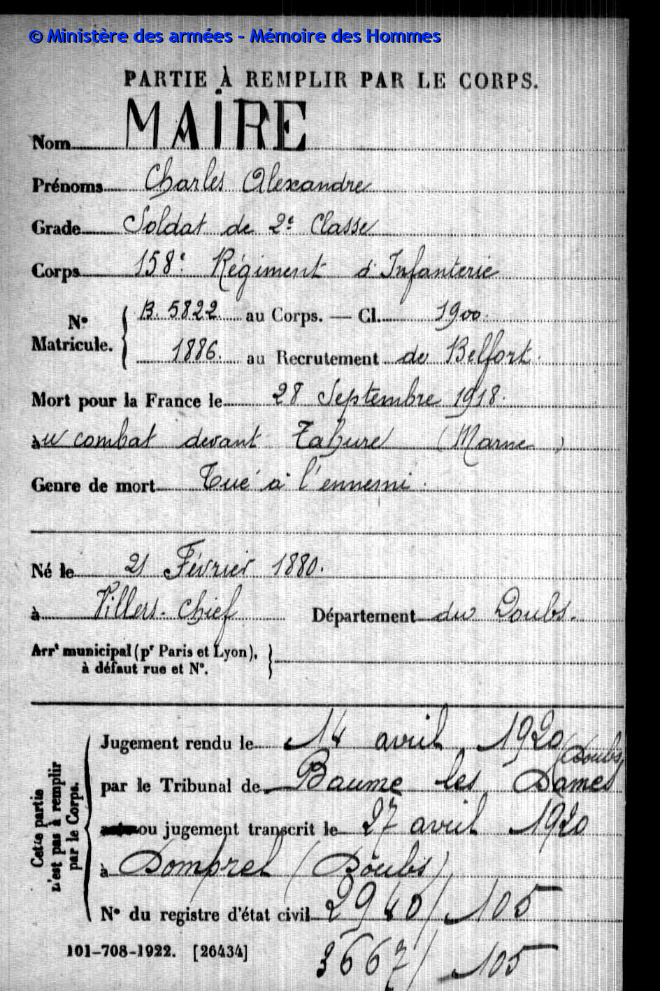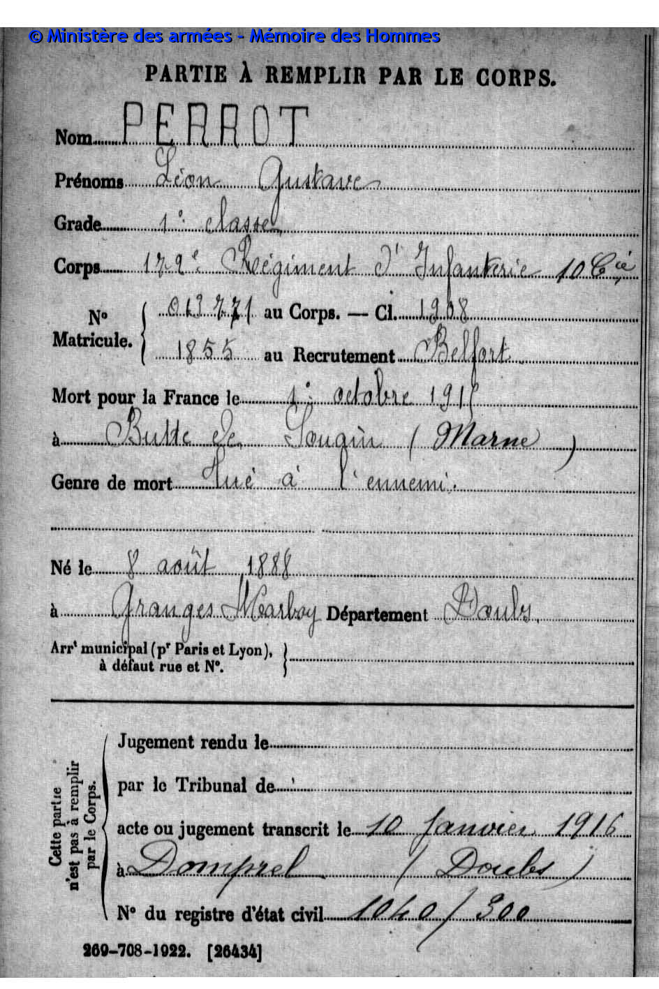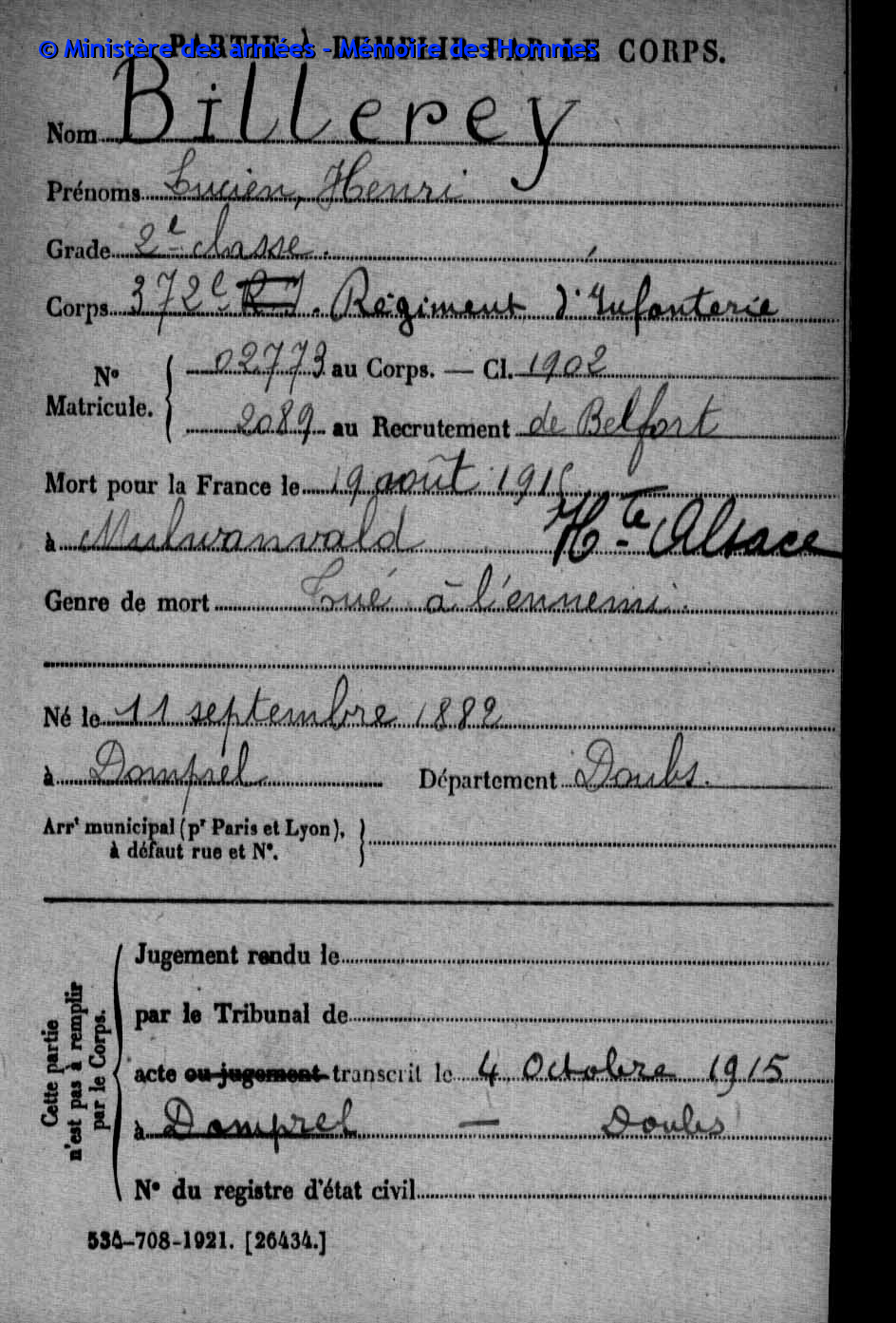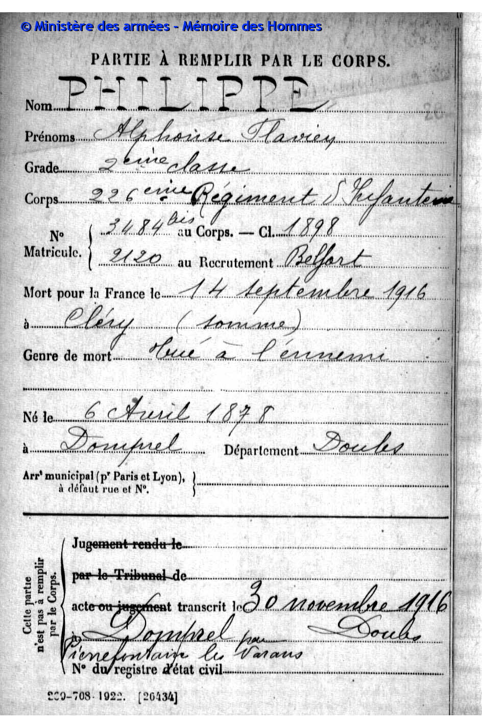 | Soldat VERNEREY Francis Adonis 28.03.1894 - 04.03.1916 174ème Régiment d'Infanterie Gilt als vermisst in Douaumont - Meuse (F) |