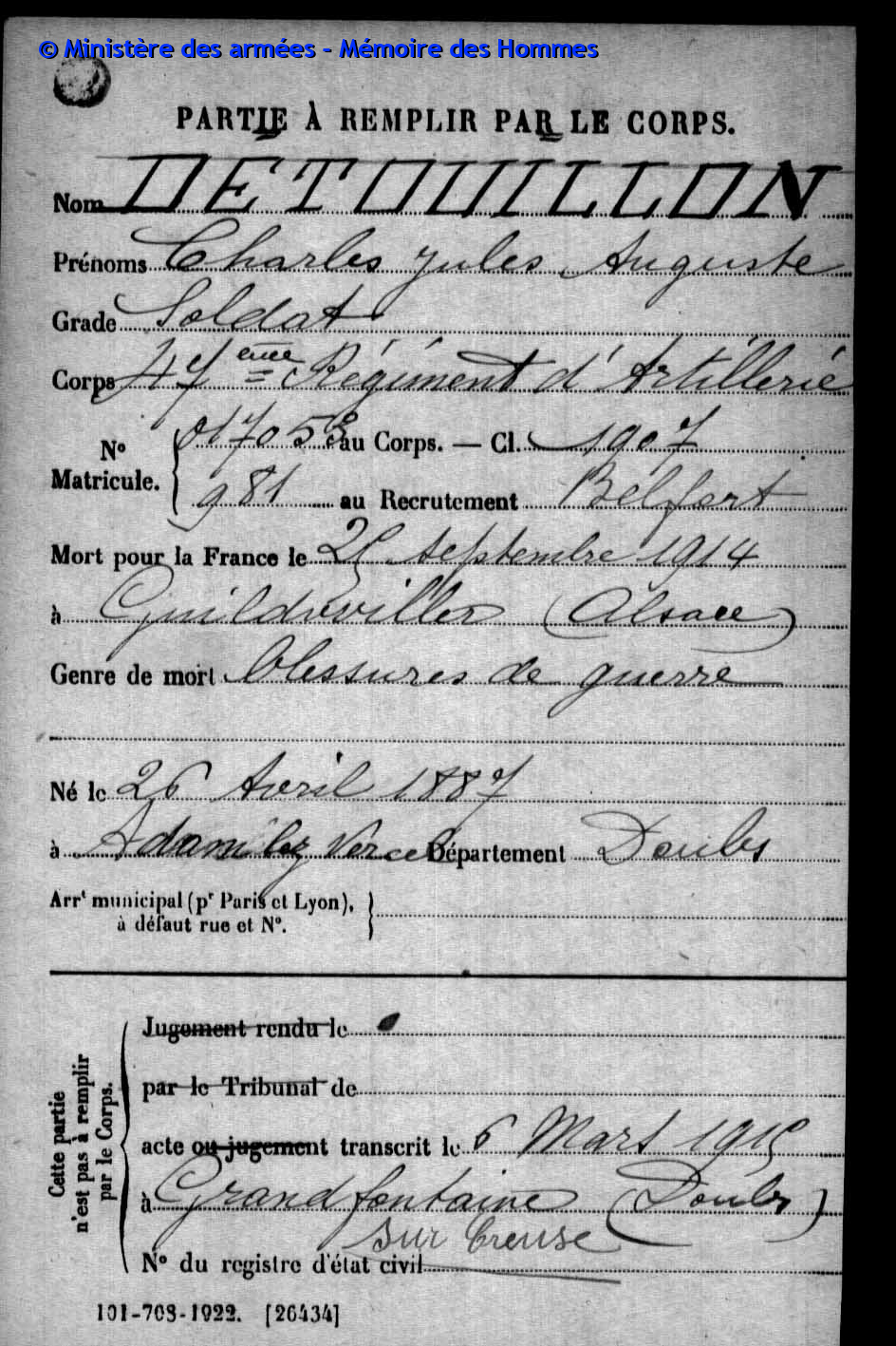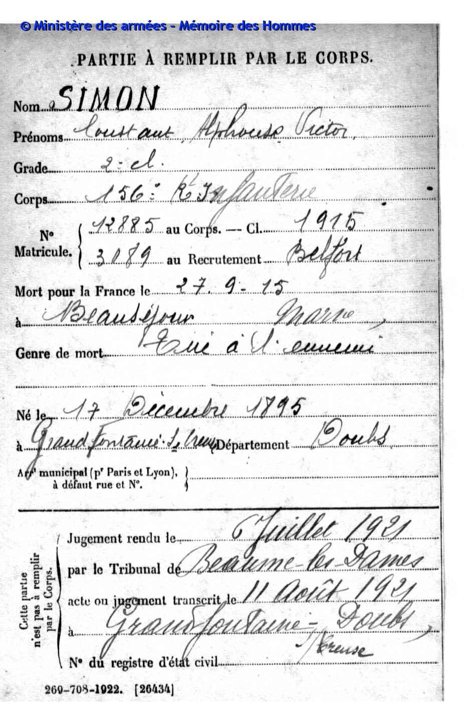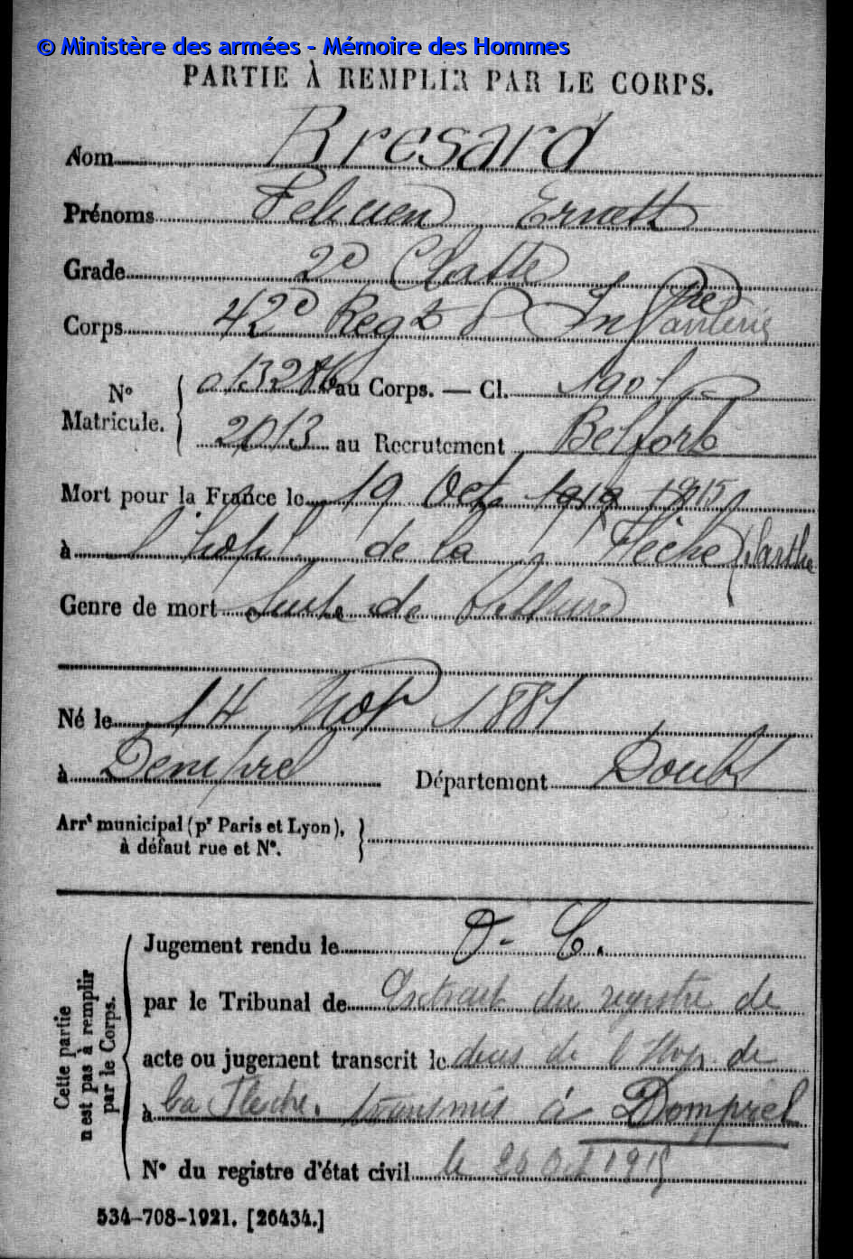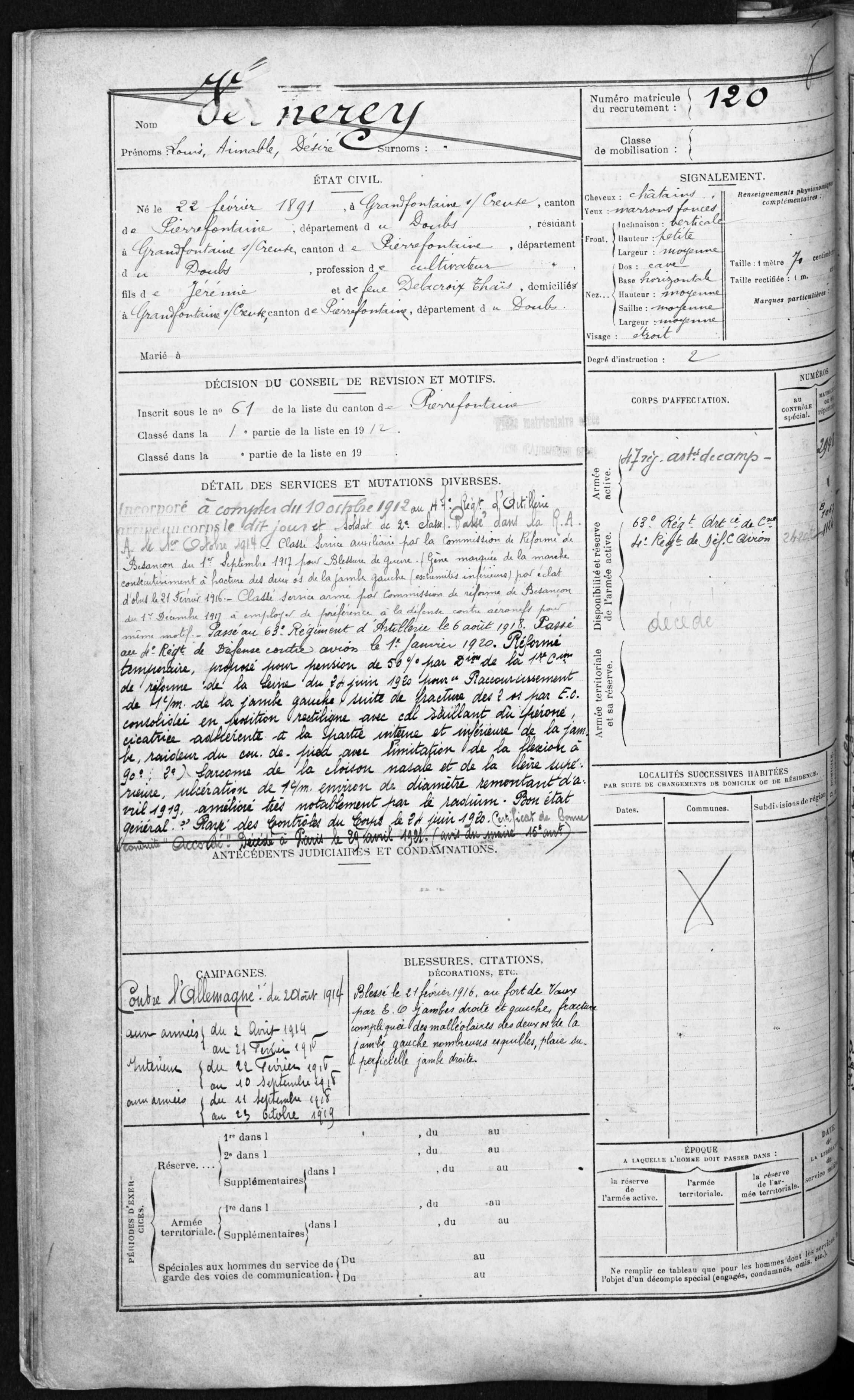 | Soldat VERNEREY Louis Aimable Desire 22.02.1891 - 29.04.1921 4ème Régiment de Défense Contre Avion Verstarb an seinen Wunden in Paris (F) |